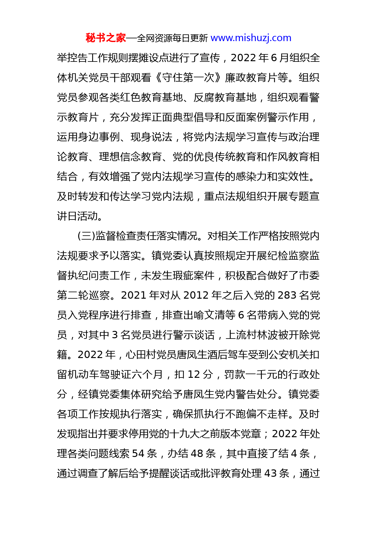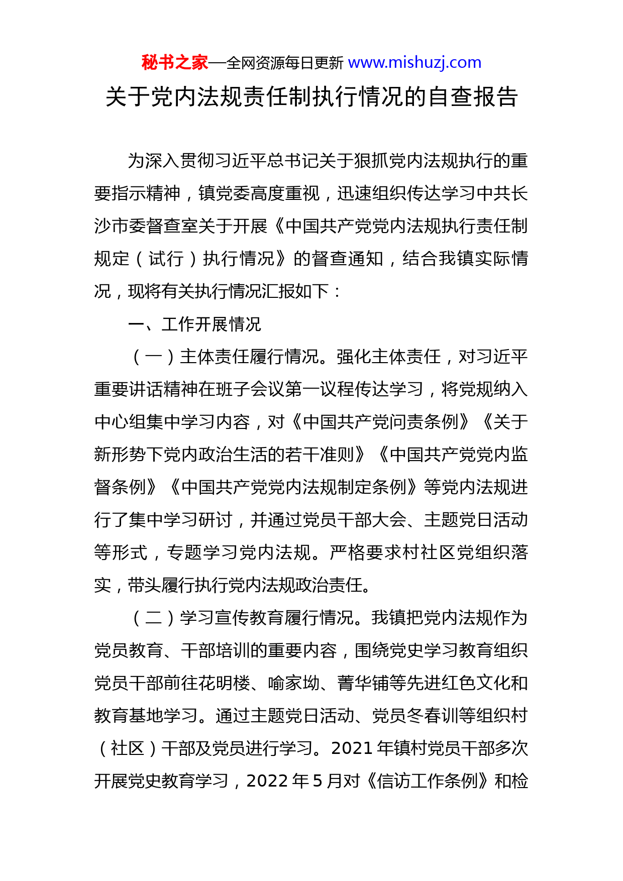 秘书之家—全网资源每日更新www.mishuzj.com关于党内法规责任制执行情况的自查报告为深入贯彻习近平总书记关于狠抓党内法规执行的重要指示精神,镇党委高度重视,迅速组织传达学习中共长沙市委督查室关于开展《中国共产党党内法规执行责任制规定(试行)执行情况》的督查通知,结合我镇实际情况,现将有关执行情况汇报如下:一、工作开展情况(一)主体责任履行情况。强化主体责任,对习近平重要讲话精神在班子会议第一议程传达学习,将党规纳入中心组集中学习内容,对《中国共产党问责条例》《关于新形势下党内政治生活的若干准则》《中国共产党党内监督条例》《中国共产党党内法规制定条例》等党内法规进行了集中学习研讨,并通过党员干部大会、主题党日活动等形式,专题学习党内法规。严格要求村社区党组织落实,带头履行执行党内法规政治责任。(二)学习宣传教育履行情况。我镇把党内法规作为党员教育、干部培训的重要内容,围绕党史学习教育组织党员干部前往花明楼、喻家坳、菁华铺等先进红色文化和教育基地学习。通过主题党日活动、党员冬春训等组织村(社区)干部及党员进行学习。2021年镇村党员干部多次开展党史教育学习,2022年5月对《信访工作条例》和检秘书之家—全网资源每日更新www.mishuzj.com举控告工作规则摆摊设点进行了宣传,2022年6月组织全体机关党员干部观看《守住第一次》廉政教育片等。组织党员参观各类红色教育基地、反腐教育基地,组织观看警示教育片,充分发挥正面典型倡导和反面案例警示作用,运用身边事例、现身说法,将党内法规学习宣传与政治理论教育、理想信念教育、党的优良传统教育和作风教育相结合,有效增强了党内法规学习宣传的感染力和实效性。及时转发和传达学习党内法规,重点法规组织开展专题宣讲日活动。(三)监督检查责任落实情况。对相关工作严格按照党内法规要求予以落实。镇党委认真按照规定开展纪检监察监督执纪问责工作,未发生瑕疵案件,积极配合做好了市委第二轮巡察。2021年对从2012年之后入党的283名党员入党程序进行排查,排查出喻文清等6名带病入党的党员,对其中3名党员进行警示谈话,上流村林波被开除党籍。2022年,心田村党员唐凤生酒后驾车受到公安机关扣留机动车驾驶证六个月,扣12分,罚款一千元的行政处分,经镇党委集体研究给予唐凤生党内警告处分。镇党委各项工作按规执行落实,确保抓执行不跑偏不走样。及时发现指出并要求停用党的十九大之前版本党章;2022年处理各类问题线索54条,办结48条,其中直接了结4条,通过调查了解后给予提醒谈话或批评教育处理43条,通过秘书之家—全网资源每日更新www.mishuzj.com初步核实转为立案1条,给予党内警告处分1人,另对田坪村支村两委班子进行集体警示约谈等。二、存在问题(一)认识不够深刻。党内法规专题学习深度不够,氛围还不够浓厚,没有很好的结合各项工作领域及工作需要,以问题为导向进行更深入更有针对性的学习与自查,对党内法规工作的认识有待进一步加强,在完成规定动作之余,应多思考如何更好的抓实抓细。(二)抓执行监督力度不够。未进行阶段性的分析研究党内法规执行工作情况,执行监督还未形成常态化机制,督促村社区各支部落实学习教育的力度还需进一步强化。(三)干部队伍建设有待提升。目前,针对党内法规工作还缺乏专业的干部,缺乏系统性的培训,存在业务不精的问题,影响党内法规工作的有效推进。三、下一步工作打算(一)提高思想认识,强化整改。深刻认识到遵守党内法规,执行党内法规是义务,更是政治责任,深刻认识抓好党内法规工作的重要意义。系统梳理基层工作领域存在的问题,就相关的党内法规有针对性的进行专题学习与自查,促使该项工作抓实抓细。(二)自省自查,抓实执行监督。通过开展领导班子秘书之家—全网资源每日更新www.mishuzj.com民主生活会、党支部组织生活会,开展自查自纠和批评与自我批评;通过党性教育、警示教育等活动,确保党纪党规入脑入心,发挥震慑警示效应,唤醒责任意识,激发担当精神。对党员干部学习、遵守、执行法规制度情况不定期进行督促检查,发现问题及时提醒纠正,立行整改到位,对表现突出的个人或集体,在年终绩效考核中予以加分。(三)以学促动,规范党员行为。科学制定学习计划,结合党员“三亮三比”行动,通过集中学、自主学习促进学习常态化,把学习贯彻党内法规制度与全镇中心工作有机结合,班子成员带头学,带头遵守执行。