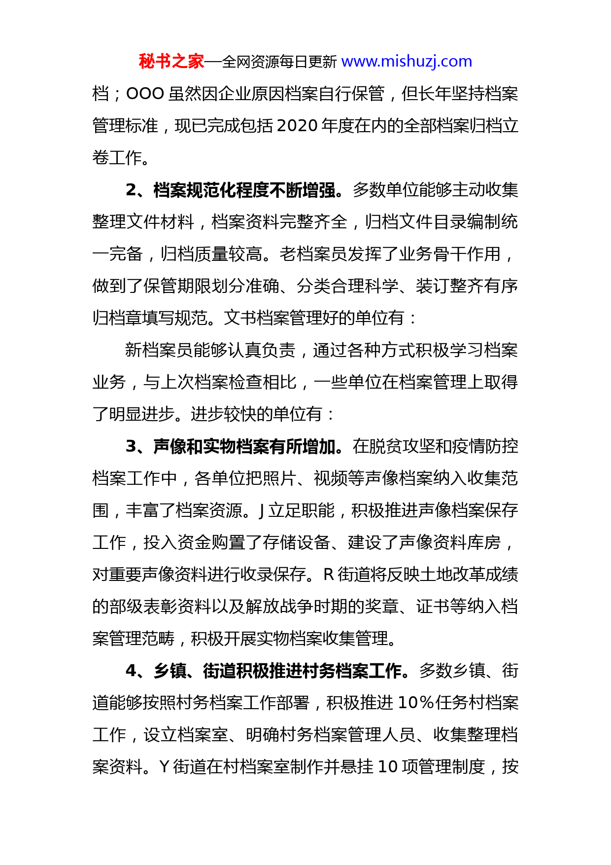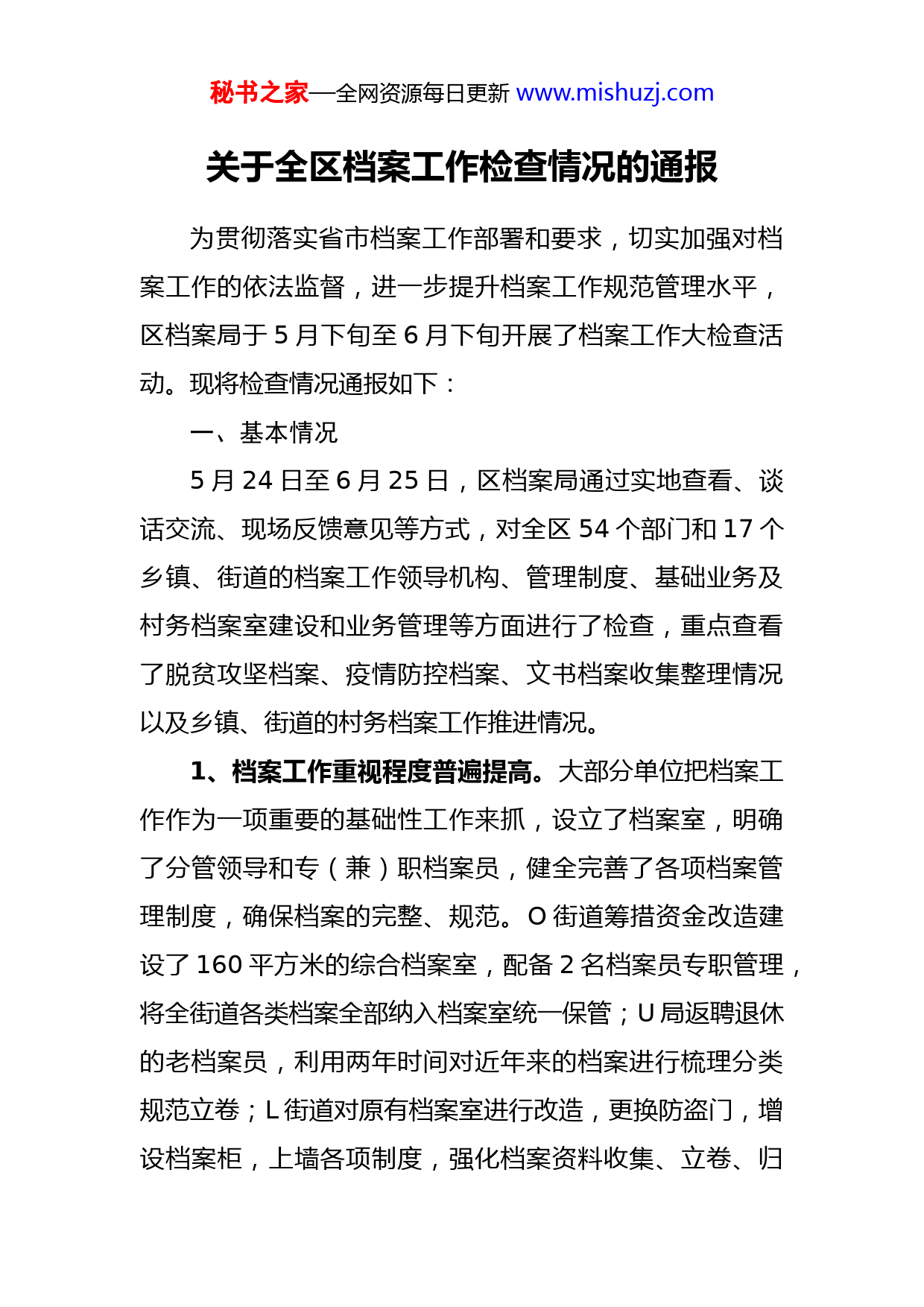 秘书之家—全网资源每日更新www.mishuzj.com关于全区档案工作检查情况的通报为贯彻落实省市档案工作部署和要求,切实加强对档案工作的依法监督,进一步提升档案工作规范管理水平,区档案局于5月下旬至6月下旬开展了档案工作大检查活动。现将检查情况通报如下:一、基本情况5月24日至6月25日,区档案局通过实地查看、谈话交流、现场反馈意见等方式,对全区54个部门和17个乡镇、街道的档案工作领导机构、管理制度、基础业务及村务档案室建设和业务管理等方面进行了检查,重点查看了脱贫攻坚档案、疫情防控档案、文书档案收集整理情况以及乡镇、街道的村务档案工作推进情况。1、档案工作重视程度普遍提高。大部分单位把档案工作作为一项重要的基础性工作来抓,设立了档案室,明确了分管领导和专(兼)职档案员,健全完善了各项档案管理制度,确保档案的完整、规范。O街道筹措资金改造建设了160平方米的综合档案室,配备2名档案员专职管理,将全街道各类档案全部纳入档案室统一保管;U局返聘退休的老档案员,利用两年时间对近年来的档案进行梳理分类规范立卷;L街道对原有档案室进行改造,更换防盗门,增设档案柜,上墙各项制度,强化档案资料收集、立卷、归秘书之家—全网资源每日更新www.mishuzj.com档;OOO虽然因企业原因档案自行保管,但长年坚持档案管理标准,现已完成包括2020年度在内的全部档案归档立卷工作。2、档案规范化程度不断增强。多数单位能够主动收集整理文件材料,档案资料完整齐全,归档文件目录编制统一完备,归档质量较高。老档案员发挥了业务骨干作用,做到了保管期限划分准确、分类合理科学、装订整齐有序归档章填写规范。文书档案管理好的单位有:新档案员能够认真负责,通过各种方式积极学习档案业务,与上次档案检查相比,一些单位在档案管理上取得了明显进步。进步较快的单位有:3、声像和实物档案有所增加。在脱贫攻坚和疫情防控档案工作中,各单位把照片、视频等声像档案纳入收集范围,丰富了档案资源。J立足职能,积极推进声像档案保存工作,投入资金购置了存储设备、建设了声像资料库房,对重要声像资料进行收录保存。R街道将反映土地改革成绩的部级表彰资料以及解放战争时期的奖章、证书等纳入档案管理范畴,积极开展实物档案收集管理。4、乡镇、街道积极推进村务档案工作。多数乡镇、街道能够按照村务档案工作部署,积极推进10%任务村档案工作,设立档案室、明确村务档案管理人员、收集整理档案资料。Y街道在村档案室制作并悬挂10项管理制度,按秘书之家—全网资源每日更新www.mishuzj.com照文书档案标准,基本完成2020年村务档案资料归档立卷W镇超前部署,在全镇22个村安排建档任务,开展档案资料收集整理工作,上报的任务村基本完成2020年度档案规范立卷。二、存在的问题1、全区档案工作发展不平衡,部分单位对档案工作重视不够,档案工作制度不健全,档案工作缺乏长效管理,脱贫攻坚和疫情防控专题档案工作拖延、滞后,档案管理人员作风不扎实、缺乏责任心。2、档案基础设施欠缺,设施配置不完善。部分单位领导对档案工作关注不够、支持不够,档案室建设不符合标准,档案室面积小,管理不到位,杂乱无序,卫生条件差缺少防盗、防火、防光、防潮、防虫等措施,档案的存放条件出现较大问题,档案室防水防潮方面存在严重安全隐患。3、档案管理不规范。整理完的档案缺少盒内目录、备考表;不按档案归档范围收集整理,有的收录不齐全,本单位文件收集少,没有大事记、组织沿革,有的扩大收录范围,上级文件保存过多、无用资料多、重复资料多;档案整理不及时,多个年度档案资料随意堆放,没有分类整理,没有按年度及时归档立卷。4、档案管理人员不稳定。新老档案员交接不畅,一些秘书之家—全网资源每日更新www.mishuzj.com单位没按照规定设置2名档案管理人员,有的单位只是名义上明确了2名管理人员,虚报1名人员实际上不参与任何档案工作,不熟悉档案业务,不利于保持档案工作接续性。5、部分乡镇、街道在村务档案工作中重视不够,措施不力,反应慢、启动晚,档案室建设不达标,档案制度没上墙,没有档案查阅登记表,档案资料少,甚至没有动手收集档案资料。三、整改要求1、要高度重视,大力支持档案工作。档案工作已列入本年度绩效考核,各部门、各单位要进一步提升对档案工作重要性的认识,主要领导要亲自过问档案工作,切实解决好档案工作中遇到的困难和问题,突出保障好档案室建设、档案人员配备和所需经费问题;分管领导要切实担负档案工作职责,加强协调和督促,配备好2名相对固定的专兼职档案管理人员,认真做好档案归档立卷、整理移交查阅登记和保管利用等工作。2、要查漏补缺,及时整改存在问题。各单位、各部门要按照检查中现场指出的问题以及通报中提到的五类问题逐条逐项对照查找,采取切实有效措施,认真进行整改。3、要增加投入,不断完善基础设施。一些单位档案室面积小、条件差,标准低,五防措施不达标,要加大档案秘书之家—全网资源每日更新www.mishuzj.com基础设施投入,想方设法改善档案室条件,特别是乡镇、街道,既要按照村务档案管理工作标准抓好村务档案室建设,也要加强本级档案室建设,保证档案室面积满足档案工作需要,完善好档案室防盗、防
