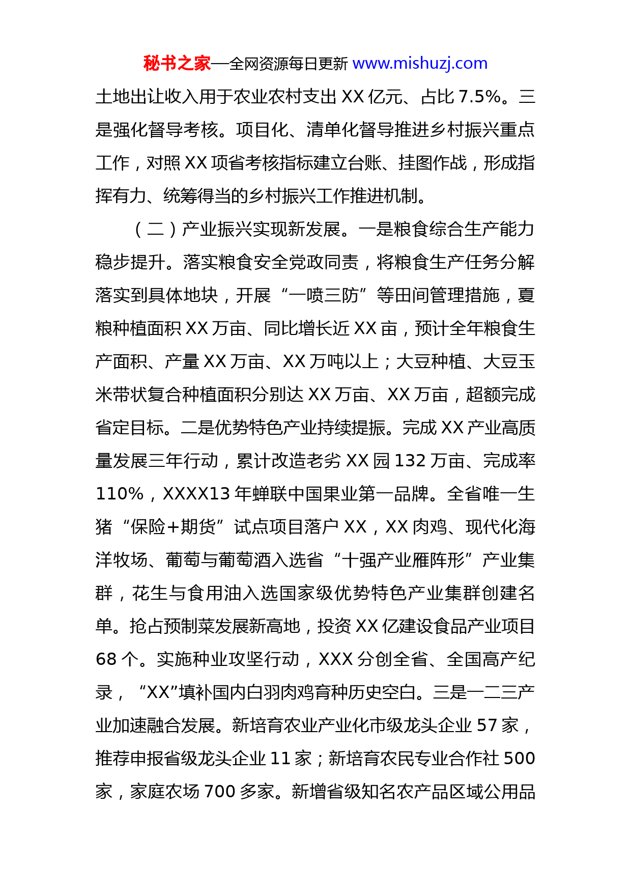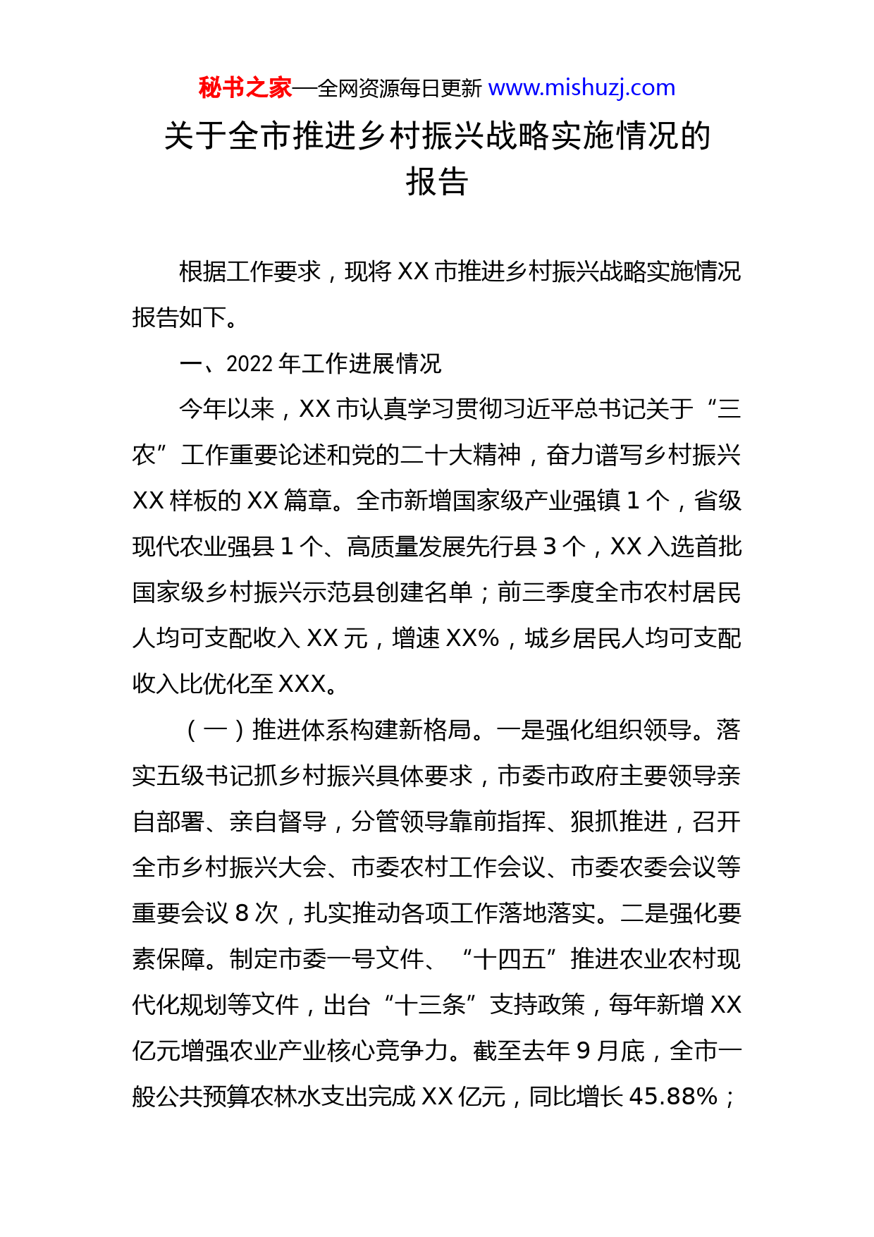 秘书之家—全网资源每日更新www.mishuzj.com关于全市推进乡村振兴战略实施情况的报告根据工作要求,现将XX市推进乡村振兴战略实施情况报告如下。一、2022年工作进展情况今年以来,XX市认真学习贯彻习近平总书记关于“三农”工作重要论述和党的二十大精神,奋力谱写乡村振兴XX样板的XX篇章。全市新增国家级产业强镇1个,省级现代农业强县1个、高质量发展先行县3个,XX入选首批国家级乡村振兴示范县创建名单;前三季度全市农村居民人均可支配收入XX元,增速XX%,城乡居民人均可支配收入比优化至XXX。(一)推进体系构建新格局。一是强化组织领导。落实五级书记抓乡村振兴具体要求,市委市政府主要领导亲自部署、亲自督导,分管领导靠前指挥、狠抓推进,召开全市乡村振兴大会、市委农村工作会议、市委农委会议等重要会议8次,扎实推动各项工作落地落实。二是强化要素保障。制定市委一号文件、“十四五”推进农业农村现代化规划等文件,出台“十三条”支持政策,每年新增XX亿元增强农业产业核心竞争力。截至去年9月底,全市一般公共预算农林水支出完成XX亿元,同比增长45.88%;秘书之家—全网资源每日更新www.mishuzj.com土地出让收入用于农业农村支出XX亿元、占比7.5%。三是强化督导考核。项目化、清单化督导推进乡村振兴重点工作,对照XX项省考核指标建立台账、挂图作战,形成指挥有力、统筹得当的乡村振兴工作推进机制。(二)产业振兴实现新发展。一是粮食综合生产能力稳步提升。落实粮食安全党政同责,将粮食生产任务分解落实到具体地块,开展“一喷三防”等田间管理措施,夏粮种植面积XX万亩、同比增长近XX亩,预计全年粮食生产面积、产量XX万亩、XX万吨以上;大豆种植、大豆玉米带状复合种植面积分别达XX万亩、XX万亩,超额完成省定目标。二是优势特色产业持续提振。完成XX产业高质量发展三年行动,累计改造老劣XX园132万亩、完成率110%,XXXX13年蝉联中国果业第一品牌。全省唯一生猪“保险+期货”试点项目落户XX,XX肉鸡、现代化海洋牧场、葡萄与葡萄酒入选省“十强产业雁阵形”产业集群,花生与食用油入选国家级优势特色产业集群创建名单。抢占预制菜发展新高地,投资XX亿建设食品产业项目68个。实施种业攻坚行动,XXX分创全省、全国高产纪录,“XX”填补国内白羽肉鸡育种历史空白。三是一二三产业加速融合发展。新培育农业产业化市级龙头企业57家,推荐申报省级龙头企业11家;新培育农民专业合作社500家,家庭农场700多家。新增省级知名农产品区域公用品秘书之家—全网资源每日更新www.mishuzj.com牌1个、企业产品品牌7个,XXXX、XX大樱桃区域公用品牌纳入农业农村部农业品牌精品培育计划。深入推进农村电子商务发展,网络零售额XX亿元、增长35.9%。大力发展乡村旅游和休闲农业,新增景区化村庄16个、旅游民宿聚集区2个、省级乡村旅游度假村3个、国家级美丽休闲乡村1个。(三)人才振兴激发新活力。一是专家服务活动扎实开展。新设立市级专家服务基地13家、省级4家,组织开展专家服务活动28场次,培训基层人才1689人。二是人才培训有序推进。开展涉农领域专业技术人员和技术骨干培训2.5万余人次。组织开展农村转移劳动力职业技能培训2.3万人次,提前完成省级下达的任务。三是人才招引成效显著。发布涉农类企业人才需求目录,对外发布本硕博岗位96个。公开招聘事业单位涉农岗位XX个、聘用XX人。接收公费农科生XX人、公费师范生XXX人、公费医学生XX人。(四)文化振兴蕴育新风尚。一是深入开展“听党话感党恩跟党走”宣传教育活动。结合学习贯彻习近平总书记关于“三农”工作的重要论述和党的二十大精神宣讲,举办各类宣讲活动XX余场次、参加各类活动人数XX万人次。二是深化移风易俗。持续推进婚丧习俗改革工作,开展红白理事会骨干培训XX次、参训人员1.1万余人,完成秘书之家—全网资源每日更新www.mishuzj.comXX个行政村村规民约修订工作。三是高标准推动新时代文明实践。打造15个实践中心、160个实践所、6200多个实践站,实现城乡全覆盖。“一年一村一场戏”实现全覆盖。(五)生态振兴展现新气象。一是农村人居环境持续提升。开展农村人居环境整治,将XX个区市XX个涉农镇街XX个村庄全部纳入检查评估范围,推动农村环境一体整治、全域提升。集中开展“三膜一袋”专项整治,遍布山野的“白色污染”得到有效清理处置。累计建成“美丽庭院”XX万户、建成率4XX%。二是乡村振兴示范创建成效显著。新增省级乡村振兴XX样板示范区3个,建成省级美丽乡村示范村38个,建设市级美丽乡村示范片13个示范片、样板村103个,打造首批市级乡村振兴示范镇11个。三是扎实推动绿色发展。加强农业面源污染防治,配方肥应用面积达12万公顷,畜禽粪污综合利用率保持在XX%以上,规模养殖场粪污设施配套率100%。完成造林绿化3338亩,评选市级森林示范乡镇5处、森林示范村居50处。五是农村基础设施建设不断强化。完成XX个村庄供水分类提升,改造农村公路XX公里,农村清洁取暖改造16.3万户,农村宽带网络覆盖率达99%以上,5G移动通信基站改造率达20%。(六)组织振兴开创新局面。一是加强村党组织建秘书之家—全网资源每日更新www.mishuzj.com设。集中开展XX个村换届“回头看”,逐村建立村情档案。实施农村基层干部乡村振兴主题培训,