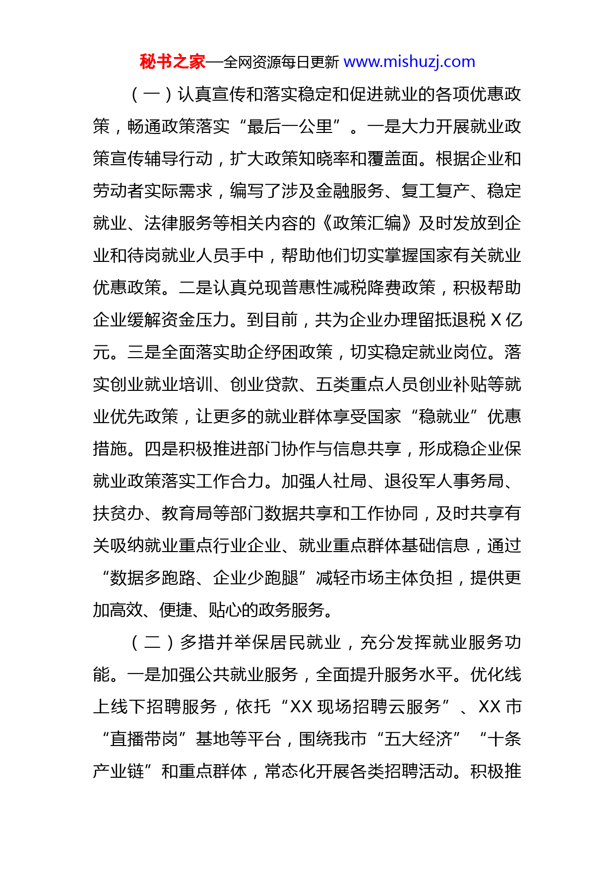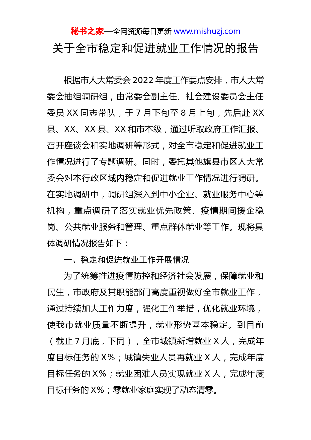 秘书之家—全网资源每日更新www.mishuzj.com关于全市稳定和促进就业工作情况的报告根据市人大常委会2022年度工作要点安排,市人大常委会抽组调研组,由常委会副主任、社会建设委员会主任委员XX同志带队,于7月下旬至8月上旬,先后赴XX县、XX、XX县、XX和市本级,通过听取政府工作汇报、召开座谈会和实地调研等形式,对全市稳定和促进就业工作情况进行了专题调研。同时,委托其他旗县市区人大常委会对本行政区域内稳定和促进就业工作情况进行调研。在实地调研中,调研组深入到中小企业、就业服务中心等机构,重点调研了落实就业优先政策、疫情期间援企稳岗、公共就业服务和管理、重点群体就业等工作。现将具体调研情况报告如下:一、稳定和促进就业工作开展情况为了统筹推进疫情防控和经济社会发展,保障就业和民生,市政府及其职能部门高度重视做好全市就业工作,通过持续加大工作力度,强化工作举措,优化就业环境,使我市就业质量不断提升,就业形势基本稳定。到目前(截止7月底,下同),全市城镇新增就业X人,完成年度目标任务的X%;城镇失业人员再就业X人,完成年度目标任务的X%;就业困难人员实现就业X人,完成年度目标任务的X%;零就业家庭实现了动态清零。秘书之家—全网资源每日更新www.mishuzj.com(一)认真宣传和落实稳定和促进就业的各项优惠政策,畅通政策落实“最后一公里”。一是大力开展就业政策宣传辅导行动,扩大政策知晓率和覆盖面。根据企业和劳动者实际需求,编写了涉及金融服务、复工复产、稳定就业、法律服务等相关内容的《政策汇编》及时发放到企业和待岗就业人员手中,帮助他们切实掌握国家有关就业优惠政策。二是认真兑现普惠性减税降费政策,积极帮助企业缓解资金压力。到目前,共为企业办理留抵退税X亿元。三是全面落实助企纾困政策,切实稳定就业岗位。落实创业就业培训、创业贷款、五类重点人员创业补贴等就业优先政策,让更多的就业群体享受国家“稳就业”优惠措施。四是积极推进部门协作与信息共享,形成稳企业保就业政策落实工作合力。加强人社局、退役军人事务局、扶贫办、教育局等部门数据共享和工作协同,及时共享有关吸纳就业重点行业企业、就业重点群体基础信息,通过“数据多跑路、企业少跑腿”减轻市场主体负担,提供更加高效、便捷、贴心的政务服务。(二)多措并举保居民就业,充分发挥就业服务功能。一是加强公共就业服务,全面提升服务水平。优化线上线下招聘服务,依托“XX现场招聘云服务”、XX市“直播带岗”基地等平台,围绕我市“五大经济”“十条产业链”和重点群体,常态化开展各类招聘活动。积极推秘书之家—全网资源每日更新www.mishuzj.com进线上零工平台应用,制定了《XX市线上零工市场平台推广应用(试行)方案》,进一步加大推广应用力度。到目前,向灵活就业人员发布各类求职信息X条。今年5月,XX市线上零工市场平台被“XXX”移动端评为“市十佳应用”。二是持续加大创业扶持力度,鼓励创业带动就业。扶持创业孵化载体建设,全市建成创业园(创业孵化基地)X家,其中全国创业孵化示范性基地X家,国家级众创空间X家,自治区级示范性园区X家。充分发挥创业担保贷款作用,到目前,全市发放创业担保贷款X万元。三是积极争取上级预算内项目,带动更多人员就业。到目前,全市争取到涉及农牧林水及生态、城建、交通、以工代赈示范、易地扶贫搬迁等重点领域项目共计X项。四是强化技能人才建设,积极开展职业技能培训和推进职业技能等级认定。围绕市场急需紧缺职业(工种),多渠道、多层次、多形式的开展职业技能培训。到目前,全市就业技能培训X人,创业培训X人,其中高校毕业生创业培训X人;职业技能等级评价认定X人,获证X人。(三)突出重点群体就业,切实兜牢民生底线。统筹做好高校毕业生、退役军人、残疾人、农牧民工、就业困难人员等重点群体就业,千方百计促就业、拓岗位。一是针对高校毕业生群体就业压力较大的实际,加快启动事业单位公开招聘和人才引进。今年,全市拟招聘各类事业单秘书之家—全网资源每日更新www.mishuzj.com位工作人员X人。我市各高校还开展了“书记校长访企拓岗促就业”专项行动,为毕业生搭建就业平台。二是切实推动退役军人就业政策落地见效,帮助退役军人实现高质量就业。结合退役军人自身特点及发展需要,有针对性的制定就业培训计划,并组织专场招聘活动。今年,接收各类安置人员X人,委托人事考试中心完成了X名大学生士兵招聘工作。三是加强残疾人就业创业保障,促进残疾人辅助性就业机构实现新突破。下达培训补助资金X万元,到6月底,培训残疾人X人。在XX区注册民办非企业机构“XX市大诺助残圆梦服务中心”,建成了电焊培训、零分贝理发、盲人按摩实训等为一体的残疾人就业基地。四是全力做好脱贫人口稳岗就业帮扶。全市脱贫人口务工就业X人,易地搬迁集中安置点有劳动能力、有就业意愿的X人已全部就业。五是推进农村牧区富余劳动力转移就业。通过“春风行动”等招聘活动送岗位、开展劳动力职业技能培训、组织开展京蒙劳务协作等方式努力促进农村牧区劳动力转移就业。到目前,实现农牧民转移就业X万人(次),完成年度目标任务的X%;其中转移6个月以上的X万人(次)。六是加强困难人员就业援助