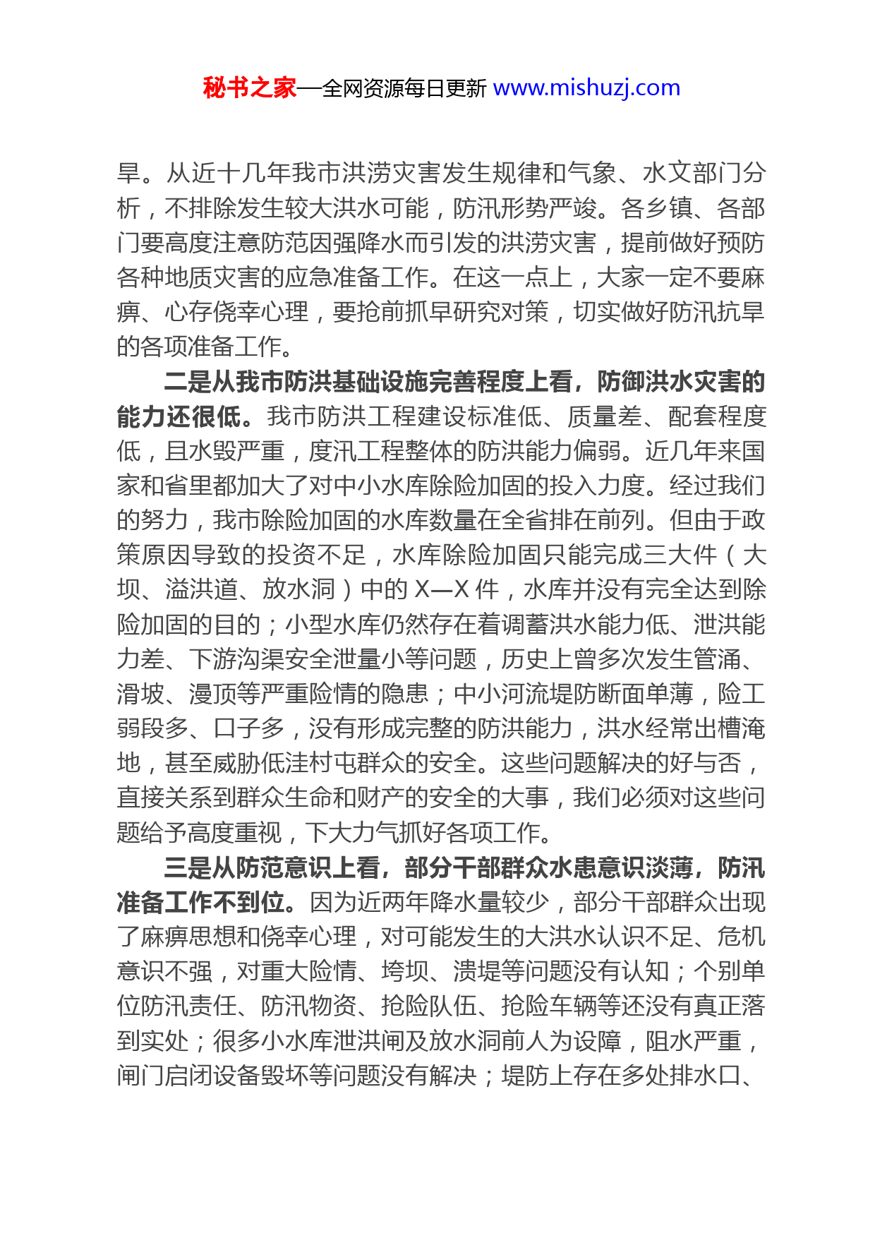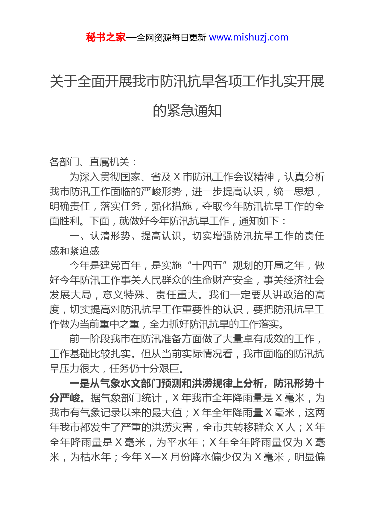 秘书之家—全网资源每日更新www.mishuzj.com关于全面开展我市防汛抗旱各项工作扎实开展的紧急通知各部门、直属机关:为深入贯彻国家、省及X市防汛工作会议精神,认真分析我市防汛工作面临的严峻形势,进一步提高认识,统一思想,明确责任,落实任务,强化措施,夺取今年防汛抗旱工作的全面胜利。下面,就做好今年防汛抗旱工作,通知如下:一、认清形势、提高认识,切实增强防汛抗旱工作的责任感和紧迫感今年是建党百年,是实施“十四五”规划的开局之年,做好今年防汛工作事关人民群众的生命财产安全,事关经济社会发展大局,意义特殊、责任重大。我们一定要从讲政治的高度,切实提高对防汛抗旱工作重要性的认识,要把防汛抗旱工作做为当前重中之重,全力抓好防汛抗旱的工作落实。前一阶段我市在防汛准备方面做了大量卓有成效的工作,工作基础比较扎实。但从当前实际情况看,我市面临的防汛抗旱压力很大,任务仍十分艰巨。一是从气象水文部门预测和洪涝规律上分析,防汛形势十分严峻。据气象部门统计,X年我市全年降雨量是X毫米,为我市有气象记录以来的最大值;X年全年降雨量X毫米,这两年我市都发生了严重的洪涝灾害,全市共转移群众X人;X年全年降雨量是X毫米,为平水年;X年全年降雨量仅为X毫米,为枯水年;今年X—X月份降水偏少仅为X毫米,明显偏秘书之家—全网资源每日更新www.mishuzj.com旱。从近十几年我市洪涝灾害发生规律和气象、水文部门分析,不排除发生较大洪水可能,防汛形势严竣。各乡镇、各部门要高度注意防范因强降水而引发的洪涝灾害,提前做好预防各种地质灾害的应急准备工作。在这一点上,大家一定不要麻痹、心存侥幸心理,要抢前抓早研究对策,切实做好防汛抗旱的各项准备工作。二是从我市防洪基础设施完善程度上看,防御洪水灾害的能力还很低。我市防洪工程建设标准低、质量差、配套程度低,且水毁严重,度汛工程整体的防洪能力偏弱。近几年来国家和省里都加大了对中小水库除险加固的投入力度。经过我们的努力,我市除险加固的水库数量在全省排在前列。但由于政策原因导致的投资不足,水库除险加固只能完成三大件(大坝、溢洪道、放水洞)中的X—X件,水库并没有完全达到除险加固的目的;小型水库仍然存在着调蓄洪水能力低、泄洪能力差、下游沟渠安全泄量小等问题,历史上曾多次发生管涌、滑坡、漫顶等严重险情的隐患;中小河流堤防断面单薄,险工弱段多、口子多,没有形成完整的防洪能力,洪水经常出槽淹地,甚至威胁低洼村屯群众的安全。这些问题解决的好与否,直接关系到群众生命和财产的安全的大事,我们必须对这些问题给予高度重视,下大力气抓好各项工作。三是从防范意识上看,部分干部群众水患意识淡薄,防汛准备工作不到位。因为近两年降水量较少,部分干部群众出现了麻痹思想和侥幸心理,对可能发生的大洪水认识不足、危机意识不强,对重大险情、垮坝、溃堤等问题没有认知;个别单位防汛责任、防汛物资、抢险队伍、抢险车辆等还没有真正落到实处;很多小水库泄洪闸及放水洞前人为设障,阻水严重,闸门启闭设备毁坏等问题没有解决;堤防上存在多处排水口、秘书之家—全网资源每日更新www.mishuzj.com道口没有填堵,部分堤段水毁严重,整体防洪能力低,河道内人为设障严重。这一点上,大家都要对号入座,想一想、看一看,自己在这些方面还有那些没有压实落靠的,有则改之,无则加勉。面对当前防汛抗旱工作的严峻形势,全市上下一定要牢固树立“有汛无汛按有汛准备,小汛大汛按大汛准备”的思想,认真总结多年防汛、抗洪、抢险的经验教训,坚持“安全第一、常备不懈、以防为主、全力抢险”的工作方针,坚持以人为本,以对党和人民高度负责的态度,全力做好防大汛、抢大险、救大灾的各项准备,确保防汛抗旱工作取得全面胜利。二、明确任务、落实责任,全力推进我市防汛抗旱各项工作扎实开展今年防汛工作要坚持以人为本,依法防控,科学防控,群防群控;确保中小河流不溃堤,水库不垮坝,人员不伤亡;要以水毁工程修复、中小水库防汛、山洪灾害防御和城镇防洪排涝为重点;明确任务,强化措施,全力做好今年防汛抗旱工作。一要切实落实好各级防汛责任制。行政首长负责制是防汛工作的根本组织保障,我们要以行政首长负责制为核心,狠抓各级防汛组织和各项职责的落实。要按照防大汛的要求,明确责任分工,形成体系健全、严密高效的防汛联动组织保障机制。各乡镇行政一把手是防汛工作的第一责任人,一定要认真负起责任,切实抓好本辖区的防汛工作;要与负责的水库、堤防、村屯等重点部位搞好任务对接,必要时要到现场督促检查防汛工作,及时帮助解决实际问题。防汛部门要抓紧落实领导包堤、包库、包险段、包村屯责任制并逐级签定防汛责任状。要明确堤防水库防汛安全的行政责任人和技术负责人,防汛责秘书之家—全网资源每日更新www.mishuzj.com任人必须上岗到位,切实履行职责。一旦堤防或水库出险,责任人要第一时间到现场,分析险情、制定方案、转移群众、组织抢险。二要抓好中小水库的安全度汛工作。X市的X个市(区)、县共有X座大中小型水库,北安就有X座,占了一半。我市的水库遍布全市各个乡镇和林场,还有一些企业自管水库,一旦出险,极易造成重大人员伤亡和财产