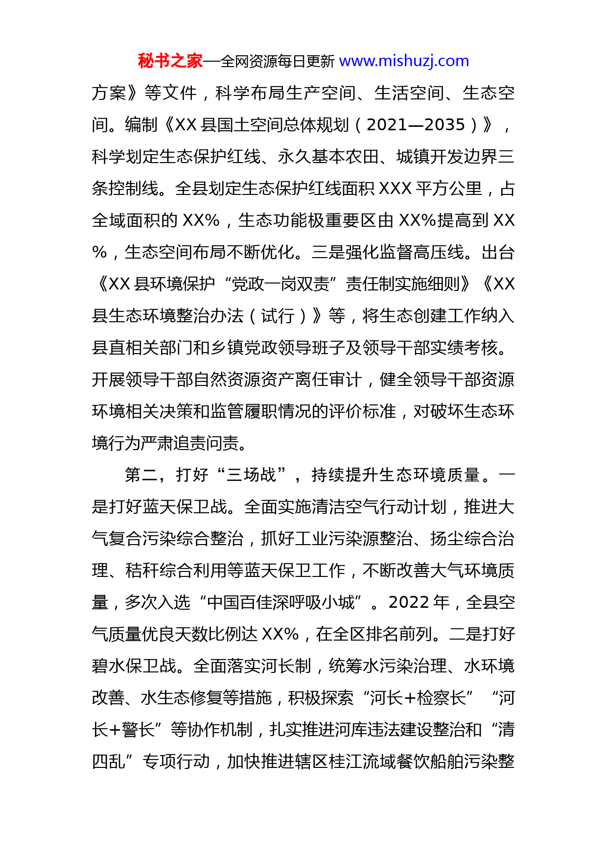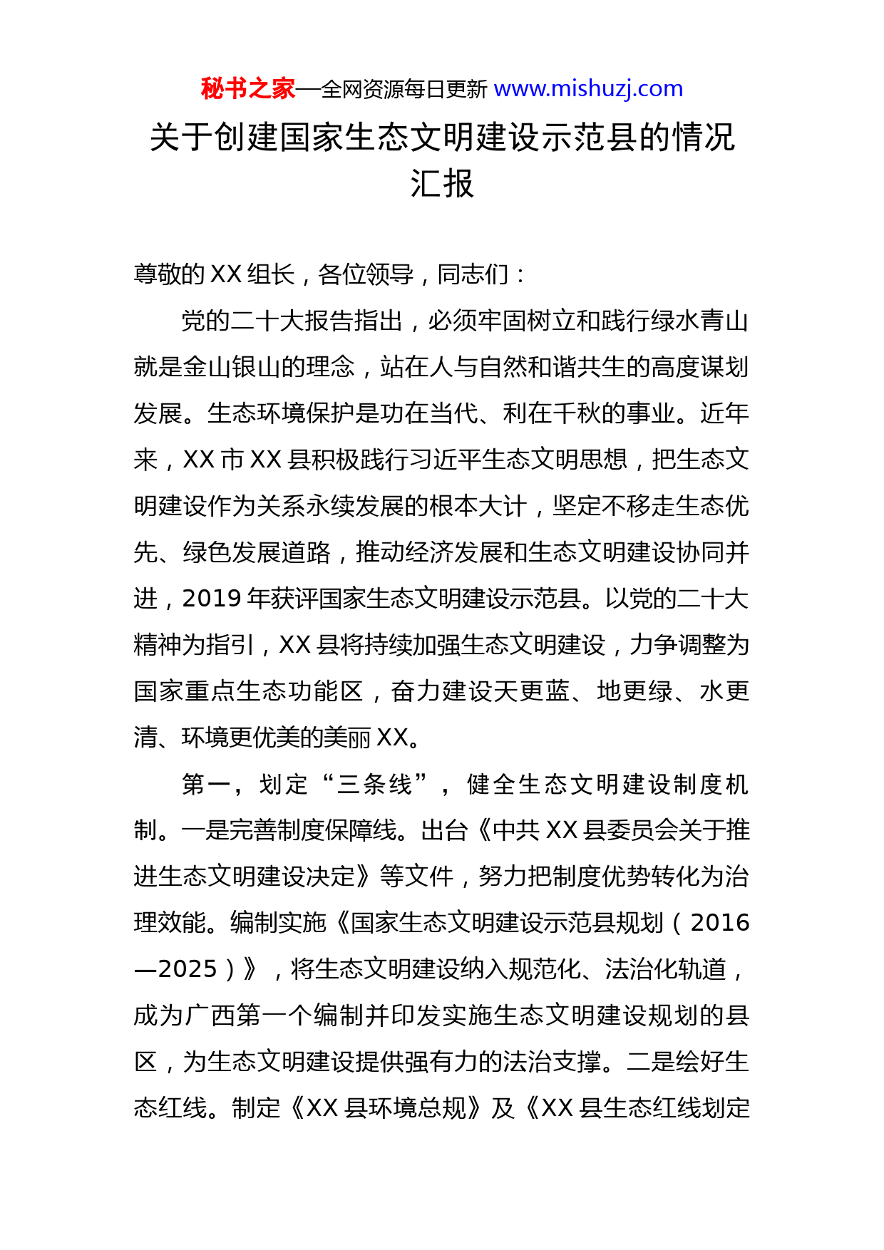 秘书之家—全网资源每日更新www.mishuzj.com关于创建国家生态文明建设示范县的情况汇报尊敬的XX组长,各位领导,同志们:党的二十大报告指出,必须牢固树立和践行绿水青山就是金山银山的理念,站在人与自然和谐共生的高度谋划发展。生态环境保护是功在当代、利在千秋的事业。近年来,XX市XX县积极践行习近平生态文明思想,把生态文明建设作为关系永续发展的根本大计,坚定不移走生态优先、绿色发展道路,推动经济发展和生态文明建设协同并进,2019年获评国家生态文明建设示范县。以党的二十大精神为指引,XX县将持续加强生态文明建设,力争调整为国家重点生态功能区,奋力建设天更蓝、地更绿、水更清、环境更优美的美丽XX。第一,划定“三条线”,健全生态文明建设制度机制。一是完善制度保障线。出台《中共XX县委员会关于推进生态文明建设决定》等文件,努力把制度优势转化为治理效能。编制实施《国家生态文明建设示范县规划(2016—2025)》,将生态文明建设纳入规范化、法治化轨道,成为广西第一个编制并印发实施生态文明建设规划的县区,为生态文明建设提供强有力的法治支撑。二是绘好生态红线。制定《XX县环境总规》及《XX县生态红线划定秘书之家—全网资源每日更新www.mishuzj.com方案》等文件,科学布局生产空间、生活空间、生态空间。编制《XX县国土空间总体规划(2021—2035)》,科学划定生态保护红线、永久基本农田、城镇开发边界三条控制线。全县划定生态保护红线面积XXX平方公里,占全域面积的XX%,生态功能极重要区由XX%提高到XX%,生态空间布局不断优化。三是强化监督高压线。出台《XX县环境保护“党政一岗双责”责任制实施细则》《XX县生态环境整治办法(试行)》等,将生态创建工作纳入县直相关部门和乡镇党政领导班子及领导干部实绩考核。开展领导干部自然资源资产离任审计,健全领导干部资源环境相关决策和监管履职情况的评价标准,对破坏生态环境行为严肃追责问责。第二,打好“三场战”,持续提升生态环境质量。一是打好蓝天保卫战。全面实施清洁空气行动计划,推进大气复合污染综合整治,抓好工业污染源整治、扬尘综合治理、秸秆综合利用等蓝天保卫工作,不断改善大气环境质量,多次入选“中国百佳深呼吸小城”。2022年,全县空气质量优良天数比例达XX%,在全区排名前列。二是打好碧水保卫战。全面落实河长制,统筹水污染治理、水环境改善、水生态修复等措施,积极探索“河长+检察长”“河长+警长”等协作机制,扎实推进河库违法建设整治和“清四乱”专项行动,加快推进辖区桂江流域餐饮船舶污染整秘书之家—全网资源每日更新www.mishuzj.com治工作,推动水生态环境保护取得较好成效。出台《广西XX桂江国家湿地公园管理办法》,桂江水质达标率100%,桂江水质2022年在全国排第十名。三是打好净土保卫战。坚持预防为主、保护优先、分类管理的原则,扎实推进土壤污染防治各项工作。加强环境风险管控,完成农用地土壤污染状况详查,建立矿产资源勘查开采许可审批和招拍挂制度,抓好矿山、尾矿库、固废危废以及辐射环境安全监管。建立县、乡、村三级田长体系,切实加强耕地保护。全面推行林长制,不断加强森林资源管理和保护力度,目前全县森林覆盖率XX%。第三,落实“三举措”,打通“两山”转化通道。一是优化产业结构布局。完善《XX县工业集中区规划》,严格执行环境准入负面清单和重点生态功能区产业准入负面清单,严控“两高”项目。实施创新驱动战略,以生态产业化、产业生态化为引领,大力发展新能源和可再生能源,培育壮大绿色节能、清洁环保等新兴产业。推动产业转型升级,主动放弃需大量消耗林业资源的总投资XX亿元的林浆纸一体化项目,关停一批高污染企业,确保生态良性循环。二是发展壮大绿色产业集群。围绕“一片叶子”做大茶产业,2022年全县茶园总面积达XX万亩,干茶产量达XX万吨,产值达XX亿元,XX茶公共品牌价值达XX亿元,荣登2022中国品牌价值评价区域品牌(地理标志)秘书之家—全网资源每日更新www.mishuzj.com百强榜。“一瓶水”品牌逐步打响,成功入围广西“两个核心区、九个基地”首批产业布局的“九个新兴天然优质饮用水产业基地”第三位,以将军峰、忆然、甘甜泉等品牌为代表的优质饮用水挺进粤港澳大湾区市场。做足“生态+旅游”“生态+康养”文章,着力打造古镇寻梦、田园观光、民宿体验、茶海度假、山水养生、温泉休闲六大旅游产品体系,目前共有国家5A级旅游景区X家、4A级旅游景区X家、3A级旅游景区X家以及星级乡村旅游区X家。三是坚持改革引领。积极稳妥推进碳达峰碳中和,积极开发林业碳汇项目,通过市场化手段参与林业资源交易,实现经济发展与生态保护的良性循环。抓紧抓好绿色发展集成改革试点,加快推进药食同源康养产业集成改革试点工作,顺利完成XX个千亩以上规模的中草药标准化种植示范基地、药食同源康养体验中心、药食同源康养产品生产中心等建设任务,获评全国康养百强县。汇报完毕,请各位考核组领导指正!