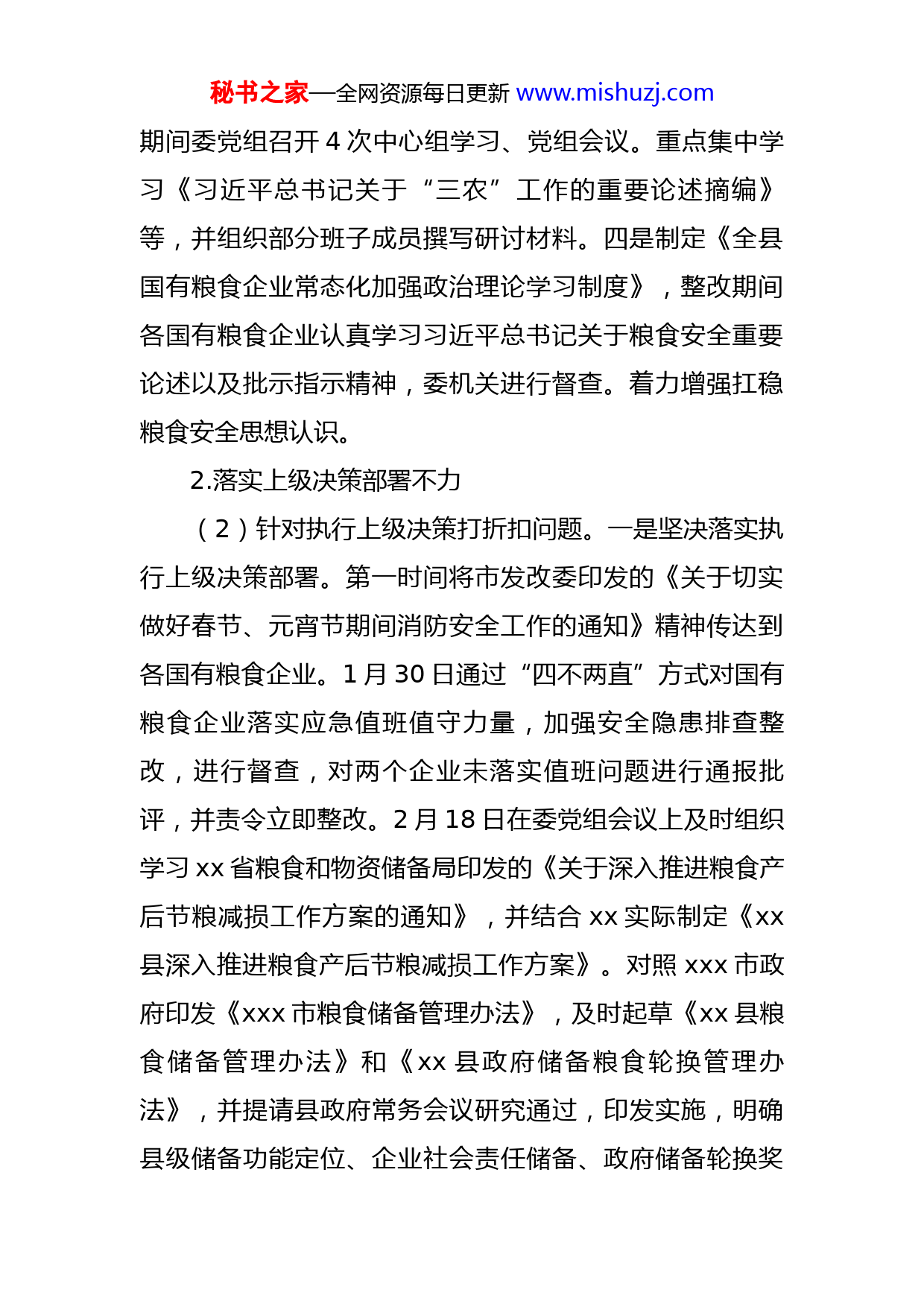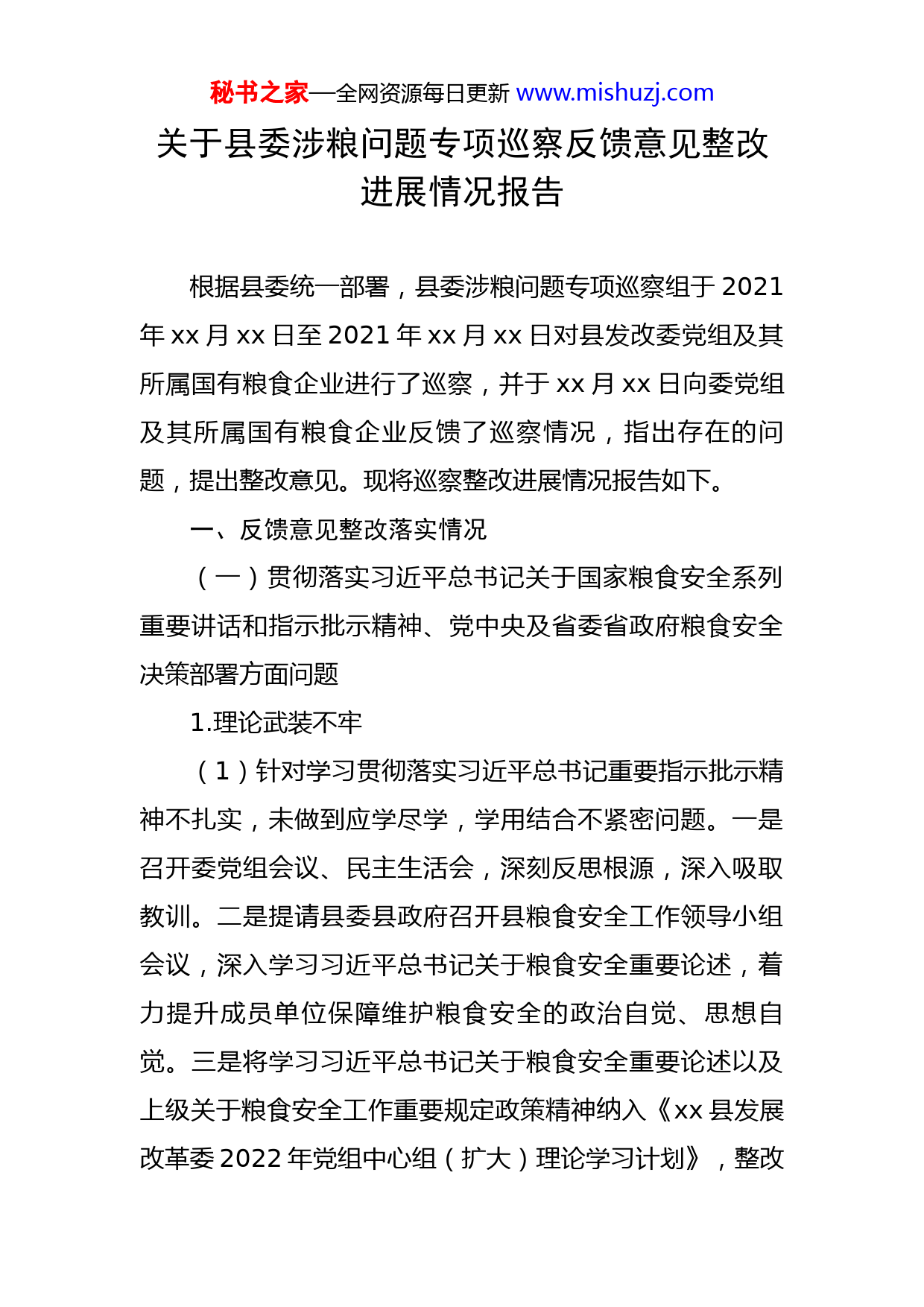 秘书之家—全网资源每日更新www.mishuzj.com关于县委涉粮问题专项巡察反馈意见整改进展情况报告根据县委统一部署,县委涉粮问题专项巡察组于2021年xx月xx日至2021年xx月xx日对县发改委党组及其所属国有粮食企业进行了巡察,并于xx月xx日向委党组及其所属国有粮食企业反馈了巡察情况,指出存在的问题,提出整改意见。现将巡察整改进展情况报告如下。一、反馈意见整改落实情况(一)贯彻落实习近平总书记关于国家粮食安全系列重要讲话和指示批示精神、党中央及省委省政府粮食安全决策部署方面问题1.理论武装不牢(1)针对学习贯彻落实习近平总书记重要指示批示精神不扎实,未做到应学尽学,学用结合不紧密问题。一是召开委党组会议、民主生活会,深刻反思根源,深入吸取教训。二是提请县委县政府召开县粮食安全工作领导小组会议,深入学习习近平总书记关于粮食安全重要论述,着力提升成员单位保障维护粮食安全的政治自觉、思想自觉。三是将学习习近平总书记关于粮食安全重要论述以及上级关于粮食安全工作重要规定政策精神纳入《xx县发展改革委2022年党组中心组(扩大)理论学习计划》,整改秘书之家—全网资源每日更新www.mishuzj.com期间委党组召开4次中心组学习、党组会议。重点集中学习《习近平总书记关于“三农”工作的重要论述摘编》等,并组织部分班子成员撰写研讨材料。四是制定《全县国有粮食企业常态化加强政治理论学习制度》,整改期间各国有粮食企业认真学习习近平总书记关于粮食安全重要论述以及批示指示精神,委机关进行督查。着力增强扛稳粮食安全思想认识。2.落实上级决策部署不力(2)针对执行上级决策打折扣问题。一是坚决落实执行上级决策部署。第一时间将市发改委印发的《关于切实做好春节、元宵节期间消防安全工作的通知》精神传达到各国有粮食企业。1月30日通过“四不两直”方式对国有粮食企业落实应急值班值守力量,加强安全隐患排查整改,进行督查,对两个企业未落实值班问题进行通报批评,并责令立即整改。2月18日在委党组会议上及时组织学习xx省粮食和物资储备局印发的《关于深入推进粮食产后节粮减损工作方案的通知》,并结合xx实际制定《xx县深入推进粮食产后节粮减损工作方案》。对照xxx市政府印发《xxx市粮食储备管理办法》,及时起草《xx县粮食储备管理办法》和《xx县政府储备粮食轮换管理办法》,并提请县政府常务会议研究通过,印发实施,明确县级储备功能定位、企业社会责任储备、政府储备轮换奖秘书之家—全网资源每日更新www.mishuzj.com惩等规定。认真落实《关于做好2022年度优质粮食工程项目申报工作的通知》,会同xxx现代农业发展公司谋划2022年度2.5万吨仓储项目申报中央预算内投资资金。二是委党组主要负责人对“亮剑2021”专项执法行动工作开展不实的原分工领导予以提醒谈话。(3)针对推动国有粮食企业改革韧劲不足问题。一是加快国有粮食企业改革。综合国有粮食企业改革《实施方案》调整以及实际情况,组建xx县粮丰粮食购销有限公司,负责全县粮食储备、购销经营管理,按程序规定组建公司董事会、监事会,建立公司章程,完成新公司人员组成。二是委托第三方机构完成xx县国家粮食储备库、xx县南方粮食购销有限公司、xx县北方粮食购销有限公司清产核资,与xxx现代农业发展公司洽谈资产收储等工作。(二)粮企业务主管监管部门履行管理职责、落实监管责任方面问题3.粮食安全政治责任扛得不够牢(4)针对粮食安全政治责任扛得不够牢问题。一是编制《xx县粮食和物资储备“十四五”规划(2021-2025)》,系统谋划安排“十四五”我县粮食安全工作,明确今后一个时期粮食和物资储备发展的总体要求、主要目标和重点任务。二是制定《扛稳粮食安全责任工作要点》,并将其纳入委月度20项重点调度清单内容,实行与秘书之家—全网资源每日更新www.mishuzj.com委其他重点工作同部署、同调度、同督促,确保工作实效。三是制定《xx县粮食应急收购工作实施方案》,明确粮食应急收购实施条件、工作原则、组织体系、任务分工、响应程序、应急措施,坚决防范应对可能发生的大面积“卖粮难”现象,充分保护种粮农民利益。上半年全面摸排小麦和稻谷实际种植面积,精准测算亩产量、商品量和收购量,谋划筹措好国有粮食企业有效空仓容,全力做好收购前相关准备工作。健全信息报告制度,密切跟踪粮食市场形势,及时发布收购进度、市场价格监测等数据。加强政策宣传,通过在粮食收购场所张贴宣传画、对种粮大户散发宣传单等多种形式宣传解读粮食收购政策,稳定市场预期,维护收购秩序。四是开展安全生产大检查。印发《开展粮食和物资储备系统安全生产大检查通知》,对全县粮食企业全面排查整治安全责任落实、粮食出入库、消防安全、粮食质量以及设施设备运行等方面隐患,坚决维护粮食系统生产经营活动安全稳定。五是配强粮食监管队伍力量。对照“三定”方案,调整3名工作人员从事粮食物资储备股工作。组织2人参加了2022年度全省粮食执法资格证考试获取执法证书。组织3名职工参加2022年全国政策性粮油库存检查动员培训视频电话会议,切实提升执法监管水平。4.仓储设施建设重视不够秘书之家—全网资源每日更新www.mishuzj.com(5)针对仓储设施建设重视不