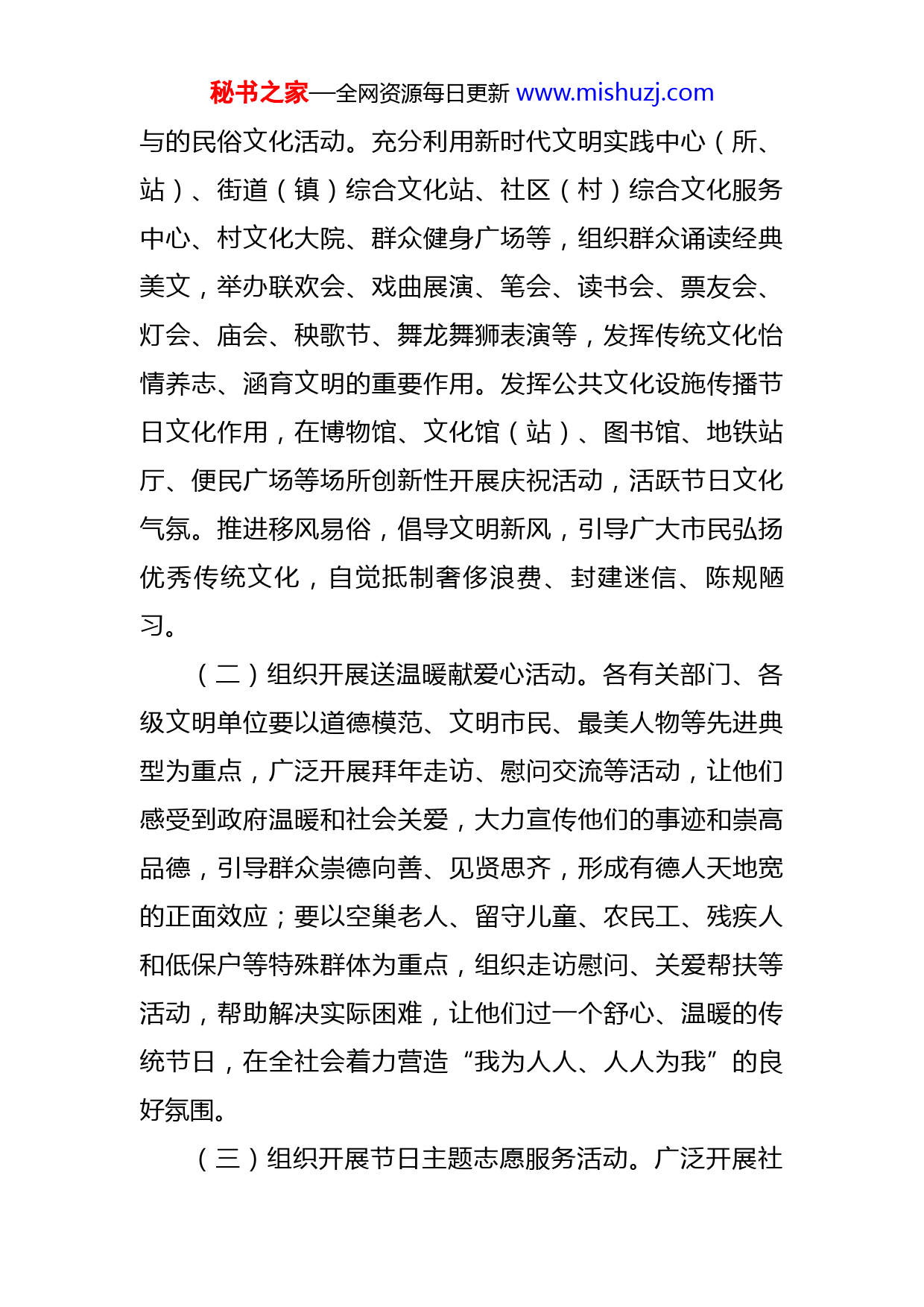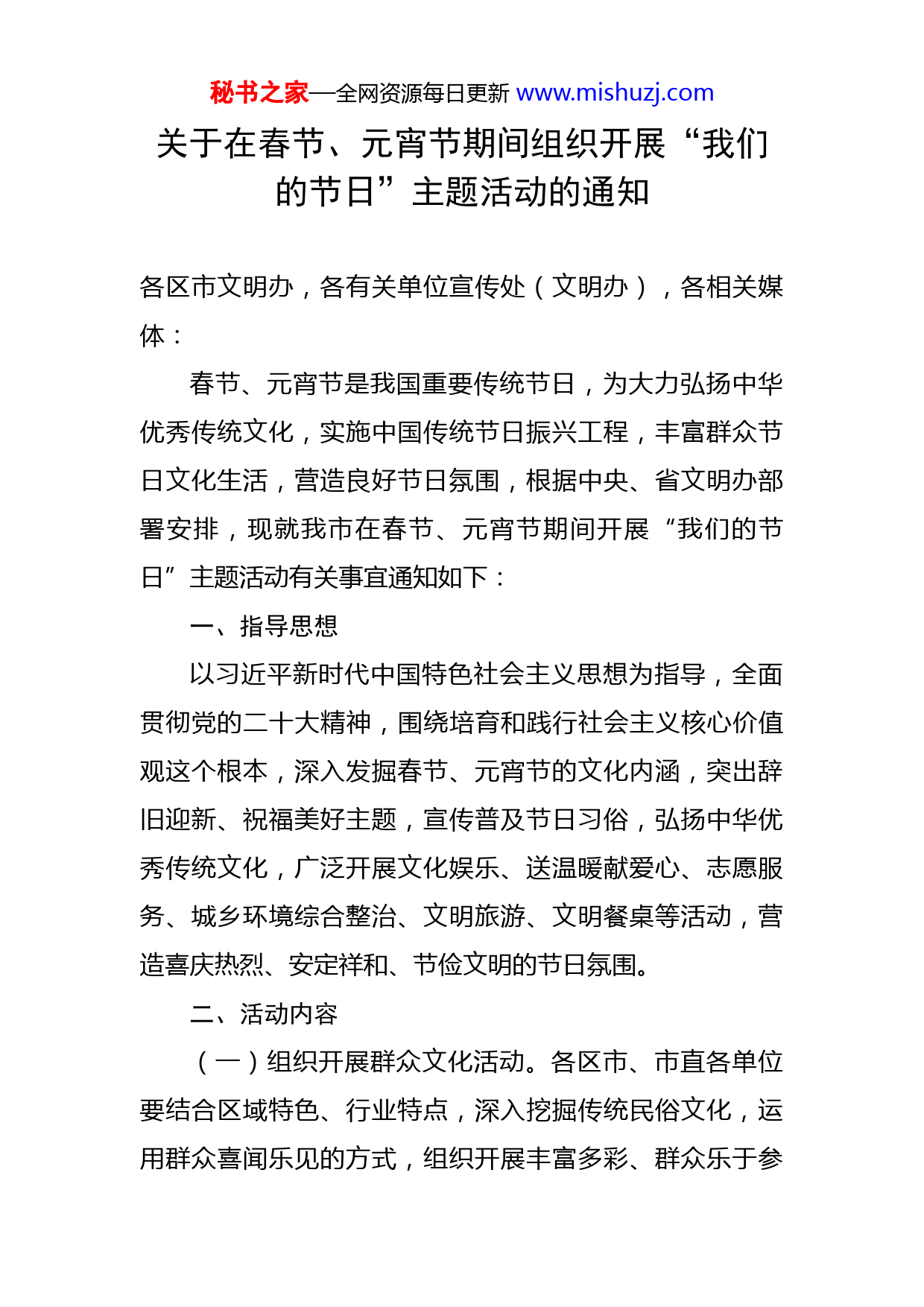 秘书之家—全网资源每日更新www.mishuzj.com关于在春节、元宵节期间组织开展“我们的节日”主题活动的通知各区市文明办,各有关单位宣传处(文明办),各相关媒体:春节、元宵节是我国重要传统节日,为大力弘扬中华优秀传统文化,实施中国传统节日振兴工程,丰富群众节日文化生活,营造良好节日氛围,根据中央、省文明办部署安排,现就我市在春节、元宵节期间开展“我们的节日”主题活动有关事宜通知如下:一、指导思想以习近平新时代中国特色社会主义思想为指导,全面贯彻党的二十大精神,围绕培育和践行社会主义核心价值观这个根本,深入发掘春节、元宵节的文化内涵,突出辞旧迎新、祝福美好主题,宣传普及节日习俗,弘扬中华优秀传统文化,广泛开展文化娱乐、送温暖献爱心、志愿服务、城乡环境综合整治、文明旅游、文明餐桌等活动,营造喜庆热烈、安定祥和、节俭文明的节日氛围。二、活动内容(一)组织开展群众文化活动。各区市、市直各单位要结合区域特色、行业特点,深入挖掘传统民俗文化,运用群众喜闻乐见的方式,组织开展丰富多彩、群众乐于参秘书之家—全网资源每日更新www.mishuzj.com与的民俗文化活动。充分利用新时代文明实践中心(所、站)、街道(镇)综合文化站、社区(村)综合文化服务中心、村文化大院、群众健身广场等,组织群众诵读经典美文,举办联欢会、戏曲展演、笔会、读书会、票友会、灯会、庙会、秧歌节、舞龙舞狮表演等,发挥传统文化怡情养志、涵育文明的重要作用。发挥公共文化设施传播节日文化作用,在博物馆、文化馆(站)、图书馆、地铁站厅、便民广场等场所创新性开展庆祝活动,活跃节日文化气氛。推进移风易俗,倡导文明新风,引导广大市民弘扬优秀传统文化,自觉抵制奢侈浪费、封建迷信、陈规陋习。(二)组织开展送温暖献爱心活动。各有关部门、各级文明单位要以道德模范、文明市民、最美人物等先进典型为重点,广泛开展拜年走访、慰问交流等活动,让他们感受到政府温暖和社会关爱,大力宣传他们的事迹和崇高品德,引导群众崇德向善、见贤思齐,形成有德人天地宽的正面效应;要以空巢老人、留守儿童、农民工、残疾人和低保户等特殊群体为重点,组织走访慰问、关爱帮扶等活动,帮助解决实际困难,让他们过一个舒心、温暖的传统节日,在全社会着力营造“我为人人、人人为我”的良好氛围。(三)组织开展节日主题志愿服务活动。广泛开展社秘书之家—全网资源每日更新www.mishuzj.com区邻里守望志愿服务活动,动员志愿者以结对帮扶的形式,把空巢老人、残疾人、留守儿童接到家中,同吃团圆饭,共度除夕夜,营造全社会邻里关爱、守望相助的良好氛围。开展关爱留守农民工活动,以送祝福、送亲情、送文化、送平安、送健康为主要内容,组织开展形式多样的志愿服务活动。开展送文化下乡志愿服务活动,组织文艺工作志愿者深入乡村、社区,举办公益性文艺演出等,与群众面对面开展文化服务、辅导和交流。结合“文明餐桌”活动,组织志愿者开展丰富多彩的绿色实践活动,宣传节约理念,倡导崇尚节约、反对浪费的生活方式和消费模式。做好文明乘车志愿服务工作,在长途汽车站、火车站、机场等场所为春运旅客提供解疑答难、咨询引导、秩序乘车等志愿服务活动,营造温暖舒畅的春运环境。(四)组织开展城乡环境综合整治活动。加强公园、广场、商业大街等公共场所的卫生清理,大力整治背街小巷的环境卫生,清除卫生死角。开展农村垃圾集中整治行动,彻底清理村庄周边、道路两侧、排水沟渠、城乡结合部等区域存量垃圾,保持良好农村环境。积极开展垃圾分类宣传,促进养成良好习惯。结合公共场所禁烟、雾霾治理等行动,倡议市民不吸烟、少开车,禁放烟花鞭炮,共同创造宜居幸福、和谐舒心的优美环境。(五)深入推进文明旅游工作。在机场、邮轮母港、秘书之家—全网资源每日更新www.mishuzj.com火车站、长途汽车站、景区景点和宾馆饭店等重要场所,在节日期间广泛进行文明旅游公益宣传。深化争做出境游“文明使者”和国内游“美德游客”活动,节日期间,文化旅游部门要加强旅行社组团管理,将文明旅游引导作为组团带队的重要职责,认真做好出行前宣传教育和全程提醒引导,不断增强市民文明旅游意识。三、工作要求(一)精心组织安排。要把春节、元宵节期间组织开展“我们的节日”主题活动,作为丰富和活跃群众节日文化活动的重要形式,把“我们的节日”主题活动与各项创建活动相结合,各级文明单位、文明村镇、文明社区、文明家庭、文明校园等组织开展网上拜大年、送祝福、倡节俭、晒家风等线上线下活动,积极创新活动形式,精心设计活动载体,传承文明、弘扬新风。(二)突出挖掘培育。挖掘优秀文化资源,培育“我们的节日”活动基地,固化节日地标符号,搭建有影响、有特色的传播阵地,增强传统节日传播力吸引力。加强传统节日习俗和非物质文化遗产的研究保护及推广传承,弘扬节日民俗文化,让优秀传统文化焕发光彩。(三)注重勤俭节约。厉行勤俭节约、反对铺张浪费,营造文明节俭、风清气正的节日氛围。在设计活动项目、开展主题活动时要坚持从严从简,坚持绿色环保,争秘书之家—全网资源每日更新www.mishuzj.com取以最小的成本获得最大的效果。在开展拜年走访