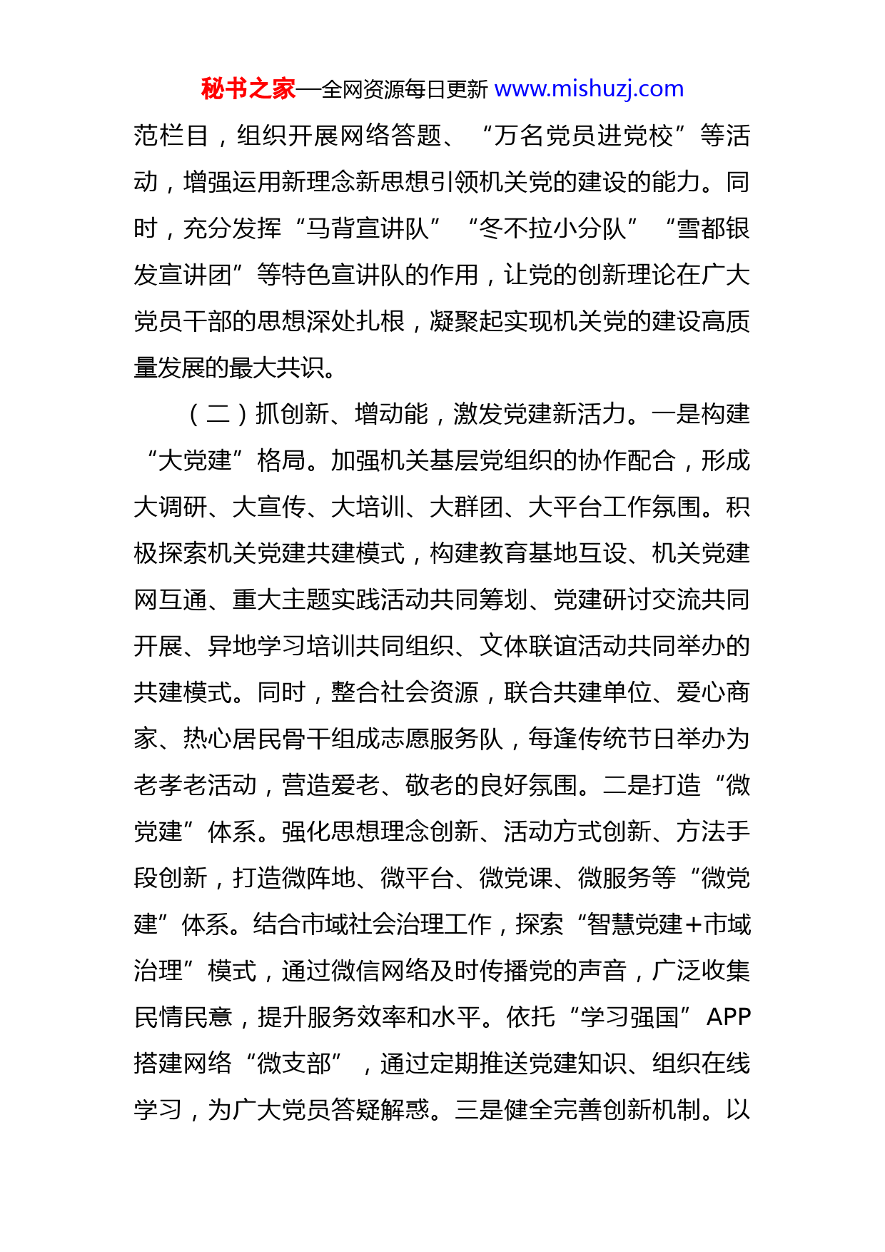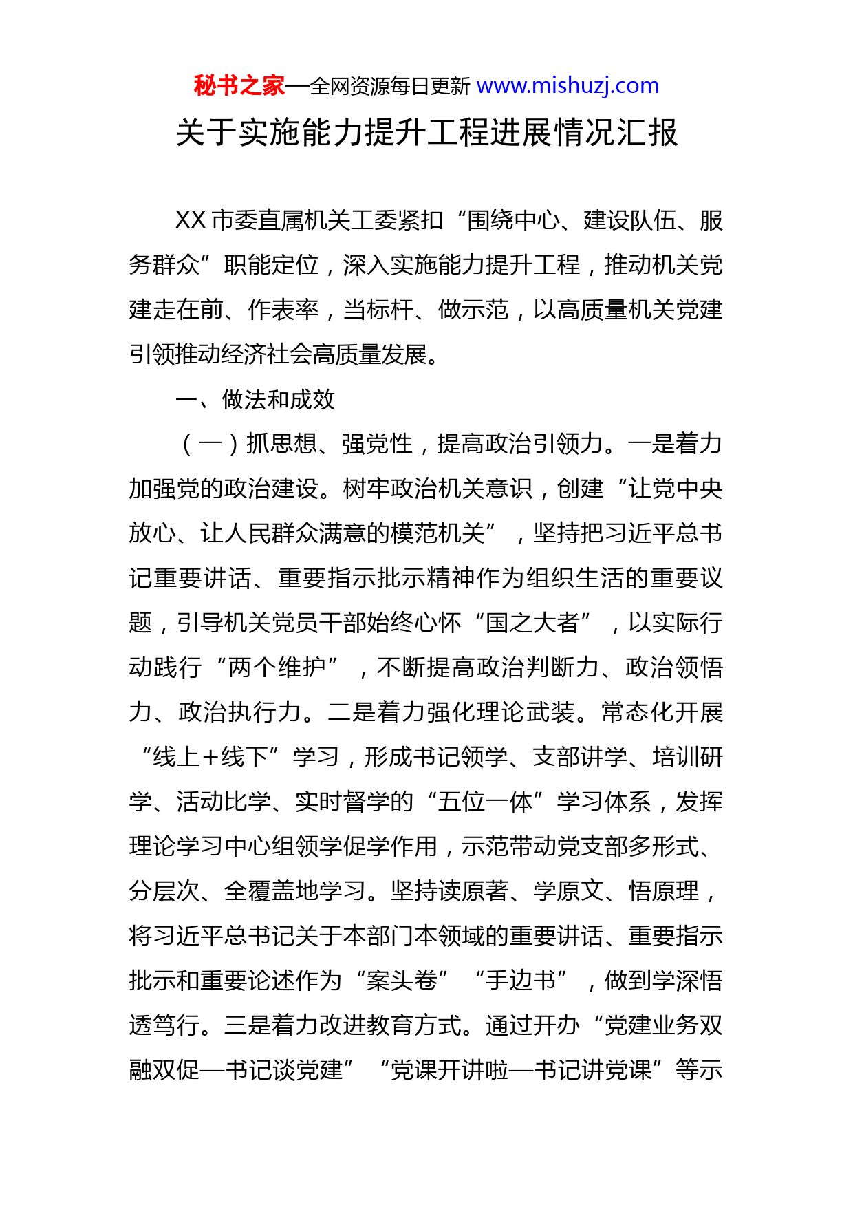 秘书之家—全网资源每日更新www.mishuzj.com关于实施能力提升工程进展情况汇报XX市委直属机关工委紧扣“围绕中心、建设队伍、服务群众”职能定位,深入实施能力提升工程,推动机关党建走在前、作表率,当标杆、做示范,以高质量机关党建引领推动经济社会高质量发展。一、做法和成效(一)抓思想、强党性,提高政治引领力。一是着力加强党的政治建设。树牢政治机关意识,创建“让党中央放心、让人民群众满意的模范机关”,坚持把习近平总书记重要讲话、重要指示批示精神作为组织生活的重要议题,引导机关党员干部始终心怀“国之大者”,以实际行动践行“两个维护”,不断提高政治判断力、政治领悟力、政治执行力。二是着力强化理论武装。常态化开展“线上+线下”学习,形成书记领学、支部讲学、培训研学、活动比学、实时督学的“五位一体”学习体系,发挥理论学习中心组领学促学作用,示范带动党支部多形式、分层次、全覆盖地学习。坚持读原著、学原文、悟原理,将习近平总书记关于本部门本领域的重要讲话、重要指示批示和重要论述作为“案头卷”“手边书”,做到学深悟透笃行。三是着力改进教育方式。通过开办“党建业务双融双促—书记谈党建”“党课开讲啦—书记讲党课”等示秘书之家—全网资源每日更新www.mishuzj.com范栏目,组织开展网络答题、“万名党员进党校”等活动,增强运用新理念新思想引领机关党的建设的能力。同时,充分发挥“马背宣讲队”“冬不拉小分队”“雪都银发宣讲团”等特色宣讲队的作用,让党的创新理论在广大党员干部的思想深处扎根,凝聚起实现机关党的建设高质量发展的最大共识。(二)抓创新、增动能,激发党建新活力。一是构建“大党建”格局。加强机关基层党组织的协作配合,形成大调研、大宣传、大培训、大群团、大平台工作氛围。积极探索机关党建共建模式,构建教育基地互设、机关党建网互通、重大主题实践活动共同筹划、党建研讨交流共同开展、异地学习培训共同组织、文体联谊活动共同举办的共建模式。同时,整合社会资源,联合共建单位、爱心商家、热心居民骨干组成志愿服务队,每逢传统节日举办为老孝老活动,营造爱老、敬老的良好氛围。二是打造“微党建”体系。强化思想理念创新、活动方式创新、方法手段创新,打造微阵地、微平台、微党课、微服务等“微党建”体系。结合市域社会治理工作,探索“智慧党建+市域治理”模式,通过微信网络及时传播党的声音,广泛收集民情民意,提升服务效率和水平。依托“学习强国”APP搭建网络“微支部”,通过定期推送党建知识、组织在线学习,为广大党员答疑解惑。三是健全完善创新机制。以秘书之家—全网资源每日更新www.mishuzj.com党章、党内法规为根本遵循,积极探索创新机关党建工作思路。聚焦党建引领基层治理、支部主题党日、机关党员干部教育等方面,定期召开机关党建工作推进会,开展党员思想动态调研、机关党建与业务相融合专题调研,常态化做好困难党员和老党员慰问工作,深入挖掘创新潜力、拓展创新空间,大胆尝试,在创新中提档升级、争先进位。(三)抓基础、促规范,提高基层执行力。一是建强基层党组织。以党支部建设为基础,坚持“抓两头带中间”,抓好标准化规范化党支部建设,优化党组织班子,不断增强党组织政治功能和组织功能。对示范党支部命名授牌,带动基层党组织全面达标,构建起上下贯通、执行有力的组织体系。二是规范党内组织生活。以提升组织力为重点,强化基层党组织政治功能,严格落实党员领导干部双重组织生活、“三会一课”、民主评议党员、主题党日等制度,坚持和完善重温入党誓词及党员过“政治生日”等政治仪式,研究制定严格落实“三会一课”制度的《实施意见》,督促县处级以上党员领导干部以普通党员身份参加所在支部活动,实现“三会一课”全程纪实,推动基层党组织全面进步、全面过硬。三是完善常态化工作机制。推行党建指导员制度,选派党性强、作风正、素质高的工委干部,通过平时掌握动态、随机走访指导、年底秘书之家—全网资源每日更新www.mishuzj.com综合考核等方式,对所属机关基层党组织进行常态化全覆盖指导。推行党务干部“任用备案制”,将专兼职党务工作经历纳入干部履历,把党务岗位作为培养锻炼干部的重要平台,积极推动专职党务干部和业务干部双向交流,建立党支部委员履职培训、支部书记集中轮训制度,使党务工作既成就事业又成就人才。(四)抓队伍、强素质,提高组织战斗力。一是实施党员干部政治能力提升行动。开展“理论大学习、岗位大练兵、能力大提升”活动,提升党务干部综合素质,进一步从政治领导、政治信仰、政治功能、政治生态和责任落实等方面明确具体措施,为推动机关党建高质量发展积蓄力量、储备人才、增强发展后劲。二是开展“三学三亮三比”争当先锋活动。在广大党员中开展学理论、学党史、学业务,亮身份、亮职责、亮承诺,比能力、比作风、比贡献争当先锋活动,引导党员立足本职、干在实处、走在前列。全体党员主动亮明身份,公开服务事项、工作流程、办结时限,自觉增强党员先进性意识。设立党员先锋岗、示范岗,组织党员立足岗位创先争优,大力表彰先进基层党组织和优秀共产党员,发挥典型
