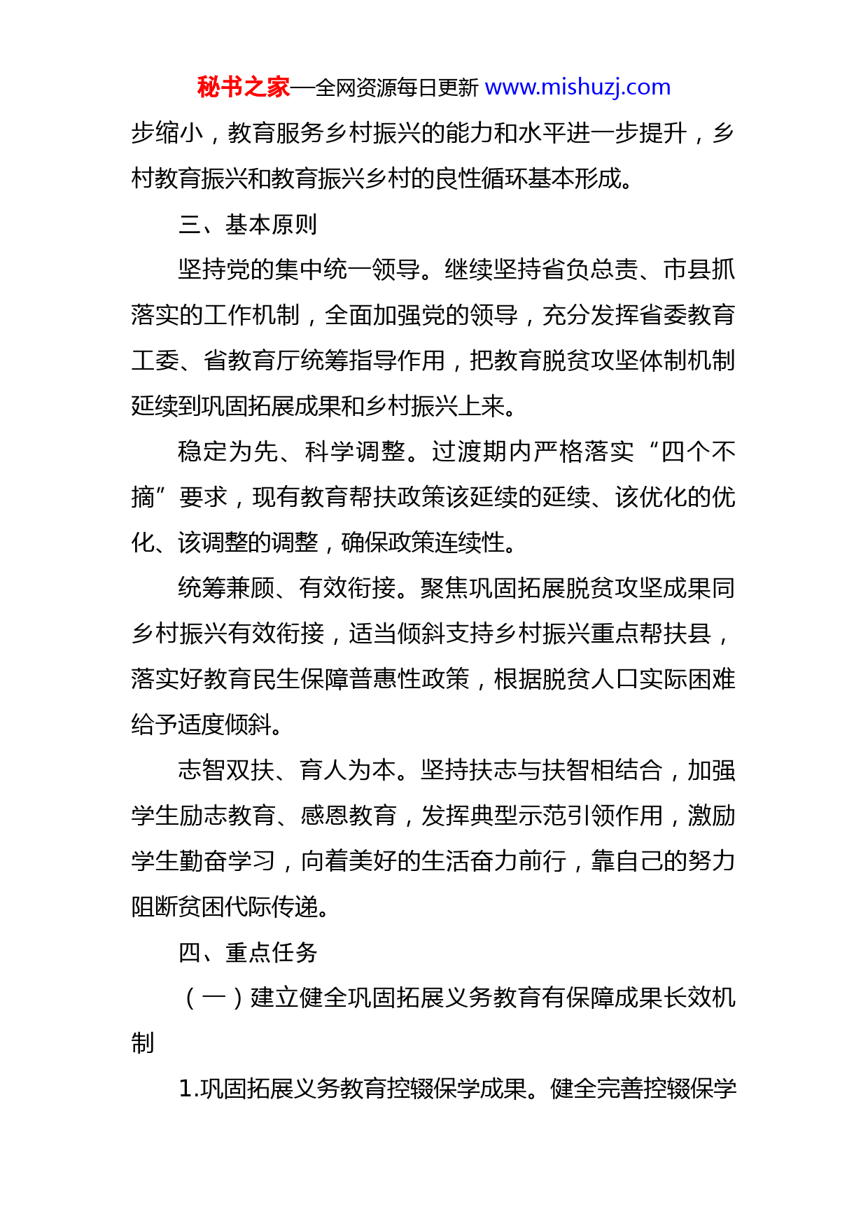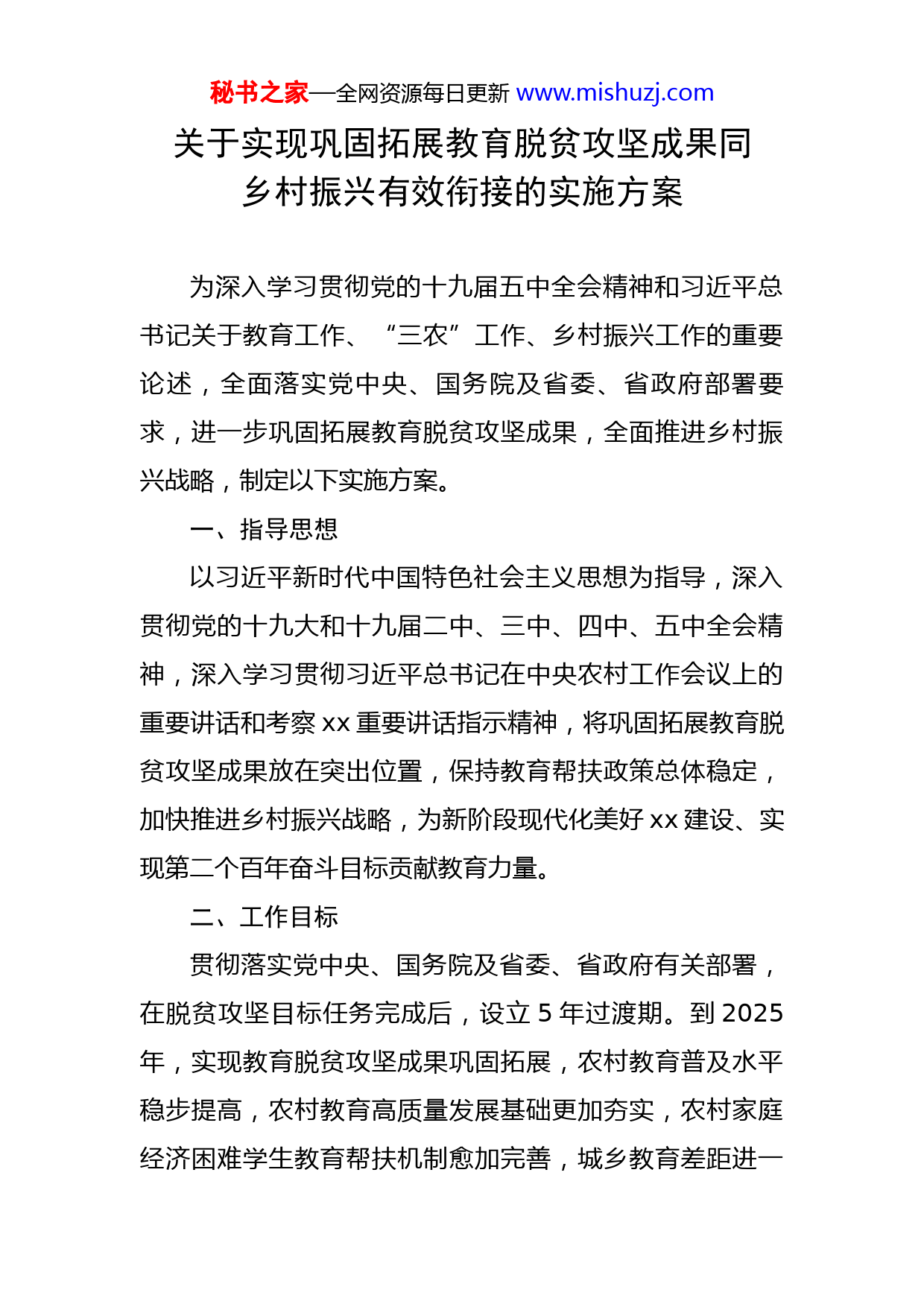 秘书之家—全网资源每日更新www.mishuzj.com关于实现巩固拓展教育脱贫攻坚成果同乡村振兴有效衔接的实施方案为深入学习贯彻党的十九届五中全会精神和习近平总书记关于教育工作、“三农”工作、乡村振兴工作的重要论述,全面落实党中央、国务院及省委、省政府部署要求,进一步巩固拓展教育脱贫攻坚成果,全面推进乡村振兴战略,制定以下实施方案。一、指导思想以习近平新时代中国特色社会主义思想为指导,深入贯彻党的十九大和十九届二中、三中、四中、五中全会精神,深入学习贯彻习近平总书记在中央农村工作会议上的重要讲话和考察xx重要讲话指示精神,将巩固拓展教育脱贫攻坚成果放在突出位置,保持教育帮扶政策总体稳定,加快推进乡村振兴战略,为新阶段现代化美好xx建设、实现第二个百年奋斗目标贡献教育力量。二、工作目标贯彻落实党中央、国务院及省委、省政府有关部署,在脱贫攻坚目标任务完成后,设立5年过渡期。到2025年,实现教育脱贫攻坚成果巩固拓展,农村教育普及水平稳步提高,农村教育高质量发展基础更加夯实,农村家庭经济困难学生教育帮扶机制愈加完善,城乡教育差距进一秘书之家—全网资源每日更新www.mishuzj.com步缩小,教育服务乡村振兴的能力和水平进一步提升,乡村教育振兴和教育振兴乡村的良性循环基本形成。三、基本原则坚持党的集中统一领导。继续坚持省负总责、市县抓落实的工作机制,全面加强党的领导,充分发挥省委教育工委、省教育厅统筹指导作用,把教育脱贫攻坚体制机制延续到巩固拓展成果和乡村振兴上来。稳定为先、科学调整。过渡期内严格落实“四个不摘”要求,现有教育帮扶政策该延续的延续、该优化的优化、该调整的调整,确保政策连续性。统筹兼顾、有效衔接。聚焦巩固拓展脱贫攻坚成果同乡村振兴有效衔接,适当倾斜支持乡村振兴重点帮扶县,落实好教育民生保障普惠性政策,根据脱贫人口实际困难给予适度倾斜。志智双扶、育人为本。坚持扶志与扶智相结合,加强学生励志教育、感恩教育,发挥典型示范引领作用,激励学生勤奋学习,向着美好的生活奋力前行,靠自己的努力阻断贫困代际传递。四、重点任务(一)建立健全巩固拓展义务教育有保障成果长效机制1.巩固拓展义务教育控辍保学成果。健全完善控辍保学秘书之家—全网资源每日更新www.mishuzj.com工作机制,确保除身体原因不具备学习条件外脱贫家庭义务教育阶段适龄儿童少年不失学辍学。落实《xx省义务教育控辍保学工作指南》要求,发挥政府、有关部门及学校共同参与的联控联保责任机制作用,定期开展数据比对,精准摸排疑似失学适龄儿童少年,纳入台账动态管理;在每学期开学前后集中开展控辍保学专项行动,严防辍学新增反弹。健全教学质量保障机制,深化教育教学改革,不断提高农村教育教学质量。支持保障农村适龄残疾儿童、少年接受义务教育。2.巩固拓展义务教育办学条件改善成果。继续实施义务教育薄弱环节改善与能力提升工作,聚焦乡村振兴和新型城镇化,有序增加城镇学位供给,补齐农村学校基本办学条件短板,提升学校办学能力。做好易地扶贫搬迁后续扶持工作,完善教育配套设施,保障适龄儿童少年义务教育就近入学。统筹义务教育学校布局结构调整工作,坚持因地制宜、实事求是、规模适度,有利于保障教育质量,促进学校布局建设与人口流动趋势相协调。支持设置乡镇寄宿制学校,保留并办好必要的乡村小规模学校。3.巩固拓展教育信息化成果。巩固学校联网攻坚行动成果,加快学校网络提速扩容。提升xx基础教育资源应用平台服务供给能力,助力脱贫地区共享优质教育资源,不断扩大优质教育资源覆盖面。持续推进智慧学校应用,深化秘书之家—全网资源每日更新www.mishuzj.com普及“三个课堂”应用,实现依托信息技术的“优质学校带薄弱学校、优秀教师带普通教师”模式制度化,指导教师共享和用好优质教育资源。提升脱贫地区师生信息素养,构建以校为本、基于课堂、应用驱动、注重创新、精准测评的教师信息素养发展机制,加强学生课内外一体化的信息素养培育,推进信息技术与教育教学的深度融合。全面推进智慧学校建设。4.巩固拓展乡村教师队伍建设成果。落实《xx省教育厅等六部门关于加强新时代乡村教师队伍建设的实施意见》(x教师〔2021〕4号),继续实施农村义务教育阶段学校教师特设岗位计划、中小学幼儿园教师国家级培训计划、乡村教师生活补助政策,优先满足脱贫地区对高素质教师的补充需求,提高乡村教师队伍整体素质。在脱贫地区增加公费师范生培养供给,全面实施中小学教师“县管校聘”管理改革,加强城乡教师合理流动和对口支援,鼓励乡村教师提高学历层次。启动实施优秀教师定向培养计划,定向培养一批优秀师资。加强对脱贫地区校长的培训,着力提升管理水平。加强教师教育体系建设,建设一批国家师范教育基地和教师教育改革实验区,推动师范教育高质量发展与巩固拓展教育脱贫攻坚成果、全面推进乡村振兴相结合。深化人工智能助推教师队伍建设试点。切实保障义务教育教师工资待遇。秘书之家—全网资源每日更新www.mishuzj.com(二)建立健全农村家庭经济困难学生教育帮扶机制5.精准资助农村家庭经济困难学生。落实从学前教育到高等教育全学段的学