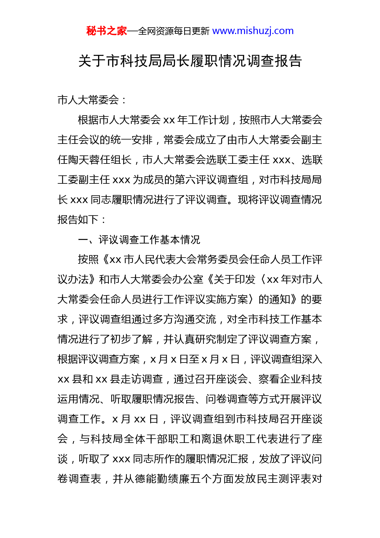 秘书之家—全网资源每日更新www.mishuzj.com关于市科技局局长履职情况调查报告市人大常委会:根据市人大常委会xx年工作计划,按照市人大常委会主任会议的统一安排,常委会成立了由市人大常委会副主任陶天蓉任组长,市人大常委会选联工委主任xxx、选联工委副主任xxx为成员的第六评议调查组,对市科技局局长xxx同志履职情况进行了评议调查。现将评议调查情况报告如下:一、评议调查工作基本情况按照《xx市人民代表大会常务委员会任命人员工作评议办法》和市人大常委会办公室《关于印发〈xx年对市人大常委会任命人员进行工作评议实施方案〉的通知》的要求,评议调查组通过多方沟通交流,对全市科技工作基本情况进行了初步了解,并认真研究制定了评议调查方案,根据评议调查方案,x月x日至x月x日,评议调查组深入xx县和xx县走访调查,通过召开座谈会、察看企业科技运用情况、听取履职情况报告、问卷调查等方式开展评议调查工作。x月xx日,评议调查组到市科技局召开座谈会,与科技局全体干部职工和离退休职工代表进行了座谈,听取了xxx同志所作的履职情况汇报,发放了评议问卷调查表,并从德能勤绩廉五个方面发放民主测评表对秘书之家—全网资源每日更新www.mishuzj.comxxx进行了民主测评,随后与局领导班子成员及其他干部职工分别进行了谈话,谈话比例达xx%以上,同时查阅了相关资料。工作评议期间,评议调查组对市科技局所涉及的xx个方面的工作情况进行了问卷调查,共发出调查问卷xx份,收回xx份。其中,评价“好”和“较好”的比例为xx.xx%;在市科技局进行的民主测评中,共发出民主测评表xx份,收回xx份,其中,评价“好”和“较好”的比例为xx.xx%。通过评议调查,共收到对市科技局和xxx本人的意见建议xx条,已转交给xxx同志研究处理。第六评议调查组认为:xxx同志政治思想坚定,工作作风优良,工作成效明显,廉洁自律情况较好,对其工作成效和表现总体表示满意。二、xxx同志履职主要情况通过评议调查,市科技局局长xxx同志主要工作成效及表现有:(一)注重学习,政治素养较好。一是注重理论知识和科技专业知识的学习积累,联系实际紧密,对中央、省、市出台的一些政策学习把握到位,大局意识强。二是自觉严格遵守党的政治纪律,在政治上始终与党中央保持高度一致,在重大原则问题上认识清醒、态度坚决、行动自觉,理想信念坚定,政治敏锐性强,认真贯彻执行党的路线、方针和政策,认真落实上级党委、政府的部署安秘书之家—全网资源每日更新www.mishuzj.com排。(二)认真贯彻执行民主集中制,法律意识和人大意识较强。一是积极建立相关制度,完善班子内部的工作分工、议事、决策规则和程序,明确党组班子成员职责和义务,严格照章办事,充分发扬民主,认真听取意见和建议,坚持重大问题集体讨论决定原则,确保了工作决策的民主化。二是自觉遵守和执行宪法及相关法律法规,认真贯彻落实上级政府及科技部门的有关规定和要求。认真贯彻执行市人大及其常委会作出的相关决议和决定,自觉接受市人大及其常委会的监督,不定期以《科技信息》、《科技动态》、《xx科技》、《决策参考》等信息和刊物及个人工作汇报等形式向市人大常委会相关领导和委(室)报告科技工作动态及工作开展情况。(三)品德良好,忠于职守,工作作风扎实。一是为人正直,平易近人,谦虚诚实,关心下属,团结带领一班人有序开展各项工作,努力营造和谐、积极的工作氛围。二是工作中求真务实,吃苦耐劳,牢记宗旨,热忱服务,作风扎实,做事求实效。(四)严于律己,廉洁从政。认真贯彻执行中央八项规定,认真履行廉政建设岗位职责,带头落实党风廉政建设责任制各项目标任务,自觉带头遵守领导干部廉洁自律各项规定,自觉接受群众监督,积极改进工作作风,努力秘书之家—全网资源每日更新www.mishuzj.com为单位营造风清气正的环境。(五)各项工作任务完成情况较好。一是加大科技经费的争取和投入。以项目形式持续加大科技经费的投入,共组织申报并获得省科技厅支持的科技计划项目xx余项,争取科技项目经费xxxx万元,安排市级科技计划项目xxx项,科技经费投入xxxx万元,安排专项经费xxxx万元,扶持天麻、苹果等产业创新发展。二是不断加强科技合作交流。xx年以来,以“科技入滇对接会”为契机,大力加强与外界的科技合作与交流,进一步搭建xx与外界科技合作的平台,建立健全科技入昭长效机制,大力吸引高水平的省内外科技企业、科研院所入昭发展,促进市外科研平台、科技型企业、科技成果和先进适用技术、人才和团队“四个落地”。三是加大创新平台培育和建设。结合自身实际,不断加大创新平台建设,着力培育企业自主创新能力,目前已初步形成了融高新技术企业、创新型试点企业、工程技术研究中心、企业技术中心、农业科技示范园、优质种业基地、农产品深加工科技型企业、院士专家工作站为一体的科技创新平台。四是鼓励创造,提升区域创新能力。通过出台激励政策、强化知识产权宣传、加强知识产权培训和知识产权执法力度、保护知识产权智力成果等措施,鼓励创造,提升企业自主创新能力,工作成效明显。五是强化宣传,努力提升群众科技意识。利用文秘书之家—全网资源每日更新www.mishuzj.com化、科技、卫生“三下乡”、“x·xx”知识产权日、x月科技活动周