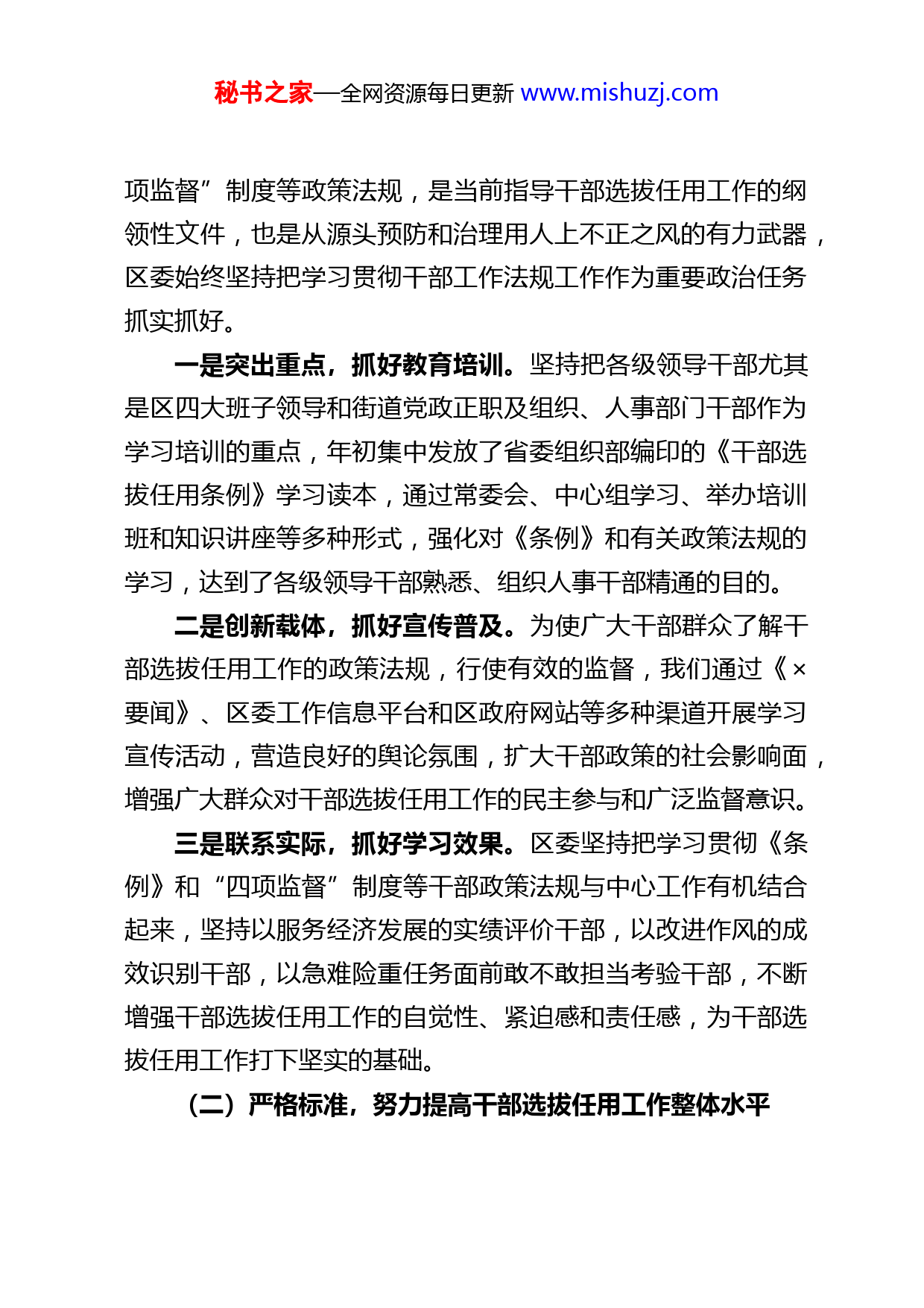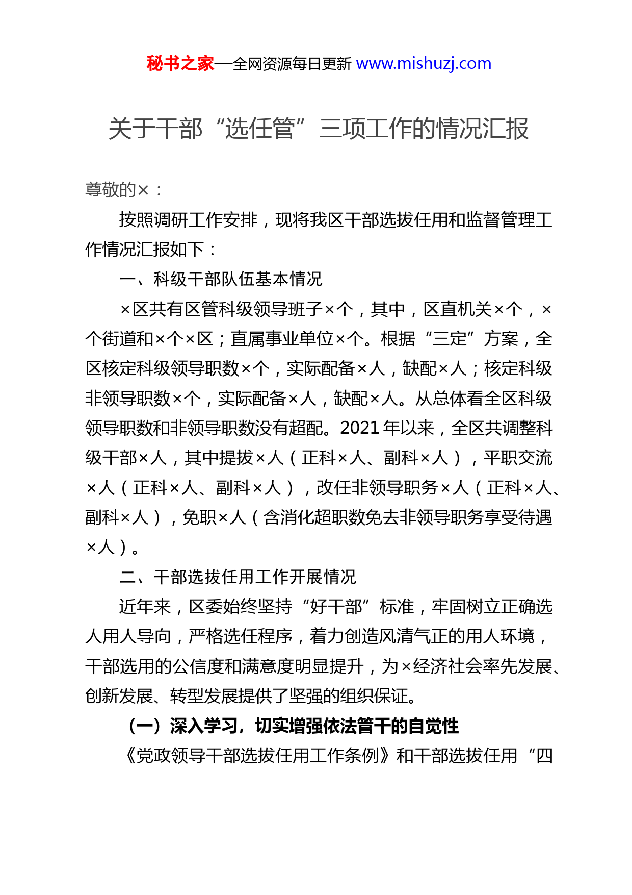 秘书之家—全网资源每日更新www.mishuzj.com关于干部“选任管”三项工作的情况汇报尊敬的×:按照调研工作安排,现将我区干部选拔任用和监督管理工作情况汇报如下:一、科级干部队伍基本情况×区共有区管科级领导班子×个,其中,区直机关×个,×个街道和×个×区;直属事业单位×个。根据“三定”方案,全区核定科级领导职数×个,实际配备×人,缺配×人;核定科级非领导职数×个,实际配备×人,缺配×人。从总体看全区科级领导职数和非领导职数没有超配。2021年以来,全区共调整科级干部×人,其中提拔×人(正科×人、副科×人),平职交流×人(正科×人、副科×人),改任非领导职务×人(正科×人、副科×人),免职×人(含消化超职数免去非领导职务享受待遇×人)。二、干部选拔任用工作开展情况近年来,区委始终坚持“好干部”标准,牢固树立正确选人用人导向,严格选任程序,着力创造风清气正的用人环境,干部选用的公信度和满意度明显提升,为×经济社会率先发展、创新发展、转型发展提供了坚强的组织保证。(一)深入学习,切实增强依法管干的自觉性《党政领导干部选拔任用工作条例》和干部选拔任用“四秘书之家—全网资源每日更新www.mishuzj.com项监督”制度等政策法规,是当前指导干部选拔任用工作的纲领性文件,也是从源头预防和治理用人上不正之风的有力武器,区委始终坚持把学习贯彻干部工作法规工作作为重要政治任务抓实抓好。一是突出重点,抓好教育培训。坚持把各级领导干部尤其是区四大班子领导和街道党政正职及组织、人事部门干部作为学习培训的重点,年初集中发放了省委组织部编印的《干部选拔任用条例》学习读本,通过常委会、中心组学习、举办培训班和知识讲座等多种形式,强化对《条例》和有关政策法规的学习,达到了各级领导干部熟悉、组织人事干部精通的目的。二是创新载体,抓好宣传普及。为使广大干部群众了解干部选拔任用工作的政策法规,行使有效的监督,我们通过《×要闻》、区委工作信息平台和区政府网站等多种渠道开展学习宣传活动,营造良好的舆论氛围,扩大干部政策的社会影响面,增强广大群众对干部选拔任用工作的民主参与和广泛监督意识。三是联系实际,抓好学习效果。区委坚持把学习贯彻《条例》和“四项监督”制度等干部政策法规与中心工作有机结合起来,坚持以服务经济发展的实绩评价干部,以改进作风的成效识别干部,以急难险重任务面前敢不敢担当考验干部,不断增强干部选拔任用工作的自觉性、紧迫感和责任感,为干部选拔任用工作打下坚实的基础。(二)严格标准,努力提高干部选拔任用工作整体水平秘书之家—全网资源每日更新www.mishuzj.com区委始终按照干部选拔任用工作政策法规规定的原则、条件、程序和纪律选拔干部,做到坚持原则不动摇、执行标准不走样、履行程序不变通、遵守纪律不放松,努力提高我区干部选拔任用工作的整体水平。一是树立正确的选人用人导向。认真贯彻“信念坚定、为民服务、勤政务实、敢于担当、清正廉洁”的好干部标准,按照市委“以干事为前提,凭干事用干部”的选人用人导向,结合×经济社会发展实际提出了“四优先、四注重和五不用”。“四优先”:优先使用项目建设、城建提升、信访稳定等工作一线和艰苦岗位上表现突出的干部;优先使用连年来考核测评结果优秀的干部;优先使用阅历丰富、工作能力强的干部;优先使用年轻有为、有发展潜力的干部。“四注重”:注重个人品德,注重个人实绩、注重基层一线,注重群众公认。“五不用”:不能坚决贯彻执行党的路线、方针、政策和上级党委决定的不用;不能认真贯彻民主集中制原则、拉帮结派、闹不团结的不用;群众观念淡薄、得不到大多数人拥护的不用;思想作风不端正、弄虚作假、跑官要官的不用;不能廉洁自律的不用。通过建立和完善一系列干部选用标准,调动了广大干部干事创业的积极性。二是严格执行《条例》和政策规定。在干部选拔任用工作中,我们遵循《条例》和干部政策法规规定,严格把好“三关”:一是把好民主推荐关。建立“三个结合”,即:将民主秘书之家—全网资源每日更新www.mishuzj.com推荐结果与阶段工作完成情况及干部年度考核的测评结果相结合;将会议投票推荐与个别谈话推荐相结合;将群众推荐、单位党组织推荐、领导干部署名推荐相结合。通过“三个结合”,科学分析推荐结果,有效防止了简单的以票取人的现象。二是把好考察识别关。在每次干部考察前,都要制定详细的考察方案,对原则要求、方法步骤、材料撰写做出明确规定,并对考察组成员进行认真培训,提出严格要求,每个考察组都安排×名纪检(监察)干部担任监督员,负责对全过程进行监督。在考察方法上,除正常的谈话了解,还深入到考察对象的工作部门和工作现场,进行重点访谈和实地查看,听取考察对象直接领导和身边人员的评价,增强对考察对象德才表现及工作实绩的感性认识,提高干部考察工作的科学性、准确性。三是把好讨论决定关。坚持分层分类征求意见,强化对违规违纪情况的检查监督,认真听取考察组汇报,广泛征求纪检(监察)、综治、信访、计生等部门的意见建议,坚决做到不符合政策、程序规定的不上会,有情况反映,未审查核实的不上会。同时,坚持党委民主决策制度,对政府工作部门正职