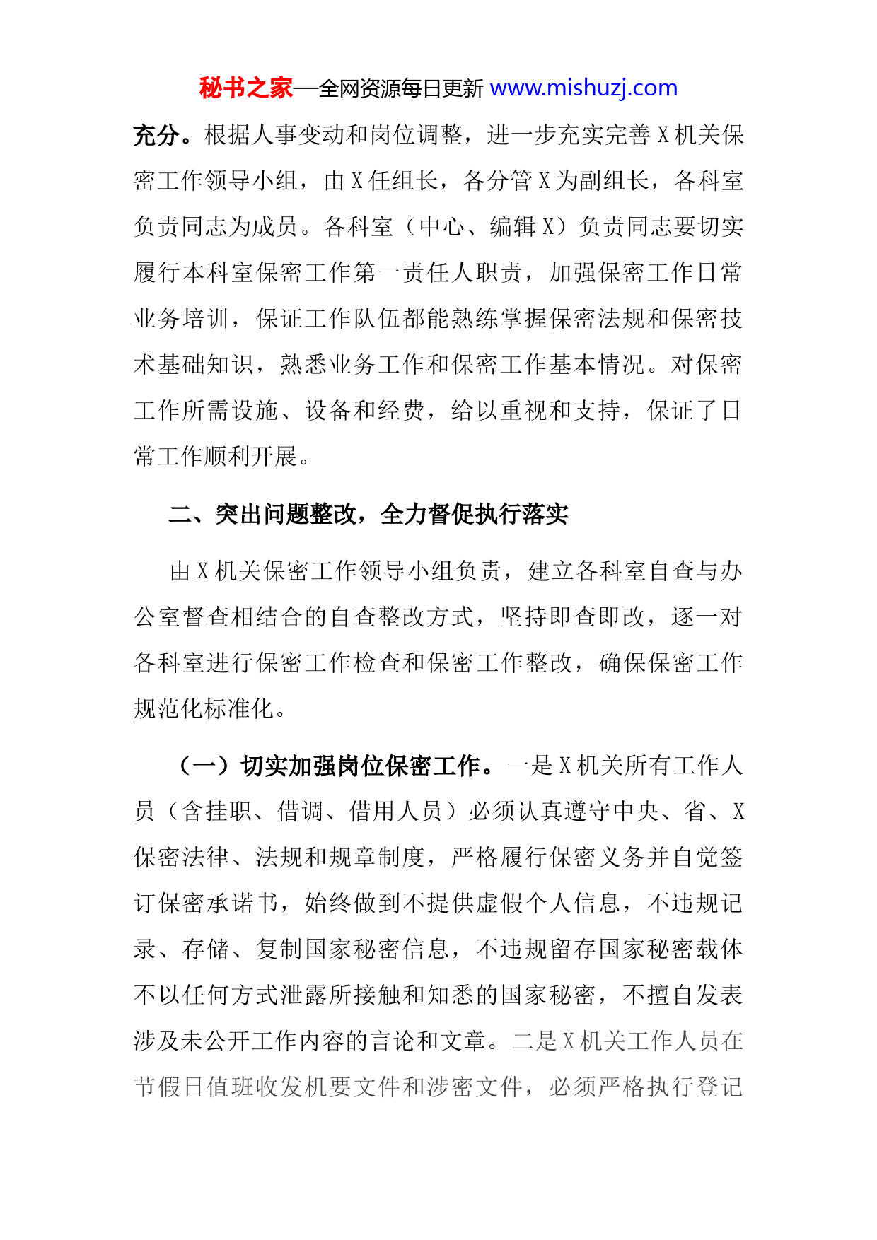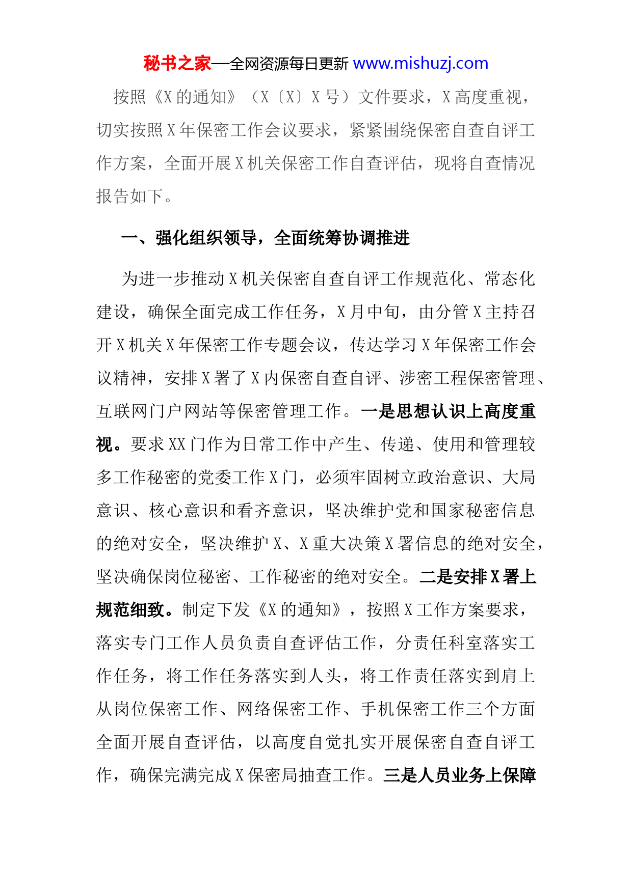 秘书之家—全网资源每日更新www.mishuzj.com按照《X的通知》(X〔X〕X号)文件要求,X高度重视,切实按照X年保密工作会议要求,紧紧围绕保密自查自评工作方案,全面开展X机关保密工作自查评估,现将自查情况报告如下。一、强化组织领导,全面统筹协调推进为进一步推动X机关保密自查自评工作规范化、常态化建设,确保全面完成工作任务,X月中旬,由分管X主持召开X机关X年保密工作专题会议,传达学习X年保密工作会议精神,安排X署了X内保密自查自评、涉密工程保密管理、互联网门户网站等保密管理工作。一是思想认识上高度重视。要求XX门作为日常工作中产生、传递、使用和管理较多工作秘密的党委工作X门,必须牢固树立政治意识、大局意识、核心意识和看齐意识,坚决维护党和国家秘密信息的绝对安全,坚决维护X、X重大决策X署信息的绝对安全,坚决确保岗位秘密、工作秘密的绝对安全。二是安排X署上规范细致。制定下发《X的通知》,按照X工作方案要求,落实专门工作人员负责自查评估工作,分责任科室落实工作任务,将工作任务落实到人头,将工作责任落实到肩上从岗位保密工作、网络保密工作、手机保密工作三个方面全面开展自查评估,以高度自觉扎实开展保密自查自评工作,确保完满完成X保密局抽查工作。三是人员业务上保障秘书之家—全网资源每日更新www.mishuzj.com充分。根据人事变动和岗位调整,进一步充实完善X机关保密工作领导小组,由X任组长,各分管X为副组长,各科室负责同志为成员。各科室(中心、编辑X)负责同志要切实履行本科室保密工作第一责任人职责,加强保密工作日常业务培训,保证工作队伍都能熟练掌握保密法规和保密技术基础知识,熟悉业务工作和保密工作基本情况。对保密工作所需设施、设备和经费,给以重视和支持,保证了日常工作顺利开展。二、突出问题整改,全力督促执行落实由X机关保密工作领导小组负责,建立各科室自查与办公室督查相结合的自查整改方式,坚持即查即改,逐一对各科室进行保密工作检查和保密工作整改,确保保密工作规范化标准化。(一)切实加强岗位保密工作。一是X机关所有工作人员(含挂职、借调、借用人员)必须认真遵守中央、省、X保密法律、法规和规章制度,严格履行保密义务并自觉签订保密承诺书,始终做到不提供虚假个人信息,不违规记录、存储、复制国家秘密信息,不违规留存国家秘密载体不以任何方式泄露所接触和知悉的国家秘密,不擅自发表涉及未公开工作内容的言论和文章。二是X机关工作人员在节假日值班收发机要文件和涉密文件,必须严格执行登记秘书之家—全网资源每日更新www.mishuzj.com管理,全程记录文件去向和办文流程,凡因执行程序不严造成文件泄露和丢失,一律从严给予纪律处分,情节严重的,依法移送司法机关处理。三是X机关工作人员因工作需要复制、复印或摘录密级文件、资料要严格履行审批和登记手续,复印件与原件同样管理,绝密级文件一律不得复印。(二)切实加强网络保密工作。一是完善计算机使用台帐管理制度,X办公室建立涉密计算机和非涉密计算机使用管理台帐,统一负责X机关计算机管理维护工作。X机关涉密计算机必须安装隔断系统,非涉密计算机必须安装保密文件检查工具。未经报批,各科室(中心、编辑X)一律不得擅自对计算机进行维修和更换。二是各科室(中心、编辑X)的电脑必须设置相应密码,安装防火墙、杀毒软件。各工作人员必须做好电子文件保存工作,防止信息资料遭到破坏、盗用和其它意外损失。X机关新闻信息发布工作由专人负责,并严格履行审批程序,未经批准任何人不得自行在网上和媒体发布新闻信息。三是X机关政务内网(党政网、组工网)计算机严禁联接外网;内网计算机上一律使用刻录光盘进行数据交换,不得连接任何USB设备;存有组工秘密信息的移动硬盘、U盘、光盘要明确专人保管,不得秘书之家—全网资源每日更新www.mishuzj.com在内网计算机和外网计算机之间交叉使用;任何人不得擅自复制、刻录涉密光盘。(三)切实加强手机保密工作。建立手机保密十二条不准:1.不得在手机通信中涉及国家秘密;2.不得在手机上存储、处理、传输国家秘密信息;3.不得将手机连接涉密信息系统、信息设备或者载体;4.不得在手机上存储核心涉密人员的工作单位、职务、红机电话号码等敏感信息;5.不得在涉密公务活动中开启和使用手机位置服务功能;6.在申请手机号码、注册手机邮箱或者开通其他功能时,不得填写禁止公开的涉密单位名称和地址等信息;7.不得使用未经国家电信管理X门进网许可的手机;8.不得使用境外机构、境外人员赠送的手机;9.不得将手机带入保密要害X位、涉密会议和活动场所;10.不得在保密要害X门使用手机;11.不得在使用涉密信息设备的场所使用手机进行视频通话、拍照、上网、录音和录像;12.不得使用商用加密手机谈论以及存储、处理、传输国家秘密信息。切实规范手机涉密使用规范。三、狠抓常态化建设,全方位督促规范运行全面加强日常教育、制度建设,进一步查找制度机制漏洞,及时修改完善制度,形成常态化规范执行,保证工作执行规范保密落实。一是强化教育学习。采取多种方式,秘书之家—全网资源每日更新www.mishuzj.com利用各种机会对单位干X进行经常性的保密教育。坚持每季度一次学习,组织学习《中华人民