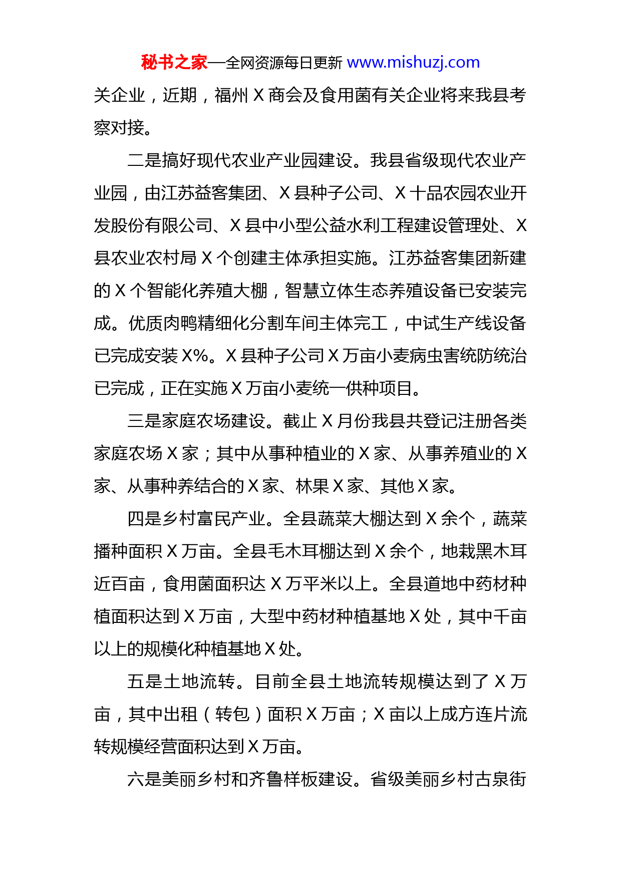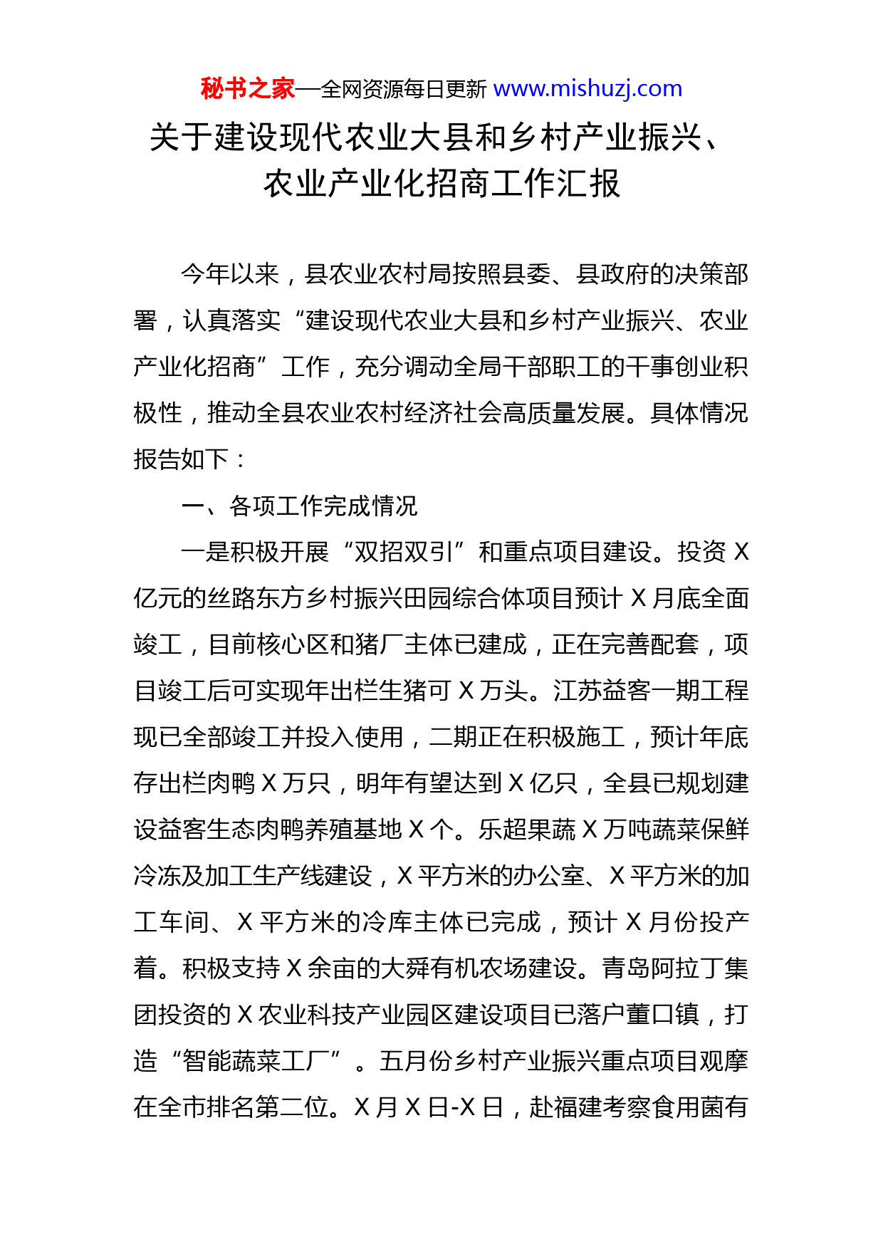 秘书之家—全网资源每日更新www.mishuzj.com关于建设现代农业大县和乡村产业振兴、农业产业化招商工作汇报今年以来,县农业农村局按照县委、县政府的决策部署,认真落实“建设现代农业大县和乡村产业振兴、农业产业化招商”工作,充分调动全局干部职工的干事创业积极性,推动全县农业农村经济社会高质量发展。具体情况报告如下:一、各项工作完成情况一是积极开展“双招双引”和重点项目建设。投资X亿元的丝路东方乡村振兴田园综合体项目预计X月底全面竣工,目前核心区和猪厂主体已建成,正在完善配套,项目竣工后可实现年出栏生猪可X万头。江苏益客一期工程现已全部竣工并投入使用,二期正在积极施工,预计年底存出栏肉鸭X万只,明年有望达到X亿只,全县已规划建设益客生态肉鸭养殖基地X个。乐超果蔬X万吨蔬菜保鲜冷冻及加工生产线建设,X平方米的办公室、X平方米的加工车间、X平方米的冷库主体已完成,预计X月份投产着。积极支持X余亩的大舜有机农场建设。青岛阿拉丁集团投资的X农业科技产业园区建设项目已落户董口镇,打造“智能蔬菜工厂”。五月份乡村产业振兴重点项目观摩在全市排名第二位。X月X日-X日,赴福建考察食用菌有秘书之家—全网资源每日更新www.mishuzj.com关企业,近期,福州X商会及食用菌有关企业将来我县考察对接。二是搞好现代农业产业园建设。我县省级现代农业产业园,由江苏益客集团、X县种子公司、X十品农园农业开发股份有限公司、X县中小型公益水利工程建设管理处、X县农业农村局X个创建主体承担实施。江苏益客集团新建的X个智能化养殖大棚,智慧立体生态养殖设备已安装完成。优质肉鸭精细化分割车间主体完工,中试生产线设备已完成安装X%。X县种子公司X万亩小麦病虫害统防统治已完成,正在实施X万亩小麦统一供种项目。三是家庭农场建设。截止X月份我县共登记注册各类家庭农场X家;其中从事种植业的X家、从事养殖业的X家、从事种养结合的X家、林果X家、其他X家。四是乡村富民产业。全县蔬菜大棚达到X余个,蔬菜播种面积X万亩。全县毛木耳棚达到X余个,地栽黑木耳近百亩,食用菌面积达X万平米以上。全县道地中药材种植面积达到X万亩,大型中药材种植基地X处,其中千亩以上的规模化种植基地X处。五是土地流转。目前全县土地流转规模达到了X万亩,其中出租(转包)面积X万亩;X亩以上成方连片流转规模经营面积达到X万亩。六是美丽乡村和齐鲁样板建设。省级美丽乡村古泉街秘书之家—全网资源每日更新www.mishuzj.com道胡窑、引马镇向阳,市级美丽乡村什集镇吴庄已基本完成,X县作为X市唯一一个被推荐创建“省部共同打造乡村振兴齐鲁样板示范县暨率先基本实现农业农村现代化试点县”的县区,方案已经省厅和省政府批准且上报至国家农业农村部。七是高标准农田建设。完成了X年X县共建设高标准农田X万亩,涉及李进士堂、左营、什集、富春和红船五个乡镇。X年上级下达我县高标准农田建设项目建设规模X万亩,我们已完成了规划设计。二、存在的问题一是受疫情影响,项目整体进度慢,不能按计划完成部分工程。二是美丽乡村基础设施建设标准不高,建设模式单一,绿化美化不够,资金不足,到位慢。三是中药材、食用菌等产业一产不大,产量不高,比较收益不高,种植政策不够,导致种植面积年上升幅度不大,对产业发展的原料资源支撑不够;四是农产品精深加工企业少,初级低端产品多,储藏能力差,市场设施落后,管理服务缺位。五是土地流转工作开展相对很不平衡,较好的乡镇土地流转规模已经超过了X%,但有些乡镇流转比例还不到X%。三、下步工作一是加快推进江苏益客二期、宇憩乐樱、乐超食品、秘书之家—全网资源每日更新www.mishuzj.com阿拉丁等有关农字号的重点项目建设,年底实现项目试运营。二是大力开展“双招双引”,积极引进食用菌、中药材等农产品深加工项目,建设以红船镇刘桥村为中心的食用菌生产加工基地和舜王城中药材市场为带动的中药材生产加工基地。三是年底全县流转土地争取达到X万亩,托管X万亩,促进了土地规模化、集约化经营。四是落实落地齐鲁样板示范县暨率先基本实现农业农村现代化试点县”建设,搞好完成彭楼镇市级齐鲁样板示范区的对接。五是搞好X年度X万亩高标准农田的建设。