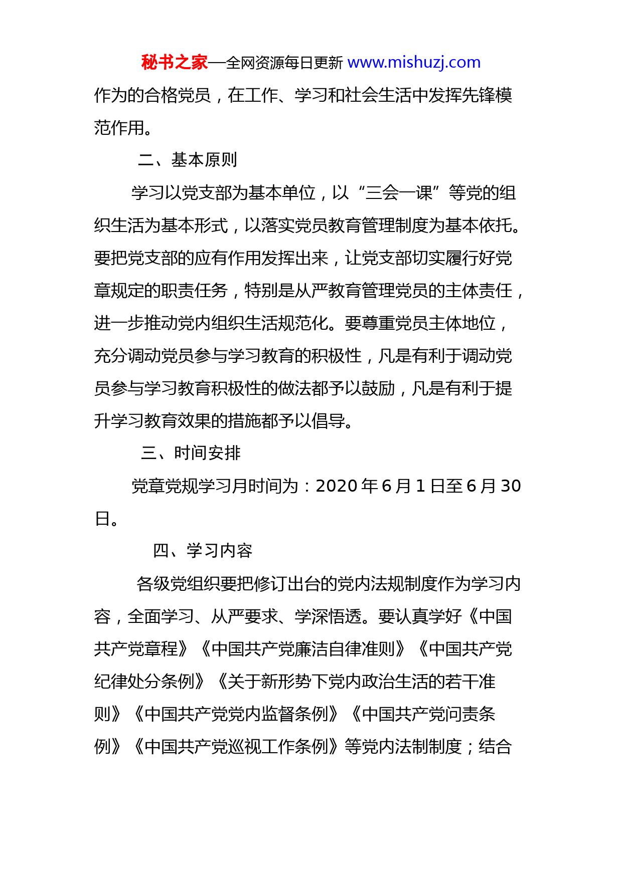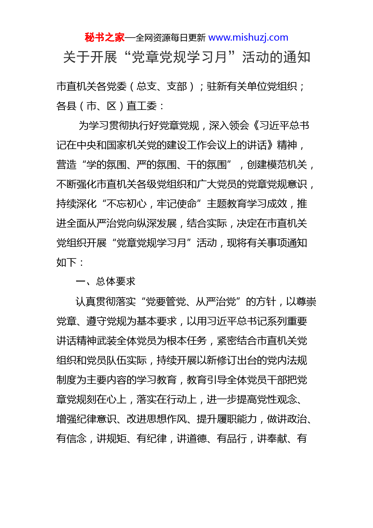 秘书之家—全网资源每日更新www.mishuzj.com关于开展“党章党规学习月”活动的通知市直机关各党委(总支、支部);驻新有关单位党组织;各县(市、区)直工委:为学习贯彻执行好党章党规,深入领会《习近平总书记在中央和国家机关党的建设工作会议上的讲话》精神,营造“学的氛围、严的氛围、干的氛围”,创建模范机关,不断强化市直机关各级党组织和广大党员的党章党规意识,持续深化“不忘初心,牢记使命”主题教育学习成效,推进全面从严治党向纵深发展,结合实际,决定在市直机关党组织开展“党章党规学习月”活动,现将有关事项通知如下:一、总体要求认真贯彻落实“党要管党、从严治党”的方针,以尊崇党章、遵守党规为基本要求,以用习近平总书记系列重要讲话精神武装全体党员为根本任务,紧密结合市直机关党组织和党员队伍实际,持续开展以新修订出台的党内法规制度为主要内容的学习教育,教育引导全体党员干部把党章党规刻在心上,落实在行动上,进一步提高党性观念、增强纪律意识、改进思想作风、提升履职能力,做讲政治、有信念,讲规矩、有纪律,讲道德、有品行,讲奉献、有秘书之家—全网资源每日更新www.mishuzj.com作为的合格党员,在工作、学习和社会生活中发挥先锋模范作用。二、基本原则学习以党支部为基本单位,以“三会一课”等党的组织生活为基本形式,以落实党员教育管理制度为基本依托。要把党支部的应有作用发挥出来,让党支部切实履行好党章规定的职责任务,特别是从严教育管理党员的主体责任,进一步推动党内组织生活规范化。要尊重党员主体地位,充分调动党员参与学习教育的积极性,凡是有利于调动党员参与学习教育积极性的做法都予以鼓励,凡是有利于提升学习教育效果的措施都予以倡导。三、时间安排党章党规学习月时间为:2020年6月1日至6月30日。四、学习内容各级党组织要把修订出台的党内法规制度作为学习内容,全面学习、从严要求、学深悟透。要认真学好《中国共产党章程》《中国共产党廉洁自律准则》《中国共产党纪律处分条例》《关于新形势下党内政治生活的若干准则》《中国共产党党内监督条例》《中国共产党问责条例》《中国共产党巡视工作条例》等党内法制制度;结合秘书之家—全网资源每日更新www.mishuzj.com形势要求和工作实际,在全面学习的基础上,突出抓好以下内容学习:1.《习近平总书记在中央和国家机关党的建设工作会议上的讲话》;2.《关于加强和改进中央和国家机关党的建设的意见》;3.《中国共产党党组工作条例》;4.《中国共产党党和国家机关基层组织工作条例》;5.《中国共产党支部工作条例(试行)》;6.《党委(党组)书记抓基层党建工作述职评议考核办法(试行)》;7.XXX书记在全省机关党的建设工作会议上的讲话精神;8.《中共XX省委关于加强和改进全省机关党的建设的若干意见》。五、方法步骤学习分三个阶段进行。第一阶段:安排部署,宣传发动阶段(6月1日—5日)。各级机关党组织要认真谋划、统筹安排,认真制定方案计划,适时召开动员部署会,让全体党员干部深刻认识和领会开展学习月的重要性,切实增强学习和遵守党章党规的积极性和自觉性。秘书之家—全网资源每日更新www.mishuzj.com第二阶段:明确任务,组织实施阶段(6月5日—6月30日)。结合学习贯彻党的十九届四中全会精神,牢牢抓住思想理论武装这个根本,用好党员读书会、“市直机关党建大讲堂”等学习品牌,扎实完成“七个一”活动。1.组织一轮集中学习。各支部制定学习计划,采取个人自学、集中培训、专题辅导、集体研讨等形式,开展集中学习党章党规活动。组织党员原原本本地学习《中国共产党章程》《中国共产党党和国家机关基层组织工作条例》《中国共产党纪律处分条例》等。党员干部要按照学习计划认真学习规定篇目,记好学习笔记,切实做到入脑入心,学有所获,学有提高。2.开展一次专题宣讲。党员领导干部要做学习党章党规、遵守党章党规的模范,把学习党章党规作为必修课,先学一步,学深学透,带头讲党课,带头宣讲。学习月期间,落实至少一名班子成员讲党课要求,引领和带动全体党员更好地学习,并向“新乡机关党建”网络信息平台报送5分钟以内的宣讲视频。3.重温一遍入党誓词。以支部为单位,结合庆祝建党99周年,积极开展重温入党誓词活动,使每位党员在活动中回顾入党情景,领会誓词深刻内涵,始终不忘入党“初心”,强化党的意识,在党言党、在党爱党、在党忧党、在党兴党,自觉遵守党章党规,终身践行入党誓词,切实秘书之家—全网资源每日更新www.mishuzj.com履行党员义务,保持党员的先进性和纯洁性,以更好的精神面貌投入到工作中。4.开展一次警示教育。以学习廉政知识、观看廉政教育片、开展廉政教育辅导课等形式开展警示教育活动,进一步增强党员干部的廉洁自律意识,引导广大党员干部提高党性修养,坚持正确政治方向,树立正确的世界观、人生观和价值观,模范践行社会主义核心价值体系。5.组织一次讨论交流。组织党员干部以“学党章、守纪律、讲规矩”为主题,围绕“党章要求什么?党规明确什么?党纪约束什么?我该做什么?”开展大讨论。党员干部要结合自身岗位职责,撰写一份研讨交流文章,并通过“新乡机关党建”信息网择优报送1-2篇优质理论研讨文章(3000字