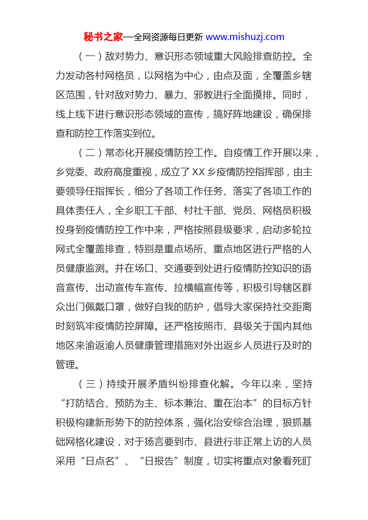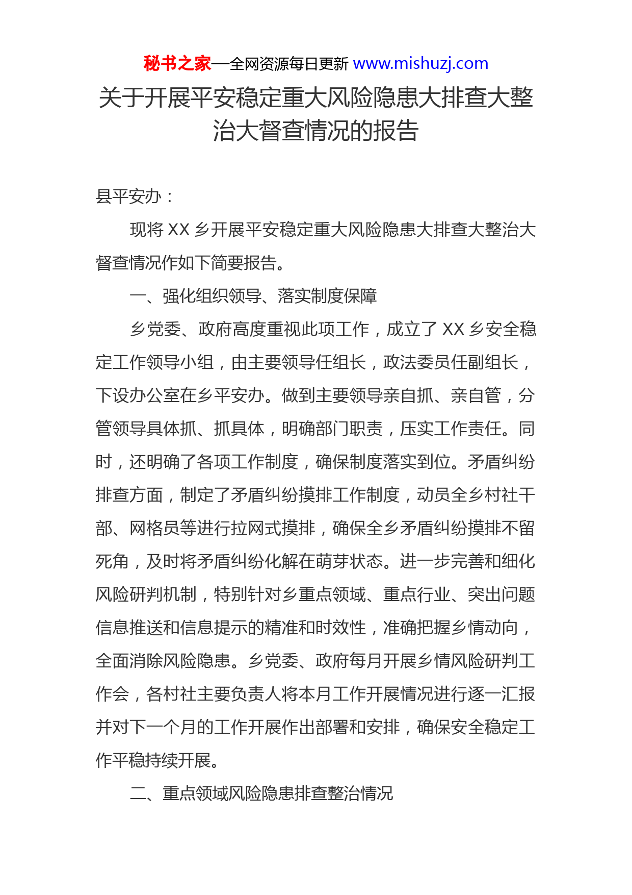 秘书之家—全网资源每日更新www.mishuzj.com关于开展平安稳定重大风险隐患大排查大整治大督查情况的报告县平安办:现将XX乡开展平安稳定重大风险隐患大排查大整治大督查情况作如下简要报告。一、强化组织领导、落实制度保障乡党委、政府高度重视此项工作,成立了XX乡安全稳定工作领导小组,由主要领导任组长,政法委员任副组长,下设办公室在乡平安办。做到主要领导亲自抓、亲自管,分管领导具体抓、抓具体,明确部门职责,压实工作责任。同时,还明确了各项工作制度,确保制度落实到位。矛盾纠纷排查方面,制定了矛盾纠纷摸排工作制度,动员全乡村社干部、网格员等进行拉网式摸排,确保全乡矛盾纠纷摸排不留死角,及时将矛盾纠纷化解在萌芽状态。进一步完善和细化风险研判机制,特别针对乡重点领域、重点行业、突出问题信息推送和信息提示的精准和时效性,准确把握乡情动向,全面消除风险隐患。乡党委、政府每月开展乡情风险研判工作会,各村社主要负责人将本月工作开展情况进行逐一汇报并对下一个月的工作开展作出部署和安排,确保安全稳定工作平稳持续开展。二、重点领域风险隐患排查整治情况秘书之家—全网资源每日更新www.mishuzj.com(一)敌对势力、意识形态领域重大风险排查防控。全力发动各村网格员,以网格为中心,由点及面,全覆盖乡辖区范围,针对敌对势力、暴力、邪教进行全面摸排。同时,线上线下进行意识形态领域的宣传,搞好阵地建设,确保排查和防控工作落实到位。(二)常态化开展疫情防控工作。自疫情工作开展以来,乡党委、政府高度重视,成立了XX乡疫情防控指挥部,由主要领导任指挥长,细分了各项工作任务、落实了各项工作的具体责任人,全乡职工干部、村社干部、党员、网格员积极投身到疫情防控工作中来,严格按照县级要求,启动多轮拉网式全覆盖排查,特别是重点场所、重点地区进行严格的人员健康监测。并在场口、交通要到处进行疫情防控知识的语音宣传、出动宣传车宣传、拉横幅宣传等,积极引导辖区群众出门佩戴口罩,做好自我的防护,倡导大家保持社交距离时刻筑牢疫情防控屏障。还严格按照市、县级关于国内其他地区来渝返渝人员健康管理措施对外出返乡人员进行及时的管理。(三)持续开展矛盾纠纷排查化解。今年以来,坚持“打防结合、预防为主、标本兼治、重在治本”的目标方针积极构建新形势下的防控体系,强化治安综合治理,狠抓基础网格化建设,对于扬言要到市、县进行非正常上访的人员采用“日点名”、“日报告”制度,切实将重点对象看死盯秘书之家—全网资源每日更新www.mishuzj.com牢,随时掌握其活动动向,确保全乡政治社会稳定和谐。矛盾问题化解责任落实机制建设。一是抓领导,明确责任。我乡明确了党政主要领导为第一责任人,分管领导和各包村领导为具体责任人,乡平安办负责日常具体工作的工作责任制,并在五个村一社区成立综合治理工作组。由村支书担任工作组组长,其他五职干部担任组员,实行轮流值班制度,全天密切关注社情村情,时刻留意矛盾纠纷动态,切实做到将不稳定苗头化解在基层、解决在萌芽状态,从而形成综治工作专人抓、专人管的良好局面。对我乡的矛盾纠纷排查工作起到了积极的推动作用。二是深入开展干部接访下访工作。根据县级有关文件要求和乡党委政府全力做好全乡社会综合治理工作相关文件规定,我乡明确了领导干部接访群众、下访群众工作责任制,设立相应的接访群众办公室。每天都安排乡领导轮流值班接访群众,听取群众意见、解决群众困难、将不稳定因素化解在当地。各包村领导定期在所在村社开展矛盾纠纷排查工作会,听取支书、村干部监测到的风险源头、矛盾苗头。逐一建立清单,面对面交流、依次化解。主要领导积极接访了曾经有上访苗头的群众,了解其真实想法,认真听取其真实诉求,并根据相关规定、动员各方力量将矛盾化解、让群众满意。秘书之家—全网资源每日更新www.mishuzj.com三是及时化解新出现的不稳定因素。矛盾纠纷排查及化解工作是减少非正常上访的基础性工作。我乡在各村设立综合治理工作组以外,还成立了网格员机构,对于新排查出来的矛盾纠纷,各网格员积极行动,迅速协调、化解。网格员不能及时解决的,乡平安办会根据矛盾纠纷的具体情况、具体分析,切实做到大事化小、小事化了,确保村情、乡情稳定和谐。四是建立长效机制。维护全乡的和谐稳定,全力做好维稳工作任重而道远。建立长效机制是必不可少的。建立了领导包案制度,包调处、包跟踪,防止不稳定因素扩大以及造成恶劣影响。建立了快速反应处置机制,确保一旦发生突发事件能第一时间响应并快速处理。定期召开全乡矛盾纠纷研讨会,把握全乡矛盾势头,对新动向、新势头准确定位,有助于安排全乡矛盾纠纷排查及化解的下一步工作。(四)扎实抓好重点人员和特殊人群管控。渉稳重点人员关乎全乡的稳定和谐,对于重点人员的管控我乡严格做到明确责任、严明纪律,确保我乡重点人员不发生非正常上访事件、不发生大规模群体性事件、不发生重大恶性刑事案件和影响恶劣的治安问题。抓好落实全县维稳工作相关文件要求,严格做好稳控工作,切实做到精心组织,周密部署,密切配合,处置妥善,信息畅通。确保我乡政治大局平稳和谐具