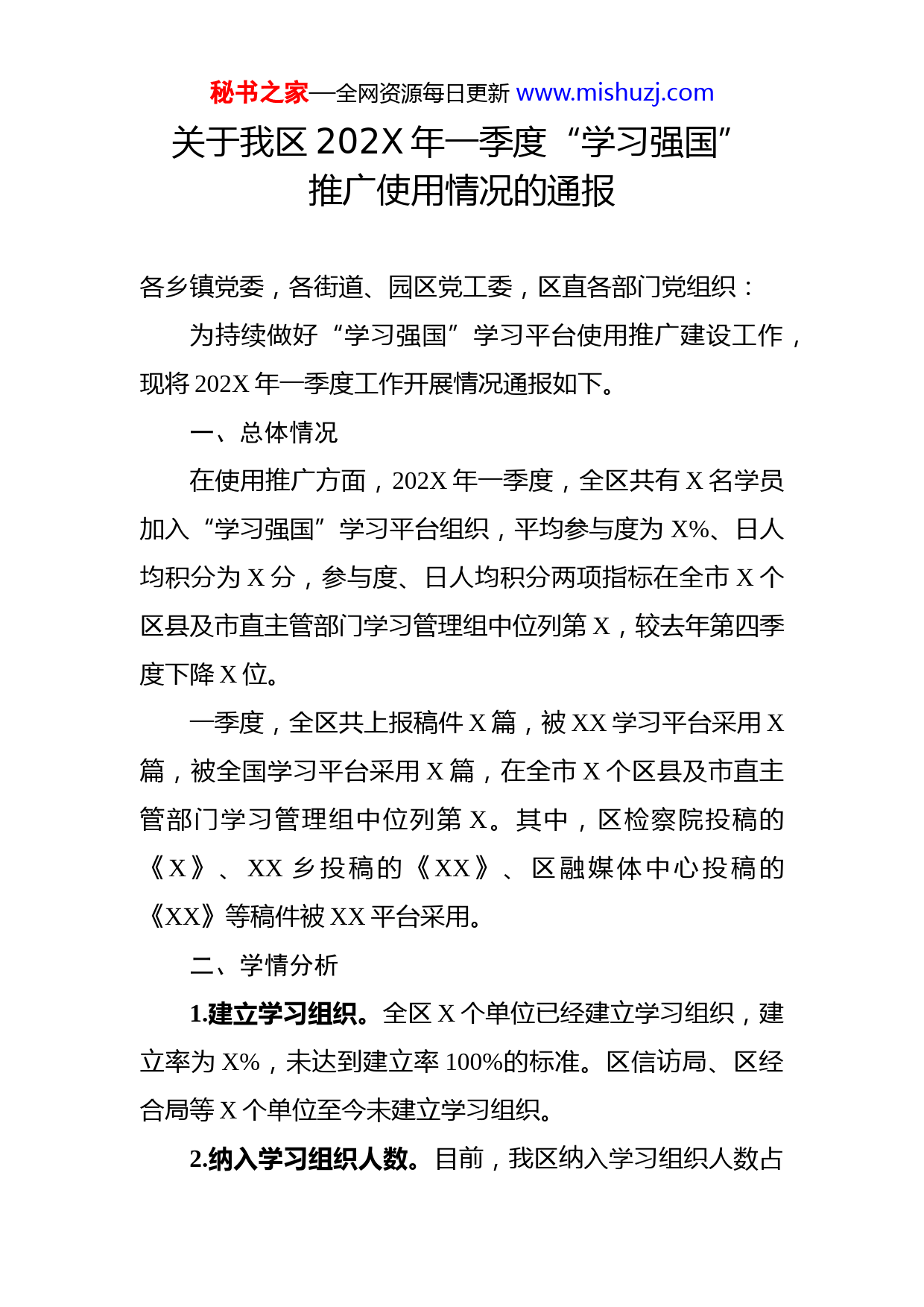 秘书之家—全网资源每日更新www.mishuzj.com关于我区202X年一季度“学习强国”推广使用情况的通报各乡镇党委,各街道、园区党工委,区直各部门党组织:为持续做好“学习强国”学习平台使用推广建设工作,现将202X年一季度工作开展情况通报如下。一、总体情况在使用推广方面,202X年一季度,全区共有X名学员加入“学习强国”学习平台组织,平均参与度为X%、日人均积分为X分,参与度、日人均积分两项指标在全市X个区县及市直主管部门学习管理组中位列第X,较去年第四季度下降X位。一季度,全区共上报稿件X篇,被XX学习平台采用X篇,被全国学习平台采用X篇,在全市X个区县及市直主管部门学习管理组中位列第X。其中,区检察院投稿的《X》、XX乡投稿的《XX》、区融媒体中心投稿的《XX》等稿件被XX平台采用。二、学情分析1.建立学习组织。全区X个单位已经建立学习组织,建立率为X%,未达到建立率100%的标准。区信访局、区经合局等X个单位至今未建立学习组织。2.纳入学习组织人数。目前,我区纳入学习组织人数占秘书之家—全网资源每日更新www.mishuzj.com党员数比例为X%,这项指标在全市排名靠后。乡镇、街道在此项指标上无一单位达标,其中XX街道办、XX镇纳入学习组织人数占党员比例分别为X%、X%,在全区同级单位中排名靠后;区直单位中,区国资局、区卫健局、区综合执法局此项指标完成较好,在全区同级单位中排名靠前。3.学习参与度、日人均积分。受春节假期和疫情影响,较去年年底,全区学习参与度下降X%、日人均积分下降X分、两项指标排名分别下降X位。其中,区委党校、区委编办、区行政审批局、区纪委监委工作开展较好,学习参与度名列前茅。区工商联、XX镇、XX街道办、XX街道办工作开展较差,学习参与度低于X%。4.稿件采写报送。目前,全区共X单位建立了学习强国供稿通讯站,建立率仅为X%,未达到建立率100%的标准。建立通讯站的单位如区融媒体中心、区行政审批局、区检察院、区税务局、唐家乡积极参与供稿工作,XX管委会、区供销社等单位虽然建立了通讯站,但从未投稿;XX镇、XX镇等单位既没有建立通讯站,也未参与投稿。三、工作要求1.注重统筹推进。各级各部门要切实提高政治站位,把组织党员干部群众使用“学习强国”学习平台开展学习作为当前一项重要政治任务,充分认识推广使用建设“学习强国”学习平台的重要意义,坚持把“学习强国”学习平台秘书之家—全网资源每日更新www.mishuzj.com学习使用工作与中心工作同安排同部署同推进,确保工作效果和质量。2.加强学习使用。未建立学习组织的单位应尽快按要求健全学习组织架构,组织本单位干部职工下载使用“学习强国”学习平台,确保实现单位职工全覆盖。已建立学习组织的单位要督促本单位学习管理员切实履行好学习管理责任,定期在工作群上报本支部学习情况,反映有关问题提出学习建议,调动本单位党员学习积极性,确保本单位注册学员每日参与度不低于70%,学习积分不低于30分。同时加大推广力度,广泛吸引本单位未注册员工、职工亲属、市民群众等加入学习组织,不断扩大学习成员覆盖面,力争5月底前达到70%,此后逐月上升,尽量达到100%。3.加强稿件推送。各级各部门要切实整合宣传信息、网评工作力量,进一步加强“学习强国”学习平台供稿员队伍建设,建立本单位“学习强国”通讯站。区融媒体中心要参照市上做法,尽快建立“学习强国”XX学习平台编辑部,强化我区“学习强国”的运维和稿件编审、上传工作投稿量每周不得少于20篇,过审率每周不得少于5篇;各乡镇党委、街道党工委投稿量每周不得少于5篇,过审率每周不得少于1篇;区教体局党委、区卫健局党委投稿量每周不得少于3篇,过审率每月不得少于2篇;其余区直部门党组织每周不得少于2篇,过审率每月不得少于1篇。区委宣秘书之家—全网资源每日更新www.mishuzj.com传部要鼓励全区各级各部门干部职工积极报送反映XX政治、经济、社会、文化等各方面发展成就和亮点的稿件,在提高投稿数的同时,提高稿件质量,力争全区每月在四川平台上采用10篇以上,全国平台采用1篇以上,形成利用“学习强国”学习平台宣传展示XX良好形象的浓厚氛围。4.强化考核通报。区委宣传部要将“学习强国”学习平台使用推广情况纳入全区宣传思想工作、落实意识形态责任制、党委(党组)理论学习中心组学习年度考核内容,每月通报“学习强国”推广使用情况,年底逗硬考核奖惩,对“学习强国”推广使用建设指标不达标的单位实行“一票否决”。各级各部门要对应做好对本级和下级学习组织推广使用建设情况的考核通报工作。