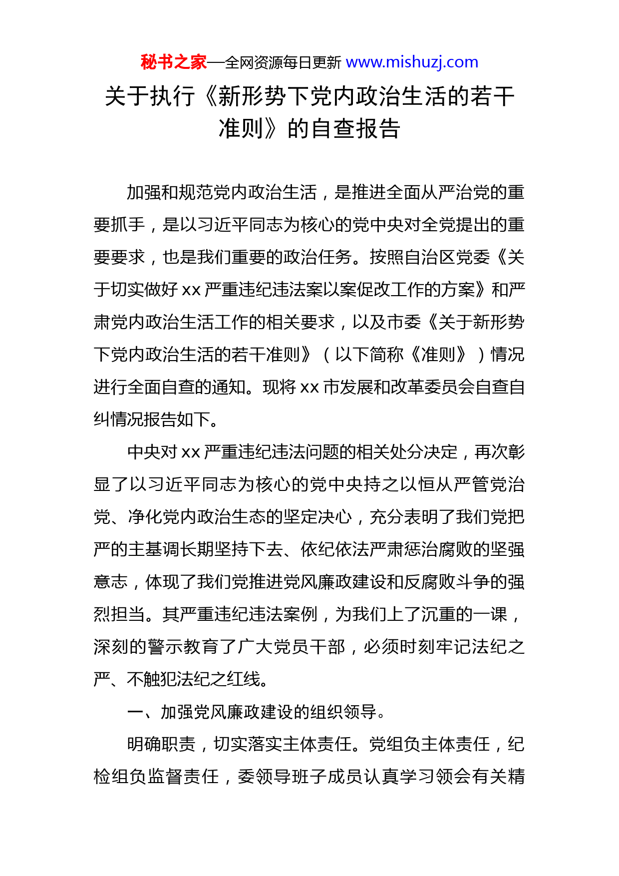 秘书之家—全网资源每日更新www.mishuzj.com关于执行《新形势下党内政治生活的若干准则》的自查报告加强和规范党内政治生活,是推进全面从严治党的重要抓手,是以习近平同志为核心的党中央对全党提出的重要要求,也是我们重要的政治任务。按照自治区党委《关于切实做好xx严重违纪违法案以案促改工作的方案》和严肃党内政治生活工作的相关要求,以及市委《关于新形势下党内政治生活的若干准则》(以下简称《准则》)情况进行全面自查的通知。现将xx市发展和改革委员会自查自纠情况报告如下。中央对xx严重违纪违法问题的相关处分决定,再次彰显了以习近平同志为核心的党中央持之以恒从严管党治党、净化党内政治生态的坚定决心,充分表明了我们党把严的主基调长期坚持下去、依纪依法严肃惩治腐败的坚强意志,体现了我们党推进党风廉政建设和反腐败斗争的强烈担当。其严重违纪违法案例,为我们上了沉重的一课,深刻的警示教育了广大党员干部,必须时刻牢记法纪之严、不触犯法纪之红线。一、加强党风廉政建设的组织领导。明确职责,切实落实主体责任。党组负主体责任,纪检组负监督责任,委领导班子成员认真学习领会有关精秘书之家—全网资源每日更新www.mishuzj.com神,结合实际,及时研究制定了《市发改委党风廉政建设和反腐败工作主体责任和监督责任清单》,细化明确了班子的集体责任、班子主要负责人的第一责任人责任、班子其他成员的“一岗双责”。领导班子主要负责人专门就如何落实党风廉政建设“两个责任”特别是主体责任,为机关全体党员干部讲廉政党课,强调要把主体责任时时放在心上、牢牢扛在肩上、紧紧抓在手上,强化担当意识,将党风廉政建设各项任务和要求落到实处。同时在全委逐级开展约谈工作,签订廉政责任承诺书,确保层层有任务、人人有担子、项项有落实。二是齐抓共管,认真履行“一岗双责”。年初,制定印发了《党风廉政建设和反腐败工作要点》,对严明党的各项纪律、认真落实党风廉政建设责任制、加强机关和领导干部作风建设、加强党员干部教育监督等提出明确要求。及时召开了全委党风廉政建设和反腐败工作会议,对全年党风廉政建设和反腐败工作进行了全面安排部署。工作中,委领导班子主要负责人切实履行党风廉政建设第一责任人职责,做到重要工作亲自部署、重大问题亲自过问、重点环节亲自协调、重大项目亲自督办;领导班子其他成员认真执行“一岗双责”制度,把反腐倡廉工作与其他业务工作紧密结合起来,做到同研究、同规划、同布置、同检查、同问责。领导班子讲诚信、懂规矩、守纪秘书之家—全网资源每日更新www.mishuzj.com律,切实发挥党员领导干部表率作用。全委坚持把纪律和规矩挺在前面,始终严格遵守党的政治纪律和政治规矩,时刻用党纪党规要求约束每名党员,全面提高广大党员干部的政治敏锐性和政治鉴别力,坚决同一切违反党的纪律的行为作斗争。二、继续深化贯彻落实中央八项规定专项检查、坚决纠正整治“四风”专项检查和重要时间节点专项检查。其中包括关于抓好严禁公款购买印制寄送贺年卡等物品工作的监督检查、抓好严禁公款购买赠送烟花爆竹等年货节礼工作的监督检查、确保元旦春节风清气正的监督检查、清明节期间加强公车管理严禁公车扫墓的监督检查、五一”节、端午节期间落实中央八项规定精神和纠正“四风”问题的监督检查、党员干部和公职人员借举办“升学宴”敛财活动的监督检查、党员干部和公职人员借婚丧等事宜大操大办敛财的监督检查等。始终坚持“以民为本、为民解困、为民服务”的工作理念,通过深入开展“我为群众办实事”系列活动,深化党组织联系基层、党员干部联系群众“双联系”制度,为结对帮扶的向阳社区、五原县胜丰镇解决了若干项实际困难,确保服务群众“最后一公里”问题真正解决。三、严格执行民主集中制原则。完善科学决策、民主决策、依法决策有关程序,按照秘书之家—全网资源每日更新www.mishuzj.com“集体领导、民主集中、个别酝酿、会议决定”的要求,全委严格执行领导集体决策重大问题议事规则,建立健全决策实施反馈机制,使决策规范化、民主化、科学化,杜绝领导个人或少数人代替会议集体决定或未经充分酝酿匆忙作出决定的现象,形成了既有民主又有集中,既有纪律又有自由,既有思想统一又有个人意志的政治局面。四、严格管理党员队伍。畅通党员参与讨论党内事务的途径,拓宽党员表达意见渠道,营造党内民主讨论的政治氛围。一是贯彻落实《党章》《中国共产党党员权利保障条例》,使全体党员有权利平等地直接或间接地参与决定党内事务。做到重大事情党内先知道,重要文件党内先传达,重大问题的决定党内先讨论,重大决策的实施党内先发动,使广大党员能够及时地、公平等地、真正地、充分地了解党内重大事务的运作过程、运作方式;从而使广大党员了解大局、顾全大局,增强党员的荣誉感和责任感,调动党员的积极性、主动性和创造性。二是推进党务公开,增强党内工作的透明度。积极疏通和拓宽党内下情上达的渠道,丰富党内民主方式,逐步推进党务公开,增强党组织工作的透明度,通过透明、公开,保证公平、公正,营造党内不同意见平等讨论的环境,鼓励和保