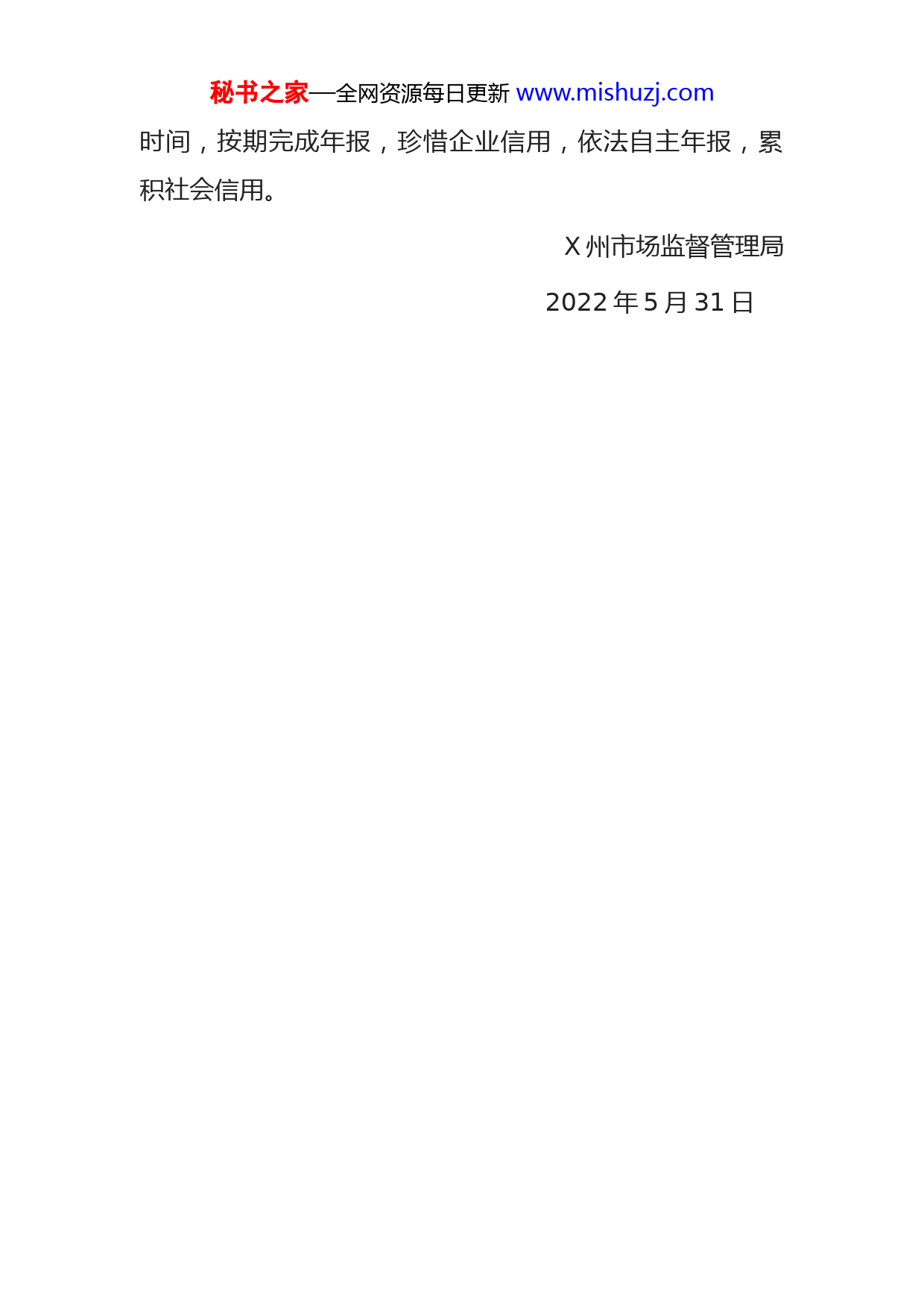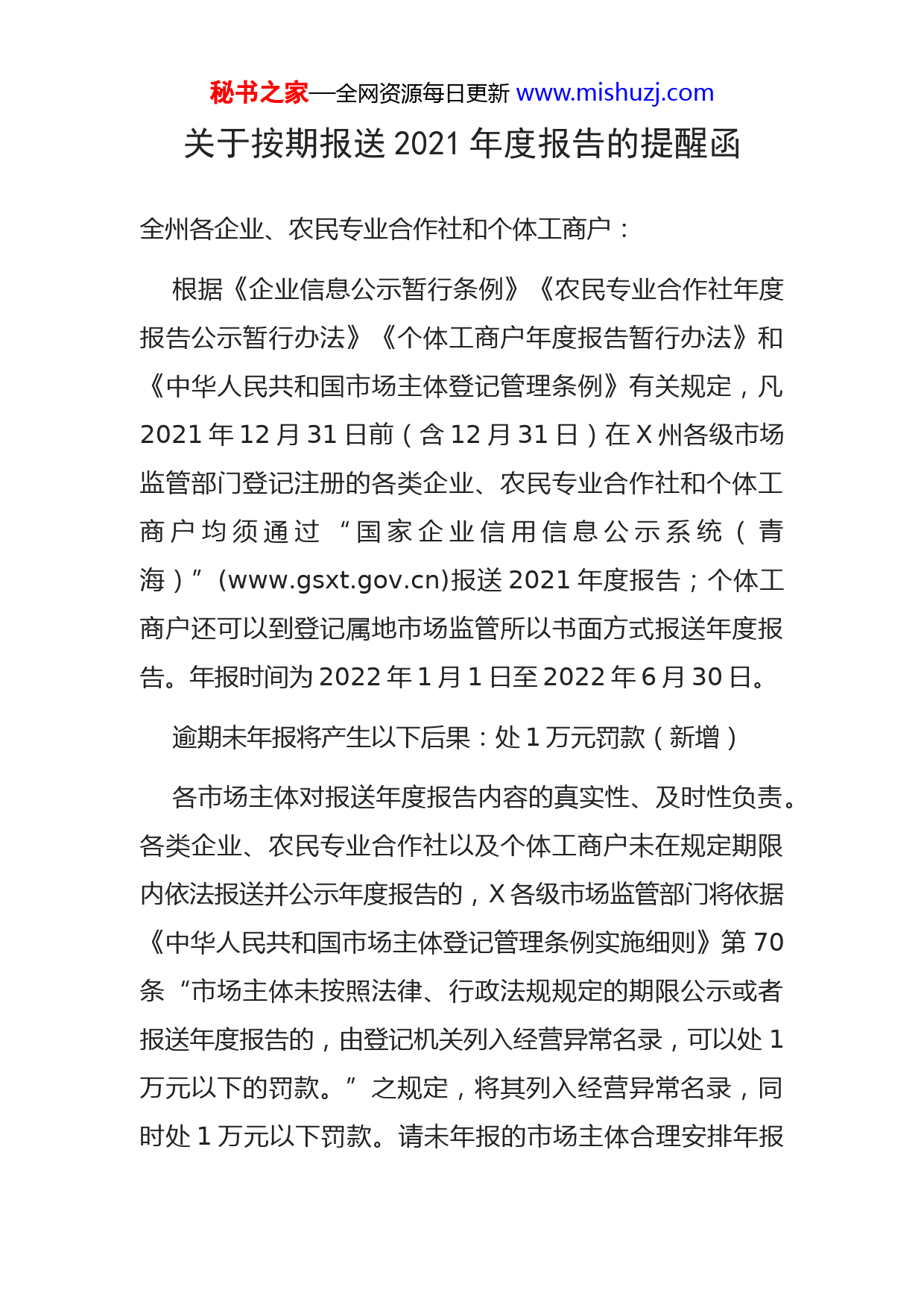 秘书之家—全网资源每日更新www.mishuzj.com关于按期报送2021年度报告的提醒函全州各企业、农民专业合作社和个体工商户:根据《企业信息公示暂行条例》《农民专业合作社年度报告公示暂行办法》《个体工商户年度报告暂行办法》和《中华人民共和国市场主体登记管理条例》有关规定,凡2021年12月31日前(含12月31日)在X州各级市场监管部门登记注册的各类企业、农民专业合作社和个体工商户均须通过“国家企业信用信息公示系统(青海)”(www.gsxt.gov.cn)报送2021年度报告;个体工商户还可以到登记属地市场监管所以书面方式报送年度报告。年报时间为2022年1月1日至2022年6月30日。逾期未年报将产生以下后果:处1万元罚款(新增)各市场主体对报送年度报告内容的真实性、及时性负责。各类企业、农民专业合作社以及个体工商户未在规定期限内依法报送并公示年度报告的,X各级市场监管部门将依据《中华人民共和国市场主体登记管理条例实施细则》第70条“市场主体未按照法律、行政法规规定的期限公示或者报送年度报告的,由登记机关列入经营异常名录,可以处1万元以下的罚款。”之规定,将其列入经营异常名录,同时处1万元以下罚款。请未年报的市场主体合理安排年报秘书之家—全网资源每日更新www.mishuzj.com时间,按期完成年报,珍惜企业信用,依法自主年报,累积社会信用。X州市场监督管理局2022年5月31日