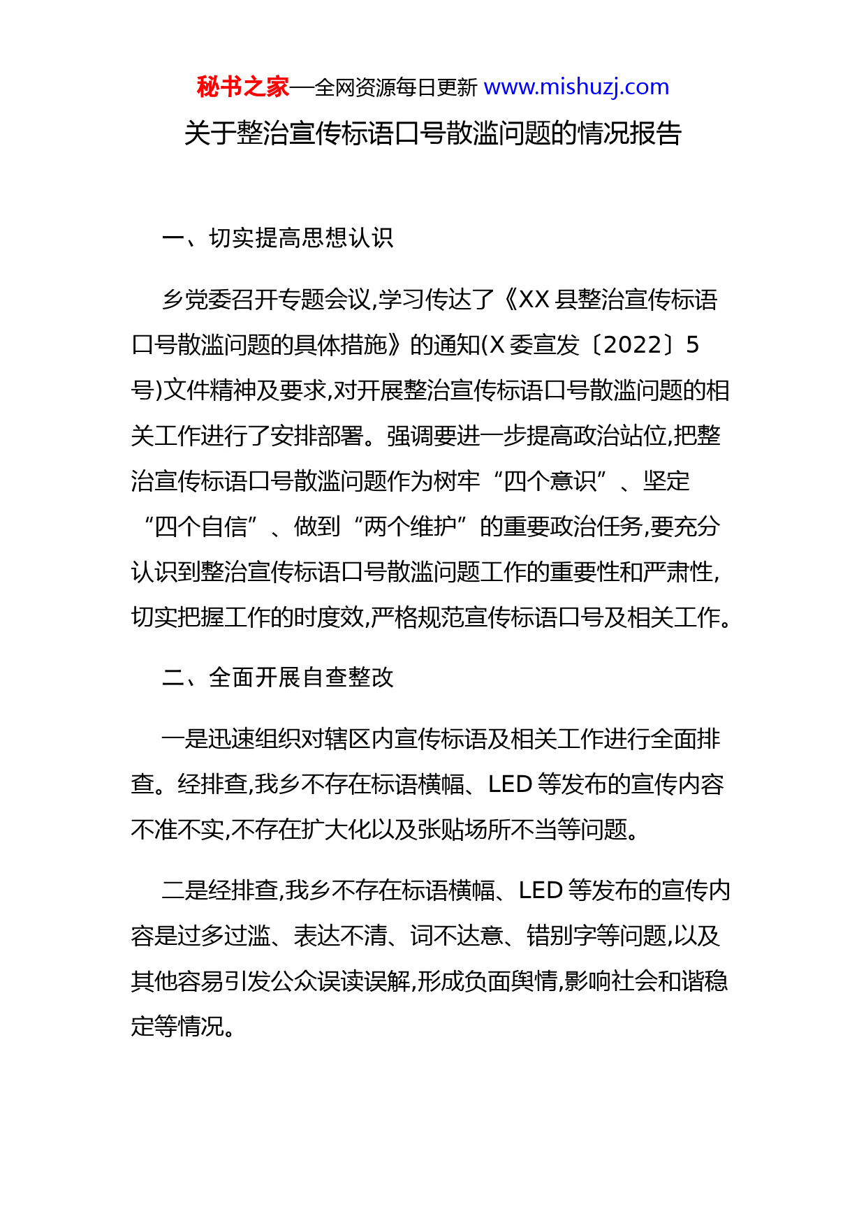 秘书之家—全网资源每日更新www.mishuzj.com关于整治宣传标语口号散滥问题的情况报告一、切实提高思想认识乡党委召开专题会议,学习传达了《XX县整治宣传标语口号散滥问题的具体措施》的通知(X委宣发〔2022〕5号)文件精神及要求,对开展整治宣传标语口号散滥问题的相关工作进行了安排部署。强调要进一步提高政治站位,把整治宣传标语口号散滥问题作为树牢“四个意识”、坚定“四个自信”、做到“两个维护”的重要政治任务,要充分认识到整治宣传标语口号散滥问题工作的重要性和严肃性,切实把握工作的时度效,严格规范宣传标语口号及相关工作。二、全面开展自查整改一是迅速组织对辖区内宣传标语及相关工作进行全面排查。经排查,我乡不存在标语横幅、LED等发布的宣传内容不准不实,不存在扩大化以及张贴场所不当等问题。二是经排查,我乡不存在标语横幅、LED等发布的宣传内容是过多过滥、表达不清、词不达意、错别字等问题,以及其他容易引发公众误读误解,形成负面舆情,影响社会和谐稳定等情况。秘书之家—全网资源每日更新www.mishuzj.com三是针对标语横幅破烂不堪、宣传标语未及时更新等情况,我乡赓即安排相关工作人员对破烂、未及时更新的3个横幅标语进行了更换。三、下一步工作举措一是严把质量。制作每一个宣传内容,都由分管领导审核,并由主要领导签字备案。绝不允许出现标语横幅、LED等发布的宣传内容不准不实、表达不清、词不达意、错别字等问题,以及其他容易引发公众误读误解,形成负面舆情,影响社会和谐稳定等情况。二是严禁形式主义。确定场镇以及各村固定的宣传形式和地点。对标语横幅、LED等发布的宣传内容严格把关,避免扩大化以及张贴场所不当、宣传内容过多过滥等情况出现。三是规范宣传,实事求是。对已经宣传的内容照相存档。实事求是,宣传不弄虚作假、欺上瞒下、伪造材料、编造假经验、假数据。不过多过频的张贴横幅标语,严格把握横幅标语的张贴数量。