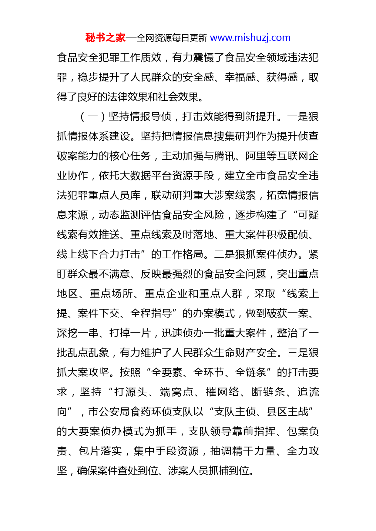 秘书之家—全网资源每日更新www.mishuzj.com关于新时代依法打击食品安全领域违法犯罪的汇报材料习近平总书记在党的二十大报告中指出,推进健康中国建设,把保障人民健康放在优先发展的战略位置。全市公安食药环侦部门以深入贯彻落实党的二十大精神为引领,坚持以人民为中心的发展理念,以习近平总书记食品安全“四个最严”要求为根本遵循,全面贯彻落实《中共中央、国务院关于深化改革加强食品安全工作的意见》,对标对表党政同责食品安全工作任务,以创建国家食品安全示范城市为契机,始终保持对食药环领域违法犯罪的严打高压态势,坚决守住食品安全底线,全力保障人民群众舌尖上的安全。本文结合XX市公安局食药环侦工作实际,深入分析存在的问题和短板,就新时代全面强化食品安全领域违法犯罪打击工作提出对策建议。一、当前XX市打击食品安全领域犯罪工作情况2022年以来,全市公安机关共侦破食品安全领域犯罪案件XX件,移送起诉XX人,其中破获公安部挂牌督办案件X件,省公安厅挂牌督办案件XX件。XX公安食药环侦警种作为打击食品安全领域违法犯罪的专业队伍,在全省条线警种考核“XX”系列综合排名第X,处于中等水平,随着系统完备的食药环侦工作体系加快推进,不断提升打击秘书之家—全网资源每日更新www.mishuzj.com食品安全犯罪工作质效,有力震慑了食品安全领域违法犯罪,稳步提升了人民群众的安全感、幸福感、获得感,取得了良好的法律效果和社会效果。(一)坚持情报导侦,打击效能得到新提升。一是狠抓情报体系建设。坚持把情报信息搜集研判作为提升侦查破案能力的核心任务,主动加强与腾讯、阿里等互联网企业协作,依托大数据平台资源手段,建立全市食品安全违法犯罪重点人员库,联动研判重大涉案线索,拓宽情报信息来源,动态监测评估食品安全风险,逐步构建了“可疑线索有效推送、重点线索及时落地、重大案件积极配侦、线上线下合力打击”的工作格局。二是狠抓案件侦办。紧盯群众最不满意、反映最强烈的食品安全问题,突出重点地区、重点场所、重点企业和重点人群,采取“线索上提、案件下交、全程指导”的办案模式,做到破获一案、深挖一串、打掉一片,迅速侦办一批重大案件,整治了一批乱点乱象,有力维护了人民群众生命财产安全。三是狠抓大案攻坚。按照“全要素、全环节、全链条”的打击要求,坚持“打源头、端窝点、摧网络、断链条、追流向”,市公安局食药环侦支队以“支队主侦、县区主战”的大要案侦办模式为抓手,支队领导靠前指挥、包案负责、包片落实,集中手段资源,抽调精干力量、全力攻坚,确保案件查处到位、涉案人员抓捕到位。秘书之家—全网资源每日更新www.mishuzj.com(二)强化联合监管,社会合力得到新增强。一是建立健全部门联动机制。坚持多跨协同、全域联动,主动加强与XX市市场监管、农业农村等部门协作配合,建立问题共商、资源共享、信息互通、优势互补工作机制,深度挖掘潜规则行业性串案和专案经营,时刻保持查处高压态势,形成部门联动、群防群治、联防联控的工作合力。二是畅通行刑衔接流程渠道。主动加强与法院、检察院等对接沟通,对有案未移、以罚代刑、降格处理或应当进一步侦查而未侦查等违法情形的,充分发挥检察建议、立案监督、纠正违法行为的职能作用,健全完善定期会商、提前介入指导侦查,着力解决相关案件定性和证据标准等法律适用问题,既让办案民警“少跑腿”,也为执法办案拧紧“安全阀”。三是构建警民联合共治网络。最大化发挥社会资源和力量,鼓励社会、群众、媒体共同参与食品安全的监督,全面落实食品安全有奖举报制度,形成问题联治、风险联控、平安联创的良好风气,推动更高水平舌尖上的平安XX建设。(三)夯实基础建设,保障能力得到新提高。一是组建专业力量。XX市公安局党委高度重视食品安全工作,多次召开专题会议研究,积极争取党委政府支持,成立专业警种,在人力、物力、财力等方面给予大力支持和保障,为有效履行食品领域犯罪打击职能奠定了坚实基础。二是秘书之家—全网资源每日更新www.mishuzj.com强化教育培训。坚持把队伍建设作为履职尽责的核心关键,采取专题授课、案例教学、经验交流和庭审旁听等方式,常态化开展食品安全分析研判和查处打击实战大练兵,持续深化队伍教育培训,队伍的执法办案能力和专业素养得到显著提升。三是规范鉴定程序。XX市公安局投入XX万资金在食药环侦支队建成快检实验室,进一步规范快检的应用,对关键物质的提取通过拍照、同步录音录像等进行记录,同步加强对样品的送样、保存,防止因外部环境影响特性变化,全面保障了证据规范有效,有力提升了案件侦办效率。二、工作存在的问题和不足(一)思想认识需要提高。个别区县食药环侦大队对新时代打击食品安全领域犯罪工作重视不够,不善于运用新理念新思路应对新情况新问题,特别是少数领导和民警能力素质不能适应新时代要求,面对人民群众的新要求新期望,对工作把握不准、研究不透、办法不多,一定程度影响了打击食品安全领域犯罪工作的质效。(二)能力建设需要提高。食品安全领域犯罪涉及面广,专业性强,食品安全犯罪具有较大的隐蔽性和专业性的特点,很多都是团伙分工、跨区域作案,具有较强的反侦查能力,