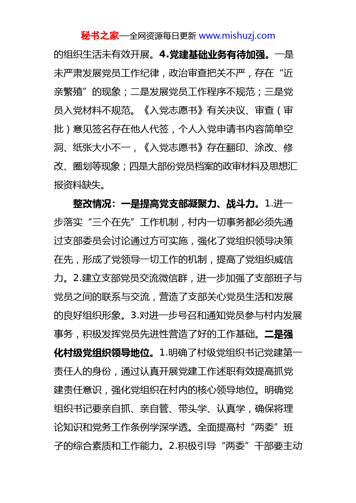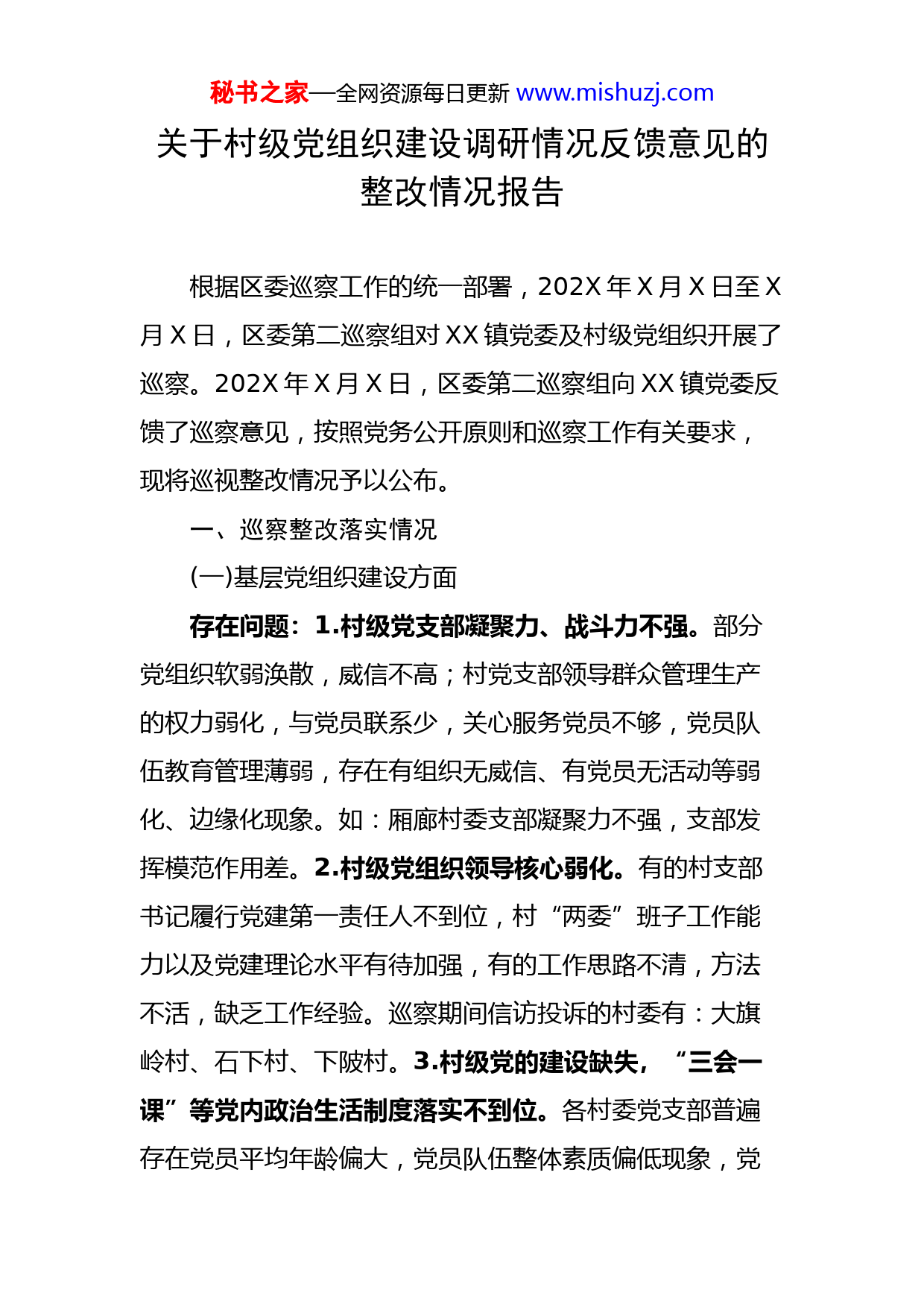 秘书之家—全网资源每日更新www.mishuzj.com关于村级党组织建设调研情况反馈意见的整改情况报告根据区委巡察工作的统一部署,202X年X月X日至X月X日,区委第二巡察组对XX镇党委及村级党组织开展了巡察。202X年X月X日,区委第二巡察组向XX镇党委反馈了巡察意见,按照党务公开原则和巡察工作有关要求,现将巡视整改情况予以公布。一、巡察整改落实情况(一)基层党组织建设方面存在问题:1.村级党支部凝聚力、战斗力不强。部分党组织软弱涣散,威信不高;村党支部领导群众管理生产的权力弱化,与党员联系少,关心服务党员不够,党员队伍教育管理薄弱,存在有组织无威信、有党员无活动等弱化、边缘化现象。如:厢廊村委支部凝聚力不强,支部发挥模范作用差。2.村级党组织领导核心弱化。有的村支部书记履行党建第一责任人不到位,村“两委”班子工作能力以及党建理论水平有待加强,有的工作思路不清,方法不活,缺乏工作经验。巡察期间信访投诉的村委有:大旗岭村、石下村、下陂村。3.村级党的建设缺失,“三会一课”等党内政治生活制度落实不到位。各村委党支部普遍存在党员平均年龄偏大,党员队伍整体素质偏低现象,党秘书之家—全网资源每日更新www.mishuzj.com的组织生活未有效开展。4.党建基础业务有待加强。一是未严肃发展党员工作纪律,政治审查把关不严,存在“近亲繁殖”的现象;二是发展党员工作程序不规范;三是党员入党材料不规范。《入党志愿书》有关决议、审查(审批)意见签名存在他人代签,个人入党申请书内容简单空洞、纸张大小不一,《入党志愿书》存在翻印、涂改、修改、圈划等现象;四是大部份党员档案的政审材料及思想汇报资料缺失。整改情况:一是提高党支部凝聚力、战斗力。1.进一步落实“三个在先”工作机制,村内一切事务都必须先通过支部委员会讨论通过方可实施,强化了党组织领导决策在先,形成了党领导一切工作的机制,提高了党组织威信力。2.建立支部党员交流微信群,进一步加强了支部班子与党员之间的联系与交流,营造了支部关心党员生活和发展的良好组织形象。3.对进一步号召和通知党员参与村内发展事务,积极发挥党员先进性营造了好的工作基础。二是强化村级党组织领导地位。1.明确了村级党组织书记党建第一责任人的身份,通过认真开展党建工作述职有效提高抓党建责任意识,强化党组织在村内的核心领导地位。明确党组织书记要亲自抓、亲自管、带头学、认真学,确保将理论知识和党务工作条例学深学透。全面提高村“两委”班子的综合素质和工作能力。2.积极引导“两委”干部要主动秘书之家—全网资源每日更新www.mishuzj.com开展学习,经常与上级党组织沟通工作,多交流经验,积极提升“两委”干部的能力。三是加强党的建设、深入落实党内政治生活制度。1.加强村级党的建设,严格贯彻落实党内政治生活制度。村支部书记紧抓村党组织党建工作,确保党的组织生活有效开展。2.进一步严格要求,做好“三会一课”和“两学一做”相关记录,严肃对待每一项会议和学习要求。3.深入贯彻落实“头雁”工程,大力培养年轻党员发展对象,充实党员后备队伍资源,积极发展年轻党员,组织党员和后备队伍参与村内实践锻炼,加强队伍建设。四是全面排查,提高党建业务水平。1.全面深入排查发展党员工作存在的问题,对书写不正确的《入党志愿书》并整改,将缺少的材料立即补上,并通知各发展党员必须按时上交思想汇报。下一步将继续抓好发展党员工作,对屡教不改的党员严格批评教育。2.支部书记带头加强对发展党员工作细则的学习,严格按照《中国共产党发展党员工作细则》规范发展党员工作程序,对之前违规发展党员的情况进行调查整改。(二)基层党员干部作风不实存在问题:有的党员干部办事不公,处事不当。此次巡察信访投诉较多的是村级党员干部问题,相关信件已转XX镇调处。主要反映:1.个别村未经村民集体同意私自发包村委集体林地,开采煤矸石,破坏生态环境,存在安全秘书之家—全网资源每日更新www.mishuzj.com隐患问题。2.个别村小组核查村民播种面积厚此薄彼,为亲朋好友谋取多些国家种粮补贴问题。整改情况:镇纪委结合区纪委开展的全区领导干部形式主义、官僚主义等作风问题专项整治活动,召开了全镇整治党员干部作风问题专项工作推进会议,同时利用镇每周一例会及日常村居书记、主任会议的机会狠抓村级党员干部的作风建设,使作风建设工作常态化。加大对村干部作风问题线索的排查力度,结合镇纪委不定期开展明察暗访行动,对排查发现及群众反映强烈的存在作风问题的村干部从严查处。(三)村级党风廉政建设和反腐败工作情况存在问题:1.财经制度落实不到位。未严格按《浈江区XX镇农村集体资源资产和资金管理制度》和《关于规范XX镇村级村规民约中福利开支的建议》标准执行。一是超标准发放工资和补贴;二是村小组“三资”监管不到位;三是大额支付现金;四是坐支现金。2.执行财经纪律不严,财务报账不规范。一是存在票证不符。出现开票单位与收款单位不一致、或给错发票联;二是原始凭证不齐全;三是审批手续混乱;四是存在公款缴交公车违章罚款问题;五是征地应付征地补偿款混乱,原始凭证存在涂改现象。整改情况:1.针对财经制度落实不到位问题。一是严格