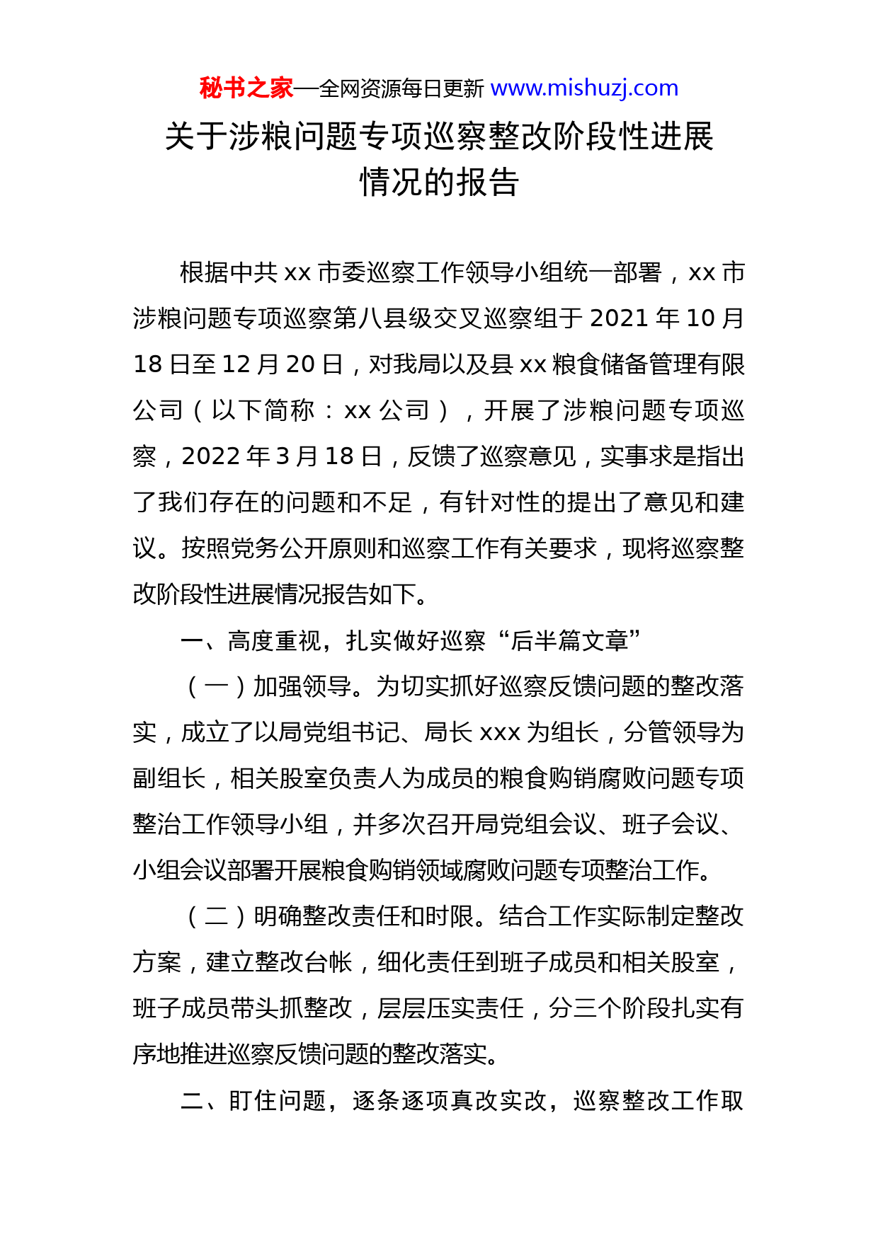 秘书之家—全网资源每日更新www.mishuzj.com关于涉粮问题专项巡察整改阶段性进展情况的报告根据中共xx市委巡察工作领导小组统一部署,xx市涉粮问题专项巡察第八县级交叉巡察组于2021年10月18日至12月20日,对我局以及县xx粮食储备管理有限公司(以下简称:xx公司),开展了涉粮问题专项巡察,2022年3月18日,反馈了巡察意见,实事求是指出了我们存在的问题和不足,有针对性的提出了意见和建议。按照党务公开原则和巡察工作有关要求,现将巡察整改阶段性进展情况报告如下。一、高度重视,扎实做好巡察“后半篇文章”(一)加强领导。为切实抓好巡察反馈问题的整改落实,成立了以局党组书记、局长xxx为组长,分管领导为副组长,相关股室负责人为成员的粮食购销腐败问题专项整治工作领导小组,并多次召开局党组会议、班子会议、小组会议部署开展粮食购销领域腐败问题专项整治工作。(二)明确整改责任和时限。结合工作实际制定整改方案,建立整改台帐,细化责任到班子成员和相关股室,班子成员带头抓整改,层层压实责任,分三个阶段扎实有序地推进巡察反馈问题的整改落实。二、盯住问题,逐条逐项真改实改,巡察整改工作取秘书之家—全网资源每日更新www.mishuzj.com得阶段性成效xx市涉粮问题专项巡察第八县级交叉巡察组对我局以及xx公司涉粮问题反馈了22个意见,其中贯彻落实习近平总书记关于粮食安全系列重要讲话和重要指示指示精神、党中央决策部署及省委、市委工作要求方面5个;粮食储备管理职能责任落实方面9个;粮食购销领域廉洁风险防控方面8个。(一)贯彻落实习近平总书记关于粮食安全系列重要讲话和重要指示批示精神、党中央决策部署及省委、市委工作要求方面1.针对习近平总书记关于粮食安全系列重要讲话和重要指示批示精神不学习、不传达,落实党中央决策部署及省委、市委、县委工作要求不到位问题。我局和xx公司组织开展学习《习近平总书记关于粮食安全和应急物资保障工作的指示批示精神》、《习近平总书记关于粮食重要指示精神》、《牢牢守住保障国家粮食安全底线》、《习近平总书记牵挂的粮食安全饭碗主要装中国粮》等重要讲话、重要指示指示精神,深刻理解习近平新时代中国特色社会主义思想的丰富内涵和精髓要义。2.针对执行国家有关安全储粮规定有差距,局党组对粮食工作不重视、决策不规范问题。如对粮食储备工作不重视,没有将粮食储备工作摆上党组议事日程,对涉粮工作秘书之家—全网资源每日更新www.mishuzj.com研究部署少,对储备粮轮换购销工作甚至不研究。我局通过修订《xxx自治县粮食流通监督检查工作制度》、《局党组议事决策规则》、《局“三重一大”制度》,加强对xx公司有关工作汇报县政府的监管职责,实行局级把关,以局级报送,召开党组会议,学习习近平总书记关于国家粮食安全的重要指示批示精神及国家、省粮食政策,研究部署粮食购销领域腐败专项整治工作,召开联席会议,研究部署粮食轮换等工作。(二)粮食储备管理职能责任落实方面1.针对粮食质量监管不到位,粮食质量难保障。如执行《粮食质量安全监管办法》不到位,对粮食出入库未按规定进行质量检验问题。我局加强领导、加强监管,确保各项工作监督到位。通过制定《xxx自治县粮食和物资储备行业2022年质量安全监督管理计划》,建立粮食经营者粮食质量安全信用档案,开展政策性粮油库存检查和对入库食用油、出库成品粮进行质量抽检和安全生产工作,确保确保储备粮食储得进、管得好、调得动、用得上。2.针对xx公司永和储备库储粮工作不规范、不到位。如粮情检测不规范、不到位,日常粮情检测不规范,没有严格按照《粮油安全储存守则》去进行粮情检测,储粮虫害处理不规范,县级储备粮熏蒸后药渣处理不到位问题。一是我局加强对xx公司管理,督促xx公司规范工作程秘书之家—全网资源每日更新www.mishuzj.com序,要求xx公司制定《粮情检查检测与分析报告制度》,规范粮情检查检测和分析报告;二是规范储粮虫害和储粮熏蒸后药渣处理,加强《粮油储藏技术规范》专题培训学习,制定化学药剂、防护剂类物品使用台账,制定储粮化学药剂、防护剂类物品使用审批表,完善对使用物品的审批流程,储粮药剂的管理和操作规程。3.针对粮食质量安全档案不规范、不完善和粮食储备基础设施使用管理维护不到位,存在安全隐患问题。xx公司加强和规范目前在库粮油质量安全档案,严格粮食入库管理规定,完善质量安全档案中的供货方、产地、收购或出库时间、施药情况、销售去向记录;加强设施维护和管理,及时发现问题,及时解决,采取工作措施对储备库仓库及其他设施的日常检查,做好记录,并加强对永和储备库防雷装置和汽车衡检测检测。4.针对“三重一大”制度落实不到位,粮食购销等事项没有经集体会议讨论,由“一把手”说了算,存在“一言堂”问题。xx公司通过学习《粮食储备管理问责办法》,制定《三重一大”议事决策制度》,召开党风廉政建设工作会,召开董事会,讨论粮食工作问题等措施,进一步强化制度执行,提高制度约束力。(三)粮食购销领域廉洁风险防控方面1.针对责任意识淡薄,在县级储备成品粮购销环节存在秘书之家—全网资源每日更新www.mishuzj.com廉洁风险问题。xx公司通过召开全体员工参加的储备油验收