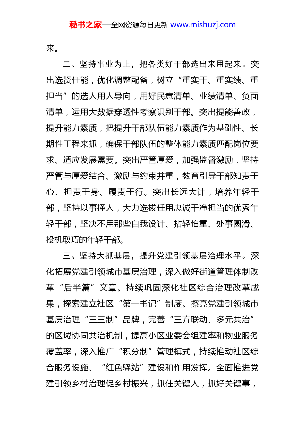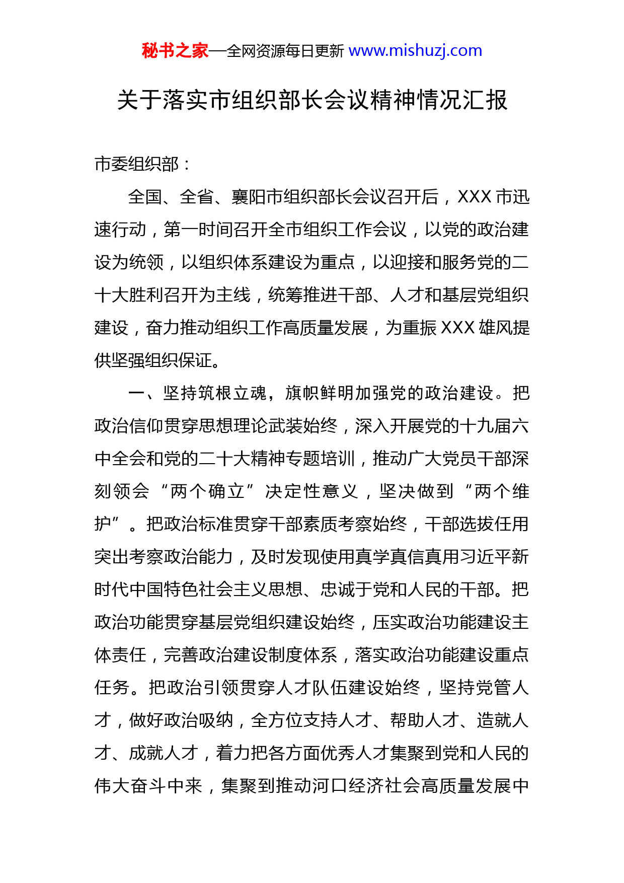 秘书之家—全网资源每日更新www.mishuzj.com关于落实市组织部长会议精神情况汇报市委组织部:全国、全省、襄阳市组织部长会议召开后,XXX市迅速行动,第一时间召开全市组织工作会议,以党的政治建设为统领,以组织体系建设为重点,以迎接和服务党的二十大胜利召开为主线,统筹推进干部、人才和基层党组织建设,奋力推动组织工作高质量发展,为重振XXX雄风提供坚强组织保证。一、坚持筑根立魂,旗帜鲜明加强党的政治建设。把政治信仰贯穿思想理论武装始终,深入开展党的十九届六中全会和党的二十大精神专题培训,推动广大党员干部深刻领会“两个确立”决定性意义,坚决做到“两个维护”。把政治标准贯穿干部素质考察始终,干部选拔任用突出考察政治能力,及时发现使用真学真信真用习近平新时代中国特色社会主义思想、忠诚于党和人民的干部。把政治功能贯穿基层党组织建设始终,压实政治功能建设主体责任,完善政治建设制度体系,落实政治功能建设重点任务。把政治引领贯穿人才队伍建设始终,坚持党管人才,做好政治吸纳,全方位支持人才、帮助人才、造就人才、成就人才,着力把各方面优秀人才集聚到党和人民的伟大奋斗中来,集聚到推动河口经济社会高质量发展中秘书之家—全网资源每日更新www.mishuzj.com来。二、坚持事业为上,把各类好干部选出来用起来。突出选贤任能,优化调整配备,树立“重实干、重实绩、重担当”的选人用人导向,用好民意清单、业绩清单、负面清单,运用大数据穿透性考察识别干部。突出提能善政,提升能力素质,把提升干部队伍能力素质作为基础性、长期性工程来抓,确保干部队伍的整体能力素质匹配岗位要求、适应发展需要。突出严管厚爱,加强监督激励,坚持严管与厚爱结合、激励与约束并重,教育引导干部知责于心、担责于身、履责于行。突出长远大计,培养年轻干部,坚持以事择人,大力选拔任用忠诚干净担当的优秀年轻干部,坚决不用那些自我设计、拈轻怕重、处事圆滑、投机取巧的年轻干部。三、坚持大抓基层,提升党建引领基层治理水平。深化拓展党建引领城市基层治理,深入做好街道管理体制改革“后半篇”文章。持续巩固深化社区综合治理改革成果,探索建立社区“第一书记”制度。擦亮党建引领城市基层治理“三三制”品牌,完善“三方联动、多元共治”的区域协同共治机制,提高小区业委会组建率和物业服务覆盖率,深入推广“积分制”管理模式,持续推动社区综合服务设施、“红色驿站”建设和作用发挥。全面推进党建引领乡村治理促乡村振兴,抓住关键人,抓好关键事,秘书之家—全网资源每日更新www.mishuzj.com抓实关键点。推动两新党建工作提质增效,探索开展产业链(联盟)党建工作,聚焦全市7条产业链,深入开展“组织联建、阵地联用、活动联办、人才联育、产业联兴”五联工程,推动党建引领强链延链补链。四、坚持创新驱动,充分释放人才创新创造活力。构建人才工作协同联动机制,实施市委人才工作领导小组成员单位党组书记领衔重点人才项目责任制,健全人才工作目标责任制。纵深推进人才发展体制改革,研究出台《支持产业人才队伍建设若干意见》,探索完善中级以上职称人才引进奖励、产业人才引进奖励等激励办法。实施“蓝领人才培育计划”,补齐专业技术人才数量不足、结构不优、供需脱节等短板弱项。深入实施“两回两带”工程,着力回引一批在外成功人士返乡创新创业,助力乡村振兴、繁荣县域经济。优化人才发展环境,探索建立“人才驿站”,持续开展“我为人才办实事”活动,确保人才能够安居安业安心。五、坚持政治立部,着力打造过硬队伍模范部门。把对党忠诚作为组工文化的精神内核、作为组工干部的精神标识。深入实施组工干部提能行动,开展股(室)长讲业务、“三比三看三争”(比思想、看境界,争当勤廉楷模;比业务、看本领,争当岗位能手;比工作、看贡献,争当先进模范)活动,树立精品理念,做到撰文成范文、秘书之家—全网资源每日更新www.mishuzj.com办事成案例、工作成标杆。锻造务实重行的过硬作风,推动各级组工干部以“拼”的干劲抓工作、以“抢”的状态干事业、以“实”的作风谋发展,锐意改革创新,严守规矩纪律,为提升组织工作服务中心大局能力水平提供坚强保障。