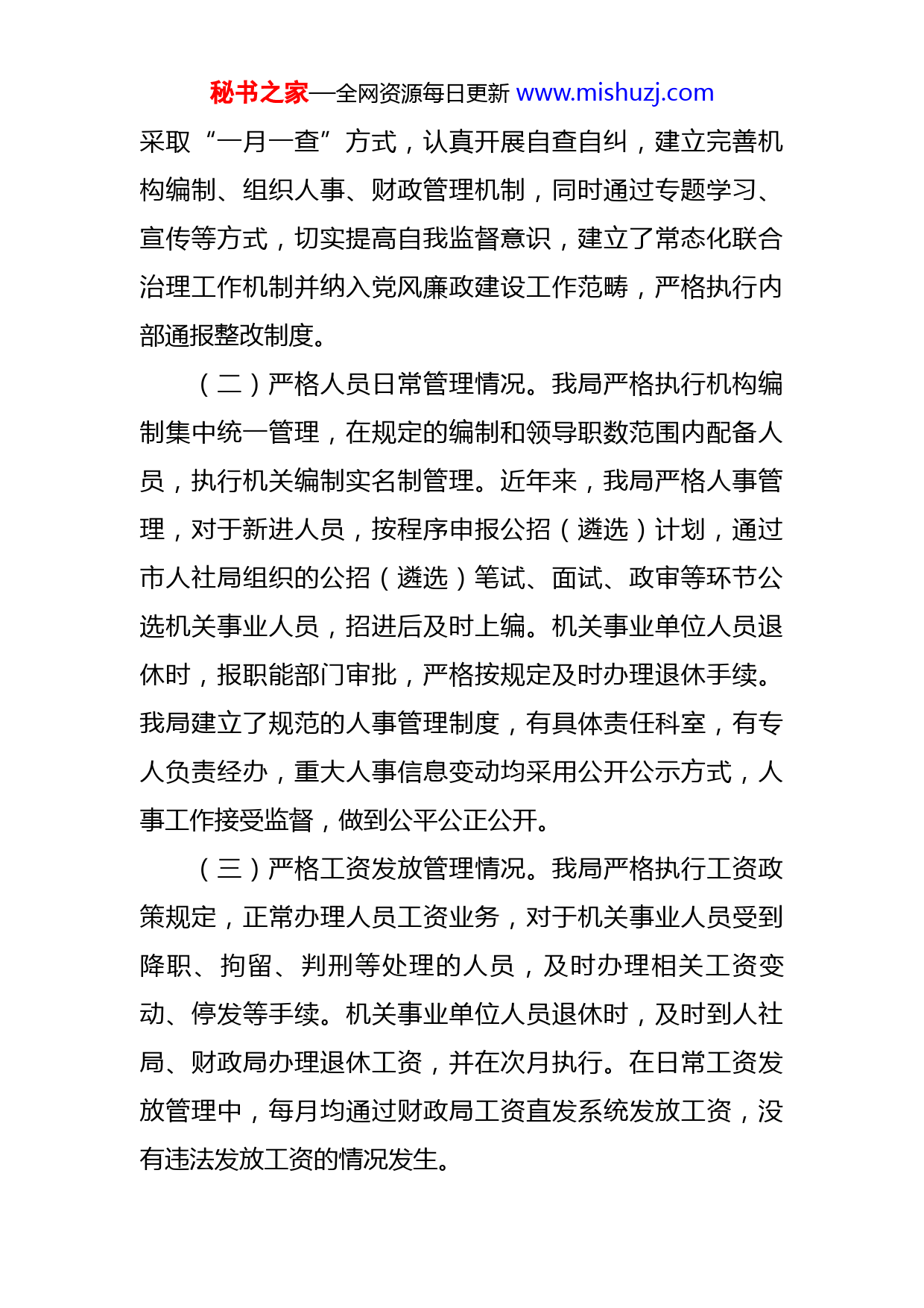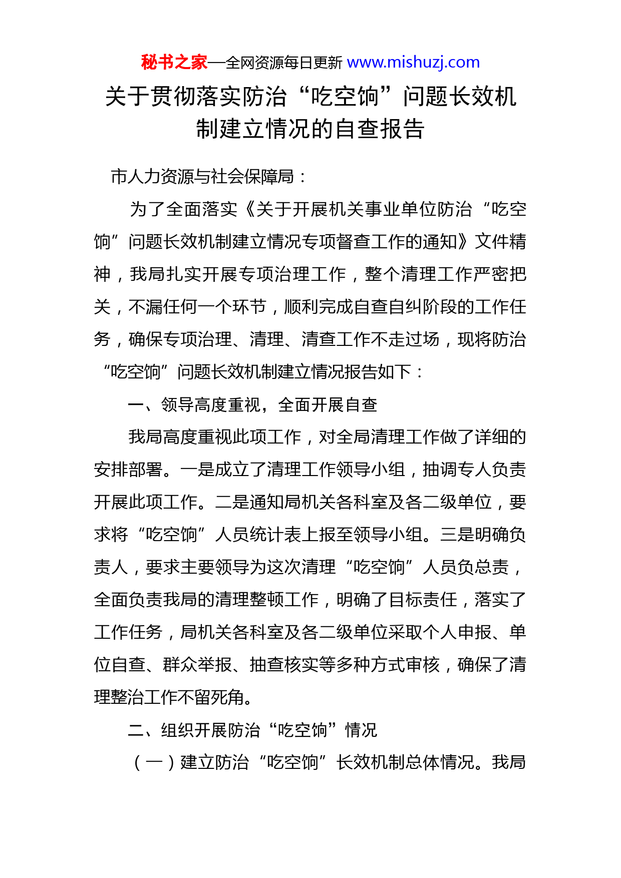 秘书之家—全网资源每日更新www.mishuzj.com关于贯彻落实防治“吃空饷”问题长效机制建立情况的自查报告市人力资源与社会保障局:为了全面落实《关于开展机关事业单位防治“吃空饷”问题长效机制建立情况专项督查工作的通知》文件精神,我局扎实开展专项治理工作,整个清理工作严密把关,不漏任何一个环节,顺利完成自查自纠阶段的工作任务,确保专项治理、清理、清查工作不走过场,现将防治“吃空饷”问题长效机制建立情况报告如下:一、领导高度重视,全面开展自查我局高度重视此项工作,对全局清理工作做了详细的安排部署。一是成立了清理工作领导小组,抽调专人负责开展此项工作。二是通知局机关各科室及各二级单位,要求将“吃空饷”人员统计表上报至领导小组。三是明确负责人,要求主要领导为这次清理“吃空饷”人员负总责,全面负责我局的清理整顿工作,明确了目标责任,落实了工作任务,局机关各科室及各二级单位采取个人申报、单位自查、群众举报、抽查核实等多种方式审核,确保了清理整治工作不留死角。二、组织开展防治“吃空饷”情况(一)建立防治“吃空饷”长效机制总体情况。我局秘书之家—全网资源每日更新www.mishuzj.com采取“一月一查”方式,认真开展自查自纠,建立完善机构编制、组织人事、财政管理机制,同时通过专题学习、宣传等方式,切实提高自我监督意识,建立了常态化联合治理工作机制并纳入党风廉政建设工作范畴,严格执行内部通报整改制度。(二)严格人员日常管理情况。我局严格执行机构编制集中统一管理,在规定的编制和领导职数范围内配备人员,执行机关编制实名制管理。近年来,我局严格人事管理,对于新进人员,按程序申报公招(遴选)计划,通过市人社局组织的公招(遴选)笔试、面试、政审等环节公选机关事业人员,招进后及时上编。机关事业单位人员退休时,报职能部门审批,严格按规定及时办理退休手续。我局建立了规范的人事管理制度,有具体责任科室,有专人负责经办,重大人事信息变动均采用公开公示方式,人事工作接受监督,做到公平公正公开。(三)严格工资发放管理情况。我局严格执行工资政策规定,正常办理人员工资业务,对于机关事业人员受到降职、拘留、判刑等处理的人员,及时办理相关工资变动、停发等手续。机关事业单位人员退休时,及时到人社局、财政局办理退休工资,并在次月执行。在日常工资发放管理中,每月均通过财政局工资直发系统发放工资,没有违法发放工资的情况发生。秘书之家—全网资源每日更新www.mishuzj.com(四)严格离岗人员管理情况。根据市委组织部下发的文件要求,我局制定了《乌兰察布市国土资源系统干部交流轮岗工作实施方案》,并严格执行借用(调)人员管理要求。对于擅自离岗人员,多次联系不返回工作岗位的,按规定申报除名,并及时办理停发工资和下编手续。(五)严格监督管理情况。我局在市委组织部、市人社局的指导下开展组织人事工作,做到与相关责任部门信息共享和对接,不断完善组织人事、财务、审计等政策落实,定期开展人事、财务审计,防止违法发放各种津补贴和“吃空饷”情况发生。(六)严格责任追究情况。我局认真开展专项检查工作,并在门户网站公布了举报电话和邮箱,截止目前,未收到相关举报电话和邮件。经对局机关和下属事业单位“吃空饷”工作进行全面清理后,目前未发现存在“吃空饷”的现象。三、下一步工作安排我局将通过本次机关事业单位防治“吃空饷”问题长效机制建立情况开展专项督查,完善防治“吃空饷”长效机制,严格规范落实机关事业单位编制、人员、工资发放管理,净化机关事业单位工作环境,防止占编“吃空饷”问题发生。