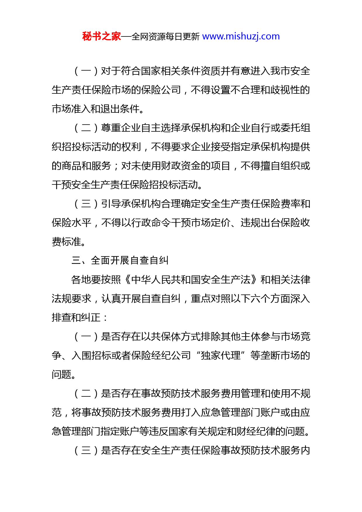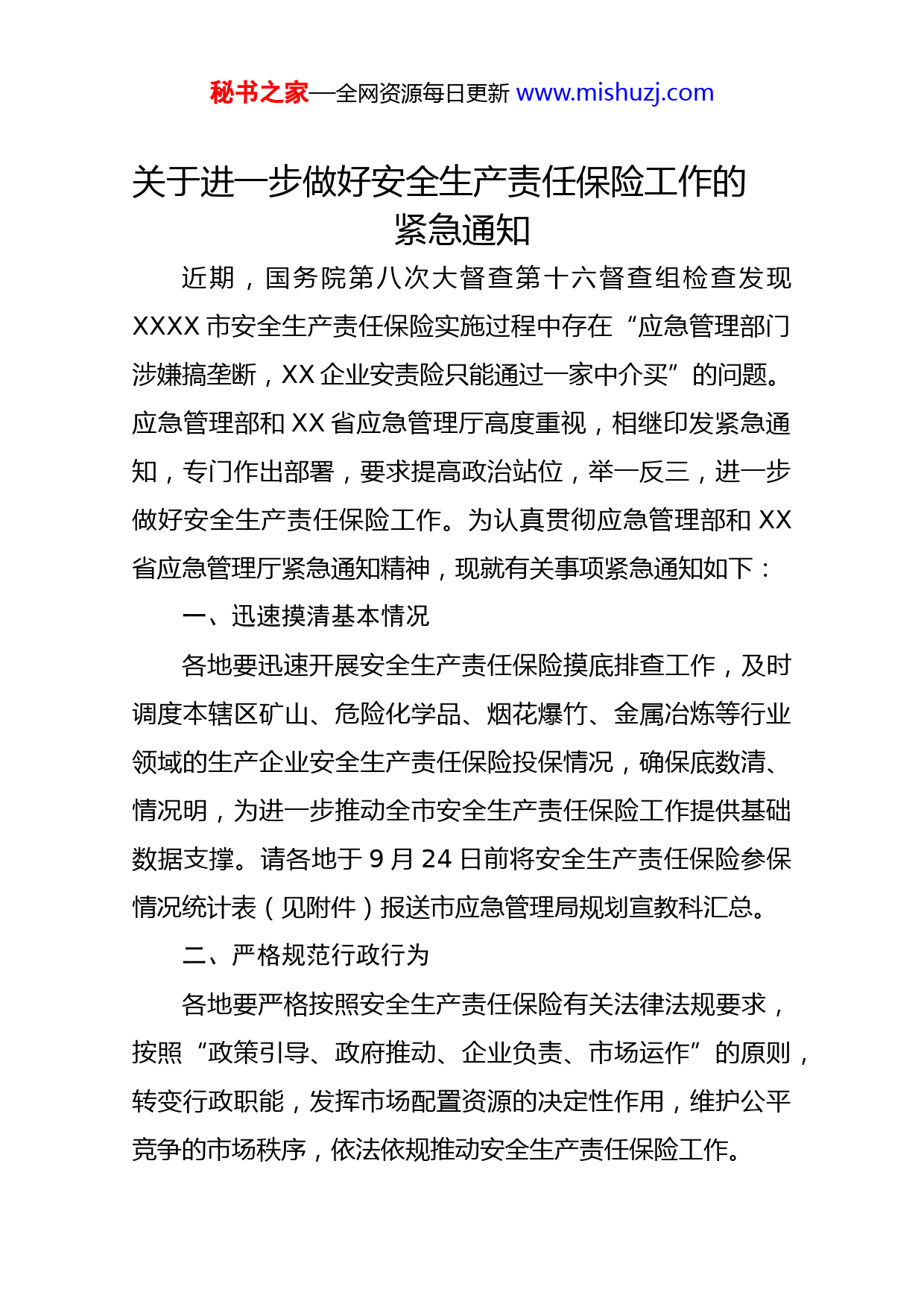 秘书之家—全网资源每日更新www.mishuzj.com关于进一步做好安全生产责任保险工作的紧急通知近期,国务院第八次大督查第十六督查组检查发现XXXX市安全生产责任保险实施过程中存在“应急管理部门涉嫌搞垄断,XX企业安责险只能通过一家中介买”的问题。应急管理部和XX省应急管理厅高度重视,相继印发紧急通知,专门作出部署,要求提高政治站位,举一反三,进一步做好安全生产责任保险工作。为认真贯彻应急管理部和XX省应急管理厅紧急通知精神,现就有关事项紧急通知如下:一、迅速摸清基本情况各地要迅速开展安全生产责任保险摸底排查工作,及时调度本辖区矿山、危险化学品、烟花爆竹、金属冶炼等行业领域的生产企业安全生产责任保险投保情况,确保底数清、情况明,为进一步推动全市安全生产责任保险工作提供基础数据支撑。请各地于9月24日前将安全生产责任保险参保情况统计表(见附件)报送市应急管理局规划宣教科汇总。二、严格规范行政行为各地要严格按照安全生产责任保险有关法律法规要求,按照“政策引导、政府推动、企业负责、市场运作”的原则,转变行政职能,发挥市场配置资源的决定性作用,维护公平竞争的市场秩序,依法依规推动安全生产责任保险工作。秘书之家—全网资源每日更新www.mishuzj.com(一)对于符合国家相关条件资质并有意进入我市安全生产责任保险市场的保险公司,不得设置不合理和歧视性的市场准入和退出条件。(二)尊重企业自主选择承保机构和企业自行或委托组织招投标活动的权利,不得要求企业接受指定承保机构提供的商品和服务;对未使用财政资金的项目,不得擅自组织或干预安全生产责任保险招投标活动。(三)引导承保机构合理确定安全生产责任保险费率和保险水平,不得以行政命令干预市场定价、违规出台保险收费标准。三、全面开展自查自纠各地要按照《中华人民共和国安全生产法》和相关法律法规要求,认真开展自查自纠,重点对照以下六个方面深入排查和纠正:(一)是否存在以共保体方式排除其他主体参与市场竞争、入围招标或者保险经纪公司“独家代理”等垄断市场的问题。(二)是否存在事故预防技术服务费用管理和使用不规范,将事故预防技术服务费用打入应急管理部门账户或由应急管理部门指定账户等违反国家有关规定和财经纪律的问题。(三)是否存在安全生产责任保险事故预防技术服务内秘书之家—全网资源每日更新www.mishuzj.com容缺失或者服务不到位、质量差的问题。(四)是否无法律依据将安全生产责任保险作为取得安全生产许可证前置条件的问题。(五)是否存在安全生产责任保险产品条款和费率厘定、保障范围、保险额度不合理,侵害生产经营单位及有关人员权益的问题。(六)是否违反安全生产责任保险有关规定,存在失职渎职、贪污腐败等违法违纪问题。四、严查违法违规行为各地对自查发现的问题,务必立行立改、坚决整改到位。对存在的违法违规行为,发现一起查处一起,绝不姑息迁就;同时要坚持以问题为导向、以强化服务功能为目标,加快健全完善规章制度。(一)对涉嫌违反《中华人民共和国反垄断法》规定,存在安全生产责任保险垄断经营行为的,要及时移送市场监管部门立案查处。(二)对无法律依据将企业投保安全生产责任保险作为取得安全生产许可证前置条件的要坚决取消。(三)对存在事故预防技术服务费用管理和使用不规范,安全生产责任保险产品条款和费率厘定、保障范围、保险额度不合理等问题的,要组织专家加大监督检查力度,及时纠秘书之家—全网资源每日更新www.mishuzj.com正,依法依规严格规范。(四)加强对安全生产责任保险实施情况的监督,对保险机构弄虚作假,预防费用投入不足、未履行事故预防责任、委托不合法的社会化服务机构开展事故预防工作的,要严格查处、责令整改,对拒不整改的,将其纳入安全生产领域联合惩戒“黑名单”管理,并向社会公开;对违反相关法律法规规定的,要会同有关部门依法追究法律责任。(五)对在安全生产责任保险制度实施过程中存在的领导干部违规插手干预项目实施、权钱交易、“利益输送”等腐败问题线索,要及时移交纪检监察和司法机关,确保一查到底、以案促改。五、加大工作推动力度各地要强化安全生产责任保险工作的推动落实,细化工作方案,明确职责分工,健全工作机制,充分发挥安全生产责任保险在事故预防等方面发挥的积极作用,有效防范各类安全事故。要贯彻落实新修订的《中华人民共和国安全生产法》,结合全市安全生产专项整治行动,强化责任落实,细化配套措施,科学制定实施方案,真正将安全生产责任保险制度转化为保障和维护企业合法权益、提升企业安全生产能力的有力支持政策。要迅速行动,会同有关部门开展专项检查,发现问题及时整改,做到举一反三,规范安全生产责任秘书之家—全网资源每日更新www.mishuzj.com保险制度落实各环节行为。要健全内部管理制度,堵塞执行过程中的各种漏洞,严守廉洁自律各项规定,依法行政,切实维护生产经营单位及其相关人员的合法权益。市应急管理局将适时组织开展安全生产责任保险工作督查调研。请各地于9月20日前将自查督查情况、取得的主要成效、采取的制度化措施和相关意见建议报送市应急管理局规划宣教科。