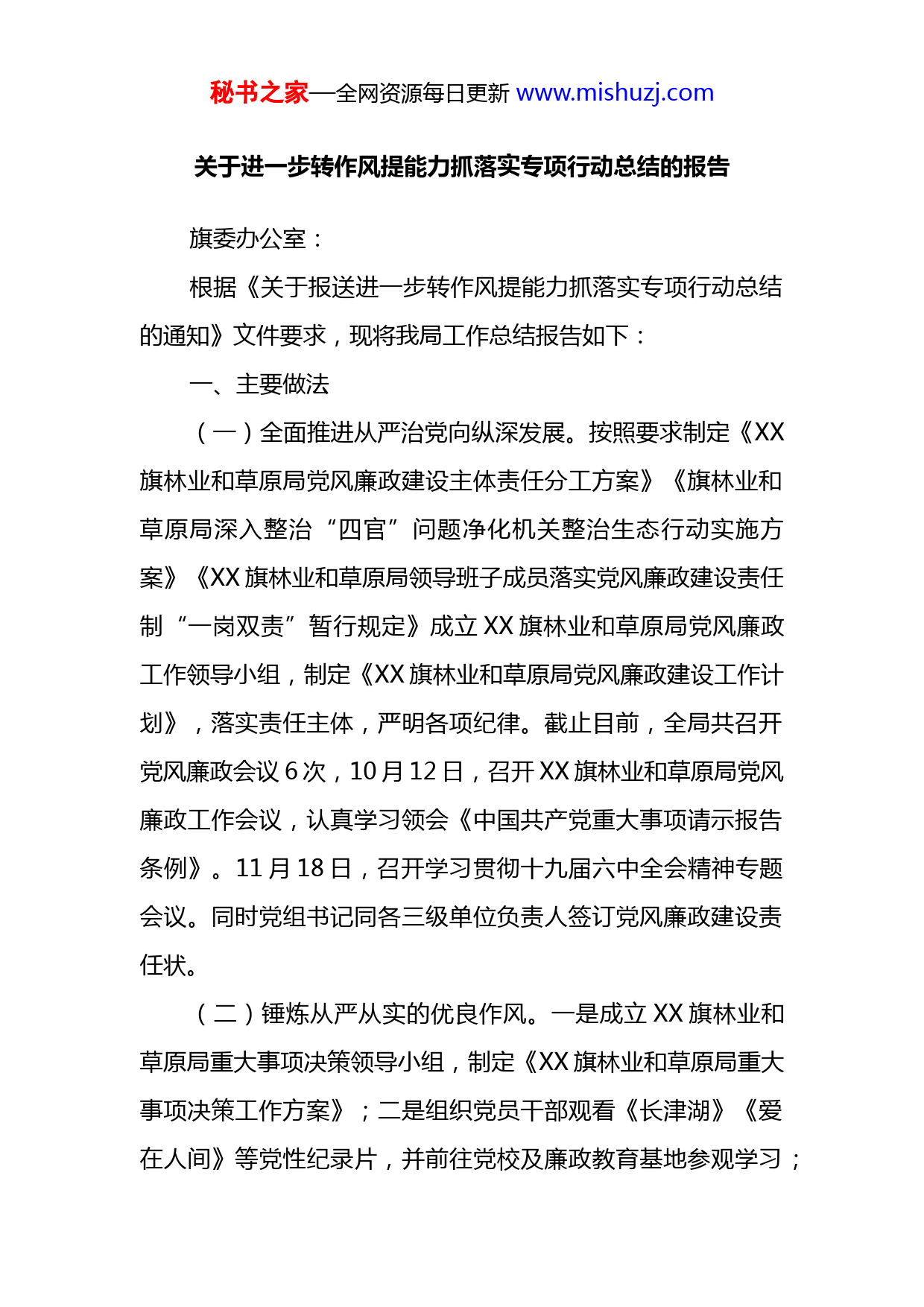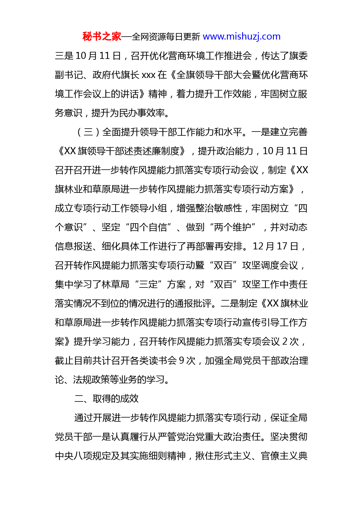 秘书之家—全网资源每日更新www.mishuzj.com关于进一步转作风提能力抓落实专项行动总结的报告旗委办公室:根据《关于报送进一步转作风提能力抓落实专项行动总结的通知》文件要求,现将我局工作总结报告如下:一、主要做法(一)全面推进从严治党向纵深发展。按照要求制定《XX旗林业和草原局党风廉政建设主体责任分工方案》《旗林业和草原局深入整治“四官”问题净化机关整治生态行动实施方案》《XX旗林业和草原局领导班子成员落实党风廉政建设责任制“一岗双责”暂行规定》成立XX旗林业和草原局党风廉政工作领导小组,制定《XX旗林业和草原局党风廉政建设工作计划》,落实责任主体,严明各项纪律。截止目前,全局共召开党风廉政会议6次,10月12日,召开XX旗林业和草原局党风廉政工作会议,认真学习领会《中国共产党重大事项请示报告条例》。11月18日,召开学习贯彻十九届六中全会精神专题会议。同时党组书记同各三级单位负责人签订党风廉政建设责任状。(二)锤炼从严从实的优良作风。一是成立XX旗林业和草原局重大事项决策领导小组,制定《XX旗林业和草原局重大事项决策工作方案》;二是组织党员干部观看《长津湖》《爱在人间》等党性纪录片,并前往党校及廉政教育基地参观学习;秘书之家—全网资源每日更新www.mishuzj.com三是10月11日,召开优化营商环境工作推进会,传达了旗委副书记、政府代旗长xxx在《全旗领导干部大会暨优化营商环境工作会议上的讲话》精神,着力提升工作效能,牢固树立服务意识,提升为民办事效率。(三)全面提升领导干部工作能力和水平。一是建立完善《XX旗领导干部述责述廉制度》,提升政治能力,10月11日召开召开进一步转作风提能力抓落实专项行动会议,制定《XX旗林业和草原局进一步转作风提能力抓落实专项行动方案》,成立专项行动工作领导小组,增强整治敏感性,牢固树立“四个意识”、坚定“四个自信”、做到“两个维护”,并对动态信息报送、细化具体工作进行了再部署再安排。12月17日,召开转作风提能力抓落实专项行动暨“双百”攻坚调度会议,集中学习了林草局“三定”方案,对“双百”攻坚工作中责任落实情况不到位的情况进行的通报批评。二是制定《XX旗林业和草原局进一步转作风提能力抓落实专项行动宣传引导工作方案》提升学习能力,召开转作风提能力抓落实专项会议2次,截止目前共计召开各类读书会9次,加强全局党员干部政治理论、法规政策等业务的学习。二、取得的成效通过开展进一步转作风提能力抓落实专项行动,保证全局党员干部一是认真履行从严管党治党重大政治责任。坚决贯彻中央八项规定及其实施细则精神,揪住形式主义、官僚主义典秘书之家—全网资源每日更新www.mishuzj.com型,特别是对不担当不作为慢作为的问题和干部坚决查处、严厉问责、形成威慑。二是严守党的政治纪律和政治规矩。坚决贯彻落实习近平总书记重要讲话重要指示批示精神和党中央决策部署,始终在思想上政治上行动上同以习近平同志为核心的党中央保持高度一致,做到令行禁止。三是提升政治能力。切实增强政治敏感性,善于从政治和全局的高度把握形势、分析问题、谋划工作,强化政治忠诚,牢固树立“四个意识”、坚定“四个自信”、做到“两个维护”。四是着力提升工作效能。牢固树立服务意识、责任意识和效率意识,大力倡导“马上就办”的工作理念,在处置重大舆情、化解矛盾隐患、优化营商环境、改进政务服务、办理民生实事、服务项目企业等重点工作中,坚决克服和杜绝“庸懒散慢推脱绕”等不良作风,提升工作效能。三、存在问题及下步打算进一步转作风提能力抓落实专项行动开展以来,我局工作取得了一定的成绩,从总体上看,在转作风提能力抓落实上做到了有组织领导、有责任规范、有制度措施,工作内容到位、工作措施到位、工作效果到位。但是,我们也清醒地看到,转作风提能力抓落实工作是一项繁重而长期的工程,任何时候都不能有丝毫的松懈。经过自查和总结,公.文思.享文.库出.品,也发现在工作上仍存在一些不足。一是落实全面从严治党主体责任不到位。班子专题研究党建和党风廉政建设的会议少,谋秘书之家—全网资源每日更新www.mishuzj.com划部署贯彻落实上级全面从严治党精神力度不够。二是“一岗双责”落实不够到位。在日常工作中,虽然能够认真履行“一岗双责”,但在落实督促检查上做的工作还有所欠缺,一些领域廉洁风险较高,不正之风和消极腐败现象时有发生,党风廉政建设和反腐败斗争形势依然严峻复杂。针对工作中存在的薄弱环节和不足,下一步在转作风提能力抓落实工作上,我们要着重抓好以下二个方面的工作:一是进一步完善转作风提能力抓落实工作责任制,健全组织,落实制度,明确责任,抓好基础,坚持从我做起、从现在做起,在林草系统创造和维护党风廉政建设和反腐倡廉的良好环境。二是坚持不懈地抓好学习教育,深化提高全体党员干部对转作风提能力抓落实工作的认识,确保整个林草队伍的长期纯洁,为全旗经济社会发展提供强有力的支持。
