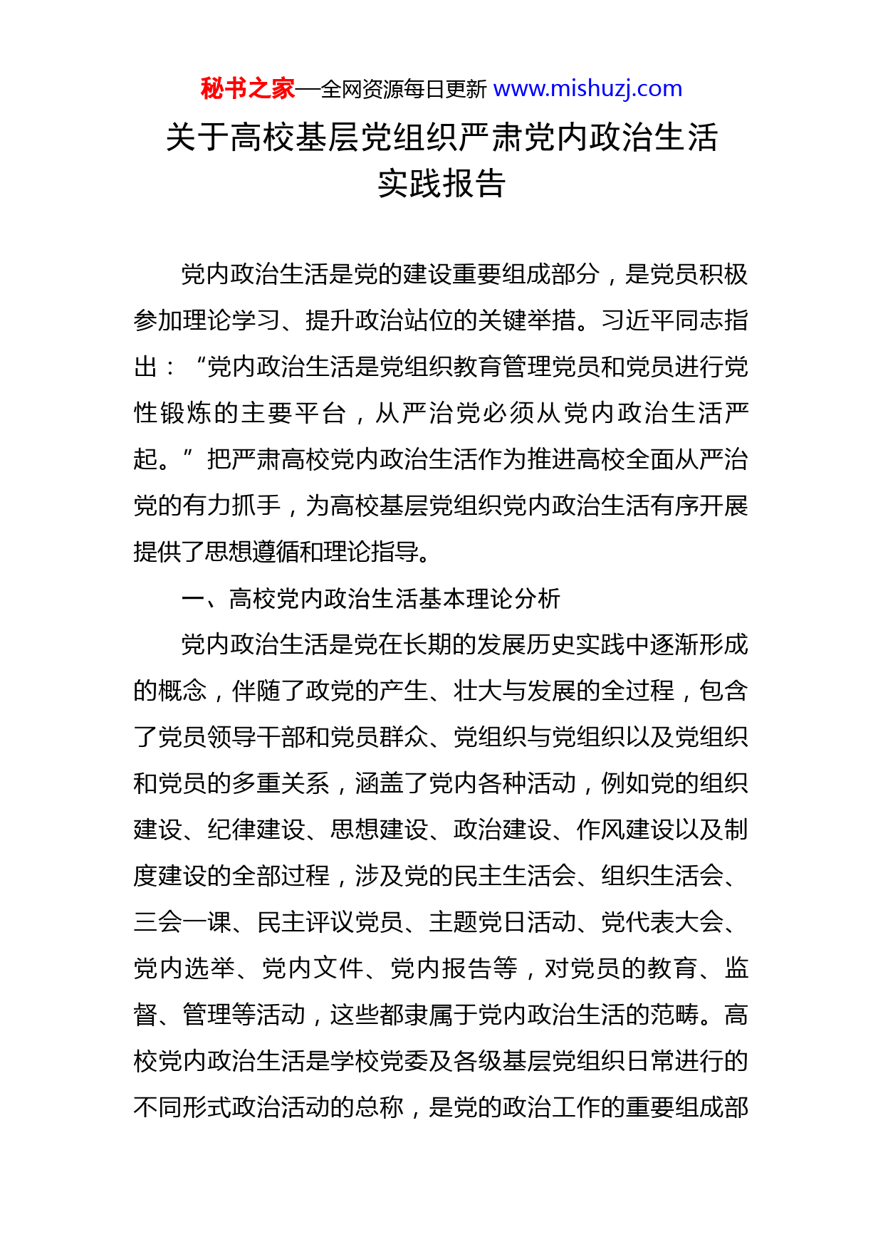 秘书之家—全网资源每日更新www.mishuzj.com关于高校基层党组织严肃党内政治生活实践报告党内政治生活是党的建设重要组成部分,是党员积极参加理论学习、提升政治站位的关键举措。习近平同志指出:“党内政治生活是党组织教育管理党员和党员进行党性锻炼的主要平台,从严治党必须从党内政治生活严起。”把严肃高校党内政治生活作为推进高校全面从严治党的有力抓手,为高校基层党组织党内政治生活有序开展提供了思想遵循和理论指导。一、高校党内政治生活基本理论分析党内政治生活是党在长期的发展历史实践中逐渐形成的概念,伴随了政党的产生、壮大与发展的全过程,包含了党员领导干部和党员群众、党组织与党组织以及党组织和党员的多重关系,涵盖了党内各种活动,例如党的组织建设、纪律建设、思想建设、政治建设、作风建设以及制度建设的全部过程,涉及党的民主生活会、组织生活会、三会一课、民主评议党员、主题党日活动、党代表大会、党内选举、党内文件、党内报告等,对党员的教育、监督、管理等活动,这些都隶属于党内政治生活的范畴。高校党内政治生活是学校党委及各级基层党组织日常进行的不同形式政治活动的总称,是党的政治工作的重要组成部秘书之家—全网资源每日更新www.mishuzj.com分,也是锤炼党员党性、党组织教育管理党员的重要载体。二、高校基层党组织严肃党内政治生活的重要意义(一)规范高校党内政治生活是净化政治生态的关键措施高校基层党组织党内政治生活是否严肃、组织生活制度落实是否严格、“三会一课”制度是否规范、主题党日活动形式是否多样、谈心谈话、民主评议党员制度执行是否到位、高校党委对下级党组织选人用人监督指导是否到位、选人用人导向是否存在偏差、干部选拔任用制度执行是否严格、干部监督管理是否规范等问题,严重制约着高校党的政治建设、纪律建设、作风建设的好坏。因此,高校基层党组织要严肃党内政治生活,扩大高校党内政治生活的辐射力量,推进高校理想信念教育常态化、党内文化建设系统化、党员干部队伍管理科学化,夯实高校党内政治生活的政治根基,完善党内民主制度,规范开展党内各项活动,营造良好政治生态。(二)严肃高校党内政治生活是解决党内矛盾的“金钥匙”高校处在意识形态工作的前沿阵地,必须以政治建设为统领,把开展严肃规范的党内政治生活视为化解高校党内矛盾最基本、最直接、最有效的政治抓手,坚持社会主秘书之家—全网资源每日更新www.mishuzj.com义办学方向,把政治建设落实到党的建设和党的各项事业发展中,加强党的作风建设,在党管意识形态上求实效。牢牢掌握党对高校工作的领导权,探索党实现长期稳固执政的有效路径,把握从严治党管党的力度和速度,把敢管敢治、严管严治、长管长治贯穿到高校基层党组织的党建工作,解决党建工作面临的突出问题,确保高校基层党组织党内政治生活积极健康发展,形成整体联动、协调互动的党建新格局。三、高校基层党组织党内政治生活深层问题分析(一)高校基层党组织党内政治文化存在多重挑战高校党内政治文化是指高校师生党员长期实践形成的党内整体价值意识和共同认知,是全体党员要遵循的党内制度、政治信仰、行为习惯等因素的总称。党内政治文化的形成和影响是一个持续动态的过程,受数千年历史的封建官僚主义思想残余意识、人情社会思想宗法观念余毒、封建迷信思想影响等亚文化形态影响,稍有不慎,党群关系就会遭到割裂,就像一张“潜规则”温床污染社会风气,从而导致民众的不信任感。有的党员干部忘记了党性原则,把党和群众赋予的权利当作筹码,给多少钱办多少事、用多少权,把党内关系搞成了金钱关系。一旦高校存在正面文化引导缺失,党内形成不了正面激励的文化氛围,对党内干事创业的党员支持不够,使党员在难题面前秘书之家—全网资源每日更新www.mishuzj.com容易出现害怕出错、担责和畏缩不前,这样将会侵蚀党内政治文化健康发展,对党内政治生活质量造成损害。(二)高校基层党组织党内政治行为存在“内卷”现象党的十八大以来,党内政治生态趋势向好,“我们已经啃下了不少硬骨头但还有许多硬骨头要啃,我们攻克了不少难关但还有许多难关要攻克”。但是官僚主义、形式主义问题依然没有得到彻底的解决。党的十九大之后,压实各级党组织的主体责任,全面从严治党,大力整治“四风”变异行为,有效遏制了形式主义与官僚主义问题的蔓延。伴随着时代的发展,目前,个别高校基层党组织在日常工作中出现工作落实形式化、简单问题复杂化、检查考核痕迹化等“内卷”现象,这种“内卷”现象属于官僚主义、形式主义的全新表现形式,是一种非理性内部竞争的行为失范问题。有的党员干部“‘耍官威’,降低了人民群众的满意度,主要不满的是其工作表现。‘耍官威’现象在现实生活中的表现是:‘脸难看’‘踢皮球’‘敷衍了事’‘平庸无为’‘唯上唯下’‘八面玲珑’”等。个别干部接到上级任务往外推,推卸相关责任,不作为、不担当,在群众面前各种推诿拖延,不办实事,形成不良党内风气,使党群关系遭到破坏。(三)高校基层党组织党内制度功能作用发挥受缚秘书之家—全网资源每日更新www.mishuzj.com党内法规是党内制