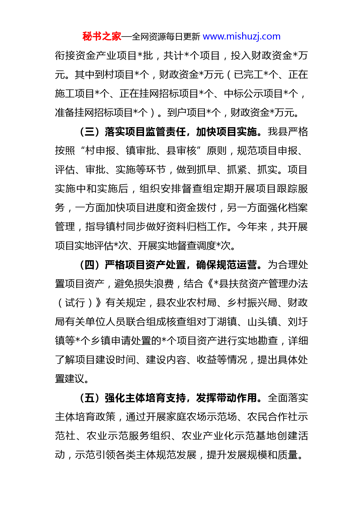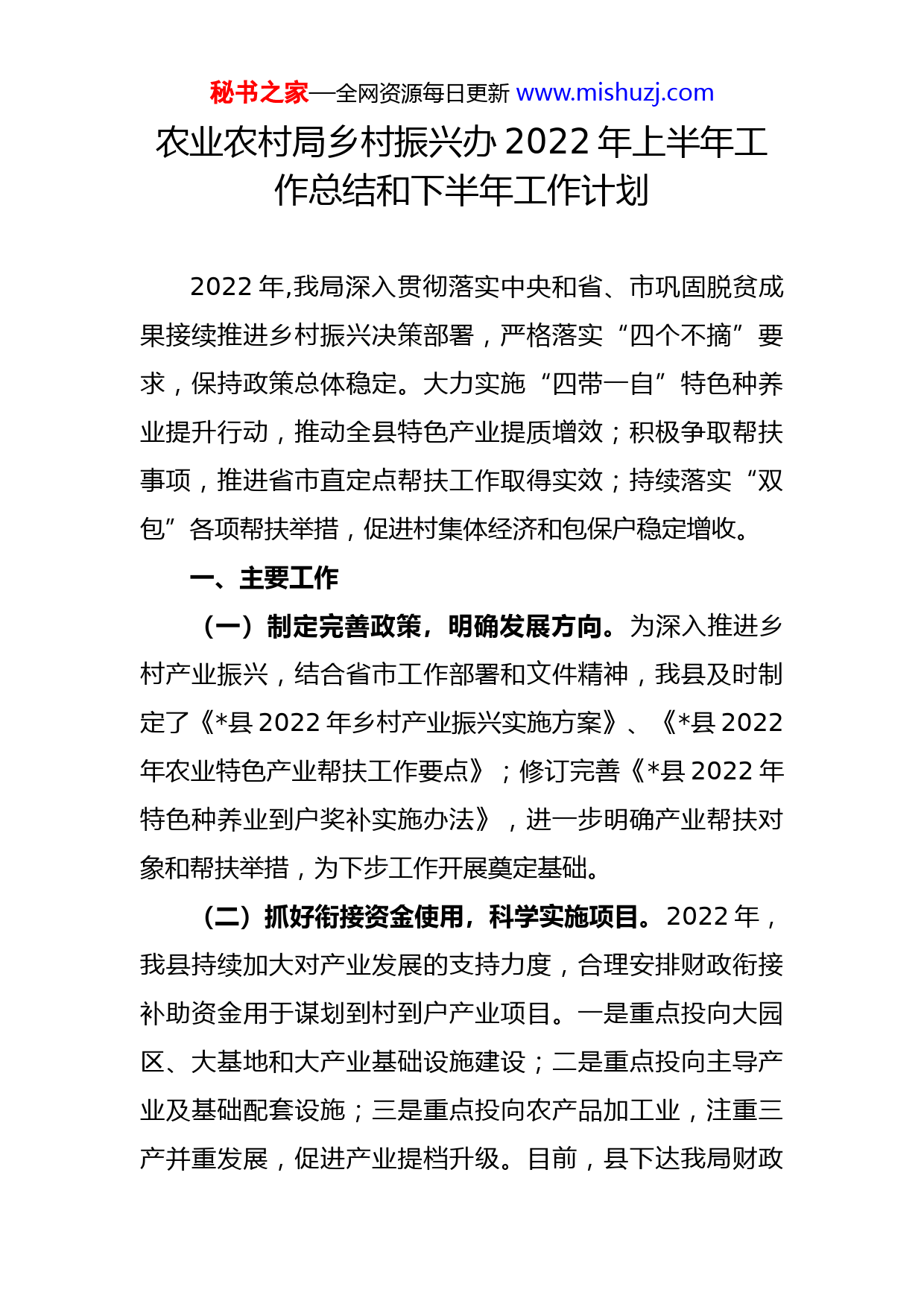 秘书之家—全网资源每日更新www.mishuzj.com农业农村局乡村振兴办2022年上半年工作总结和下半年工作计划2022年,我局深入贯彻落实中央和省、市巩固脱贫成果接续推进乡村振兴决策部署,严格落实“四个不摘”要求,保持政策总体稳定。大力实施“四带一自”特色种养业提升行动,推动全县特色产业提质增效;积极争取帮扶事项,推进省市直定点帮扶工作取得实效;持续落实“双包”各项帮扶举措,促进村集体经济和包保户稳定增收。一、主要工作(一)制定完善政策,明确发展方向。为深入推进乡村产业振兴,结合省市工作部署和文件精神,我县及时制定了《县2022年乡村产业振兴实施方案》、《县2022年农业特色产业帮扶工作要点》;修订完善《县2022年特色种养业到户奖补实施办法》,进一步明确产业帮扶对象和帮扶举措,为下步工作开展奠定基础。(二)抓好衔接资金使用,科学实施项目。2022年,我县持续加大对产业发展的支持力度,合理安排财政衔接补助资金用于谋划到村到户产业项目。一是重点投向大园区、大基地和大产业基础设施建设;二是重点投向主导产业及基础配套设施;三是重点投向农产品加工业,注重三产并重发展,促进产业提档升级。目前,县下达我局财政秘书之家—全网资源每日更新www.mishuzj.com衔接资金产业项目批,共计个项目,投入财政资金万元。其中到村项目个,财政资金万元(已完工个、正在施工项目个、正在挂网招标项目个、中标公示项目个,准备挂网招标项目个)。到户项目个,财政资金万元。(三)落实项目监管责任,加快项目实施。我县严格按照“村申报、镇审批、县审核”原则,规范项目申报、评估、审批、实施等环节,做到抓早、抓紧、抓实。项目实施中和实施后,组织安排督查组定期开展项目跟踪服务,一方面加快项目进度和资金拨付,另一方面强化档案管理,指导镇村同步做好资料归档工作。今年来,共开展项目实地评估次、开展实地督查调度次。(四)严格项目资产处置,确保规范运营。为合理处置项目资产,避免损失浪费,结合《县扶贫资产管理办法(试行)》有关规定,县农业农村局、乡村振兴局、财政局有关单位人员联合组成核查组对丁湖镇、山头镇、刘圩镇等个乡镇申请处置的个项目资产进行实地勘查,详细了解项目建设时间、建设内容、收益等情况,提出具体处置建议。(五)强化主体培育支持,发挥带动作用。全面落实主体培育政策,通过开展家庭农场示范场、农民合作社示范社、农业示范服务组织、农业产业化示范基地创建活动,示范引领各类主体规范发展,提升发展规模和质量。秘书之家—全网资源每日更新www.mishuzj.com目前全县已拥有省市级农业产业化龙头企业余家,合作社多个,家庭农场多家。全面落实主体带动支持政策,大力推广订单生产、务工就业、土地流转、入股分红等紧密型利益联结方式,增强主体带动能力和带动意愿。今年我县投资万元,用于奖励从事秸秆利用产业的经营主体,其中联农带农效果显著的主体优先。目前,全县新型农业经营主体通过订单、务工、土地流转等紧密型利益联结方式带动脱贫户户。(六)完善整改长效机制,加快工作推进。持续推进中央脱贫攻坚专项巡视反馈问题和中央脱贫攻坚专项巡视“回头看”反馈问题整改,及时更新措施及成效,健全完善工作长效机制。结合今年工作实际,合理制定2022年巩固拓展脱贫攻坚成果同乡村振兴有效衔接考核评估问题整改措施、2022年国家考核评估和省自查问题整改措施,以整改促进工作高效推进。(七)持续开展“双包”帮扶,巩固脱贫成果。通过调研分析,掌握包保的黄圩镇东北村、曹场村,大路口镇皇姑村村情民意,积极帮助谋划产业项目。及时下发《关于做好帮扶干部入户走访工作的通知》,制作入户走访情况统计表,安排帮扶人员入户开展疫情防控政策和午季秸秆禁烧工作宣传,协助户下做好环境卫生工作,同时详细秘书之家—全网资源每日更新www.mishuzj.com掌握户下疫苗接种、家庭收入、外出人员等情况,注重解决户下难题。(八)做好定点帮扶工作,确保得到支持。加强与省厅、市局帮扶人员的联络,不定期召开帮扶事项讨论会商会议,根据帮扶村实际需求,研究提出年度帮扶支持事项,加强省厅、市局沟通协调,共同推进定点帮扶工作。近期已提出年度帮扶支持事项意见。二、下半年计划(一)强化项目督查调度。一是通过实地督查、周报表,实时掌握项目动态,督促项目镇加快项目进度。指导项目镇安排专人持续跟踪督促,经常性深入实地开展项目督查,找出施工过程中的堵点和难点,协助施工方及时解决项目实施过程中遇到的问题,加快重点项目进程。二是严格实行倒排工期。根据项目实际进展和项目倒排工期表开展月调度,形成督查情况汇报并在全县会议上进行通报,进一步提高项目镇重视程度,强力推进项目建设和资金支出。(二)深入实施“四带一自”特色种养业提升工程。按照市农业特色产业园区建设标准,抓好个农业特色产业园区建设。持续推进个脱贫村“一村一品”建设,圆满完成各项目标任务。充分发挥产业发展指导员、农技人员作用,加强自种自养脱贫户技术培训或技术指导。秘书之家—全网资源每日更新www.mishuzj.com(三)加强产销体系建设。一是大力推进农产品品牌建设。积极开展“三品一标”认证,申报知名商标、著名商标、省名
