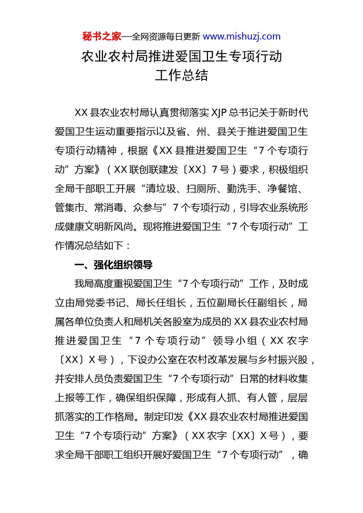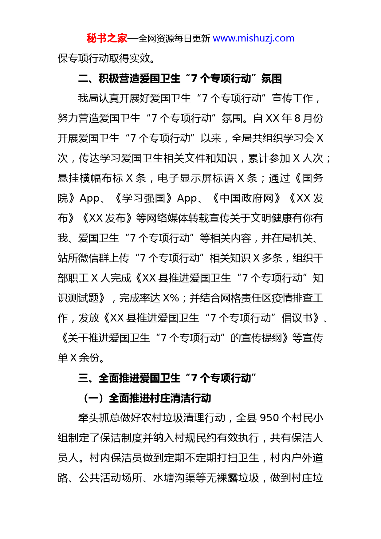 秘书之家—全网资源每日更新www.mishuzj.com农业农村局推进爱国卫生专项行动工作总结XX县农业农村局认真贯彻落实XJP总书记关于新时代爱国卫生运动重要指示以及省、州、县关于推进爱国卫生专项行动精神,根据《XX县推进爱国卫生“7个专项行动”方案》(XX联创联建发〔XX〕7号)要求,积极组织全局干部职工开展“清垃圾、扫厕所、勤洗手、净餐馆、管集市、常消毒、众参与”7个专项行动,引导农业系统形成健康文明新风尚。现将推进爱国卫生“7个专项行动”工作情况总结如下:一、强化组织领导我局高度重视爱国卫生“7个专项行动”工作,及时成立由局党委书记、局长任组长,五位副局长任副组长,局属各单位负责人和局机关各股室为成员的XX县农业农村局推进爱国卫生“7个专项行动”领导小组(XX农字〔XX〕X号),下设办公室在农村改革发展与乡村振兴股,并安排人员负责爱国卫生“7个专项行动”日常的材料收集上报等工作,确保组织保障,形成有人抓、有人管,层层抓落实的工作格局。制定印发《XX县农业农村局推进爱国卫生“7个专项行动”方案》(XX农字〔XX〕X号),要求全局干部职工组织开展好爱国卫生“7个专项行动”,确秘书之家—全网资源每日更新www.mishuzj.com保专项行动取得实效。二、积极营造爱国卫生“7个专项行动”氛围我局认真开展好爱国卫生“7个专项行动”宣传工作,努力营造爱国卫生“7个专项行动”氛围。自XX年8月份开展爱国卫生“7个专项行动”以来,全局共组织学习会X次,传达学习爱国卫生相关文件和知识,累计参加X人次;悬挂横幅布标X条,电子显示屏标语X条;通过《国务院》App、《学习强国》App、《中国政府网》《XX发布》《XX发布》等网络媒体转载宣传关于文明健康有你有我、爱国卫生“7个专项行动”等相关内容,并在局机关、站所微信群上传“7个专项行动”相关知识X多条,组织干部职工X人完成《XX县推进爱国卫生“7个专项行动”知识测试题》,完成率达X%;并结合网格责任区疫情排查工作,发放《XX县推进爱国卫生“7个专项行动”倡议书》、《关于推进爱国卫生“7个专项行动”的宣传提纲》等宣传单X余份。三、全面推进爱国卫生“7个专项行动”(一)全面推进村庄清洁行动牵头抓总做好农村垃圾清理行动,全县950个村民小组制定了保洁制度并纳入村规民约有效执行,共有保洁人员人。村内保洁员做到定期不定期打扫卫生,村内户外道路、公共活动场所、水塘沟渠等无裸露垃圾,做到村庄垃秘书之家—全网资源每日更新www.mishuzj.com圾有人清扫、有人清运,不乱堆乱放,环境干净整洁,形成了常态化保洁。结合创建国家卫生县城、美丽县城、爱国卫生专项运动,加强宣传活动,动员群众积极参与,目前,已消除村庄裸露垃圾X处约X吨,投入挖机X台、装载机X台、拖拉机1辆、推车1辆,垃圾运输车X辆,人员X人,资金X元。XX年7月—12月底,全县X个行政村(社区)共清理农村生活垃圾X吨、清理村内水塘数量X个、清理村内沟渠数量X公里、清理村内淤泥数量X吨、清理残垣断壁X处、清理畜禽养殖粪污等农业生产废弃物X吨、开展进村入户宣传教育X场次、发放宣传资料X份、张贴宣传标语X条、发动农民群众投工投劳X万人次。(二)加大力度推进“扫厕所”专项行动一是强化局机关、站所卫生间保洁。全局机关、站所共有卫生间35间,全部已达到“三无三有”标准(无粪便、无臭味、地面无水渍,有手纸、有洗手液、有香薫),配备有卷纸、洁厕液、香薰、洗手液。每天安排人员进行清扫,上班期间个人如厕自觉保持干净,做到无异味。建立卫生保洁制度,将制度上墙,同时粘贴节水标识。认真落实厕所保洁、消毒和日常维护。二是全面消除旱厕。按照爱国卫生“7个专项”行动要求,经过详细排查,我局环境卫生网格区有三座旱厕,截至XX年12月30日,已拆除XX往路两侧网格区旱厕2座、曼打傣村民小组旱厕1座、秘书之家—全网资源每日更新www.mishuzj.com甘蔗站基地旱厕1座,达到城镇旱厕全面消除。三是行政村公厕提质达标。截至XX年12月30日,全县X个行政村村委会所在地无害化卫生公厕达标X座,未达标X座正在抓紧施工中,2021年1月10日前可完工。公共厕所标识、管理制度、保洁制度等已完成上墙。X座公厕已达到“三净两无一明”标准。2座在建行政村村委会所在地公厕待改建完成后按照“三净两无一明”标准执行。全县X个乡镇X座达标公厕的行政村已完成村规民约修订完善工作,将农村公厕保洁、设施设备管理维护等纳入村规民约。下一步,待未达标的2座公厕改建完成后,将及时把农村公厕保洁、设施设备管理维护等纳入村规民约。(三)严格管控市场活禽屠宰点认真做好市场活禽屠宰点管控工作,目前,XX县城区有农贸市场活禽屠宰点12户,其中宏福农贸市场6户,双合农贸市场3户,景龙农贸市场1户,其他农贸市场2户。根据《XX省农贸市场环境卫生全提升行动工作规范和标准》,现已经完成活禽宰杀“三隔离”改造,具备屠宰加工能力。改造后家禽类在全封闭式的场所宰杀,宰杀场地保持无污垢、残留垃圾和杂物等。(四)完善洗手设施,营造勤洗手好氛围按照室内公共场所洗手设施全配套且配置管理标准化,积极改建和新建洗手配套设施,粘贴“勤洗手”、“七步秘书之家—全网资源每日更新www.mishuzj.com洗手法”等宣传牌,配有洗手液、消毒液和空气清新剂,引