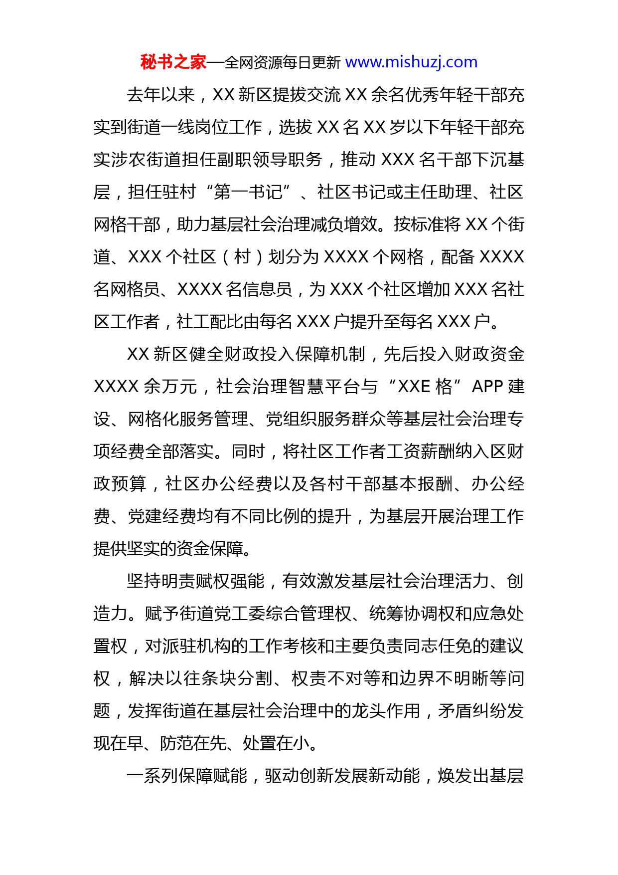 秘书之家—全网资源每日更新www.mishuzj.com创建“两先区”推动区域振兴工作情况汇报基层社会治理事关振兴发展全局。没有高效能的基层社会治理,就不可能有高质量的发展。作为我国第X个、XX第X个国家级新区,XXXX新区党工委立足增进民生福祉,聚焦提质增效,奋力开创具有时代特征、区域特色的基层社会治理新路子。以治理模式创新、治理方式重塑、治理体系重构为核心,通过保障赋能、数字赋能、机制赋能,着力解决基层社会治理领域突出问题,把“问题清单”变成满足市民需求的“幸福账单”,不断增强人民群众的获得感、幸福感、安全感。以基层社会治理体系和治理能力现代化,夯实建设“XX第一强区、全国一流新区”的基石,在XX建设新时代“两先区”(产业结构优化的先导区和经济社会发展的先行区)、勇当XX振兴“跳高队”的使命中挑大梁、当先锋、作表率。一、重心下移构建“减上补下”保障格局社会治理重在基层。XX新区党工委牢固树立强基导向,把抓基层、打基础作为长远之计和固本之举,坚持重心下移、力量下沉、资源下投,让基层“有人干事、有钱办事、有地做事”,解决好基层的愁心事、难心事、烦心事。秘书之家—全网资源每日更新www.mishuzj.com去年以来,XX新区提拔交流XX余名优秀年轻干部充实到街道一线岗位工作,选拔XX名XX岁以下年轻干部充实涉农街道担任副职领导职务,推动XXX名干部下沉基层,担任驻村“第一书记”、社区书记或主任助理、社区网格干部,助力基层社会治理减负增效。按标准将XX个街道、XXX个社区(村)划分为XXXX个网格,配备XXXX名网格员、XXXX名信息员,为XXX个社区增加XXX名社区工作者,社工配比由每名XXX户提升至每名XXX户。XX新区健全财政投入保障机制,先后投入财政资金XXXX余万元,社会治理智慧平台与“XXE格”APP建设、网格化服务管理、党组织服务群众等基层社会治理专项经费全部落实。同时,将社区工作者工资薪酬纳入区财政预算,社区办公经费以及各村干部基本报酬、办公经费、党建经费均有不同比例的提升,为基层开展治理工作提供坚实的资金保障。坚持明责赋权强能,有效激发基层社会治理活力、创造力。赋予街道党工委综合管理权、统筹协调权和应急处置权,对派驻机构的工作考核和主要负责同志任免的建议权,解决以往条块分割、权责不对等和边界不明晰等问题,发挥街道在基层社会治理中的龙头作用,矛盾纠纷发现在早、防范在先、处置在小。一系列保障赋能,驱动创新发展新动能,焕发出基层秘书之家—全网资源每日更新www.mishuzj.com社会治理新活力。在持续开展的“一街道一特色、一社区一品牌”基层治理品牌创建活动中,二十里堡街道二十里村精心打造出老有所养、老有所依、老有所乐的宜居环境。“半山村晚”直播、“情暖重阳”等成为品牌活动。近日,国家卫生健康委员会、全国老龄办命名全国XXX个社区为XXXX年全国示范性老年友好型社区,二十里村榜上有名。湾里街道和所属城志社区精准帮扶各类群体,专注提升群众幸福指数,在第二届“新时代·中国美丽城市、美丽乡村巡礼”评选中,分别获得“新时代·中国最美幸福宜居街道”和“新时代·中国最美社区”,是辽宁省唯一获得“双料”殊荣的街道。二、数字赋能打造“指尖便民”数治模式城乡社区是基层社会治理现代化的前沿阵地。XX新区充分发挥国家级新区科技创新优势,坚持“数字赋能、智慧治理”,运用“互联网+”思维,结合“智慧城市”“城市大脑”建设,将大数据、区块链、物联网技术与网格员日常“巡格”工作紧密结合,搭建了“全科智慧网”“XX社区通”“XX民生综合服务平台”三大智慧治理平台,实现数字技术与基层社会治理深度融合。“全科智慧网”构建的报事吹哨、诉求反映、民意速达快捷通道,可以高效感知各类基层社会问题,并实现智辅决策、智能监管、智能服务和群众广泛参与,形成具有XX秘书之家—全网资源每日更新www.mishuzj.com特色的网格应用实践和智慧治理品牌。“XX社区通”的“自动收集、分层处置、全程记录、群众测评”问题跟踪系统,渗透到基层治理的各方面、各领域,实现群众需求导向的即时化、扁平化、智能化处理,畅通了党群之间的互动渠道,形成“一屏观天下,一网管全城”的便民服务格局,真正构建起“民呼我应”的基层社会治理新模式,实现从“身边”到“指尖”的服务“零距离”。目前,“XX社区通”注册用户已达XXX余万人,家庭覆盖率达XX%。去年以来,平台共发布各类公告、通知及便民服务信息等X万余条,累计阅读量XXXX万次,居民互动X万余条。“XX民生综合服务平台”智慧政务模块,置入居民申报端小程序、审批人员操作平台两个版块,提供公共服务和便民服务事项办理、智慧社区服务和数字化养老服务等业务,“指尖办、马上办、一次办、扫码办、可代办”集约高效的服务办理新模式,让居民需求极速送达,同时推动政务服务“一网通办”、社会治理“一网统管”、政府运行“一网协同”,实现村(居)民自治、共治,服务的数字化、网格化、智能化,推动社区治理精准化、便民服务精细化持续提高。平台全面运行以来,互动交流超过XXXX人次,事项办结率超过XX%,打造了“小事不出网格、大事不出社区”的闭环式管理云服务机制,实现了对秘书之家—全网资源每日更新www.mishuzj.
