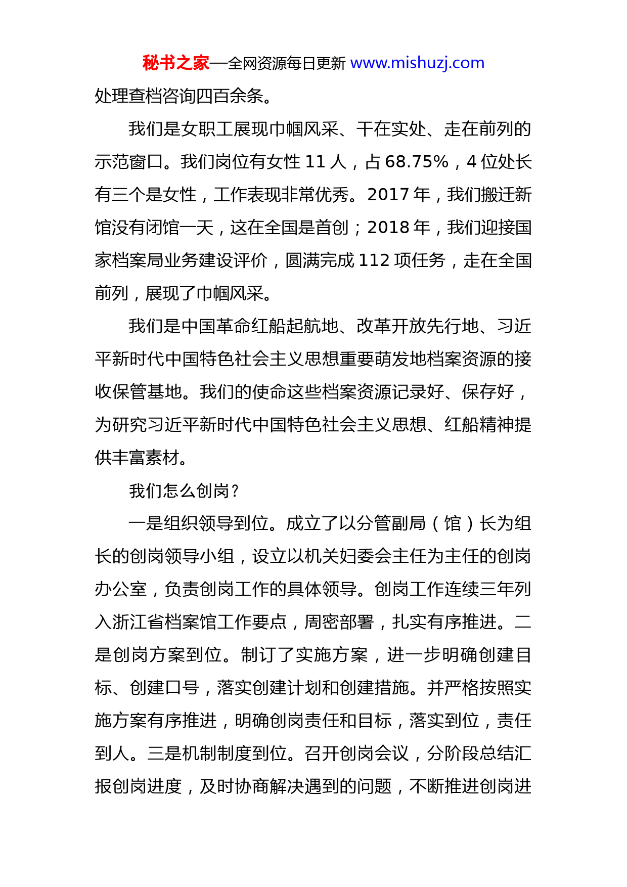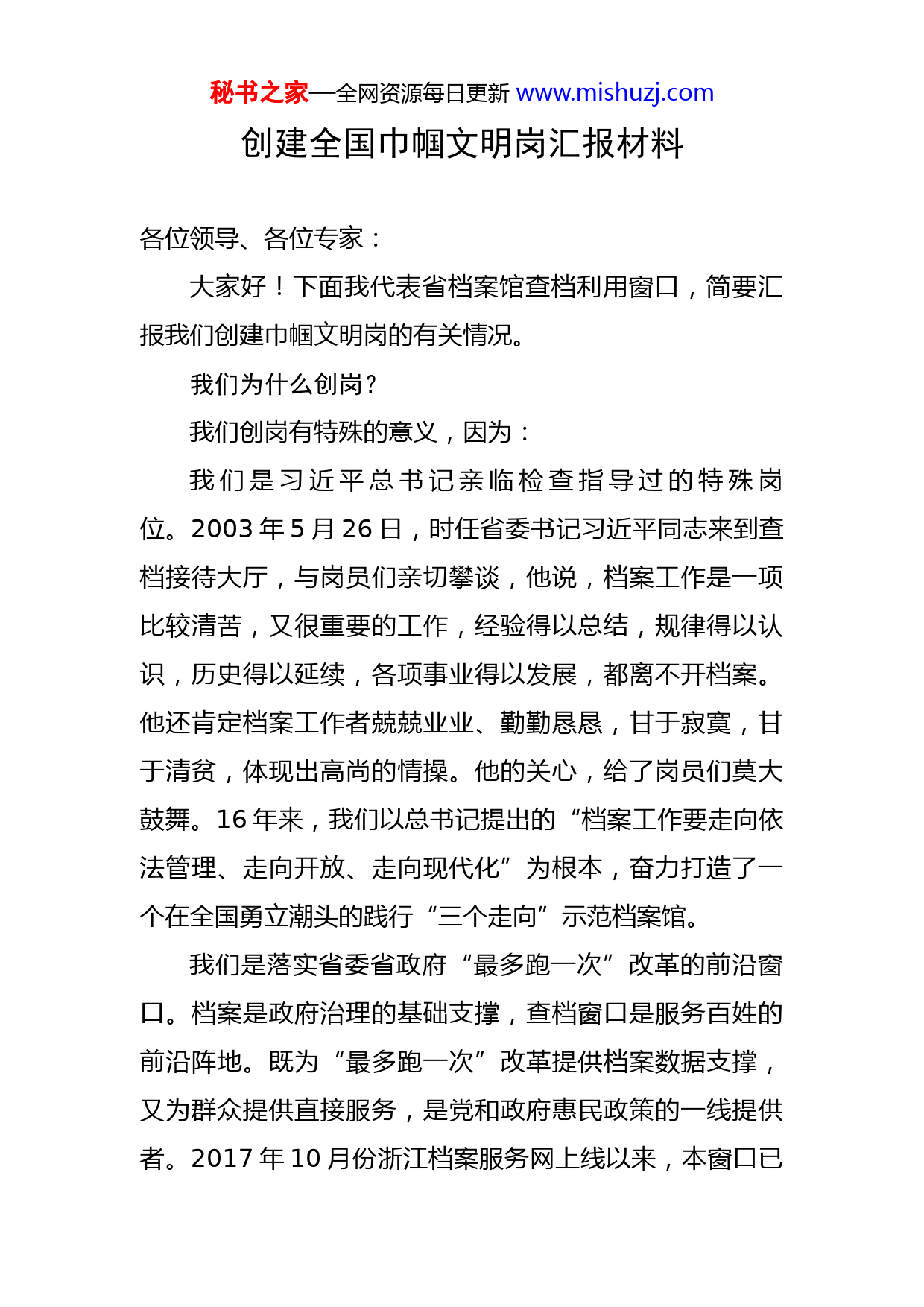 秘书之家—全网资源每日更新www.mishuzj.com创建全国巾帼文明岗汇报材料各位领导、各位专家:大家好!下面我代表省档案馆查档利用窗口,简要汇报我们创建巾帼文明岗的有关情况。我们为什么创岗?我们创岗有特殊的意义,因为:我们是习近平总书记亲临检查指导过的特殊岗位。2003年5月26日,时任省委书记习近平同志来到查档接待大厅,与岗员们亲切攀谈,他说,档案工作是一项比较清苦,又很重要的工作,经验得以总结,规律得以认识,历史得以延续,各项事业得以发展,都离不开档案。他还肯定档案工作者兢兢业业、勤勤恳恳,甘于寂寞,甘于清贫,体现出高尚的情操。他的关心,给了岗员们莫大鼓舞。16年来,我们以总书记提出的“档案工作要走向依法管理、走向开放、走向现代化”为根本,奋力打造了一个在全国勇立潮头的践行“三个走向”示范档案馆。我们是落实省委省政府“最多跑一次”改革的前沿窗口。档案是政府治理的基础支撑,查档窗口是服务百姓的前沿阵地。既为“最多跑一次”改革提供档案数据支撑,又为群众提供直接服务,是党和政府惠民政策的一线提供者。2017年10月份浙江档案服务网上线以来,本窗口已秘书之家—全网资源每日更新www.mishuzj.com处理查档咨询四百余条。我们是女职工展现巾帼风采、干在实处、走在前列的示范窗口。我们岗位有女性11人,占68.75%,4位处长有三个是女性,工作表现非常优秀。2017年,我们搬迁新馆没有闭馆一天,这在全国是首创;2018年,我们迎接国家档案局业务建设评价,圆满完成112项任务,走在全国前列,展现了巾帼风采。我们是中国革命红船起航地、改革开放先行地、习近平新时代中国特色社会主义思想重要萌发地档案资源的接收保管基地。我们的使命这些档案资源记录好、保存好,为研究习近平新时代中国特色社会主义思想、红船精神提供丰富素材。我们怎么创岗?一是组织领导到位。成立了以分管副局(馆)长为组长的创岗领导小组,设立以机关妇委会主任为主任的创岗办公室,负责创岗工作的具体领导。创岗工作连续三年列入浙江省档案馆工作要点,周密部署,扎实有序推进。二是创岗方案到位。制订了实施方案,进一步明确创建目标、创建口号,落实创建计划和创建措施。并严格按照实施方案有序推进,明确创岗责任和目标,落实到位,责任到人。三是机制制度到位。召开创岗会议,分阶段总结汇报创岗进度,及时协商解决遇到的问题,不断推进创岗进秘书之家—全网资源每日更新www.mishuzj.com程。创建了电子台账、创岗网站,全方位展示创岗过程和成效,自官网专题运行以来共发布文章报道近两百篇。完善了各项规章制度,同时根据创岗要求制订了相关制度标准,切实提高了工作质量和工作效率。四是氛围营造到位。工作人员统一着装,统一佩戴党徽岗徽;设置创岗展示牌、每月服务之星展示牌等,还悬挂了查档须知、流程图、服务制度、服务承诺等,制作了带有争创标识的用户指南,粘贴争创标识,公开了争创口号、服务公约、监督电话等信息,主动接受监督,形成浓厚的创岗氛围。我们创岗有何特色?我们查档利用窗口独具特色,可概括为“四个岗”:直接服务于省委省政府各级机关的政治岗。紧紧围绕省委、省政府和省直机关单位的重点工作,为《浙江通志》编纂、干部档案审核等提供档案资料14万余卷件。像“五四宪法”历史资料陈列馆里有很多展品是我们提供的;像G20峰会我们也积极参与档案收集整理指导,获得省委、省政府表彰。同时,守牢政治和安全底线,不该出去的档案一字一页也不出去。直接提供广大人民群众查档利用的服务岗。优化简化流程,开辟多种查档方式,实行身份证一证通办。主动为用户提供查档线索,解决查档难题。积极参与社会公益活动,连续五年看望浙江康复中心聋哑儿童,资助贫困学秘书之家—全网资源每日更新www.mishuzj.com生,参与社区安全防护巡查。直接检验我们档案业务能力水平的专业岗。搭建“兰台小讲堂”人人为师,传授专业技能,举办开放鉴定培训、开展档案质量检查整改,实行师徒互帮互学,提高了专业能力,年均查档利用11万卷件次,实现“零差错”。直接顺应社会档案需求发生变化的创新岗。与时俱进,将查档服务延伸到资政、科研、教育等方面,由被动接收转向主动建档,开展方言档案、百年百镇百梦建档等;由被动接待转向主动服务,开展“异地查档、跨馆服务”,推出“一网查档、百馆联动”,让“数据多跑腿、百姓少跑路”;周末预约查档、周六志愿服务等都是全省率先开展,并且坚持中午值班十多年,推动档案服务更加优起来。创岗成效如何?提升了服务水平,创岗成为促进档案事业发展的动力引擎,社会效益显著。一是获得多项省级荣誉,连续八年获得先进集体、先进党支部等称号;二是助推事业发展,新接收档案43万卷(件),馆藏达132万卷(件),上了百万台阶。三是群众高度肯定,满30年档案全部完成开放鉴定,接待查档1.7万人次,收到表扬信和锦旗十余份。展现了巾帼风采,创岗成为提升干部专业能力的有力秘书之家—全网资源每日更新www.mishuzj.com抓手,人才效益突出。一人提拔为副处长,25人次获得各项先进;一人成为省直机关两个“浙江档案人职业精神楷模”之一。涌现出省“115”档案人才专家2名,副高级以上职称6名。最后,我要感谢省妇联和省直机关妇委会给我们