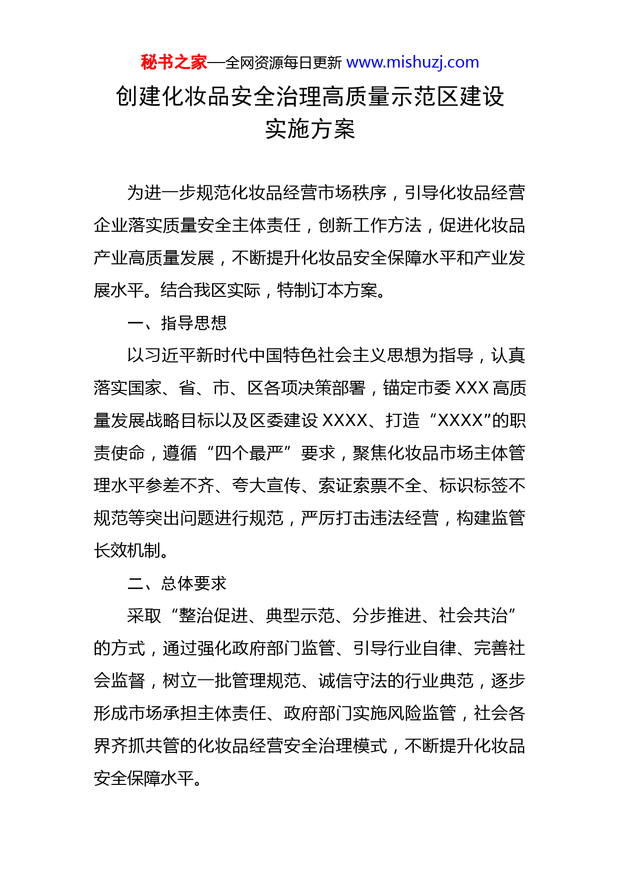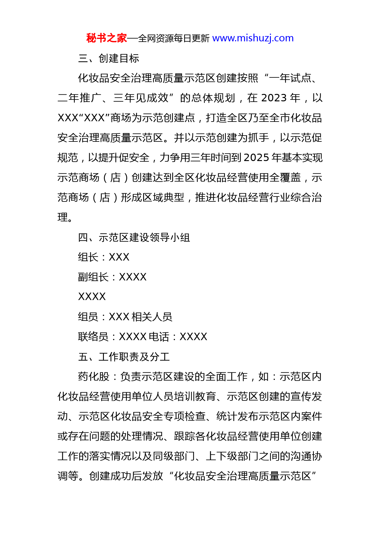 秘书之家—全网资源每日更新www.mishuzj.com创建化妆品安全治理高质量示范区建设实施方案为进一步规范化妆品经营市场秩序,引导化妆品经营企业落实质量安全主体责任,创新工作方法,促进化妆品产业高质量发展,不断提升化妆品安全保障水平和产业发展水平。结合我区实际,特制订本方案。一、指导思想以习近平新时代中国特色社会主义思想为指导,认真落实国家、省、市、区各项决策部署,锚定市委XXX高质量发展战略目标以及区委建设XXXX、打造“XXXX”的职责使命,遵循“四个最严”要求,聚焦化妆品市场主体管理水平参差不齐、夸大宣传、索证索票不全、标识标签不规范等突出问题进行规范,严厉打击违法经营,构建监管长效机制。二、总体要求采取“整治促进、典型示范、分步推进、社会共治”的方式,通过强化政府部门监管、引导行业自律、完善社会监督,树立一批管理规范、诚信守法的行业典范,逐步形成市场承担主体责任、政府部门实施风险监管,社会各界齐抓共管的化妆品经营安全治理模式,不断提升化妆品安全保障水平。秘书之家—全网资源每日更新www.mishuzj.com三、创建目标化妆品安全治理高质量示范区创建按照“一年试点、二年推广、三年见成效”的总体规划,在2023年,以XXX“XXX”商场为示范创建点,打造全区乃至全市化妆品安全治理高质量示范区。并以示范创建为抓手,以示范促规范,以提升促安全,力争用三年时间到2025年基本实现示范商场(店)创建达到全区化妆品经营使用全覆盖,示范商场(店)形成区域典型,推进化妆品经营行业综合治理。四、示范区建设领导小组组长:XXX副组长:XXXXXXXX组员:XXX相关人员联络员:XXXX电话:XXXX五、工作职责及分工药化股:负责示范区建设的全面工作,如:示范区内化妆品经营使用单位人员培训教育、示范区创建的宣传发动、示范区化妆品安全专项检查、统计发布示范区内案件或存在问题的处理情况、跟踪各化妆品经营使用单位创建工作的落实情况以及同级部门、上下级部门之间的沟通协调等。创建成功后发放“化妆品安全治理高质量示范区”秘书之家—全网资源每日更新www.mishuzj.com牌匾。医械股:负责协助药化股开展示范区建设的现场检查工作及周边药店化妆品创建工作的落实。执法大队:负责有关案件的处理及协助药化股开展化妆品示范区建设的现场检查、抽检。市监所:负责与示范区所在居委会及商场沟通,做好示范区内的宣传协调工作,并协助区局开展相关创建工作。网络交易与广告监管股:负责示范区内化妆品经营主体广告合法性检查督查。消费者权益保护股:负责消费维权站点设立及督查检查。六、示范区建设地点及建设标准经调研,决定以XXXXX“XXXX”商场为示范区创建点。包括所有经营使用化妆品的美容院、美发店、美甲店、专卖店、母婴用品店、酒店、药店、小超市及其他化妆品经营市场主体。(一)经营企业建设标准1.主体与环境:证照齐全,店容店貌整洁有序,仓储规范;2.产品合法性:企业所售化妆品100%已注册备案;企业所售化妆品100%索取相关许可证明文件、供货票据秘书之家—全网资源每日更新www.mishuzj.com并建立购进台账;3.标签与标识:化妆品的标签标识说明书内容真实规范合法,进口产品有中文标识;4.渠道与来源:建立购进验收台账,保存供应商证照及购货票据;5.广告与宣传:不虚假夸大宣传,无违法广告;6.消费放心:开展放心消费公开承诺,指导消费者正确使用“化妆品监管APP”查询产品合法性,第一时间获取所购化妆品的相关信息。建立产品售后服务、举报投诉、不合格产品下架召回和质量安全事故报告制度,公布举报投诉电话,及时解决投诉并做好记录。(二)商场创建要求1.责任到位:商场超市举办者履行守法经营、化妆品安全管理责任,把好经营户准入关,商场经营户持照率达100%;2.全员参与:商场内所有的化妆品经营使用单位均纳入范围,均达到示范经营单位或商场建设要求;3.知识普及:商场内化妆品经营管理者、从业人员应基本掌握化妆品相关法律法规及基础知识;4.宣传到位:商场内应设置化妆品安全知识宣传栏等设施,定期发布化妆品消费安全提示,同时结合“化妆品安全周”活动,播放安全用妆的科普宣传视频,发放《美妆秘书之家—全网资源每日更新www.mishuzj.com知识问答》,以通俗读物的形式,向大众普及美妆科学知识,化妆品宣传氛围浓厚;5.诚信守法:商场内未发生重大化妆品安全事故,未发生重大消费纠纷与投诉事件及其他严重失信违法违规行为,未发生被媒体曝光等较大的负面事件;6.公众满意:开展放心消费公开承诺,公布举报投诉电话,指导消费者正确使用“化妆品监管APP”查询产品合法性,第一时间获取所购化妆品的相关信息。公众对化妆品经营秩序基本满意。(三)监管部门建设标准有指定专门机构、专人负责化妆品安全治理高质量示范区创建工作;示范创建计划达成率100%;示范区内所有企业纳入年度监督检查计划并100%落实。监管部门针对监督检查中发现的典型问题对示范区经营企业开展行政指导,指导企业按要求进行自查整改;积极推动宣传教育;示范区内案件查处率达100%并依法公开;设置化妆品快筛检测点。免费每周提供一定量的快筛检测服务,可以在商场服务台预约登记,先到先得,每次每人检测1个产品及1种项目。设置化妆品免费试用专区。让消费者提