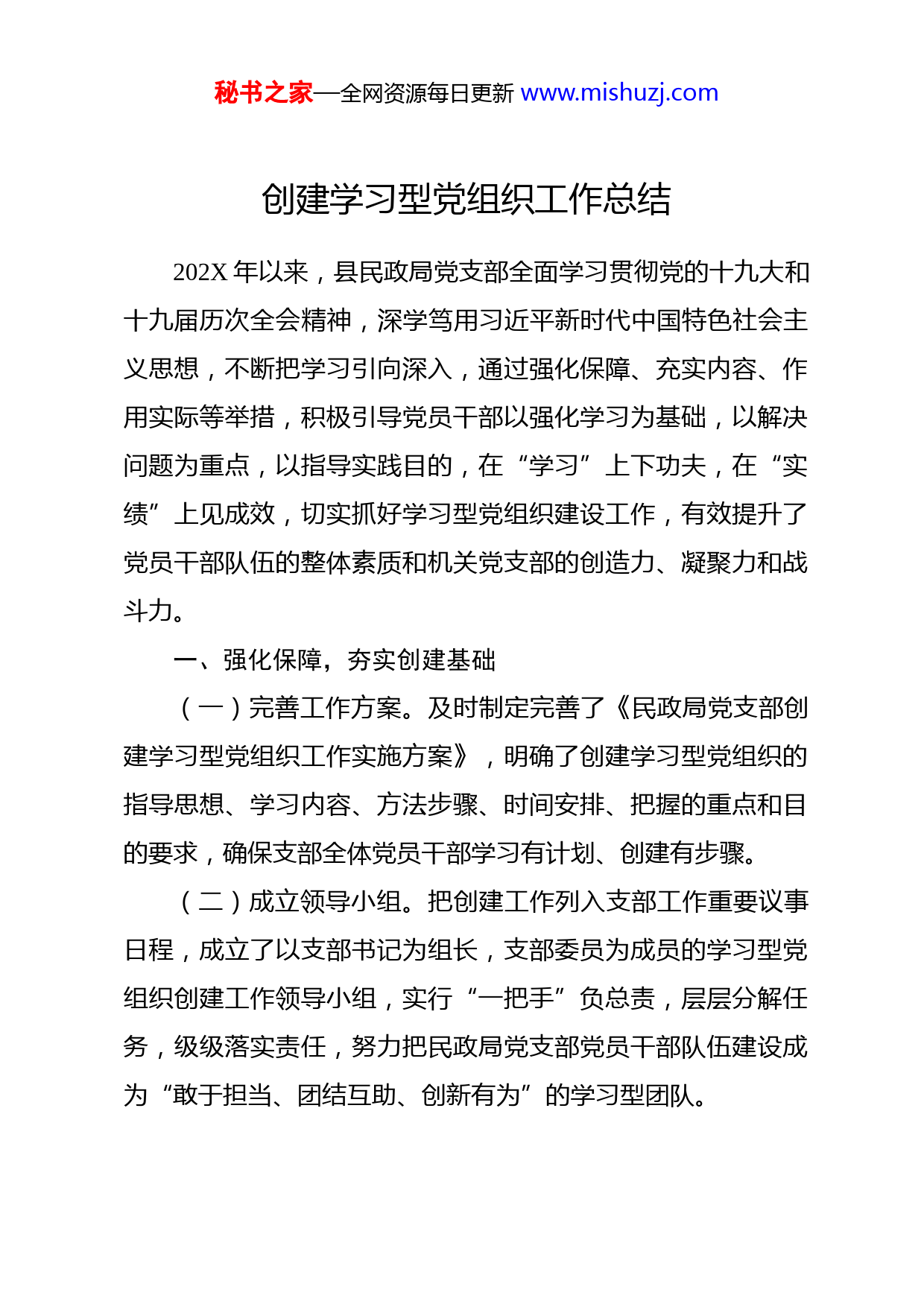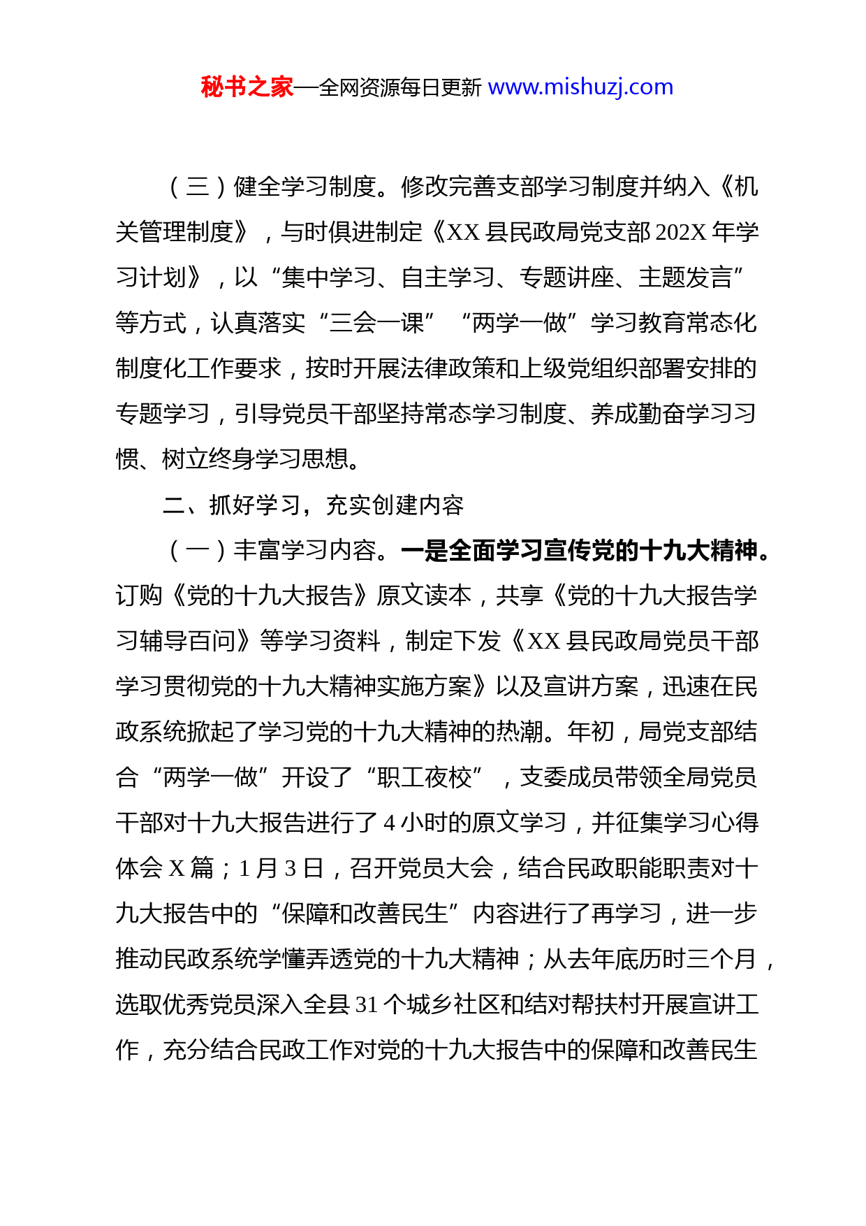 秘书之家—全网资源每日更新www.mishuzj.com创建学习型党组织工作总结202X年以来,县民政局党支部全面学习贯彻党的十九大和十九届历次全会精神,深学笃用习近平新时代中国特色社会主义思想,不断把学习引向深入,通过强化保障、充实内容、作用实际等举措,积极引导党员干部以强化学习为基础,以解决问题为重点,以指导实践目的,在“学习”上下功夫,在“实绩”上见成效,切实抓好学习型党组织建设工作,有效提升了党员干部队伍的整体素质和机关党支部的创造力、凝聚力和战斗力。一、强化保障,夯实创建基础(一)完善工作方案。及时制定完善了《民政局党支部创建学习型党组织工作实施方案》,明确了创建学习型党组织的指导思想、学习内容、方法步骤、时间安排、把握的重点和目的要求,确保支部全体党员干部学习有计划、创建有步骤。(二)成立领导小组。把创建工作列入支部工作重要议事日程,成立了以支部书记为组长,支部委员为成员的学习型党组织创建工作领导小组,实行“一把手”负总责,层层分解任务,级级落实责任,努力把民政局党支部党员干部队伍建设成为“敢于担当、团结互助、创新有为”的学习型团队。秘书之家—全网资源每日更新www.mishuzj.com(三)健全学习制度。修改完善支部学习制度并纳入《机关管理制度》,与时俱进制定《XX县民政局党支部202X年学习计划》,以“集中学习、自主学习、专题讲座、主题发言”等方式,认真落实“三会一课”“两学一做”学习教育常态化制度化工作要求,按时开展法律政策和上级党组织部署安排的专题学习,引导党员干部坚持常态学习制度、养成勤奋学习习惯、树立终身学习思想。二、抓好学习,充实创建内容(一)丰富学习内容。一是全面学习宣传党的十九大精神。订购《党的十九大报告》原文读本,共享《党的十九大报告学习辅导百问》等学习资料,制定下发《XX县民政局党员干部学习贯彻党的十九大精神实施方案》以及宣讲方案,迅速在民政系统掀起了学习党的十九大精神的热潮。年初,局党支部结合“两学一做”开设了“职工夜校”,支委成员带领全局党员干部对十九大报告进行了4小时的原文学习,并征集学习心得体会X篇;1月3日,召开党员大会,结合民政职能职责对十九大报告中的“保障和改善民生”内容进行了再学习,进一步推动民政系统学懂弄透党的十九大精神;从去年底历时三个月,选取优秀党员深入全县31个城乡社区和结对帮扶村开展宣讲工作,充分结合民政工作对党的十九大报告中的保障和改善民生秘书之家—全网资源每日更新www.mishuzj.com战略部署进行详细解读和重点宣传,有力推进党的十九大精神在XX民政领域落地生根、开花结果。二是深学笃用习近平新时代中国特色社会主义思想。认真做好学习习近平总书记重要讲话精神和学习习近平总书记治国理政新理念新思想新战略到学习习近平新时代中国特色社会主义思想的融会贯通,着重抓好习近平总书记视察XX重要讲话精神、参加XX代表团审议时重要讲话精神和扶贫重要论述等内容的学习。3月X日,在学习习近平总书记视察XX重要讲话精神后,全局党员干部重温了习近平总书记2016年初视察XX重要讲话精神,进一步牢记习近平总书记对XX的提出的“两点”定位和“两地”目标。5月X日,在县委十三届四次全会召开后,全局党员干部集中学习了习近平总书记参加XX代表团审议时重要讲话精神,提高了对“形成风清气正的政治生态”“领导干部要讲政德”“多积尺寸之功”等重要论述的理解认识,进一步从思想上推动了我局加强政治建设,肃清孙政才恶劣影响和薄熙来、王立军流毒,加强法治和德治,严肃党内政治生活、树立正确选人用人导向、持之以恒正风肃纪、发展积极健康的党内政治文化等工作。10月起,局党支部结合局脱贫攻坚专题会议集中组织学习了《习近平扶贫论述摘编》,通过读原著、学原文,引导全局党员干部深刻领会习近平总书记关于扶贫重要论述的精神秘书之家—全网资源每日更新www.mishuzj.com实质和核心要义,把思想和行动统一到论述上来,在脱贫攻坚实际工作中切实履好“民政为民,民政爱民”工作理念,充分发挥民政兜底保障职能,扛起责任、勇于担当、攻坚克难,全力助推我县精准打赢脱贫攻坚这场硬仗。三是持续学用党内规章制度、重要行政法律和民政政策知识。12月X日,全体党员干部参加了党风廉政教育专题党课,并在局党组书记的带领下从“党章的地位和作用”“党章的历史演变”“党章的主要内容”“如何学习党章”四个方面对新党章进行了深入学习,切实增强全局党员干部“学习党章、尊崇党章、维护党章”的自觉性。9月X日,局党支部将《中国共产党纪律处分条例》分享至局机关工作群,并由局党组成员带头对《条例》进行了逐条逐句的剖析理解。4月X日和5月X日,局党支部先后通过支委会和组织生活会,邀请法律专家为全体党员干部对《宪法修正案》《中华人民共和国监察法》进行了细致解读学习202X年以来,我局利用民政工作会、村干部培训会、“两项治理”动员培训会、“三区计划”项目推进会等会议,多次对全县民政干部、村社区干部进行了民政政策解读和指导,充分保证我县民政系统工作人员对新时代民政工作政策制度的理解与时俱进,切实提高民政队伍的政策运用能力素质。(二)