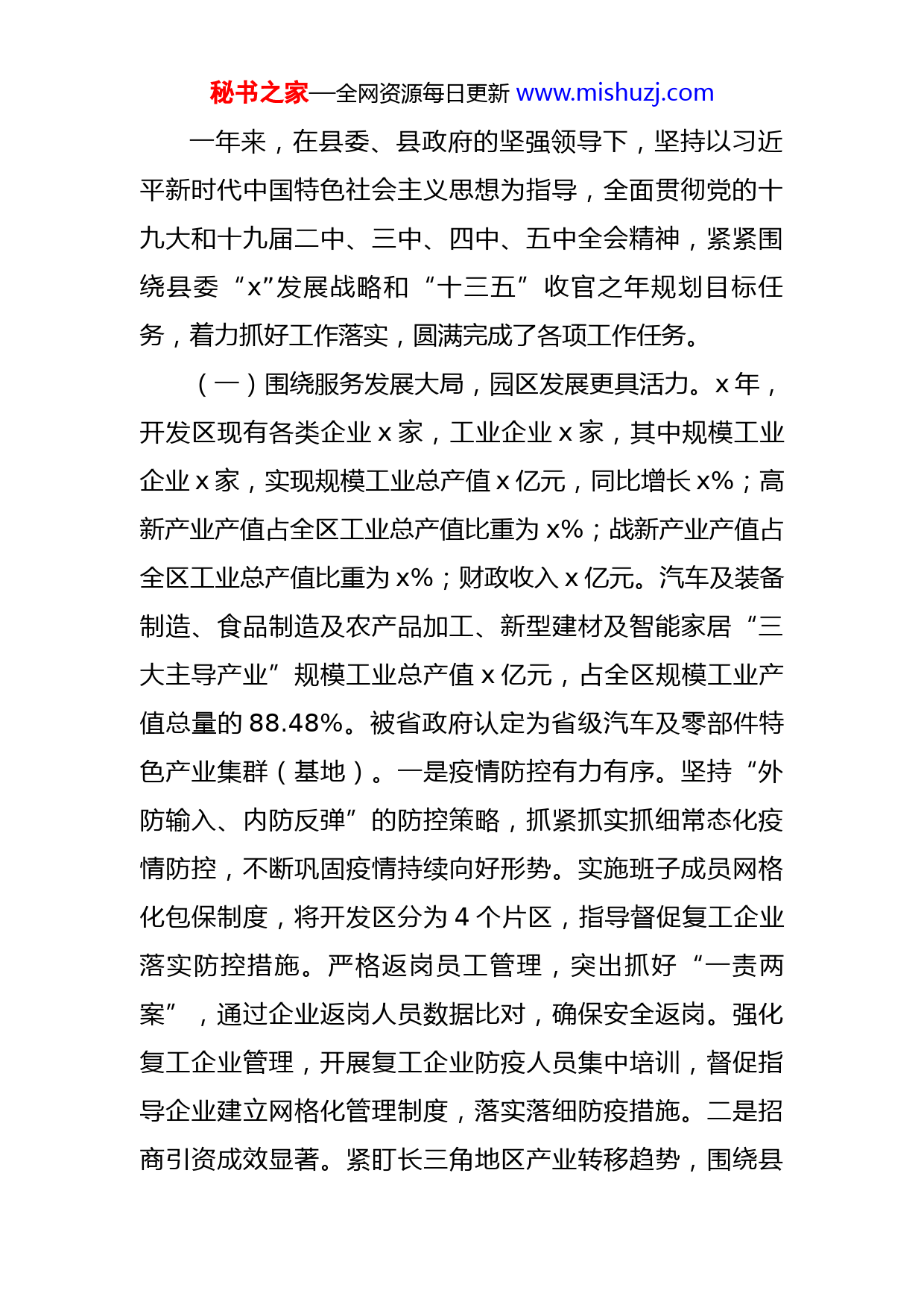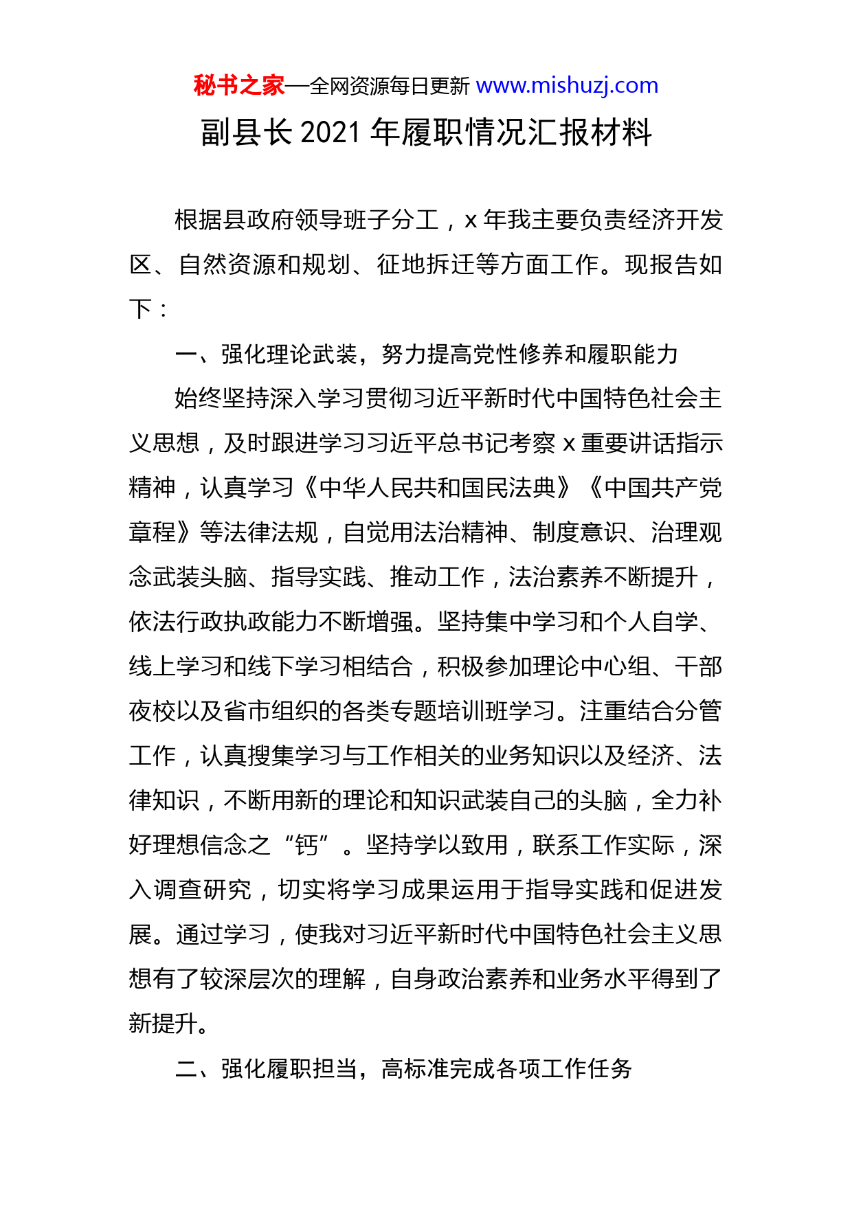 秘书之家—全网资源每日更新www.mishuzj.com副县长2021年履职情况汇报材料根据县政府领导班子分工,x年我主要负责经济开发区、自然资源和规划、征地拆迁等方面工作。现报告如下:一、强化理论武装,努力提高党性修养和履职能力始终坚持深入学习贯彻习近平新时代中国特色社会主义思想,及时跟进学习习近平总书记考察x重要讲话指示精神,认真学习《中华人民共和国民法典》《中国共产党章程》等法律法规,自觉用法治精神、制度意识、治理观念武装头脑、指导实践、推动工作,法治素养不断提升,依法行政执政能力不断增强。坚持集中学习和个人自学、线上学习和线下学习相结合,积极参加理论中心组、干部夜校以及省市组织的各类专题培训班学习。注重结合分管工作,认真搜集学习与工作相关的业务知识以及经济、法律知识,不断用新的理论和知识武装自己的头脑,全力补好理想信念之“钙”。坚持学以致用,联系工作实际,深入调查研究,切实将学习成果运用于指导实践和促进发展。通过学习,使我对习近平新时代中国特色社会主义思想有了较深层次的理解,自身政治素养和业务水平得到了新提升。二、强化履职担当,高标准完成各项工作任务秘书之家—全网资源每日更新www.mishuzj.com一年来,在县委、县政府的坚强领导下,坚持以习近平新时代中国特色社会主义思想为指导,全面贯彻党的十九大和十九届二中、三中、四中、五中全会精神,紧紧围绕县委“x”发展战略和“十三五”收官之年规划目标任务,着力抓好工作落实,圆满完成了各项工作任务。(一)围绕服务发展大局,园区发展更具活力。x年,开发区现有各类企业x家,工业企业x家,其中规模工业企业x家,实现规模工业总产值x亿元,同比增长x%;高新产业产值占全区工业总产值比重为x%;战新产业产值占全区工业总产值比重为x%;财政收入x亿元。汽车及装备制造、食品制造及农产品加工、新型建材及智能家居“三大主导产业”规模工业总产值x亿元,占全区规模工业产值总量的88.48%。被省政府认定为省级汽车及零部件特色产业集群(基地)。一是疫情防控有力有序。坚持“外防输入、内防反弹”的防控策略,抓紧抓实抓细常态化疫情防控,不断巩固疫情持续向好形势。实施班子成员网格化包保制度,将开发区分为4个片区,指导督促复工企业落实防控措施。严格返岗员工管理,突出抓好“一责两案”,通过企业返岗人员数据比对,确保安全返岗。强化复工企业管理,开展复工企业防疫人员集中培训,督促指导企业建立网格化管理制度,落实落细防疫措施。二是招商引资成效显著。紧盯长三角地区产业转移趋势,围绕县秘书之家—全网资源每日更新www.mishuzj.com域主导产业,扎实开展强链补链延链招商,全年新签约工业项目x个(单独供地项目20个),协议总投资x亿元,其中x亿元以上项目x个,x亿元以上项目x个。三是项目建设更加有力。严格落实“四督四保”工作要求,全面贯彻“五个一”项目推进机制,强化项目建设跟踪服务。x等17个项目加快建设,x等20个项目开工建设,x等17个项目建成投用。四是产业培育提质增效。坚持聚力产业培育促进创新能力提升,推动传统产业转型升级。发展壮大省级汽车及零部件特色产业集群(基地),引进x生产线,打造x全系列、专业化的MPV生产基地。x电气、x与x工程大学开展产学研合作,x汽车成功申报科技扶贫项目,x获批省级众创空间。鼓励企业实施技改升级,促进x、等企业实施技术改造。全年新增x等规模工业企业x家、x等战略性新兴产业企业x家、x等高新技术企业6家。x等3家企业获得首届县政府质量奖,x荣获市政府质量奖。五是园区功能更加完善。积极优化“园中园”建设管理,开工建设x共入驻企业x家。x被认定为x省小型微型企业创业创新示范基地。x等x个项目签约落地,x等x个项目建成投产。重组x等4个项目,盘活土地372亩。利用闲置厂房23万平方米,引进x等52家企业。建成x等道排工程30公里,完成x南段10千伏线路延伸工程。开发区分布式能源供热项目竣工,具备集中供热条件。秘书之家—全网资源每日更新www.mishuzj.com(二)牢固树立新发展理念,自然资源管理持续向好。一是重点项目用地保障有力。围绕政府投资x等重大基础设施项目及脱贫攻坚、工业、招商引资和产业化发展等重点项目用地需求,努力破解用地瓶颈,千方百计保障发展用地,全年组卷上报各类用地20个批次7135亩。二是耕地保护不断加强。始终认真贯彻执行党中央、国务院关于耕地保护和土地管理的大政方针,强化政治意识,底线意识,红线意识,坚决落实最严格的耕地保护制度,积极开展永久基本农田储备库划定,严格控制非农建设用地规模,压实了耕地保护责任。全年补充耕地x亩,超额完成全年目标任务。三是规划编制有序开展。坚持多规合一,《x县国土空间总体规划(x—2035年)》编制工作加快推进,高铁站前区专项研究方案初步形成,历史文化名城保护规划通过省级评审。同步编制城乡一体化供水、农村生活污水治理等专项规划和x个美丽乡村规划,城乡规划体系更加科学。四是不动产登记工作提速增效。以x问题专项治理工作为契机,不断强化窗口规范化建设,积极开展不动产登记提升行动,基本实现产权登记3个工作日办结,实体经济企业产权首登和抵押1个工作日办结,不动产登记效率不断提升。(三)不断强化征地拆迁,