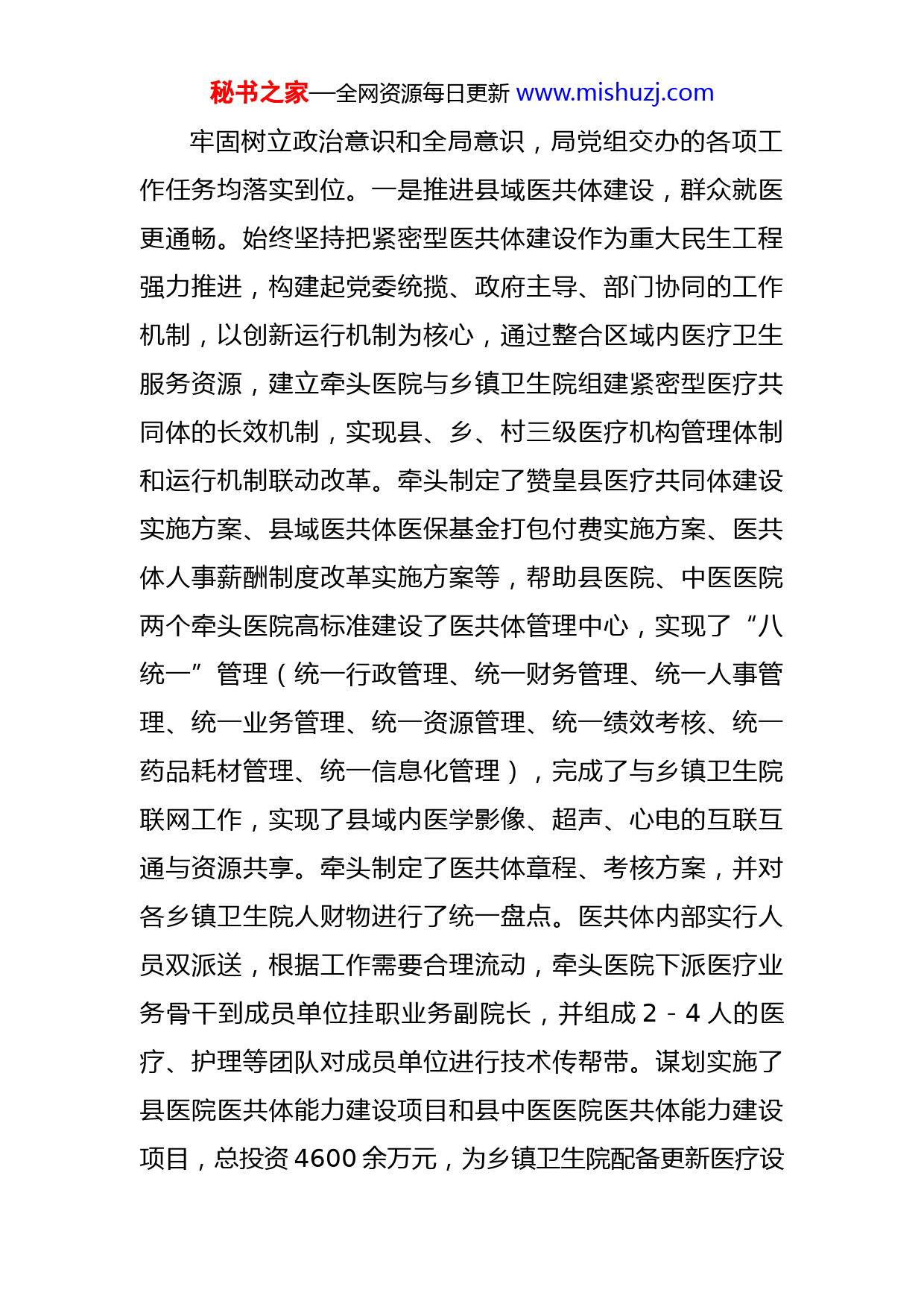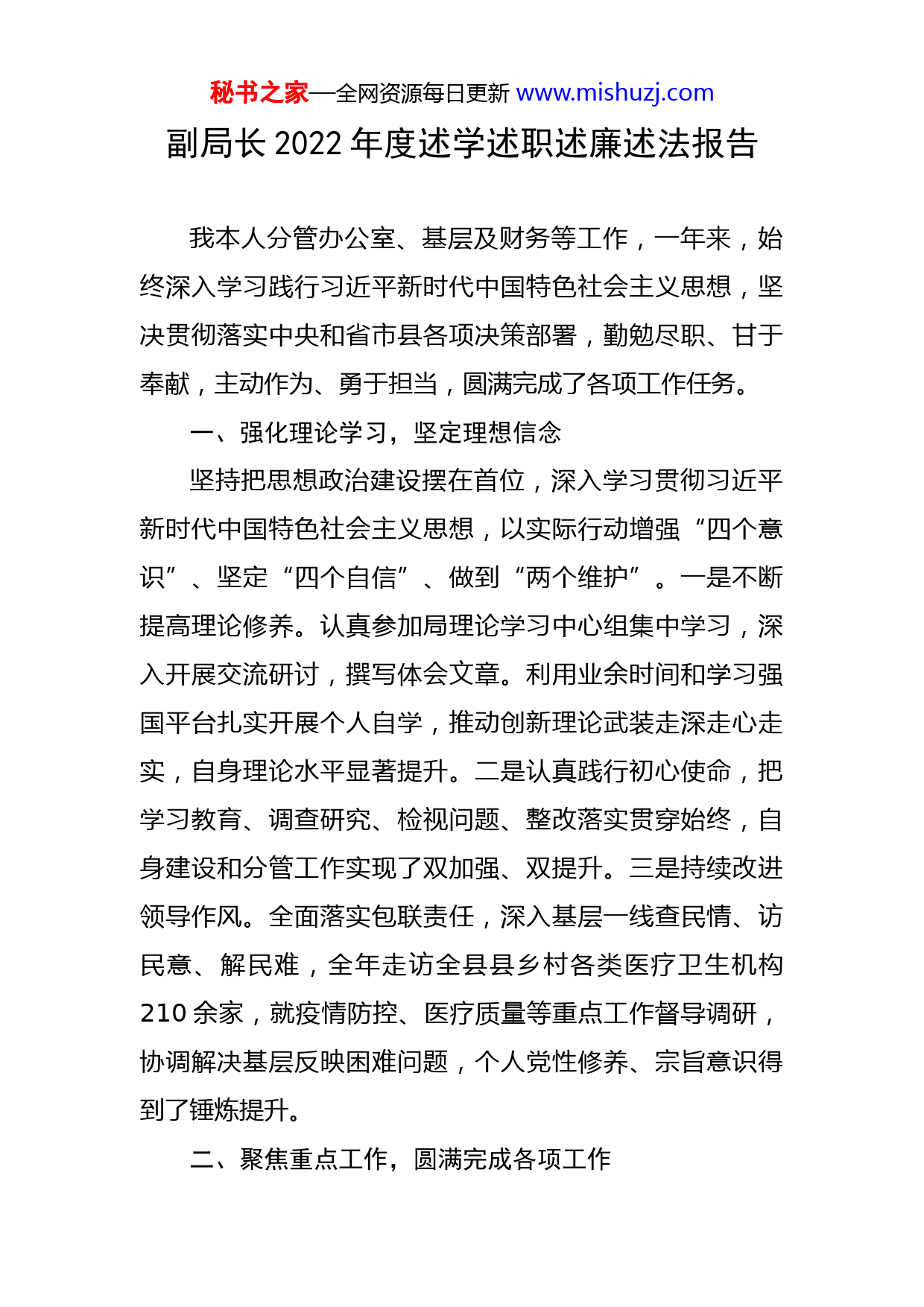 秘书之家—全网资源每日更新www.mishuzj.com副局长2022年度述学述职述廉述法报告我本人分管办公室、基层及财务等工作,一年来,始终深入学习践行习近平新时代中国特色社会主义思想,坚决贯彻落实中央和省市县各项决策部署,勤勉尽职、甘于奉献,主动作为、勇于担当,圆满完成了各项工作任务。一、强化理论学习,坚定理想信念坚持把思想政治建设摆在首位,深入学习贯彻习近平新时代中国特色社会主义思想,以实际行动增强“四个意识”、坚定“四个自信”、做到“两个维护”。一是不断提高理论修养。认真参加局理论学习中心组集中学习,深入开展交流研讨,撰写体会文章。利用业余时间和学习强国平台扎实开展个人自学,推动创新理论武装走深走心走实,自身理论水平显著提升。二是认真践行初心使命,把学习教育、调查研究、检视问题、整改落实贯穿始终,自身建设和分管工作实现了双加强、双提升。三是持续改进领导作风。全面落实包联责任,深入基层一线查民情、访民意、解民难,全年走访全县县乡村各类医疗卫生机构210余家,就疫情防控、医疗质量等重点工作督导调研,协调解决基层反映困难问题,个人党性修养、宗旨意识得到了锤炼提升。二、聚焦重点工作,圆满完成各项工作秘书之家—全网资源每日更新www.mishuzj.com牢固树立政治意识和全局意识,局党组交办的各项工作任务均落实到位。一是推进县域医共体建设,群众就医更通畅。始终坚持把紧密型医共体建设作为重大民生工程强力推进,构建起党委统揽、政府主导、部门协同的工作机制,以创新运行机制为核心,通过整合区域内医疗卫生服务资源,建立牵头医院与乡镇卫生院组建紧密型医疗共同体的长效机制,实现县、乡、村三级医疗机构管理体制和运行机制联动改革。牵头制定了赞皇县医疗共同体建设实施方案、县域医共体医保基金打包付费实施方案、医共体人事薪酬制度改革实施方案等,帮助县医院、中医医院两个牵头医院高标准建设了医共体管理中心,实现了“八统一”管理(统一行政管理、统一财务管理、统一人事管理、统一业务管理、统一资源管理、统一绩效考核、统一药品耗材管理、统一信息化管理),完成了与乡镇卫生院联网工作,实现了县域内医学影像、超声、心电的互联互通与资源共享。牵头制定了医共体章程、考核方案,并对各乡镇卫生院人财物进行了统一盘点。医共体内部实行人员双派送,根据工作需要合理流动,牵头医院下派医疗业务骨干到成员单位挂职业务副院长,并组成2-4人的医疗、护理等团队对成员单位进行技术传帮带。谋划实施了县医院医共体能力建设项目和县中医医院医共体能力建设项目,总投资4600余万元,为乡镇卫生院配备更新医疗设秘书之家—全网资源每日更新www.mishuzj.com备,提高基本医疗卫生服务均等化、同质化、一体化水平,切实解决基层群众“看病难、看病远”的问题。二是推进急救设施建设,患者救治更及时。积极实施了120急救调度平台项目,将县医院、县中医医院纳入院前医疗急救网络体系,并在边远乡镇设置急救分站点,进一步完善院前急救网络格局,实现上车即入院,打造15分钟急救圈。120调度整合有效防止了延误患者诊治的情况发生,大大提升院前急救服务能力,方便群众看病就医。三是推进应急能力建设,疫情防控更精准。发挥自身专业特长,结合分管工作,组织全系统全面落实新冠疫情防控工作,开展线索排查2.1万条,对集中隔离的450余人开展心理干预。严格医疗机构管理,督导各医疗机构健全院感防控体系,成立了三级防控组织,落实日巡查、周评估、月总结的院感风险防控机制,带领人员现场指导,跟踪问效,开展了医疗机构医院感染大排查大整改大提升专项行动。严格落实“四早”要求,规范设置预检分诊、发热筛查门诊,指导各医疗机构规范管理发热人员,落实返乡重点人员的健康监测和防护指导,广泛开展健康教育和宣传,提高居民防护意识和发热后第一时间报告、就诊意识,为有效防控全县疫情的发生,筑牢疫情防控防线,做出了应有的贡献。四是推进服务模式建设,医防融合更紧密。在原体检站的基础上,提升改造了健康体检中心,设定了不同秘书之家—全网资源每日更新www.mishuzj.com的体检套餐,实行了计算机自动化管理,所有体检资料全部实现电子化,方便受检者随时查询各项体检结论和报告,并针对体检中异常结果检测率居高的脂肪肝、高血压等,结合医院营养科,开展健康指导,有效降低了疾病发生率。开展上消化道癌早诊早治项目,为全县40—69周岁人群免费胃镜筛查,发现早期癌15例并及时进行了诊治。将治未病与公卫项目相结合,通过对全县65岁以上老年人的中医体质信息采集、中医体质辨识及中医药保健指导,让群众切身感受到中医药预防保健与康复的效果,今年共检出各类疾病1215人,均进行了有效治疗。三、严格廉政自律,树立良好形象始终以一名共产党员标准严格要求自己,以身作则、以上率下。一是严守政治规矩。讲政治、顾大局,贯彻上级决策不走样,时刻与党中央和省、市、县委保持高度一致,对职责范围内的工作,自觉主动谋划部署,勇于担当、从不推诿。严守党的政治纪律、组织纪律,认真执行民主集中制,自觉摆正位置,重大事项坚持集体讨论决策,与班子成员和同志们互相尊重、互相补台、互相支持。