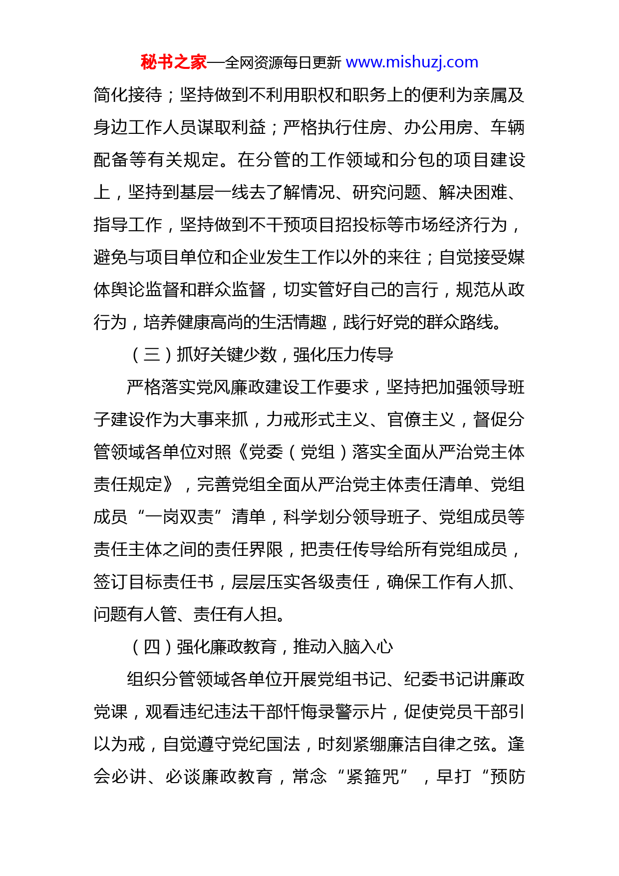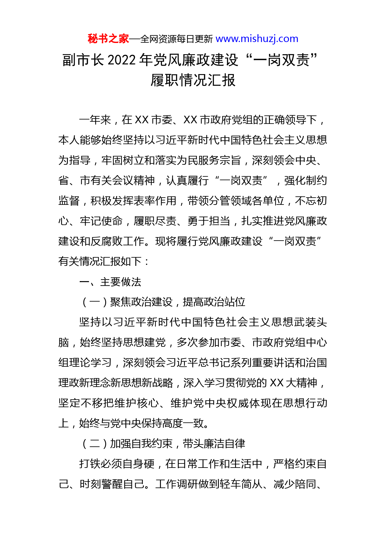 秘书之家—全网资源每日更新www.mishuzj.com副市长2022年党风廉政建设“一岗双责”履职情况汇报一年来,在XX市委、XX市政府党组的正确领导下,本人能够始终坚持以习近平新时代中国特色社会主义思想为指导,牢固树立和落实为民服务宗旨,深刻领会中央、省、市有关会议精神,认真履行“一岗双责”,强化制约监督,积极发挥表率作用,带领分管领域各单位,不忘初心、牢记使命,履职尽责、勇于担当,扎实推进党风廉政建设和反腐败工作。现将履行党风廉政建设“一岗双责”有关情况汇报如下:一、主要做法(一)聚焦政治建设,提高政治站位坚持以习近平新时代中国特色社会主义思想武装头脑,始终坚持思想建党,多次参加市委、市政府党组中心组理论学习,深刻领会习近平总书记系列重要讲话和治国理政新理念新思想新战略,深入学习贯彻党的XX大精神,坚定不移把维护核心、维护党中央权威体现在思想行动上,始终与党中央保持高度一致。(二)加强自我约束,带头廉洁自律打铁必须自身硬,在日常工作和生活中,严格约束自己、时刻警醒自己。工作调研做到轻车简从、减少陪同、秘书之家—全网资源每日更新www.mishuzj.com简化接待;坚持做到不利用职权和职务上的便利为亲属及身边工作人员谋取利益;严格执行住房、办公用房、车辆配备等有关规定。在分管的工作领域和分包的项目建设上,坚持到基层一线去了解情况、研究问题、解决困难、指导工作,坚持做到不干预项目招投标等市场经济行为,避免与项目单位和企业发生工作以外的来往;自觉接受媒体舆论监督和群众监督,切实管好自己的言行,规范从政行为,培养健康高尚的生活情趣,践行好党的群众路线。(三)抓好关键少数,强化压力传导严格落实党风廉政建设工作要求,坚持把加强领导班子建设作为大事来抓,力戒形式主义、官僚主义,督促分管领域各单位对照《党委(党组)落实全面从严治党主体责任规定》,完善党组全面从严治党主体责任清单、党组成员“一岗双责”清单,科学划分领导班子、党组成员等责任主体之间的责任界限,把责任传导给所有党组成员,签订目标责任书,层层压实各级责任,确保工作有人抓、问题有人管、责任有人担。(四)强化廉政教育,推动入脑入心组织分管领域各单位开展党组书记、纪委书记讲廉政党课,观看违纪违法干部忏悔录警示片,促使党员干部引以为戒,自觉遵守党纪国法,时刻紧绷廉洁自律之弦。逢会必讲、必谈廉政教育,常念“紧箍咒”,早打“预防秘书之家—全网资源每日更新www.mishuzj.com针”,推进“以案促改”制度化常态化。扎实开展落实中央八项规定精神“过一遍”,紧盯节假日关键节点,督促分管领域各单位及时召开廉政教育提醒大会,做到早提醒、早预防,加强巡回检查和通报曝光,严防“四风”反弹回潮,营造风清气正的政治生态。(五)强化执纪监督,营造廉政氛围要求分管领域各单位全力支持协助驻局纪检组落实监督责任,支持开展日常监督和执纪审查问责。深入开展关键领域专项治理,创新思路全面推行项目代建制,盯紧项目资金审批、设施设备集中采购等廉政风险点,充分发挥审计监督职能作用,整治项目建设中的腐败和不正之风。在要求广大党员干部紧绷廉政弦,做到廉洁从政、清白做人的同时,鼓励广大市场主体共同参与监督,一体推进营造不敢腐不能腐不想腐的廉政氛围。二、存在问题虽然我在贯彻落实党风廉政建设“一岗双责”方面做了一些工作,取得了一些成效,但与省委、市委的要求相比,仍有一定的差距,具体表现在:一是落实主体责任精力投入不够,过多的精力用在分管工作和项目建设上,对廉政建设部署多,问效少,往往满足于开个会,发个文,讲个话,签个状等常规动作。二是落实“一岗双责”还不够深入,虽然分管领域各单位都签订了目标责任书,但从秘书之家—全网资源每日更新www.mishuzj.com实际上看,有的责任条款过于笼统,内容不明确,没有针对性和可操作性,多数没有责任追究的内容。三、下步工作打算(一)严格责任落实。认真研究落实“一岗双责”,探索切实有效的方法和措施,切实担负起分管领域党风廉政建设主体责任,坚持一手抓业务,一手抓反腐倡廉建设,坚持“两手抓、两手硬”,定期研究、检查、指导分管领域党风廉政建设和反腐败工作,把党风廉政建设任务分级、分口、分项落实到分管领域各单位,层层抓好落实。(二)加强制度建设。督促分管领域各单位完善领导干部述廉述职、民主评议、廉政档案等各项制度,规范权力运行、防控廉政风险,切实转变作风,坚决反对“四风”。遵循“明确、具体、可行性”的原则,科学有效制定党风廉政责任清单,把党风廉政建设和反腐倡廉工作纳入目标考核管理,有效运用考核结果,推动党风廉政建设工作整体提升。