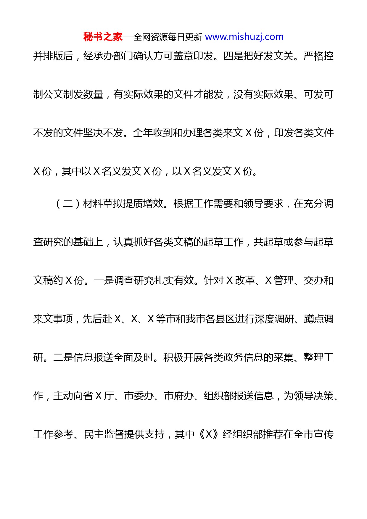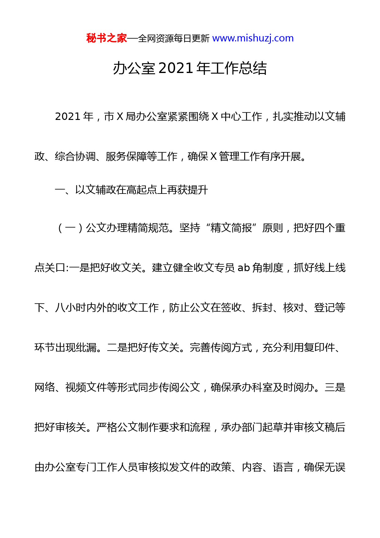 秘书之家—全网资源每日更新www.mishuzj.com办公室2021年工作总结2021年,市X局办公室紧紧围绕X中心工作,扎实推动以文辅政、综合协调、服务保障等工作,确保X管理工作有序开展。一、以文辅政在高起点上再获提升(一)公文办理精简规范。坚持“精文简报”原则,把好四个重点关口:一是把好收文关。建立健全收文专员ab角制度,抓好线上线下、八小时内外的收文工作,防止公文在签收、拆封、核对、登记等环节出现纰漏。二是把好传文关。完善传阅方式,充分利用复印件、网络、视频文件等形式同步传阅公文,确保承办科室及时阅办。三是把好审核关。严格公文制作要求和流程,承办部门起草并审核文稿后由办公室专门工作人员审核拟发文件的政策、内容、语言,确保无误秘书之家—全网资源每日更新www.mishuzj.com并排版后,经承办部门确认方可盖章印发。四是把好发文关。严格控制公文制发数量,有实际效果的文件才能发,没有实际效果、可发可不发的文件坚决不发。全年收到和办理各类来文X份,印发各类文件X份,其中以X名义发文X份,以X名义发文X份。(二)材料草拟提质增效。根据工作需要和领导要求,在充分调查研究的基础上,认真抓好各类文稿的起草工作,共起草或参与起草文稿约X份。一是调查研究扎实有效。针对X改革、X管理、交办和来文事项,先后赴X、X、X等市和我市各县区进行深度调研、蹲点调研。二是信息报送全面及时。积极开展各类政务信息的采集、整理工作,主动向省X厅、市委办、市府办、组织部报送信息,为领导决策、工作参考、民主监督提供支持,其中《X》经组织部推荐在全市宣传秘书之家—全网资源每日更新www.mishuzj.com推广。三是文稿起草精益求精。结合市委、市政府中心工作,全年起草各类办法、方案、意见、通知X多份。如起草X大调研报告等重要文件,历经调查研究、经验总结、起草材料等X个多月过程,丰富了我市构建X新体制大调研成果。(三)档案文件科学管理。注重加强档案、文件的管理和运用,充分发挥档案文件的凭证、依据和参考作用,提高工作效率。一是规范档案管理。修订完善《X市X局档案工作制度汇编》,规范档案接收、档案整理、档案存放和档案借阅等工作程序。在各科室各配备一名档案员,负责抓好本内设机构的档案管理工作。二是完善电子档案完善网络共享的电子档案,及时推进公文、信息、文稿等档案信息的数字化,全年共建立电子档案X份。秘书之家—全网资源每日更新www.mishuzj.com二、综合协调在新常态下高效开展(一)协调工作积极有效。以文件办理为主线,积极协调各科室贯彻落实上级政策、有序推进各项工作。一是抓好与上级部门的沟通积极联系省X厅,做好工作服务,抓好工作对接,争取工作支持。根据上级部署,较好地完成中央、省相关部门到我市调研的服务工作,其中中央层面X次、省层面X次,我市政府机构改革、行政审批制度改革等多项工作得到上级高度肯定和大力支持。围绕市委、市政府中心工作,成功争取省X厅支持我市组建政务服务办公室。与省X厅驻X市X县X镇X村定点帮扶工作队结对开展帮扶,重点协助省X厅驻村定点帮扶工作队开展X市河涌治理、古村落改造等调研。二是抓好与全市机关单位的协调。借助X工作qq群、微信群等载体,与市、秘书之家—全网资源每日更新www.mishuzj.com县两级部门保持密切联系,及时做好政策宣传、精神解读,积极开展业务指导和问题调解。三是抓好与基层的联系。主动到各县区、中小学校开展实地调研,收集整理基层的意见建议。保持与驻点村X镇X村的联系,多次到X村开展志愿服务活动。(二)公务安排简约有序。严格按照有关标准要求,坚持精简、节约的原则,抓好各类公务活动的组织安排。一是科学安排会议会务大力精简各类会议,坚决不开没有实际内容的会议,积极做到并会套开,全年共组织较大的会议X场、单位内部会议X次。二是合理安排公务接待。按照节约、周到的原则安排公务接待,共接待各地来X调研X次,其中省外X批、省内X批。三是积极安排学习培训。围绕X中心工作,积极组织开展、派员参加各类培训,其中组织较大规模培秘书之家—全网资源每日更新www.mishuzj.com训X场,组织参加的各类培训近X场次,人均参训近X学时。(三)督查督办扎实有力。把督查督办作为抓落实的重要抓手,进一步加大督查督办力度,建立健全一级抓一级、层层抓落实的督查督办工作机制。对于来文的办理,建立专门台账,明确来文的送转时间和办理期限,落实事项办理的具体人,确保每一份来文都得到有效办理。对于市委、市政府的中心工作及市委督查室、市府督查室的督查事项,建立工作台账,由局领导直接抓督办落实。三、服务保障在深耕细作中更加优化(一)加强队伍建设。深入开展党史学习教育,以组织集中学习研讨X次,主题党课X次。深入开展“X创建”主题实践活动,组织专题讨论、党员承诺践诺、主题党日活动、对口援建X图书馆等多项秘书之家—全网资源每日更新www.mishuzj.com党员教育活动。二是致力抓能力建设,提升综合素质。围绕思想政治党风廉政、工作业务、修身养才等内容,邀请党校、高校以及社会的专家学者开展各类培训班,全年人均培训约X次。三是致力抓纪律教育,推进依法行政。组织开展纪律学习月活动,加强党风廉政教育。根据工作实际,制定加强党