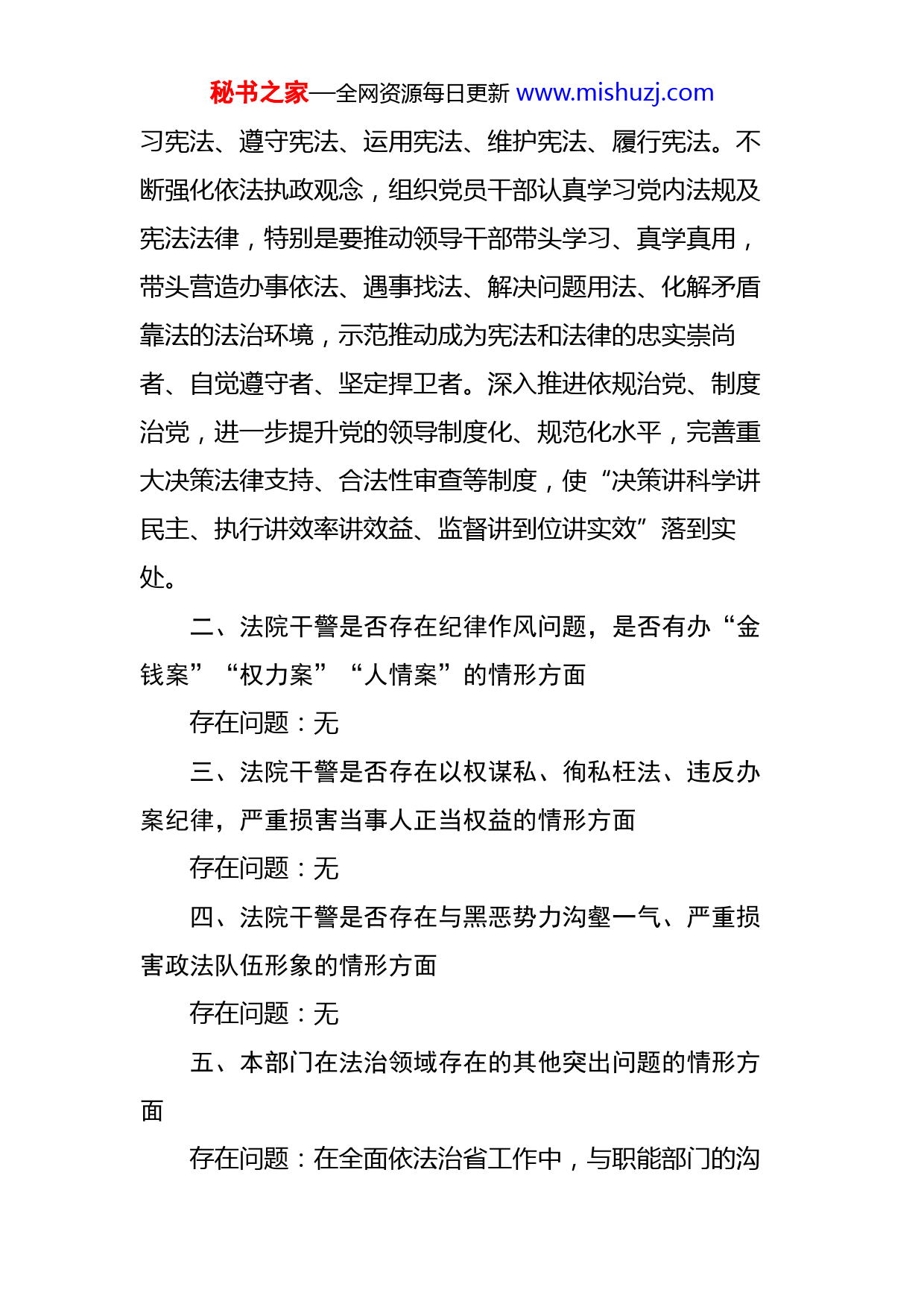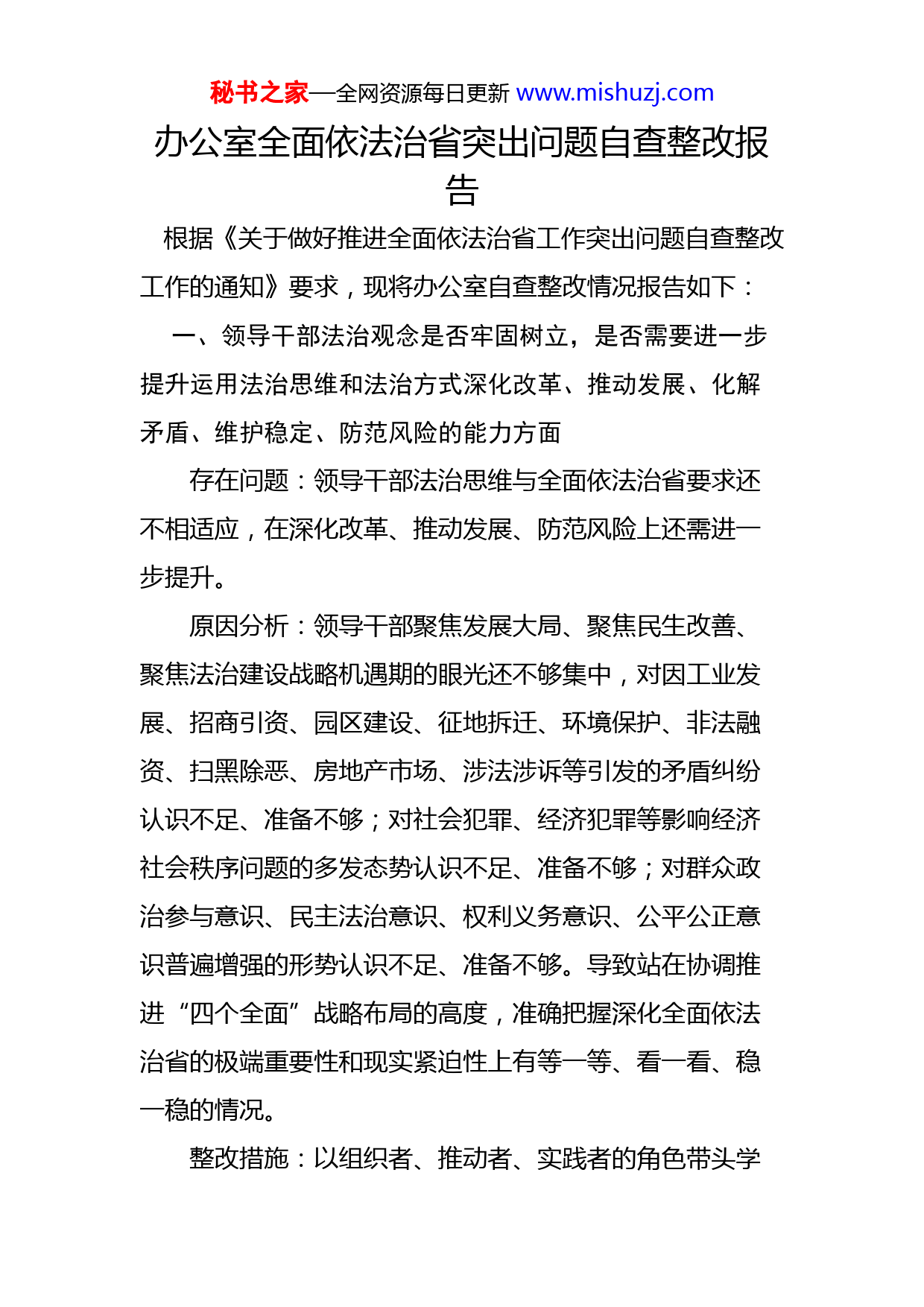 秘书之家—全网资源每日更新www.mishuzj.com办公室全面依法治省突出问题自查整改报告根据《关于做好推进全面依法治省工作突出问题自查整改工作的通知》要求,现将办公室自查整改情况报告如下:一、领导干部法治观念是否牢固树立,是否需要进一步提升运用法治思维和法治方式深化改革、推动发展、化解矛盾、维护稳定、防范风险的能力方面存在问题:领导干部法治思维与全面依法治省要求还不相适应,在深化改革、推动发展、防范风险上还需进一步提升。原因分析:领导干部聚焦发展大局、聚焦民生改善、聚焦法治建设战略机遇期的眼光还不够集中,对因工业发展、招商引资、园区建设、征地拆迁、环境保护、非法融资、扫黑除恶、房地产市场、涉法涉诉等引发的矛盾纠纷认识不足、准备不够;对社会犯罪、经济犯罪等影响经济社会秩序问题的多发态势认识不足、准备不够;对群众政治参与意识、民主法治意识、权利义务意识、公平公正意识普遍增强的形势认识不足、准备不够。导致站在协调推进“四个全面”战略布局的高度,准确把握深化全面依法治省的极端重要性和现实紧迫性上有等一等、看一看、稳一稳的情况。整改措施:以组织者、推动者、实践者的角色带头学秘书之家—全网资源每日更新www.mishuzj.com习宪法、遵守宪法、运用宪法、维护宪法、履行宪法。不断强化依法执政观念,组织党员干部认真学习党内法规及宪法法律,特别是要推动领导干部带头学习、真学真用,带头营造办事依法、遇事找法、解决问题用法、化解矛盾靠法的法治环境,示范推动成为宪法和法律的忠实崇尚者、自觉遵守者、坚定捍卫者。深入推进依规治党、制度治党,进一步提升党的领导制度化、规范化水平,完善重大决策法律支持、合法性审查等制度,使“决策讲科学讲民主、执行讲效率讲效益、监督讲到位讲实效”落到实处。二、法院干警是否存在纪律作风问题,是否有办“金钱案”“权力案”“人情案”的情形方面存在问题:无三、法院干警是否存在以权谋私、徇私枉法、违反办案纪律,严重损害当事人正当权益的情形方面存在问题:无四、法院干警是否存在与黑恶势力沟壑一气、严重损害政法队伍形象的情形方面存在问题:无五、本部门在法治领域存在的其他突出问题的情形方面存在问题:在全面依法治省工作中,与职能部门的沟秘书之家—全网资源每日更新www.mishuzj.com通联系较少,导致有的工作不够流畅、衔接不够紧密,该做的忘做、慢做。原因分析:对全面依法治省工作的重要性认识还不足,当此项工作与本部门主要工作相冲突时,存在说起来重要、忙起来不要的情况。症结在于没有把本部门放置于全面依法治省工作的大局中去,习惯性的认为上挂下干中间空,走走过场不沾手。对全面依法治省委员会及办公室的运行机制、机构设置、职责任务、会议制度、注意事项等内容学习掌握不够。整改措施:一是切实按照全面依法治省委员会决定事项、工作部署和要求,确保各项工作任务在办公室得到不折不扣落实。二是切实增强大局意识,加强沟通协调、密切协作配合,认真落实日常联系机制,助力全面依法治省整体合力,推动办公室法治建设不断取得新突破、新进展。三是重视夯实法治社会建设这一基础环节,想放设法强化法治宣传教育,开展普法宣传工作,大力弘扬“枫桥经验”,协助加强基层法律服务体系建设,为基层群众提供普惠均等、便捷高效、智能精准的公共法律服务。