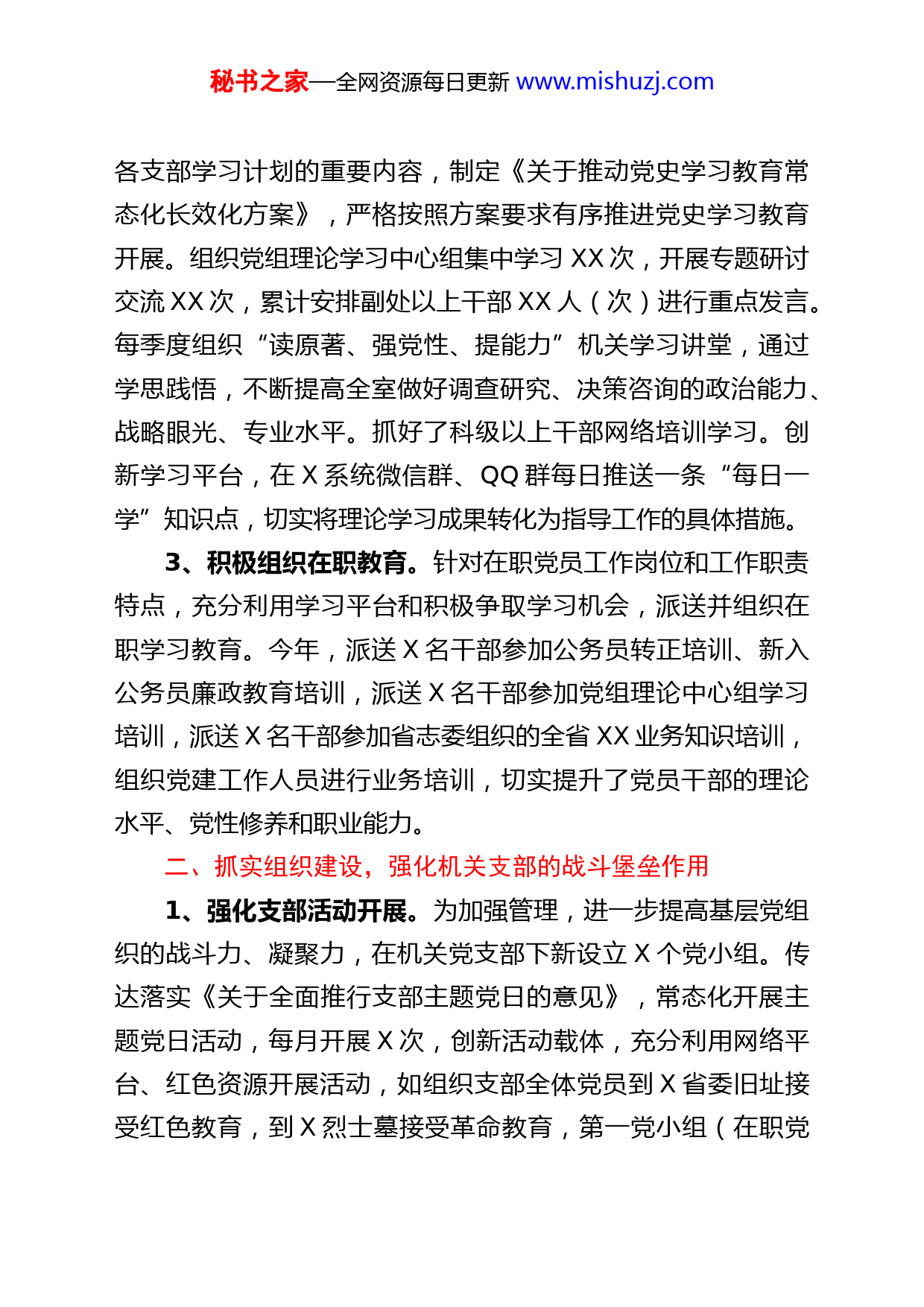 秘书之家—全网资源每日更新www.mishuzj.com办公室机关党建工作总结汇报今年以来,我办在市直机关工委和办党组的正确领导下,深入学习习近平总书记系列重要讲话,认真学习贯彻党的十九大及历次全会精神,以党史学习专题学习教育为主线,全面加强党建工作,突出夯实党支部软硬件建设,着力提升党支部服务水平,充分发挥机关党支部战斗堡垒作用,为推动XX工作跨越发展提供了有力政治和组织保证。一、抓实思想教育,提高党员干部的政治理论素养1、全面深化日常教育。党组会认真研究党建工作年度安排,建立健全党组中心组理论学习制度,制定了《市X办党组中心组X年理论学习计划》《市X办机关党支部X年度学习教育计划》等。强化组织生活的教育引领作用,认真落实三会一课制度,并做好纪实管理,年初认真组织开展单位民主生活会和支部组织生活会,单位班子成员以普通党员身份参加所在支部的党员生活,开展了民主评议党员工作,评选优秀党员X名。建立学习教育的长效管理机制,将党的十九大精神和习近平总书记系列重要讲话精神,中央、省市重大决策部署及最新的“两会”精神作为重点内容进行安排。党员认真制定个人学习计划,并撰写上交学习心得体会。2、有序推进专题教育。紧密围绕党史学习教育主线,深入学习宣传贯彻习近平新时代中国特色社会主义思想,把习近平总书记对XX工作重要指示批示精神作为党组理论学习中心组及秘书之家—全网资源每日更新www.mishuzj.com各支部学习计划的重要内容,制定《关于推动党史学习教育常态化长效化方案》,严格按照方案要求有序推进党史学习教育开展。组织党组理论学习中心组集中学习XX次,开展专题研讨交流XX次,累计安排副处以上干部XX人(次)进行重点发言。每季度组织“读原著、强党性、提能力”机关学习讲堂,通过学思践悟,不断提高全室做好调查研究、决策咨询的政治能力、战略眼光、专业水平。抓好了科级以上干部网络培训学习。创新学习平台,在X系统微信群、QQ群每日推送一条“每日一学”知识点,切实将理论学习成果转化为指导工作的具体措施。3、积极组织在职教育。针对在职党员工作岗位和工作职责特点,充分利用学习平台和积极争取学习机会,派送并组织在职学习教育。今年,派送X名干部参加公务员转正培训、新入公务员廉政教育培训,派送X名干部参加党组理论中心组学习培训,派送X名干部参加省志委组织的全省XX业务知识培训,组织党建工作人员进行业务培训,切实提升了党员干部的理论水平、党性修养和职业能力。二、抓实组织建设,强化机关支部的战斗堡垒作用1、强化支部活动开展。为加强管理,进一步提高基层党组织的战斗力、凝聚力,在机关党支部下新设立X个党小组。传达落实《关于全面推行支部主题党日的意见》,常态化开展主题党日活动,每月开展X次,创新活动载体,充分利用网络平台、红色资源开展活动,如组织支部全体党员到X省委旧址接受红色教育,到X烈士墓接受革命教育,第一党小组(在职党秘书之家—全网资源每日更新www.mishuzj.com小组)组织党员到X故居接受红色教育,组织全体党员开展重温入党誓词、“喜迎二十大,说说心里话”等活动。2、提升硬件建设水平。结合单位实际情况,加大投入,提升了党支部硬件建设水平。坚持实用美观原则,将党支部“三会一课”制度、组织生活会制度、党员联系服务群众制度、党费收缴管理制度上墙,新设置阳光台、宣传栏,展示党建活动图片,适时进行党务公开,并及时宣传相关政策、活动,做好了书报的日常管理和更新。在办公用房紧张的情况下,按照“六有”标准建设好党员活动场所,改善了干部职工活动室条件,提升了党员开展文体健身活动的条件。3、严格规范日常管理。传达落实《X市机关党支部评星定级活动实施方案》,着力加强支部基础工作,做好党组织关系日常管理,认真开展党组织关系排查,及时更新党员档案,及时补充相关资料。做好党费日常管理,党员自觉按制度要求履行缴纳党费义务,从未发生少交或不交党费的不良现象,支部认真按有关规定做好收缴党费的组织工作,及时按规定上缴,建立台账,每半年在机关公开栏和党员大会上公开党费收缴情况,接受广大党员监督。按要求部署和开展党代表的推荐提名工作和公示工作。X年上半年在机关工委的指导下通过直选,按要求按程序高效完成支部换届工作。三、抓实作风建设,推进机关支部的党风廉政建设1、狠抓专项整治。为进一步深化作风建设,驰而不息纠正“四风”,深入开展各项专项整治工作。认真开展了“治陋习、秘书之家—全网资源每日更新www.mishuzj.com树新风”专项整治工作、开展会风会纪督查、清理国家公职人员违规参与涉企等经营性活动专项整治工作,研究制定并下发市X办《开展清理国家公职人员违规参与涉矿等经营性活动专项整治工作实施方案》,召开动员会,组织所有涉及对象填写了自查表,全体党员干部不存在违规经营情况。认真开展退(离)休领导干部在社会组织兼职情况的自查工作,不存在违规违纪情况,唯一一名存在社会兼职的老同志在自查期间主动申请退出兼任。2、细抓廉政谈话。下发并严格执行《X市X办公室领导班子X年党风廉政建设责任分工》文件,贯彻落实党风廉政建设党组主体责任和纪检组监督责任,结合单位实际,层