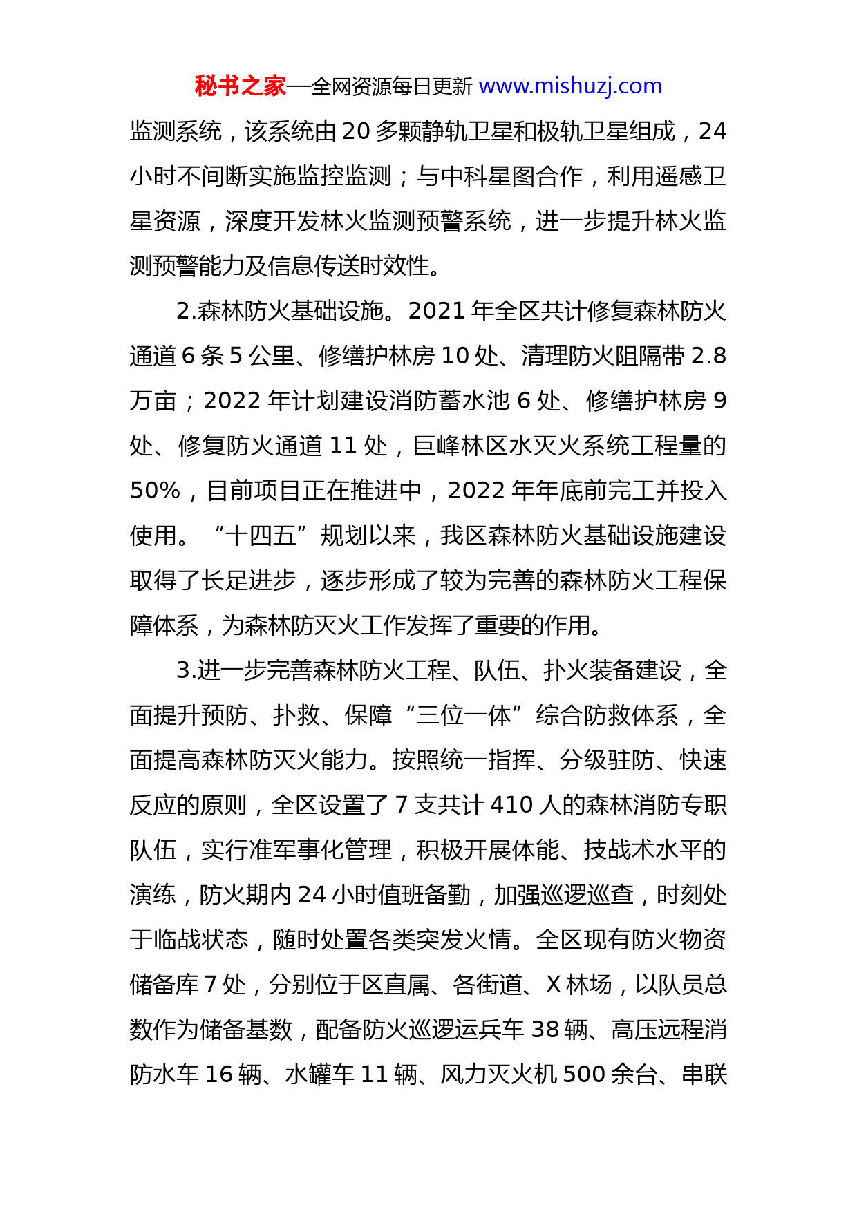 秘书之家—全网资源每日更新www.mishuzj.com区“十四五”应急管理体系建设规划执行效果评估报告《X区“十四五”应急管理体系建设规划》执行效果评估报告如下:一、规划执行情况(一)健全安全风险防控体系按照“分级负责,属地管理,条块结合,群防群治”原则,我区对森林防灭火工作实行网格化管理,全区林地划分为1个一级网格、6个二级网格、142个三级网格、578个四级网格,精准实现了网中有格、格中有人。抓好网格化管理体系建设,区森防办定期会同各街道、X林场开展工作互商,层层压实防火责任、强化宣传教育发动、抓好隐患排查治理,推进防火队伍建设,不间断地实施明察暗访、重点检查,进一步强化压力传导,保持森林防灭火高压态势。(二)健全自然灾害防治体系,强化森林防灭火能力建设1.森林防火监控监测体系建设情况。利用区大数据中心全域感知网新增防火监控120处,山林监控覆盖率达到90%左右,有效探测距离达到3公里,提高了对森林火情探测的精准度及早期预警能力。安装了慧眼遥感卫星林火秘书之家—全网资源每日更新www.mishuzj.com监测系统,该系统由20多颗静轨卫星和极轨卫星组成,24小时不间断实施监控监测;与中科星图合作,利用遥感卫星资源,深度开发林火监测预警系统,进一步提升林火监测预警能力及信息传送时效性。2.森林防火基础设施。2021年全区共计修复森林防火通道6条5公里、修缮护林房10处、清理防火阻隔带2.8万亩;2022年计划建设消防蓄水池6处、修缮护林房9处、修复防火通道11处,巨峰林区水灭火系统工程量的50%,目前项目正在推进中,2022年年底前完工并投入使用。“十四五”规划以来,我区森林防火基础设施建设取得了长足进步,逐步形成了较为完善的森林防火工程保障体系,为森林防灭火工作发挥了重要的作用。3.进一步完善森林防火工程、队伍、扑火装备建设,全面提升预防、扑救、保障“三位一体”综合防救体系,全面提高森林防灭火能力。按照统一指挥、分级驻防、快速反应的原则,全区设置了7支共计410人的森林消防专职队伍,实行准军事化管理,积极开展体能、技战术水平的演练,防火期内24小时值班备勤,加强巡逻巡查,时刻处于临战状态,随时处置各类突发火情。全区现有防火物资储备库7处,分别位于区直属、各街道、X林场,以队员总数作为储备基数,配备防火巡逻运兵车38辆、高压远程消防水车16辆、水罐车11辆、风力灭火机500余台、串联秘书之家—全网资源每日更新www.mishuzj.com水泵150余台以及二号工具、应急帐篷、水带、手电筒等单兵装备。着眼于扑大火、救大灾,加强专业装备配备,每年定期组织森林消防、森林公安、街道、应急、医疗等单位开展实战演练,提高森林火灾救援能力。坚持“以人为本、安全第一”的思想,始终把生命安全放在第一位,邀请专家进行森林火灾扑救培训,既保障森林资源安全,又确保扑火队员的人身安全。通过桌面推演、夜间拉练、跨区拉动、秋季练兵、技能比武及应急预案演练等多种方式,重点突出双盲式拉练,不断提高森林防灭火处置能力。(三)健全应急预案体系修订完善防汛抗旱应急预案。1月18日以区政府办的名义印发了全区防汛抗旱应急预案,细化完善监测预警,划分每个相应等级的启动条件和响应行动,进一步落实应急响应的处置措施;强化预报预警分工、应急保障和应急准备,同时完善了组织准备、工程准备、物资队伍准备等具体措施。(四)健全应急物资保障体系成立X区应急物资保障领导小组,由区长任组长,相关副区级领导任副组长,20个责任单位的主要负责人为成员,加强对全区应急物资储备工作的组织领导。制定《X区应急储备物资调拨机制》,规范物资储备、调拨、运输、秘书之家—全网资源每日更新www.mishuzj.com回收、报废等流程。强化防汛应急保障能力。充分发挥“综合+行业”的优势,构建“统一指挥、专常兼备、快速联动”的防汛救援机制,以行业救援、街道救援、消防救援、森林消防为主要力量,民兵和蓝天救援为补充力量,行业部门共有队伍27支1197人,街道共有队伍33支985人,每个社区设有10-20人的应急分队。分级分部门做好防汛物资储备管理工作,农业农村、城市管理等部门储备重点防汛物资,应急部门储备救灾物资,其他成员单位按照职责储备行业防汛物资,街道社区做好物资自筹或号料准备。(五)应急物资储备管理体系建设工程利用应急管理部建设的应急资源管理平台,组织将区救灾物资库、防汛抗旱物资库、城市防汛物资库、森林灭火物资物资库共计60个种类3.9万余件应急物资录入系统,推进应急物资管理信息化。全区建设区、街道级应急物资储备仓库19个,167个社区均设置应急物资储备间。(六)安全宣传“五进”项目1.安全宣传“进企业”加大培训力度。一是上好开工“第一课”。通过“周密部署+督导检查”、“线上讲座+考试摸底”,双管齐下夯实企业培训效果;二是开展“线上+线下”培训新模式。依托“X应急管理”公众号开设“微培训”空中课堂,开展秘书之家—全网资源每日更新www.mishuzj.com“线上+线下”培训新模式2021年以来开展25场线上培训考试,参加人数5万余人次,考试合格率95%以上;三是“横到边、纵到底、全覆盖”,全区各监管部门夯实安全生产培训工作。各行业监管部门、各街道分别根据组织生产经营单位主要负责人、安