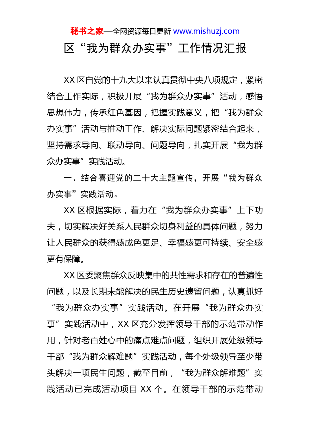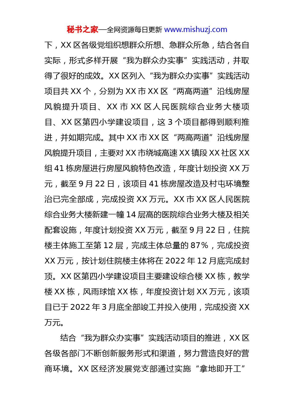 秘书之家—全网资源每日更新www.mishuzj.com区“我为群众办实事”工作情况汇报XX区自党的十九大以来认真贯彻中央八项规定,紧密结合工作实际,积极开展“我为群众办实事”活动,感悟思想伟力,传承红色基因,把握实践意义,把“我为群众办实事”活动与推动工作、解决实际问题紧密结合起来,坚持需求导向、联动导向、问题导向,扎实开展“我为群众办实事”实践活动。一、结合喜迎党的二十大主题宣传,开展“我为群众办实事”实践活动。XX区根据实际,着力在“我为群众办实事”上下功夫,切实解决好关系人民群众切身利益的具体问题,努力让人民群众的获得感成色更足、幸福感更可持续、安全感更有保障。XX区委聚焦群众反映集中的共性需求和存在的普遍性问题,以及长期未能解决的民生历史遗留问题,认真抓好“我为群众办实事”实践活动。在开展“我为群众办实事”实践活动中,XX区充分发挥领导干部的示范带动作用,针对老百姓心中的痛点难点问题,组织开展处级领导干部“我为群众解难题”实践活动,每个处级领导至少带头解决一项民生问题,截至目前,“我为群众解难题”实践活动已完成活动项目XX个。在领导干部的示范带动秘书之家—全网资源每日更新www.mishuzj.com下,XX区各级党组织想群众所想、急群众所急,结合各自实际,形式多样开展“我为群众办实事”实践活动,并取得了很好的成效。XX区列入“我为群众办实事”实践活动项目共XX个,分别为XX市XX区“两高两道”沿线房屋风貌提升项目、XX市XX区人民医院综合业务大楼项目、XX区第四小学建设项目,这3个项目都得到顺利推进,并如期完成。其中XX市XX区“两高两道”沿线房屋风貌提升项目,主要对XX市绕城高速XX镇段XX社区XX组41栋房屋进行房屋风貌特色改造,年度计划投资XX万元,截至9月22日,该项目41栋房屋改造及村屯环境整治已完全部成,完成投资XX万元。XX市XX区人民医院综合业务大楼新建一幢14层高的医院综合业务大楼及相关配套设施,年度计划投资XX万元,截至9月22日,住院楼主体施工至第12层,完成主体总量的87%,完成投资XX万元,按计划住院楼主体将在2022年12月底完成封顶。XX区第四小学建设项目主要建设综合楼XX栋,教学楼XX栋,风雨球馆XX栋,年度投资计划XX万元,该项目已于2022年3月底全部竣工并投入使用,完成投资XX万元。结合“我为群众办实事”实践活动项目的推进,XX区各级各部门不断创新服务形式和渠道,努力营造良好的营商环境。XX区经济发展党支部通过实施“拿地即开工”秘书之家—全网资源每日更新www.mishuzj.com“一窗受理”“代办服务”“12345政府服务热线”为企业和群众解难题,办实事,有效提升了广大群众的满意度。为方便居民接种疫苗,XX人民医院率先在社区、商场设立新冠疫苗免费接种点,在开放3-12岁人群疫苗接种后,XX区组织医务人员深入学校开展上门接种疫苗服务工作,有效提高了辖区群众疫苗接种率。XX镇以党员为核心力量开展志愿服务活动,分组分片深入到各家各户,协助社区点对点、人对人做好新型冠状病毒防疫宣传发动工作,接送群众到接种点接种疫苗,解决了社区居民出门打疫苗难的问题。为有效解决办事群众“多地跑”“折返跑”“多次跑”等问题,XX区推出新生儿“出生即入户”便民“微改革”措施,实施“一窗受理、一网流转、一次办成、一套送达”联办机制,加快推进政务服务“简易办”,推动新生儿“出生即入户”便民“微改革”落地实现。为解决个人住房产权历史遗留问题,XX区成立了专门工作领导小组,召开了区、镇、社区、居民小组四级干部专题会议进行动员部署,建立督查督办机制,坚持督进度与督质量相结合,全力推动规划区范围内个人住房产权历史遗留问题的解决,把“我为群众办实事”实践活动推向了高潮,深得广大居民群众的普遍好评。二、存在的主要问题一是对党史学习教育常态化工作态度有所松懈。有些秘书之家—全网资源每日更新www.mishuzj.com部门对常态化开展党史学习教育不够重视,开展学习活动不够积极。二是对典型经验做法的挖掘力度不够。有些部门对在活动中涌现的典型经验做法挖掘深度不够,没有进行汇总上报。三、下一步工作打算XX区将继续严格贯彻中央八项规定,结合党史学习常态化持续推进“我为群众办实事”实践活动,切实为群众办好事、解难题。
