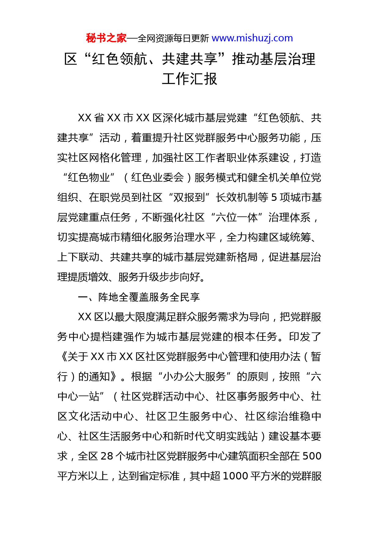 秘书之家—全网资源每日更新www.mishuzj.com区“红色领航、共建共享”推动基层治理工作汇报XX省XX市XX区深化城市基层党建“红色领航、共建共享”活动,着重提升社区党群服务中心服务功能,压实社区网格化管理,加强社区工作者职业体系建设,打造“红色物业”(红色业委会)服务模式和健全机关单位党组织、在职党员到社区“双报到”长效机制等5项城市基层党建重点任务,不断强化社区“六位一体”治理体系,切实提高城市精细化服务治理水平,全力构建区域统筹、上下联动、共建共享的城市基层党建新格局,促进基层治理提质增效、服务升级步步向好。一、阵地全覆盖服务全民享XX区以最大限度满足群众服务需求为导向,把党群服务中心提档建强作为城市基层党建的根本任务。印发了《关于XX市XX区社区党群服务中心管理和使用办法(暂行)的通知》。根据“小办公大服务”的原则,按照“六中心一站”(社区党群活动中心、社区事务服务中心、社区文化活动中心、社区卫生服务中心、社区综治维稳中心、社区生活服务中心和新时代文明实践站)建设基本要求,全区28个城市社区党群服务中心建筑面积全部在500平方米以上,达到省定标准,其中超1000平方米的党群服秘书之家—全网资源每日更新www.mishuzj.com务中心10个,占比达36%。为全方位服务满足党员群众多样化需求,御祥园、万和城、行宫等12个社区充分发挥党建引领作用,聚焦为民便民功能,重点围绕教业文体卫、老幼食行乐等关键因素,整合党建、政务和社会组织资源,以党群服务体系建设为基础,实现“群众需求在哪里,服务就跟进到哪里”,把党群服务中心打造成为党员群众想来、常来的幸福驿站。提升的党群服务中心为辖区居民提供技能培训、法律咨询、趣味活动等服务976次,为户外活动居民、环卫工人、快递员等群体提供歇脚、充电、乘凉等服务。同时,创新党群服务中心管理模式,各功能室开放后由各志愿者队伍负责管理运营,通过公示栏、微信小程序等平台发布开放时间、主题活动和服务流程,引导广大党员群众积极响应、有序参与。在政务服务上推行“最多跑一次”一站式服务,实行预约、代办等机制,积极推动区直部门下放审批服务事项,实现“数据跑起来、群众少跑腿”。二、社区“双报到”党员争先锋近年来,XX区大力推动区直机关企事业单位党组织和在职党员进社区“双报到”参与社区共建共治工作,积极引导全区广大在职党员干部亮身份、领岗位、践承诺,真正做到工作在单位、服务在社区。印发了《完善“双报到”制度筑牢社区治理“共同体”的通知》《XX区“双报秘书之家—全网资源每日更新www.mishuzj.com到”工作考核办法(试行)的通知》,开发了XX区“双报到”工作系统,跟踪式记录每名在职党员参加社区活动情况。区委组织部将党员干部到社区报到参与工作情况纳入对干部考察识别重要内容,推动干部考察识别向8小时以外生活圈延伸,将考评结果作为党员干部评先选优、年终考核的重要依据。健全社区“大党委”联席会议制度,推进街道社区党建、单位党建、行业党建互联互动、共驻共建。目前,全区62个机关企事业单位党组织1820名党员走进社区,根据不同特点、不同特长纳入社区志愿服务队认领工作岗位,其中1188人认领了线上楼长与线下楼长,协同共进参与社区治理。XX区结合单位、社区两类主体,围绕资源、需求、项目制定“三张清单”,推动机关企事业单位带资源、带项目、带政策帮助社区优化治理,形成党组织主导、多方参与、共建共享的工作格局。近几年来,共完成共建项目180个,全区各社区共组织开展公益性活动500余场次,解决居民群众微需求300余个,直接服务群众4万余人次。三、全科“小网格”党建大平台近年来,XX区以“六治融合”打造城市社区治理共同体,按照党建工作到网格、服务群众到网格、社会治理到网格的要求,依据区域属性、人口特点等要素,将上级部秘书之家—全网资源每日更新www.mishuzj.com门在社区设置的多个网格整合为一个综合网格,统筹网格内党建、综治、维稳、应急、社保、城管等各领域工作,实现党建“一根针”,串起网格治理“千条线”,有效解决了基层治理中的难题,不断推进、完善和谐社区建设。在网格设置上,以社区单位为基础,将街道社区划分成若干网格单元,搭建基层治理的网格框架,建立纵横有致、节节相连的网格体系,每个社区由1名街道领导班子成员包联,每个小区(楼院)由1名社区干部担任网格长,由若干名网格党支部书记、楼栋长、单元长和在职党员等担任兼职网格员,整合社区各类管理服务资源,组建了各具特色的网格服务团队69支,实行组团式、专业化、联动式服务。结合在职党员进社区报到,按照“大党委+党支部+党小组”的组织体系,将在职党员全部编入社区网格党组织,把社区各项事务和社区信息逐项分解定位到每个网格单元,明确街道、社区工作者、在职党员在网格内的职责任务,要求各网格员定期入网格进行巡查,第一时间掌握群众诉求、解决实际问题,更好发挥居民自我参与、自我管理、自我监督、自我服务的作用。四、打造“红色物业”破解治理难题物业服务直接关系着居民的生活质量。从2018年起,XX区持续推进“红色物业”“红色业委会”工作,着秘书之家—全网资源每日更新www.mishuzj.com力破解长期