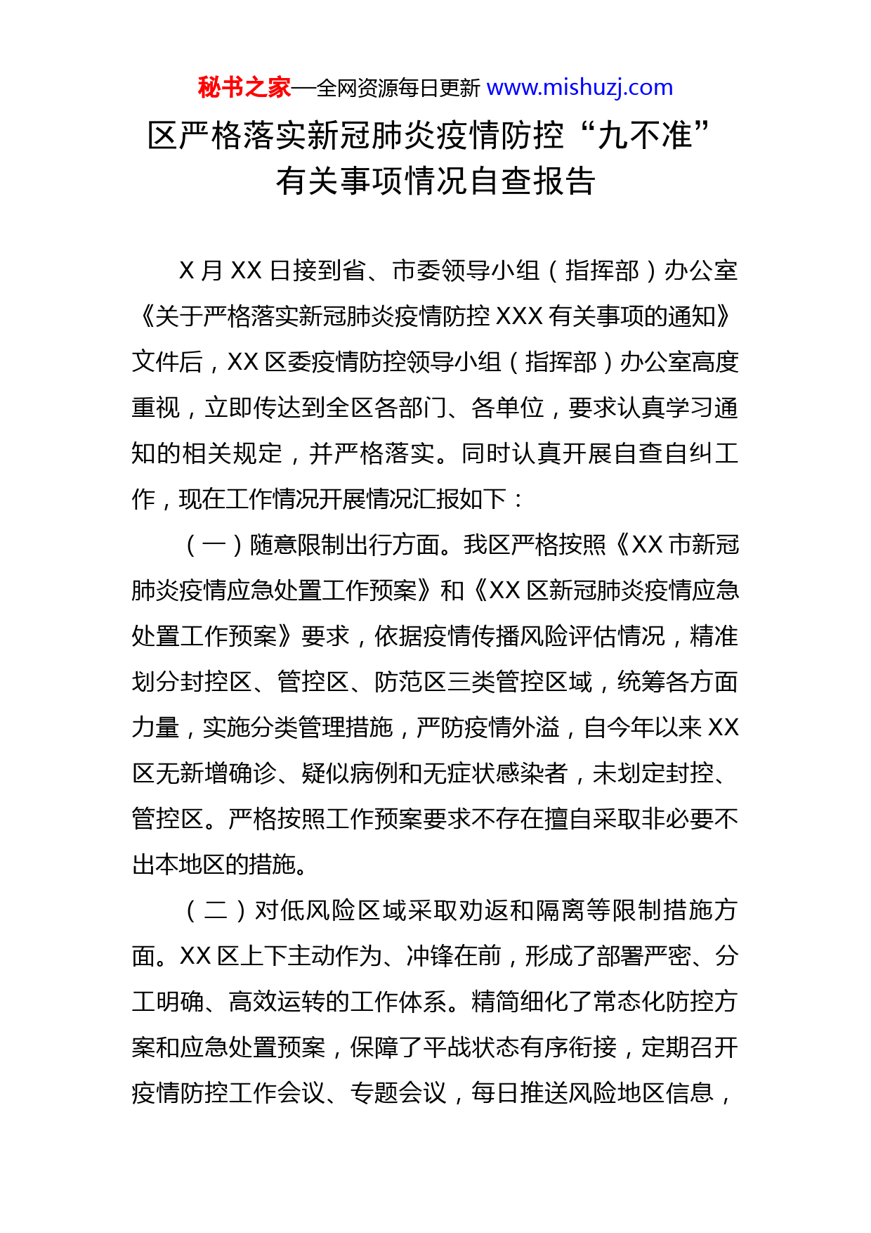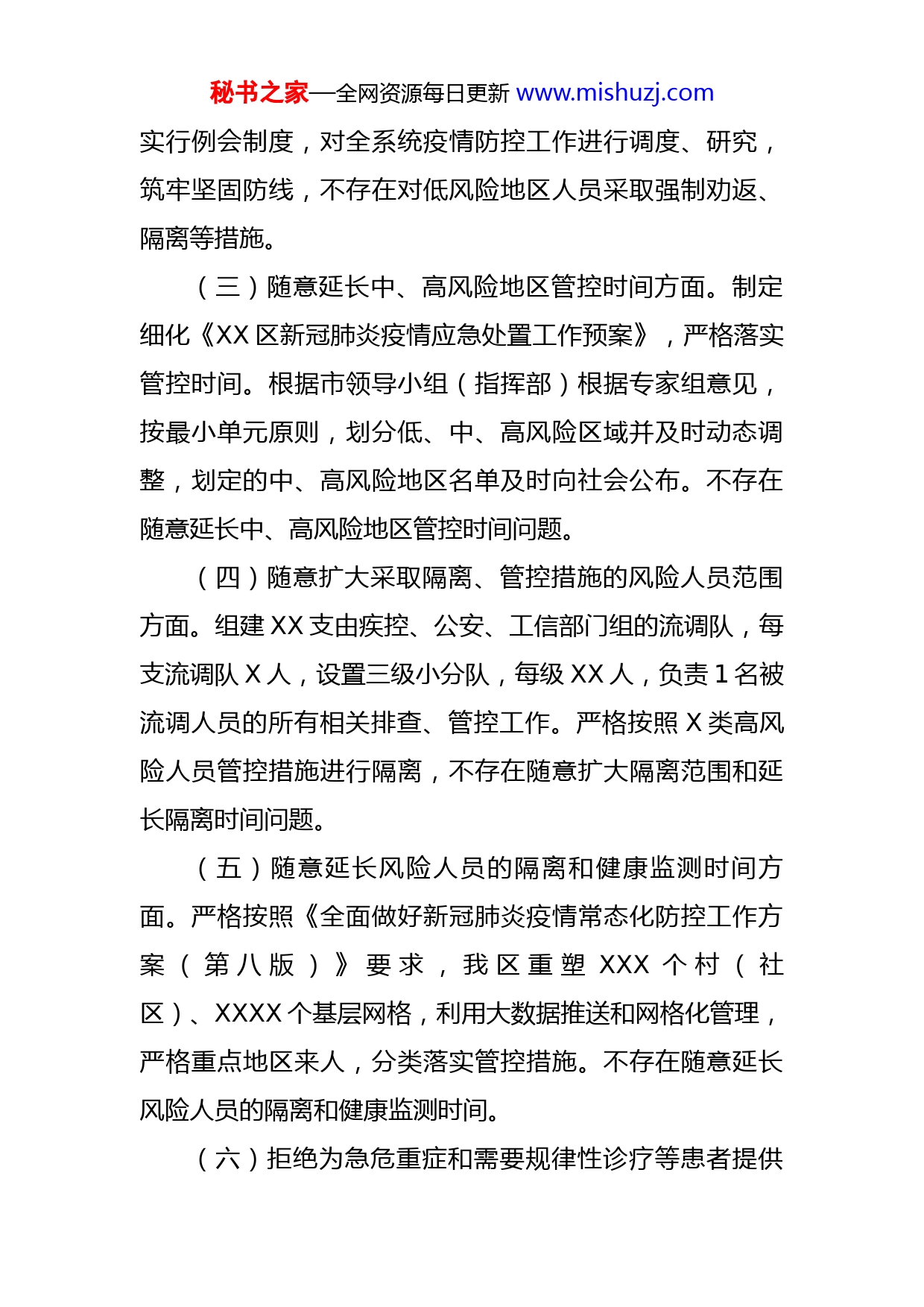 秘书之家—全网资源每日更新www.mishuzj.com区严格落实新冠肺炎疫情防控“九不准”有关事项情况自查报告X月XX日接到省、市委领导小组(指挥部)办公室《关于严格落实新冠肺炎疫情防控XXX有关事项的通知》文件后,XX区委疫情防控领导小组(指挥部)办公室高度重视,立即传达到全区各部门、各单位,要求认真学习通知的相关规定,并严格落实。同时认真开展自查自纠工作,现在工作情况开展情况汇报如下:(一)随意限制出行方面。我区严格按照《XX市新冠肺炎疫情应急处置工作预案》和《XX区新冠肺炎疫情应急处置工作预案》要求,依据疫情传播风险评估情况,精准划分封控区、管控区、防范区三类管控区域,统筹各方面力量,实施分类管理措施,严防疫情外溢,自今年以来XX区无新增确诊、疑似病例和无症状感染者,未划定封控、管控区。严格按照工作预案要求不存在擅自采取非必要不出本地区的措施。(二)对低风险区域采取劝返和隔离等限制措施方面。XX区上下主动作为、冲锋在前,形成了部署严密、分工明确、高效运转的工作体系。精简细化了常态化防控方案和应急处置预案,保障了平战状态有序衔接,定期召开疫情防控工作会议、专题会议,每日推送风险地区信息,秘书之家—全网资源每日更新www.mishuzj.com实行例会制度,对全系统疫情防控工作进行调度、研究,筑牢坚固防线,不存在对低风险地区人员采取强制劝返、隔离等措施。(三)随意延长中、高风险地区管控时间方面。制定细化《XX区新冠肺炎疫情应急处置工作预案》,严格落实管控时间。根据市领导小组(指挥部)根据专家组意见,按最小单元原则,划分低、中、高风险区域并及时动态调整,划定的中、高风险地区名单及时向社会公布。不存在随意延长中、高风险地区管控时间问题。(四)随意扩大采取隔离、管控措施的风险人员范围方面。组建XX支由疾控、公安、工信部门组的流调队,每支流调队X人,设置三级小分队,每级XX人,负责1名被流调人员的所有相关排查、管控工作。严格按照X类高风险人员管控措施进行隔离,不存在随意扩大隔离范围和延长隔离时间问题。(五)随意延长风险人员的隔离和健康监测时间方面。严格按照《全面做好新冠肺炎疫情常态化防控工作方案(第八版)》要求,我区重塑XXX个村(社区)、XXXX个基层网格,利用大数据推送和网格化管理,严格重点地区来人,分类落实管控措施。不存在随意延长风险人员的隔离和健康监测时间。(六)拒绝为急危重症和需要规律性诊疗等患者提供秘书之家—全网资源每日更新www.mishuzj.com医疗服务方面。依托XX区XX镇卫生院基础医疗资源,对闲置的XX镇中心小学,按院感要求,进行房屋、通道改建,安装集中供氧、集中吸引、中心呼叫、新风系统,改造污水处理设施,添置病床及配套设施,改造建设成为区级定点收治医院,床位规模XXX张,实现医疗资源统一调配、患者集中收治。设置XX市XXXXXX医院XXXXX院区为“一点两区”救治医院。XX市XXXXXXXXX院区在就诊区域和病区规范设置“三区两通道”,设置救治床位XX张。具备手术室、产房、导管室、血透室、放疗设备等能够满足各种特殊类型患者救治的场所。具备急危重症、手术、血透处置能力以及孕产妇、新生儿等重点人群救治能力,配足配齐急抢救、重症救治、监护、检测等仪器设备,以及必要的药品、耗材等。病房设置独立卫生间,单人单间隔离治疗,与其他诊疗人员出入分离、诊区分离、人员分离、就诊路线分离,严格闭环管理。岱岳区发放“一点两区”救治医院电子就诊卡至各镇街、各村居,截至当前,接诊XXX人次。(七)对离校返乡的高校学生采取隔离等措施方面。严格按照《关于做好入X返X高校学生返乡疫情防控工作的通知》要求,落实分类管控,对各高校学生提前沟通返回日期及方式,对于有疫情的地区的学生,高校内如果没有疫情的且实施7天以上封闭管理结束后,学生持48小时秘书之家—全网资源每日更新www.mishuzj.com内核酸检测阴性证明离校的不在集中隔离,实施7天居家健康监测。对省外低风险地区返乡的学生,要求持48时核酸阴性证明,到家后落实第一天、第三天核酸检测,结果反馈前,学生不得前往人员密集场所和参加聚集性活动。(八)随意设置防疫检查点,限制符合条件的客、货车司乘人员同行方面。目前我区共设置X处检查点,各交通卡口严格落实市指挥部《关于贯彻落实X指发〔2022〕XX号文件的通知》(X指发〔2022〕XX号)和XX市保障物流畅通促进产业链供应链稳定工作机制办公室《关于进一步做好物流保通保畅工作的通知》要求,对健康码绿色、持48小时内核酸检测阴性证明、体温检测正常的,正常放行。无48小时内核酸检测阴性证明的,采用“抗原检测+核酸检测”的方式,实行即采即走即追制度。通过采取优化检测车道设置,增加执勤人员,快检快放等措施,保障物流运输,坚决杜绝“层层加码”、“过度防控”现象。(九)随意关闭低风险地区保障正常生产生活的场所方面。我区严格根据省、市指挥部相关要求和会议精神,按照“疫情要防住、经济要稳住、发展要安全”总体策略,落实精准防控、对与群众生产生活密切相关的商超、农贸市场、餐饮住宿等场所开放诉求通道、绿色通道,对落实好疫情防控各项措施的民生场所一直未关闭。秘书之家—全网资源每日更新www.mishuzj.comXX区现行疫情防控政策