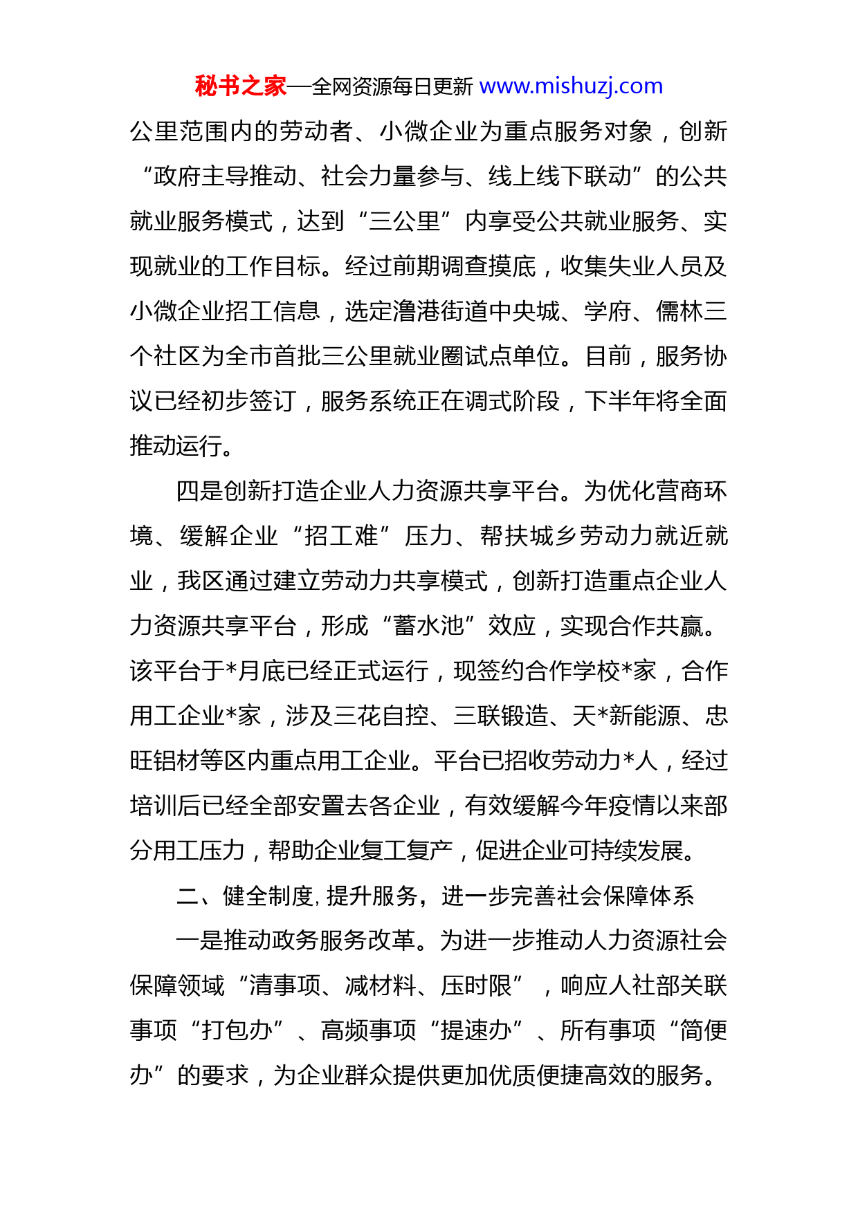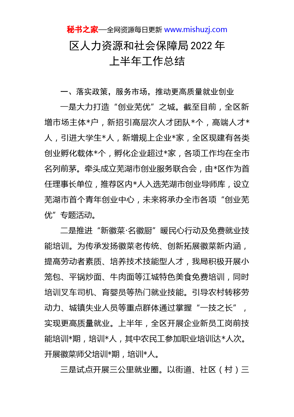 秘书之家—全网资源每日更新www.mishuzj.com区人力资源和社会保障局2022年上半年工作总结一、落实政策,服务市场,推动更高质量就业创业一是大力打造“创业芜优”之城。截至目前,全区新增市场主体户,新招引高层次人才团队个,高端人才人,引进大学生人,新增规上企业家,全区现建有各类创业孵化载体个,孵化企业超过家,各项工作均在全市名列前茅。牵头成立芜湖市创业服务联合会,由区作为首任理事长单位,推荐区内人入选芜湖市创业导师库,设立芜湖市首个青年创业中心,未来将承办全市各项“创业芜优”专题活动。二是推进“新徽菜·名徽厨”暖民心行动及免费就业技能培训。为传承发扬徽菜老传统、创新拓展徽菜新内涵,提高劳动者素质、培养技术技能型人才,我局积极开展小笼包、平锅炒面、牛肉面等江城特色美食免费培训,同时培训叉车司机、育婴员等热门就业技能。引导农村转移劳动力、城镇失业人员等重点群体通过掌握“一技之长”,实现更高质量就业。上半年,全区开展企业新员工岗前技能培训期,培训人,其中农民工参加职业培训达人次。开展徽菜师父培训期,培训人。三是试点开展三公里就业圈。以街道、社区(村)三秘书之家—全网资源每日更新www.mishuzj.com公里范围内的劳动者、小微企业为重点服务对象,创新“政府主导推动、社会力量参与、线上线下联动”的公共就业服务模式,达到“三公里”内享受公共就业服务、实现就业的工作目标。经过前期调查摸底,收集失业人员及小微企业招工信息,选定澛港街道中央城、学府、儒林三个社区为全市首批三公里就业圈试点单位。目前,服务协议已经初步签订,服务系统正在调式阶段,下半年将全面推动运行。四是创新打造企业人力资源共享平台。为优化营商环境、缓解企业“招工难”压力、帮扶城乡劳动力就近就业,我区通过建立劳动力共享模式,创新打造重点企业人力资源共享平台,形成“蓄水池”效应,实现合作共赢。该平台于月底已经正式运行,现签约合作学校家,合作用工企业家,涉及三花自控、三联锻造、天新能源、忠旺铝材等区内重点用工企业。平台已招收劳动力人,经过培训后已经全部安置去各企业,有效缓解今年疫情以来部分用工压力,帮助企业复工复产,促进企业可持续发展。二、健全制度,提升服务,进一步完善社会保障体系一是推动政务服务改革。为进一步推动人力资源社会保障领域“清事项、减材料、压时限”,响应人社部关联事项“打包办”、高频事项“提速办”、所有事项“简便办”的要求,为企业群众提供更加优质便捷高效的服务。秘书之家—全网资源每日更新www.mishuzj.com区人社局借助市人社独创的“打包办”系统,在全区开展人社系统业务打包办,区社保中心承接个包、项业务,属地街道、村居负责灵活就业参保、个人参保证明打印、灵活就业补贴等项高频简单业务。目前实施方案已经下发,计划月正式启动。二是落实助企纾困专项政策。为降低疫情对经济发展的影响,积极落实上级部门出台的各类专项援企护企政策,从不同维度扶持企业发展。-月,落实失业保险稳岗返还政策,开展“免报直发”企业家,开展大型企业和劳务派遣企业申报家,累计兑现资金万元;针对特定行业的困难企业实施社保费用缓交政策,目前共实施缓交企业家,预计全年缓交金额万元。三是开展社保基金管理提升年活动。今年以来,省集中系统开始对接国家平台,为保障基金数据安全,强力推进各险种的部省市级风险排查、疑点数据、基金追缴等工作。成立区社会保险基金管理提升年行动领导小组,完善各项工作制度,规范银行协议和岗位权限,落实专业会计人员,全面推进资格认证工作,加强基金监管,落实专项清理数据。四是开展提升居保人均缴费档次专项行动。-月累计调整缴费档次人次,提升平均缴费水平元。完成城乡居民养老保险参保人,其中正常参保人数完成人,享受待秘书之家—全网资源每日更新www.mishuzj.com遇人数为人,待遇享受人数发放率为%,正常参保人数中续保缴费人数为人,完成目标任务(人)的%;根据居保扶贫相关政策,我区为名特殊困难群体人员代缴年度保费,共计代缴金额万元。三、创新管理,科学发展,不断提升人事人才建设一是职称晋升、转岗、认定工作。制定出台了《关于印发<区事业单位管理岗位职员等级晋升制度实施方案>的通知》(办〔〕号)和《区事业单位管理岗位职员等级晋升实施细则》,召集全区事业单位及主管部门召开工作布置会议,于全市各区率先启动事业单位管理岗位职员等级晋升工作。做好区内事业人员专技岗位职称晋升、转岗工作,审批专技岗位职工职称晋升人,转岗人。完成全区企事业单位人初级职称认定工作;完成全区教育系统人初级职称认定工作。二是做好本区人事招考工作。规范化开展各类人事招考工作,不断为政府事业发展招贤纳士。本年度事业单位公开招聘考试报名审核、笔试工作已完成,接下来将根据市局要求的序时进度及疫情防控工作要求做好面试、体检、政审等工作。开展编外聘用工作人员公开招聘考试场,为区投资促进中心、区法院招录人员人,目前均已上岗;招录辅警人,现已完成体检工作。三是推进紫云英人才计划。以人才为突破口,跑出人秘书之家—全网资源每日更新www.mishuzj.com才集聚“加速度”,积极引导企业