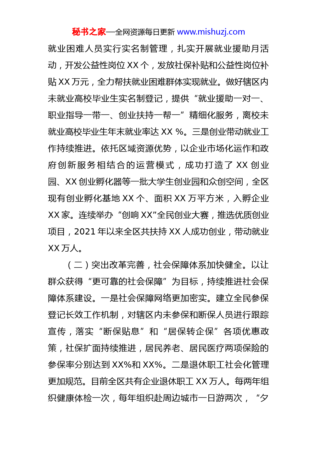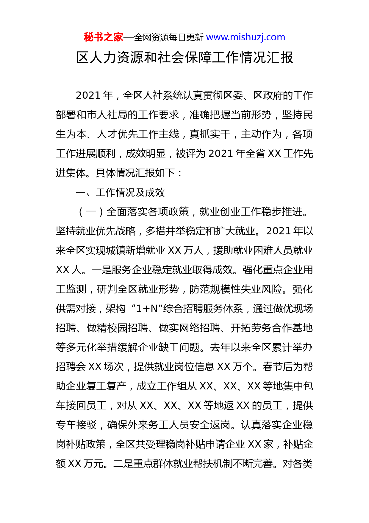 秘书之家—全网资源每日更新www.mishuzj.com区人力资源和社会保障工作情况汇报2021年,全区人社系统认真贯彻区委、区政府的工作部署和市人社局的工作要求,准确把握当前形势,坚持民生为本、人才优先工作主线,真抓实干,主动作为,各项工作进展顺利,成效明显,被评为2021年全省XX工作先进集体。具体情况汇报如下:一、工作情况及成效(一)全面落实各项政策,就业创业工作稳步推进。坚持就业优先战略,多措并举稳定和扩大就业。2021年以来全区实现城镇新增就业XX万人,援助就业困难人员就业XX人。一是服务企业稳定就业取得成效。强化重点企业用工监测,研判全区就业形势,防范规模性失业风险。强化供需对接,架构“1+N”综合招聘服务体系,通过做优现场招聘、做精校园招聘、做实网络招聘、开拓劳务合作基地等多元化举措缓解企业缺工问题。去年以来全区累计举办招聘会XX场次,提供就业岗位信息XX万个。春节后为帮助企业复工复产,成立工作组从XX、XX、XX等地集中包车接回员工,对从XX、XX、XX等地返XX的员工,提供专车接驳,确保外来务工人员安全返岗。认真落实企业稳岗补贴政策,全区共受理稳岗补贴申请企业XX家,补贴金额XX万元。二是重点群体就业帮扶机制不断完善。对各类秘书之家—全网资源每日更新www.mishuzj.com就业困难人员实行实名制管理,扎实开展就业援助月活动,开发公益性岗位XX个,发放社保补贴和公益性岗位补贴XX万元,全力帮扶就业困难群体实现就业。做好辖区内未就业高校毕业生实名制登记,提供“就业援助一对一、职业指导一带一、创业扶持一帮一”精细化服务,离校未就业高校毕业生年末就业率达XX%。三是创业带动就业工作持续推进。依托区域资源优势,以企业市场化运作和政府创新服务相结合的运营模式,成功打造了XX创业园、XX创业孵化器等一批大学生创业园和众创空间,全区现有创业孵化基地XX个、面积XX万平方米,入孵企业XX家。连续举办“创响XX”全民创业大赛,推选优质创业项目,2021年以来全区共扶持XX人成功创业,带动就业XX万人。(二)突出改革完善,社会保障体系加快健全。以让群众获得“更可靠的社会保障”为目标,持续推进社会保障体系建设。一是社会保障网络更加密实。建立全民参保登记长效工作机制,对辖区内未参保和断保人员进行跟踪宣传,落实“断保贴息”和“居保转企保”各项优惠政策,社保扩面持续推进,居民养老、居民医疗两项保险的参保率分别达到XX%和XX%。二是退休职工社会化管理更加规范。目前全区共有企业退休职工XX万人。每两年组织健康体检一次,每年组织赴周边城市一日游两次,“夕秘书之家—全网资源每日更新www.mishuzj.com阳美”重阳节系列活动、“XX老人看家乡”等活动,受到了退休职工的普遍欢迎,形成了一定的品牌效应。(三)助力产业强区,人才队伍支撑更为坚实。着力创新人才工作体制机制,为我区产业高质量发展提供坚强的支撑和保障。2021年引进大学生XX人、高层次人才XX人;新增高技能人才XX人。一是人才引进渠道有效拓宽。搭建合作桥梁,与XX招聘合作,整体推介XX区域优势、人才政策、重点企业人才需求,加快我区紧缺人才和高层次人才的引进。2021年共有XX家企业在XX招聘网站发布职位XX个,收到简历XX份。深化校园招聘,深入推进“XXX校园行”活动,先后组织我区XX余家规模骨干企业赴高校举办专场招聘,提供就业岗位XX余个,达成就业意向XX余人次。在疫情防控常态化背景下,创新推出“云校招”、“直播送岗”活动,畅通供需对接。二是人才培养工作稳步推进。广泛宣传,精心组织省“双创计划”、市“XX人才计划”、“XX之光”人才引育计划等各类人才项目宣传推荐、项目申报工作。建立了XX家重点引才企业信息库,为申报各类人才项目提供精准化服务。目前全区有享受政府特殊津贴人员XX人,省、市有突出贡献中青年专家XX人,XX省企业首席技师XX人,XX市技术能手XX人。强化博士后工作站管理,目前全区有博士后工作站XX家。三是人才服务体系加快构建。建立政企定点秘书之家—全网资源每日更新www.mishuzj.com联系机制,分板块建立企业人事经理微信群和QQ群,每季组织一次HR沙龙;开展“人社专项服务月”活动,强化对企服务。组建高层次人才一站式服务中心,为高端人才提供项目申报、资金扶持、子女入学等全方位保姆式服务。每年举办“交流、融合、进步”博士交流活动,增进高层次人才间的交流。四是事业单位工作队伍建设取得成效。严格按照规定程序,做好事业人员的招录工作,2021年共招录事业人员XX名。主办区级机关“干部大讲堂”XX期,邀请知名专家学者授课,区级机关中层干部XX余人次参加培训。机关部门编外用工管理逐步得到规范。(四)坚持依法治理,劳动关系保持和谐稳定。主动应对经济下行和新冠疫情对劳动关系的冲击,加大劳动关系调控力度,2021年共处理各类劳动争议案件XX起,其中仲裁立案XX件,监察立案XX件,劳动保障监察举报投诉案件结案率、仲裁委立案处理案件结案率均达100%;为XX家企业办理不定时工作制和综合计算工时工作制审批,劳动关系总体平稳可控。一是源头防控更见成效。经常性走访基层、园区、重点企业,注重风险排查,发现苗头性问题及时介入、靠前指导;建立定期通报和突发特报制度,每季度向各板块主要负责人和相关部门通报群体性纠