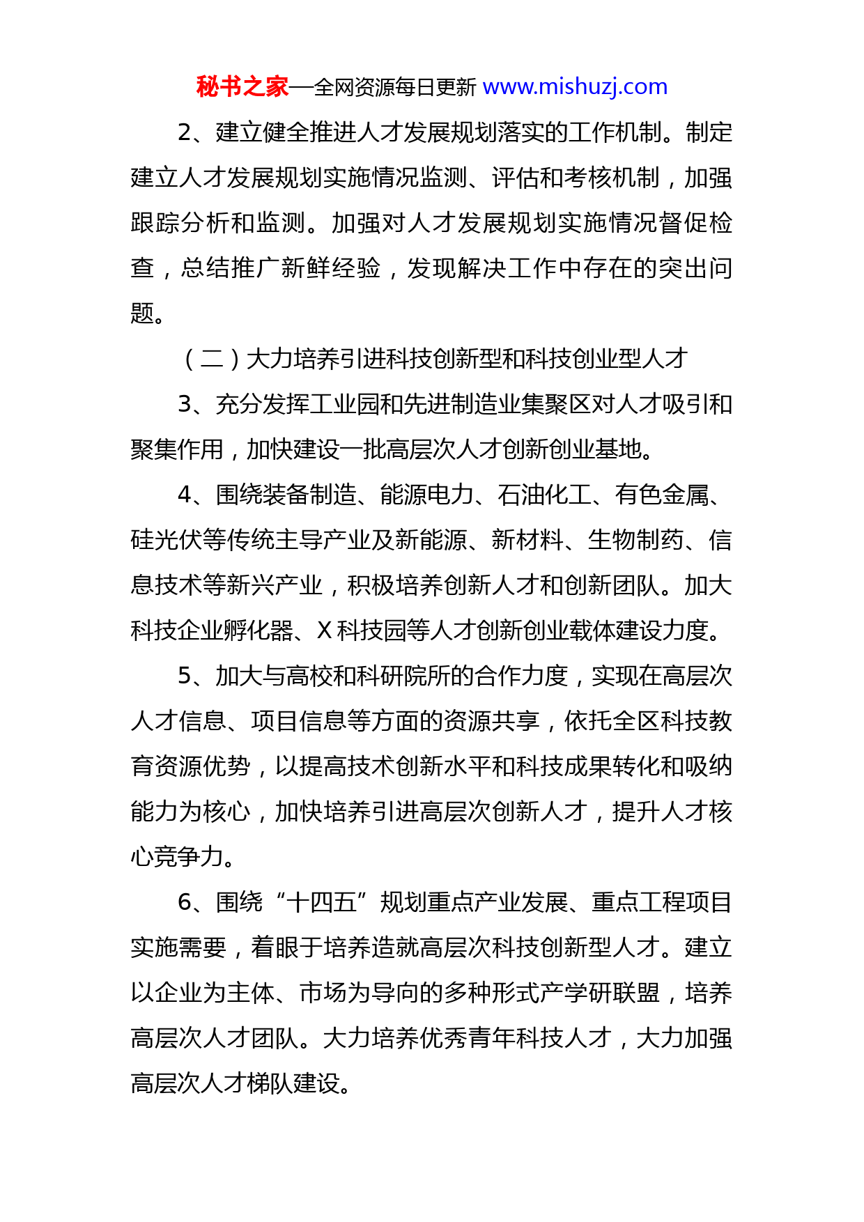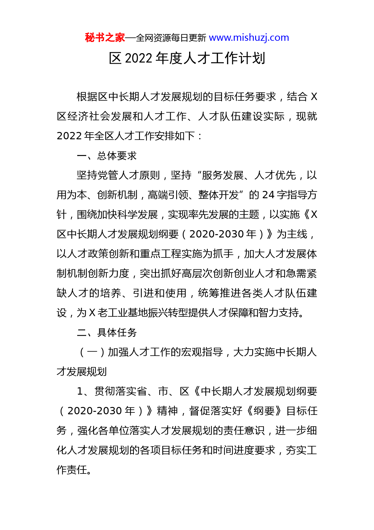 秘书之家—全网资源每日更新www.mishuzj.com区2022年度人才工作计划根据区中长期人才发展规划的目标任务要求,结合X区经济社会发展和人才工作、人才队伍建设实际,现就2022年全区人才工作安排如下:一、总体要求坚持党管人才原则,坚持“服务发展、人才优先,以用为本、创新机制,高端引领、整体开发”的24字指导方针,围绕加快科学发展,实现率先发展的主题,以实施《X区中长期人才发展规划纲要(2020-2030年)》为主线,以人才政策创新和重点工程实施为抓手,加大人才发展体制机制创新力度,突出抓好高层次创新创业人才和急需紧缺人才的培养、引进和使用,统筹推进各类人才队伍建设,为X老工业基地振兴转型提供人才保障和智力支持。二、具体任务(一)加强人才工作的宏观指导,大力实施中长期人才发展规划1、贯彻落实省、市、区《中长期人才发展规划纲要(2020-2030年)》精神,督促落实好《纲要》目标任务,强化各单位落实人才发展规划的责任意识,进一步细化人才发展规划的各项目标任务和时间进度要求,夯实工作责任。秘书之家—全网资源每日更新www.mishuzj.com2、建立健全推进人才发展规划落实的工作机制。制定建立人才发展规划实施情况监测、评估和考核机制,加强跟踪分析和监测。加强对人才发展规划实施情况督促检查,总结推广新鲜经验,发现解决工作中存在的突出问题。(二)大力培养引进科技创新型和科技创业型人才3、充分发挥工业园和先进制造业集聚区对人才吸引和聚集作用,加快建设一批高层次人才创新创业基地。4、围绕装备制造、能源电力、石油化工、有色金属、硅光伏等传统主导产业及新能源、新材料、生物制药、信息技术等新兴产业,积极培养创新人才和创新团队。加大科技企业孵化器、X科技园等人才创新创业载体建设力度。5、加大与高校和科研院所的合作力度,实现在高层次人才信息、项目信息等方面的资源共享,依托全区科技教育资源优势,以提高技术创新水平和科技成果转化和吸纳能力为核心,加快培养引进高层次创新人才,提升人才核心竞争力。6、围绕“十四五”规划重点产业发展、重点工程项目实施需要,着眼于培养造就高层次科技创新型人才。建立以企业为主体、市场为导向的多种形式产学研联盟,培养高层次人才团队。大力培养优秀青年科技人才,大力加强高层次人才梯队建设。秘书之家—全网资源每日更新www.mishuzj.com7、加大对科技创业型人才支持力度,优化创业风险投融资机制,完善促进科技成果转化和技术转移的财税政策。鼓励科技人员带成果、带项目进行科技创业。进一步加强企业孵化器等基础设施建设。鼓励支持高校毕业生自主创业。(三)重点实施各类人才发展重点工程,统筹推进各类人才队伍建设8、大力实施“创新能力提升工程”,邀请国家级专家学者,组织举办2期高规格培训班,1期高层次专业技术人才培训班。9、大力实施“企业管理人才培训工程”,培训企业经营管理人才200人。10、继续抓好技能人才岗位练兵活动,发现和重点培养一批有发展潜力,示范带动作用突出的高技能人才。11、积极开展基层人才振兴工作。按照农村实用人才“双培双带工程”目标任务,分层次培训300名农村实用人才。做好农村基层人才振兴计划、基层人才援助计划和大学生村干部工作。12、启动实施“社会工作人才建设工程”,根据社会化管理的需要,选聘100名左右高学历人才充实到社区一线,举办2期社会工作人才专题培训班,利用高等院校和培训机构资源,开展社会工作人才技能培训。积极研究社秘书之家—全网资源每日更新www.mishuzj.com会工作岗位设置和人才配置的方法。13、加强人才培养培训基地建设,整合人才培养培训资源,在河南科技大学等知名高校建立高层次人才培训培养基地。(四)积极推进人才政策创新,进一步完善人才发展体制机制14、一步完善政府宏观管理、市场有效配置、单位自主用人、人才自主择业的人才管理体制。大力发展人才服务业,积极培育专业化人才资源服务机构。15、优化人才投入机制,落实人才发展专项资金,保障人才工作重大项目实施。进一步整合投入资源,充分发挥财政资金的导向作用,鼓励和引导企业、金融机构和社会加大对人才发展的投入。16、优化人才保障激励机制,探索知识、技术、管理、技能等生产要素参与分配的新办法。扩大对农村、非公有制经济组织和社会组织人才的社会保障覆盖面。健全以政府奖励为导向,用人单位和社会力量为主体的人才奖励体系。(五)发挥示范和引领作用,认真做好人才宣传17、加大人才宣传工作力度。拓宽人才宣传渠道,优化人才宣传工作机制,以宣传人才发展新思想、新理念为重点,加强对实施人才发展规划情况、人才工作政策法秘书之家—全网资源每日更新www.mishuzj.com规、人才工作先进典型和优秀人才典型的宣传,推进一批典型,营造良好氛围。18、积极宣传人才工作和人才队伍建设方面的成果,扩大人才工作的影响力。利用《X要闻》、X区人民政府网站等报纸媒体,大力宣传人才工作,重视反映人才工作动态和人才舆情。19、建设高素质的人才工作队伍。采取举办专题培训、学习考察等方式,提高人才工作者的研究能力、创新能力、协调能力和执行能力。三、有关要求1、加强领导,增强“一把手抓第一资源”的责任意识。区相