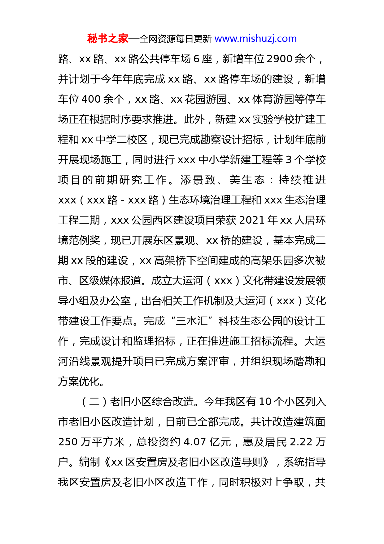 秘书之家—全网资源每日更新www.mishuzj.com区住建局2022年度工作总结及2023年度工作思路今年以来,住建局在区委区政府的坚强领导下,以更加坚决的态度、更加有力的措施、更加务实的作风,坚定信心、破解难题,系统思维抓落实、攻坚克难抓落实、高效闭环抓落实,全力将xx区打造成为具有区域引领作用、体现高水平发展的产城融合示范区。一、工作开展情况(一)全力推进项目建设。今年以来,住建局承担了45个区本级政府性建设项目,新建28个,续建17个,项目总投资78.85亿元。目前,各项目均已按照时序进度开展前期及施工工作。通路桥、促城建:xx路和xx路大修工程正在推进施工招标,计划四季度开工建设。xxx科创城核心区已完成xx路提升的市政和景观施工工作,正在进行xx大道、xx路和xx北路3条道路的市政和景观方案深化。同时,积极推动xx路南延、xx路南延、跨xxx通道等区级重点道桥方案谋划,配合市级部门推进xx大桥、xxx路快速化、Gxxx新区段快速化改造、地铁4号线2期和5号线等重大工程,参与xxx路(xxx立交—具区路)快速化改造工程等7个项目的前期方案论证等相关工作。保民生、谋发展:建成xxx路、xx路、xx路、xx秘书之家—全网资源每日更新www.mishuzj.com路、xx路、xx路公共停车场6座,新增车位2900余个,并计划于今年年底完成xx路、xx路停车场的建设,新增车位400余个,xx路、xx花园游园、xx体育游园等停车场正在根据时序要求推进。此外,新建xx实验学校扩建工程和xx中学二校区,现已完成勘察设计招标,计划年底前开展现场施工,同时进行xxx中小学新建工程等3个学校项目的前期研究工作。添景致、美生态:持续推进xxx(xxx路-xxx路)生态环境治理工程和xxx生态治理工程二期,xxx公园西区建设项目荣获2021年xx人居环境范例奖,现已开展东区景观、xx桥的建设,基本完成二期xx段的建设,xx高架桥下空间建成的高架乐园多次被市、区级媒体报道。成立大运河(xxx)文化带建设发展领导小组及办公室,出台相关工作机制及大运河(xxx)文化带建设工作要点。完成“三水汇”科技生态公园的设计工作,完成设计和监理招标,正在推进施工招标流程。大运河沿线景观提升项目已完成方案评审,并组织现场踏勘和方案优化。(二)老旧小区综合改造。今年我区有10个小区列入市老旧小区改造计划,目前已全部完成。共计改造建筑面250万平方米,总投资约4.07亿元,惠及居民2.22万户。编制《xx区安置房及老旧小区改造导则》,系统指导我区安置房及老旧小区改造工作,同时积极对上争取,共秘书之家—全网资源每日更新www.mishuzj.com争取到中央预算资金2783万元,省级引导资金380万元。对于明年的改造任务,未雨绸缪、提前梳理明年改造计划,确保列入2023年省库项目的小区在今年11月底前开工建设,始终保持我区老旧小区改造工作走在全市前列。二次供水改造方面,完成15个小区的改造工作,超额完成年度目标任务。既有住宅加装电梯方面,按照增设储备一批、开工一批的电梯加装项目管理模式,目前已完成11台电梯加装工作,27台电梯的审批工作,确保完成今年25台电梯加装工作,力争我区既有住宅加装电梯工作走在全市前列。电瓶车充电桩(位)建设方面,提前完成15个小区7500个充电桩(位)的建设工作,完成率150%,超额完成年度目标任务。居民休闲设施更新改造方面,共完成58个凉亭和31处廊架的维修改造工作,同时新增凉亭20个,廊架3处,通过凉亭廊架“小改造”,加码群众“微幸福”。(三)用心雕琢美丽宜居城市。xxx村拟列入第六批中国传统村落名录村落名单,xxx成功获得市级特色田园乡村命名,尊重农民意愿,顺利完成33户省级农村住房条件改善任务。以xx省美丽宜居城市建设试点城市为抓手,依托4个省级试点项目,10个市级试点项目不断总结可复制可推广的经验,积极探索美丽宜居城市建设方式方法、标准体系、政策机制。目前,14个试点项目基本达到时序秘书之家—全网资源每日更新www.mishuzj.com进度,其中6个项目以基本完工。(四)稳步推进安置房建设工作。2022年市下达我区棚改安居房新开工目标任务4252套。截至9月底,xxx园22号房、xxx五期、xxx二期、xxx一期、xxx一期、二期6个项目4456套安居房已全部取得施工许可手续开工建设,完成率105%,提前超额完成年度目标任务。(五)海绵城市建设。积极推进系统化全域海绵城市建设示范城市:一是制度建设,定期开展海绵办成员单位联席工作会议,借助专家库专业技术力量参与项目方案论证、过程指导和专项验收;二是示范片区推进,示范片区框架策划基本完成,预计11月通过专家评审;三是示范项目建设,今年报住建部示范项目16个,预计年底全部完成,海绵办定期对项目开展现场巡查,从而提升建设质量;四是落实年度目标任务,新建项目全部落实海绵城市建设要求,年底预计建成xx街道示范片区,面积约2平方公里,区海绵专项规划通过专家评审,预计12月提供属地建成区海绵达标面积自评估报告,累计达标率30%以上。另外,已获得本年度第一批海绵城市补助资金800万,第二批资金申报中。(六)绿色建筑和建筑产业现代化。截至目前,城镇绿色建筑占新建建筑比例100%,完成新建绿色建筑面积61万平方米;可再生能源建筑应用中,太阳能光伏装机容秘书之家—全网资源每日更新www.mishuzj.com量1.9MW;既有建筑节能改造11万平方米;省级高品质绿色建筑项目1个;超低能耗设计建筑项目1个;公共