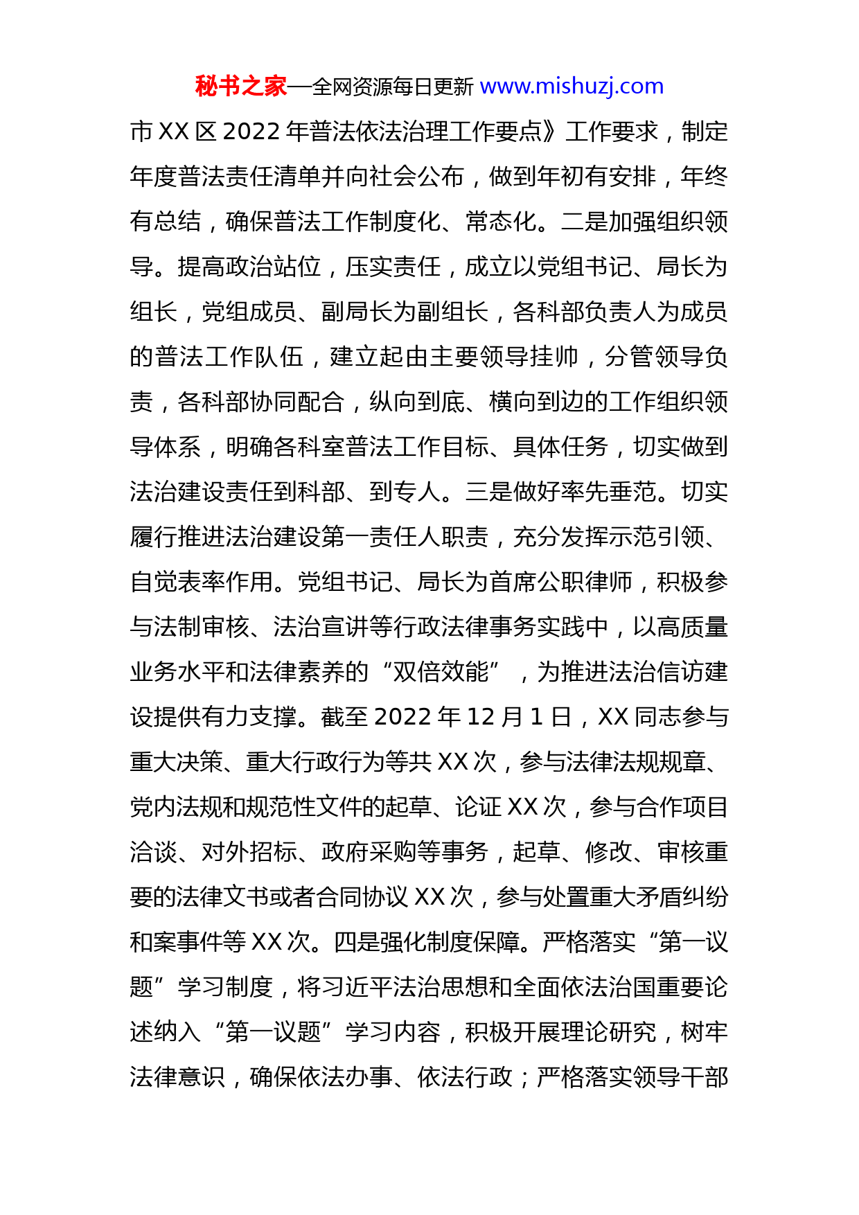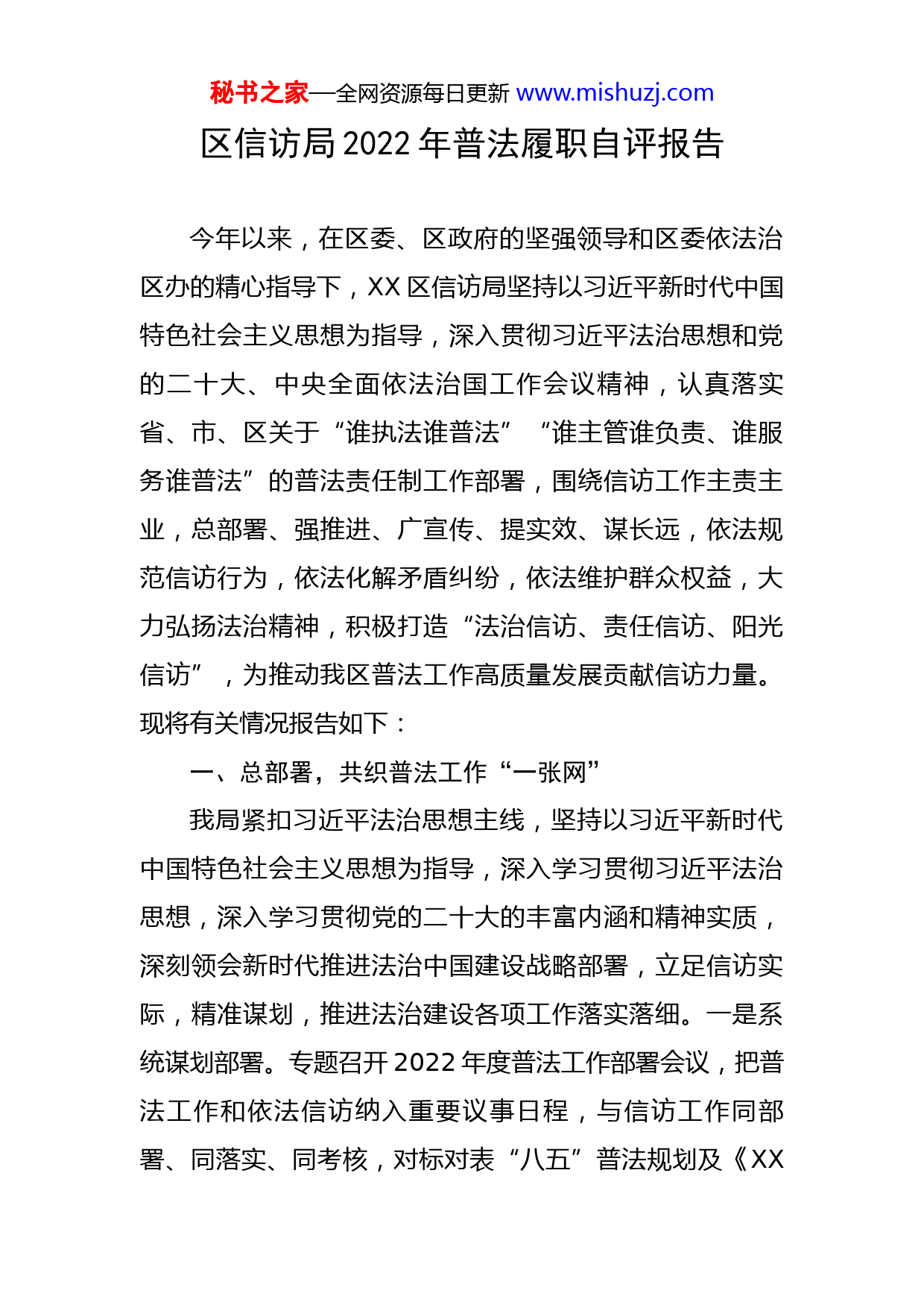 秘书之家—全网资源每日更新www.mishuzj.com区信访局2022年普法履职自评报告今年以来,在区委、区政府的坚强领导和区委依法治区办的精心指导下,XX区信访局坚持以习近平新时代中国特色社会主义思想为指导,深入贯彻习近平法治思想和党的二十大、中央全面依法治国工作会议精神,认真落实省、市、区关于“谁执法谁普法”“谁主管谁负责、谁服务谁普法”的普法责任制工作部署,围绕信访工作主责主业,总部署、强推进、广宣传、提实效、谋长远,依法规范信访行为,依法化解矛盾纠纷,依法维护群众权益,大力弘扬法治精神,积极打造“法治信访、责任信访、阳光信访”,为推动我区普法工作高质量发展贡献信访力量。现将有关情况报告如下:一、总部署,共织普法工作“一张网”我局紧扣习近平法治思想主线,坚持以习近平新时代中国特色社会主义思想为指导,深入学习贯彻习近平法治思想,深入学习贯彻党的二十大的丰富内涵和精神实质,深刻领会新时代推进法治中国建设战略部署,立足信访实际,精准谋划,推进法治建设各项工作落实落细。一是系统谋划部署。专题召开2022年度普法工作部署会议,把普法工作和依法信访纳入重要议事日程,与信访工作同部署、同落实、同考核,对标对表“八五”普法规划及《XX秘书之家—全网资源每日更新www.mishuzj.com市XX区2022年普法依法治理工作要点》工作要求,制定年度普法责任清单并向社会公布,做到年初有安排,年终有总结,确保普法工作制度化、常态化。二是加强组织领导。提高政治站位,压实责任,成立以党组书记、局长为组长,党组成员、副局长为副组长,各科部负责人为成员的普法工作队伍,建立起由主要领导挂帅,分管领导负责,各科部协同配合,纵向到底、横向到边的工作组织领导体系,明确各科室普法工作目标、具体任务,切实做到法治建设责任到科部、到专人。三是做好率先垂范。切实履行推进法治建设第一责任人职责,充分发挥示范引领、自觉表率作用。党组书记、局长为首席公职律师,积极参与法制审核、法治宣讲等行政法律事务实践中,以高质量业务水平和法律素养的“双倍效能”,为推进法治信访建设提供有力支撑。截至2022年12月1日,XX同志参与重大决策、重大行政行为等共XX次,参与法律法规规章、党内法规和规范性文件的起草、论证XX次,参与合作项目洽谈、对外招标、政府采购等事务,起草、修改、审核重要的法律文书或者合同协议XX次,参与处置重大矛盾纠纷和案事件等XX次。四是强化制度保障。严格落实“第一议题”学习制度,将习近平法治思想和全面依法治国重要论述纳入“第一议题”学习内容,积极开展理论研究,树牢法律意识,确保依法办事、依法行政;严格落实领导干部秘书之家—全网资源每日更新www.mishuzj.com集体学法制度,制定领导干部学法计划,将《中华人民共和国宪法》《中华人民共和国民法典》、新施行新修订的法律法规及党章和党内法规等列入中心理论组和党支部学习内容,同时结合学习强国、“深i学”等线上平台,进一步引导领导干部自觉做党章党规党纪和国家法律的自觉尊崇者、模范遵守者、坚定捍卫者。组织领导干部参加学法用法考试,参考率及优秀率均为100%,将尊法学法用法情况列入年度考核内容,实现述职述廉述法“三位一体”,不断强化领导干部运用法治思维和法治方式开展工作、解决问题、推动发展的能力;严格落实法律咨询制度,坚持依法决策、依法行政、依法管理,局内现有X名公职律师、X名访前律师、X名驻点法律顾问、X名法学专业干部及X名区“八五”普法讲师团成员,负责对重大行政决策、涉法涉诉案件化解、普法宣传教育等工作提供专业指导,进一步提高业务与普法工作质效,为深入推进依法决策、依法行政、依法管理的法治信访建设工作提供优质高效“法治智库”。二、强推进,延伸普法工作“多触角”2022年5月1日,《信访工作条例》正式实施,从法治维度看,《信访工作条例》是我们党关于信访工作的第一部党内法规,是党领导信访工作的法治保障。我局以《信访工作条例》实施为契机,牢固树立法治思维,为法秘书之家—全网资源每日更新www.mishuzj.com治政府建设各项工作顺利开展注入信访活力。一是持续掀起学习宣传《信访工作条例》热潮,统筹推进《信访工作条例》的学习培训、宣传解读和落实情况的督促检查,印发《XX市XX区学习宣传贯彻落实〈信访工作条例〉工作方案》,广泛发动各单位积极参与学习贯彻活动,推动各单位增强以《信访工作条例》作为根本遵循履行好本领域信访责任、办理好本领域信访事项的行动自觉。二是切实履行法治建设第一责任人职责,通过区政府常务会议“局长讲法”活动,详细讲解《信访工作条例》内容,充分发挥领导干部尊法学法守法用法的示范引领作用,为切实提高法治政府建设水平贡献信访力量。三是将《信访工作条例》列入党委(党组)理论学习中心组学习的重要内容,纳入区委党校培训必修课程,提请召开区委理论学习中心组(扩大)学习会,邀请市人民政府副秘书长、市信访局局长何奕飞同志为我区作专题授课,信访工作联席会议全体成员一同进行学习,全面加强党对信访工作的全面领导,科学民主决策、依法履行职责,共同构建起“五位一体”的信访工作格局。四是联合区委组织部、政法委、党