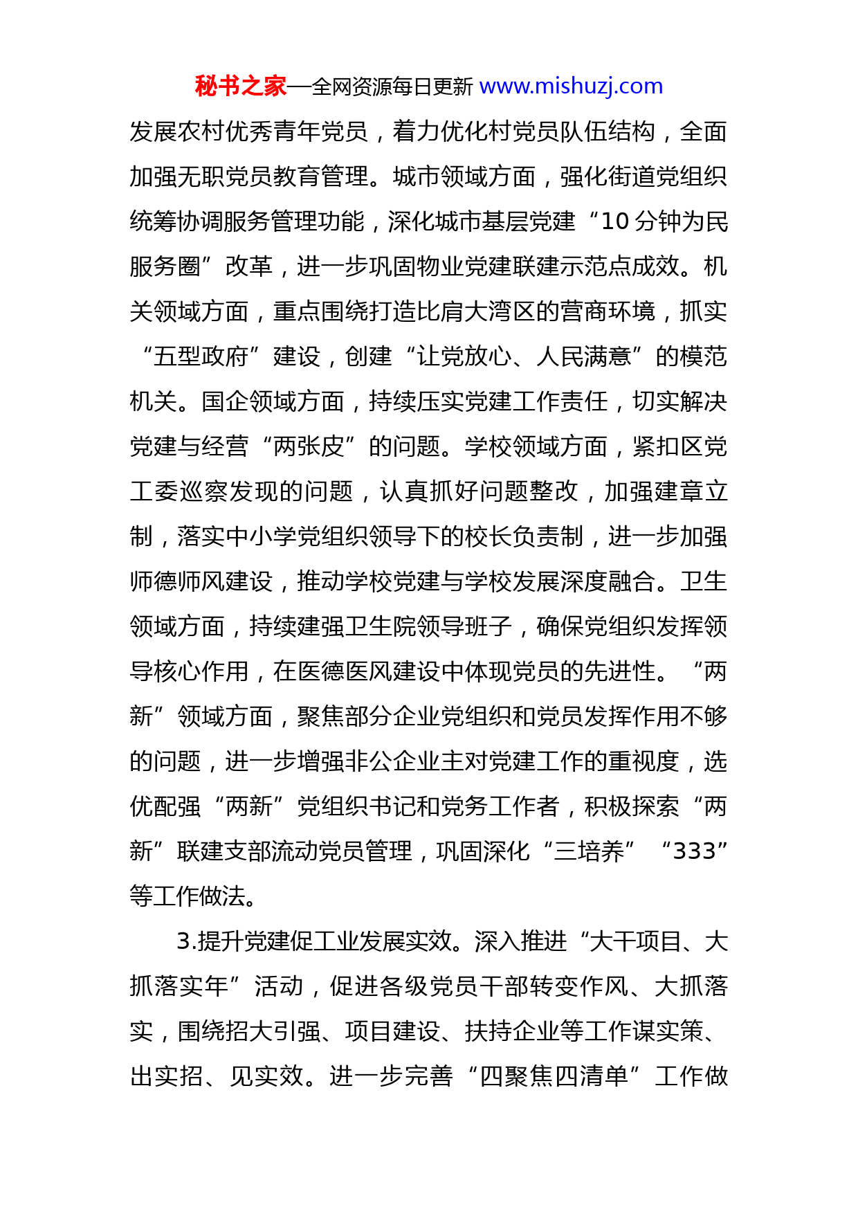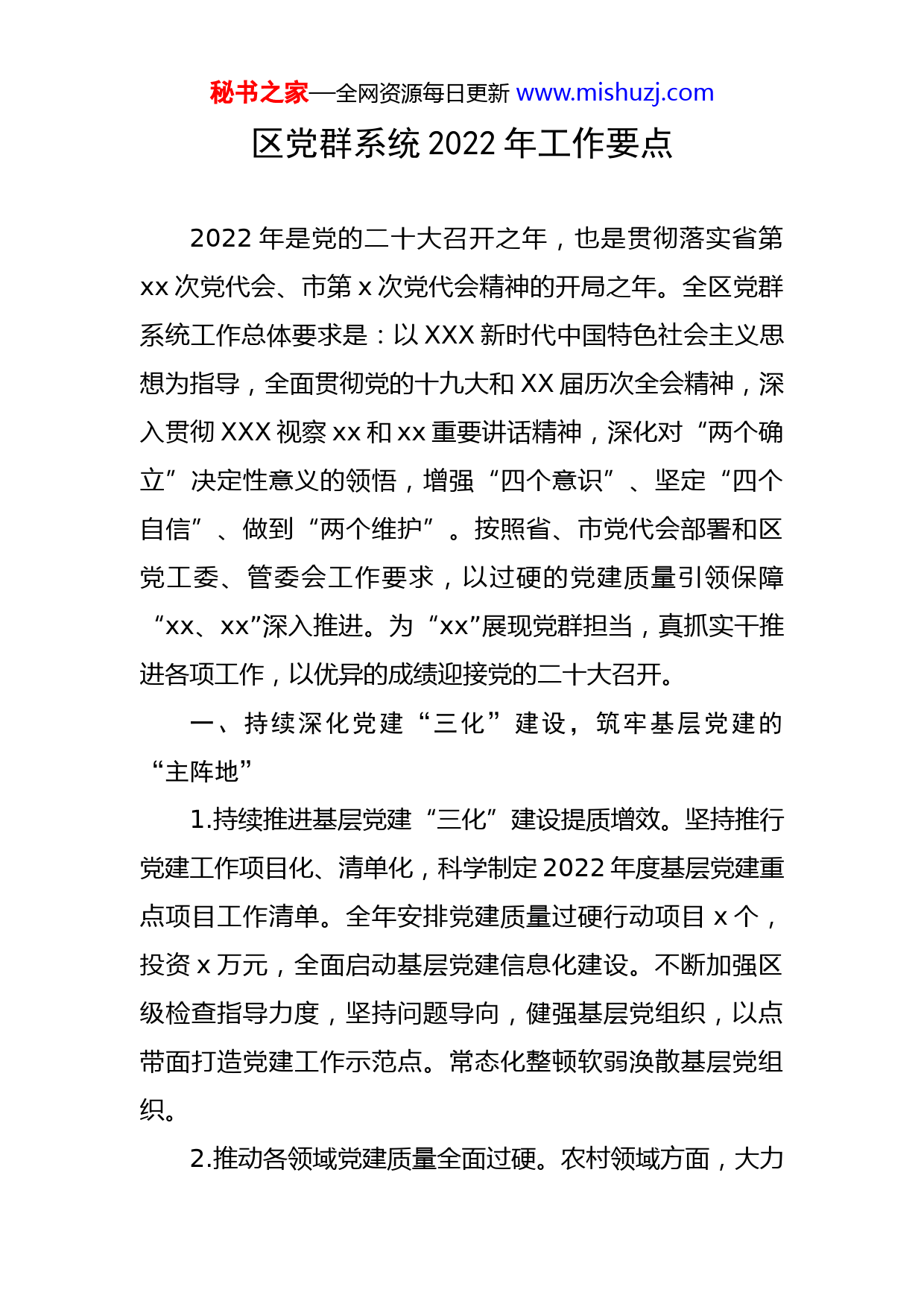 秘书之家—全网资源每日更新www.mishuzj.com区党群系统2022年工作要点2022年是党的二十大召开之年,也是贯彻落实省第xx次党代会、市第x次党代会精神的开局之年。全区党群系统工作总体要求是:以XXX新时代中国特色社会主义思想为指导,全面贯彻党的十九大和XX届历次全会精神,深入贯彻XXX视察xx和xx重要讲话精神,深化对“两个确立”决定性意义的领悟,增强“四个意识”、坚定“四个自信”、做到“两个维护”。按照省、市党代会部署和区党工委、管委会工作要求,以过硬的党建质量引领保障“xx、xx”深入推进。为“xx”展现党群担当,真抓实干推进各项工作,以优异的成绩迎接党的二十大召开。一、持续深化党建“三化”建设,筑牢基层党建的“主阵地”1.持续推进基层党建“三化”建设提质增效。坚持推行党建工作项目化、清单化,科学制定2022年度基层党建重点项目工作清单。全年安排党建质量过硬行动项目x个,投资x万元,全面启动基层党建信息化建设。不断加强区级检查指导力度,坚持问题导向,健强基层党组织,以点带面打造党建工作示范点。常态化整顿软弱涣散基层党组织。2.推动各领域党建质量全面过硬。农村领域方面,大力秘书之家—全网资源每日更新www.mishuzj.com发展农村优秀青年党员,着力优化村党员队伍结构,全面加强无职党员教育管理。城市领域方面,强化街道党组织统筹协调服务管理功能,深化城市基层党建“10分钟为民服务圈”改革,进一步巩固物业党建联建示范点成效。机关领域方面,重点围绕打造比肩大湾区的营商环境,抓实“五型政府”建设,创建“让党放心、人民满意”的模范机关。国企领域方面,持续压实党建工作责任,切实解决党建与经营“两张皮”的问题。学校领域方面,紧扣区党工委巡察发现的问题,认真抓好问题整改,加强建章立制,落实中小学党组织领导下的校长负责制,进一步加强师德师风建设,推动学校党建与学校发展深度融合。卫生领域方面,持续建强卫生院领导班子,确保党组织发挥领导核心作用,在医德医风建设中体现党员的先进性。“两新”领域方面,聚焦部分企业党组织和党员发挥作用不够的问题,进一步增强非公企业主对党建工作的重视度,选优配强“两新”党组织书记和党务工作者,积极探索“两新”联建支部流动党员管理,巩固深化“三培养”“333”等工作做法。3.提升党建促工业发展实效。深入推进“大干项目、大抓落实年”活动,促进各级党员干部转变作风、大抓落实,围绕招大引强、项目建设、扶持企业等工作谋实策、出实招、见实效。进一步完善“四聚焦四清单”工作做秘书之家—全网资源每日更新www.mishuzj.com法,规范项目临时党组织建设,常态化实现项目党组织全覆盖,鼓励“把主题党日开到工地上”等做法,提升组织活动实效。4.推进抓党建促乡村振兴。加强村级班子带头人和后备干部队伍建设,开展村党组织书记在乡村振兴擂台“比武”活动。充分发挥驻村“第一书记”和驻村工作队作用,推动巩固拓展脱贫攻坚成果同乡村振兴有效衔接。大力实施村干部学历提升工程,进一步提高全区换届后大专以上学历村干部占比。扎实推进村集体经济发展提档升级,研究制定进一步推进村集体经济发展壮大的措施,完善村级留用地建设开发等工作,实现村集体经济持续、稳定、健康发展。力争2022年底XX%以上的村集体经营性收入超过XX万元、XX个村超XXX万元。二、加大干部“选育管用”力度,锻造担当善为的“生力军”5.充实打造高素质干部队伍。面向社会公开招聘一批符合区发展需要、专业技术强的年轻干部,优化干部队伍结构,提升专业化能力水平。突出政治标准,坚持以贤选人、以事察人,重点从获得“奔牛奖”单位,“xx”、招商引资、乡村振兴等中心工作中选拔任用表现突出的干部。健全落实“赛马”制度,完善“末位淘汰”机制,树立鲜明用人导向,推进“职务能上能下、人员能进能出、待遇秘书之家—全网资源每日更新www.mishuzj.com能高能低”。切实发挥考核结果在选拔任用、培养教育、管理监督、激励约束中的运用。定期组织召开述职评议会议,营造“比学赶超”浓厚氛围。6.不断提升干部政治理论水平。依托学习强国、xx干部网络学院、远程教育,坚持干部网络教育常态化。牵头开展党的二十大精神集中轮训读书班、融入粤港澳大湾区建设专题培训班、金融服务专题培训班、党建专题培训班,举办XX余期业务培训班,积极培育开明、精明、严明的“三明”干部。7.持续强化干部监督管理。强化对“一把手”监督检查,落实组织部门负责人同下级“一把手”谈话制度。加强部门联动,将组织监督、纪检监督和审计监督有机结合,巩固深化乡镇领导班子换届、事业单位改革成效。建立健全“裸官”、“近亲繁殖”和县处级以上领导干部近亲属情况、领导干部因私出国境护照管理等工作台账。8.加强对干部的关心关爱。落实干部夫妻“团圆机制”、干部职工带薪休假等“暖心”政策,营造拴心留人的良好干事创业氛围。为在xx区服务20年、30年的干部职工颁发周年纪念章,增强全区干部职工归属感、荣誉感、使命感。严格落实容错减责,切实保护干部职工担当作为热情。9.加强雇员职员队伍管理。建立雇员职员用管一体管理秘书之家—全网资源每日更新www.mishuzj.com机制。扎实做好雇
